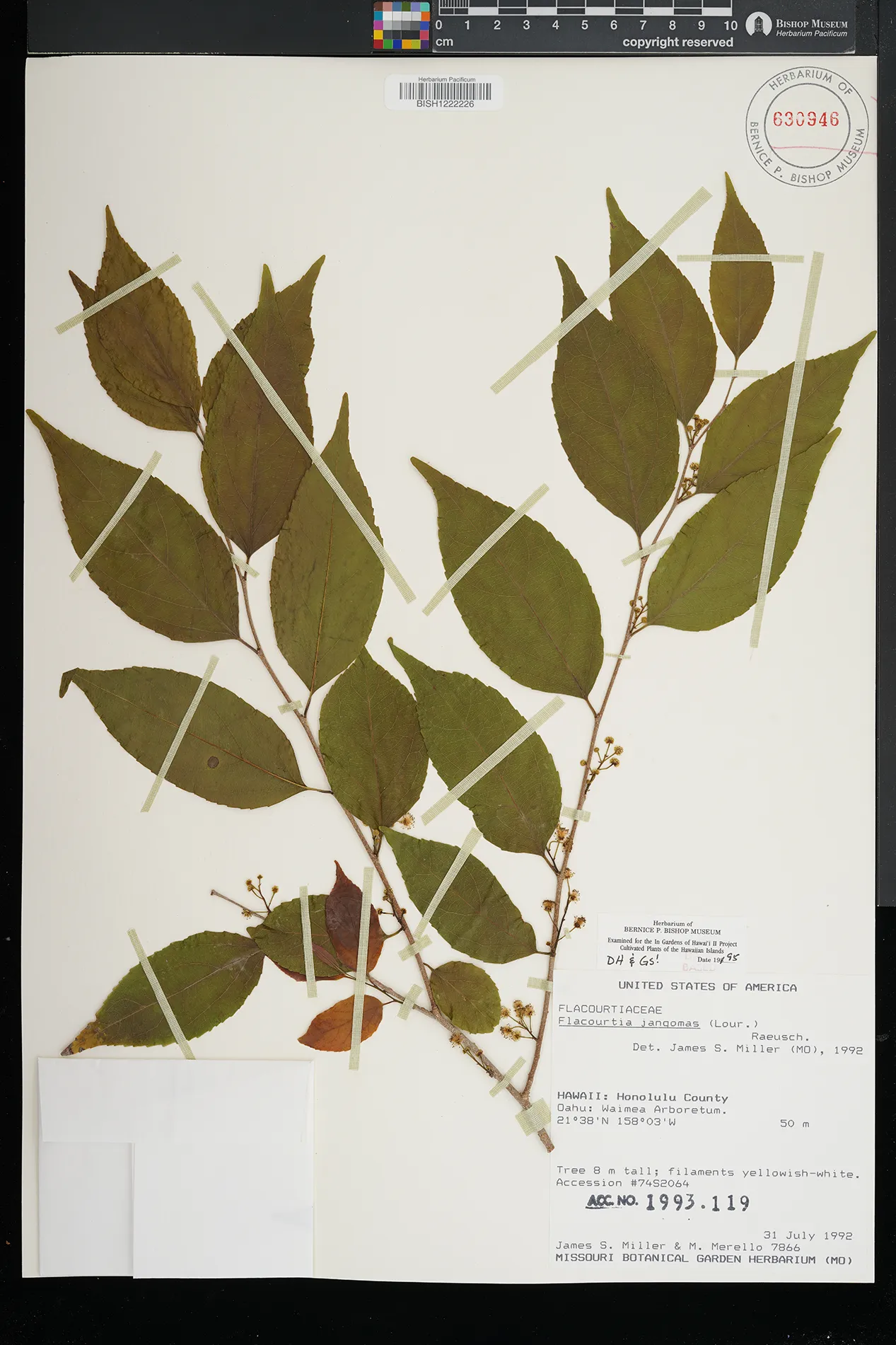 | 18 | Flacourtia jangomas | (Lour.) Raeusch. | Oahu: Waimea Arboretum. | PRESERVED_SPECIMEN | James S. Miller|Mary Merello | Miller 7866 | Missouri Botanical Garden | 7/31/1992 | ||