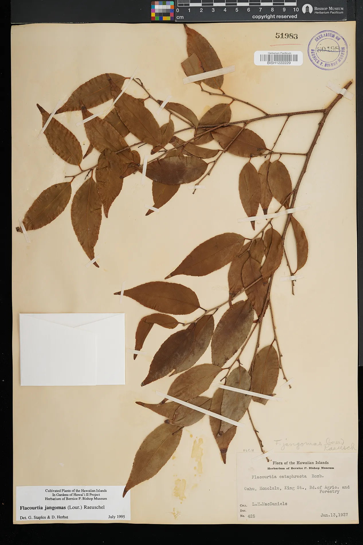| 25 | Flacourtia jangomas | (Lour.) Raeusch. | honolulu, king st., bd. of agric. and forestry | PRESERVED_SPECIMEN | macdaniels, l.h. | collector number: 425 | Oahu | BISH | 1/13/1927 |