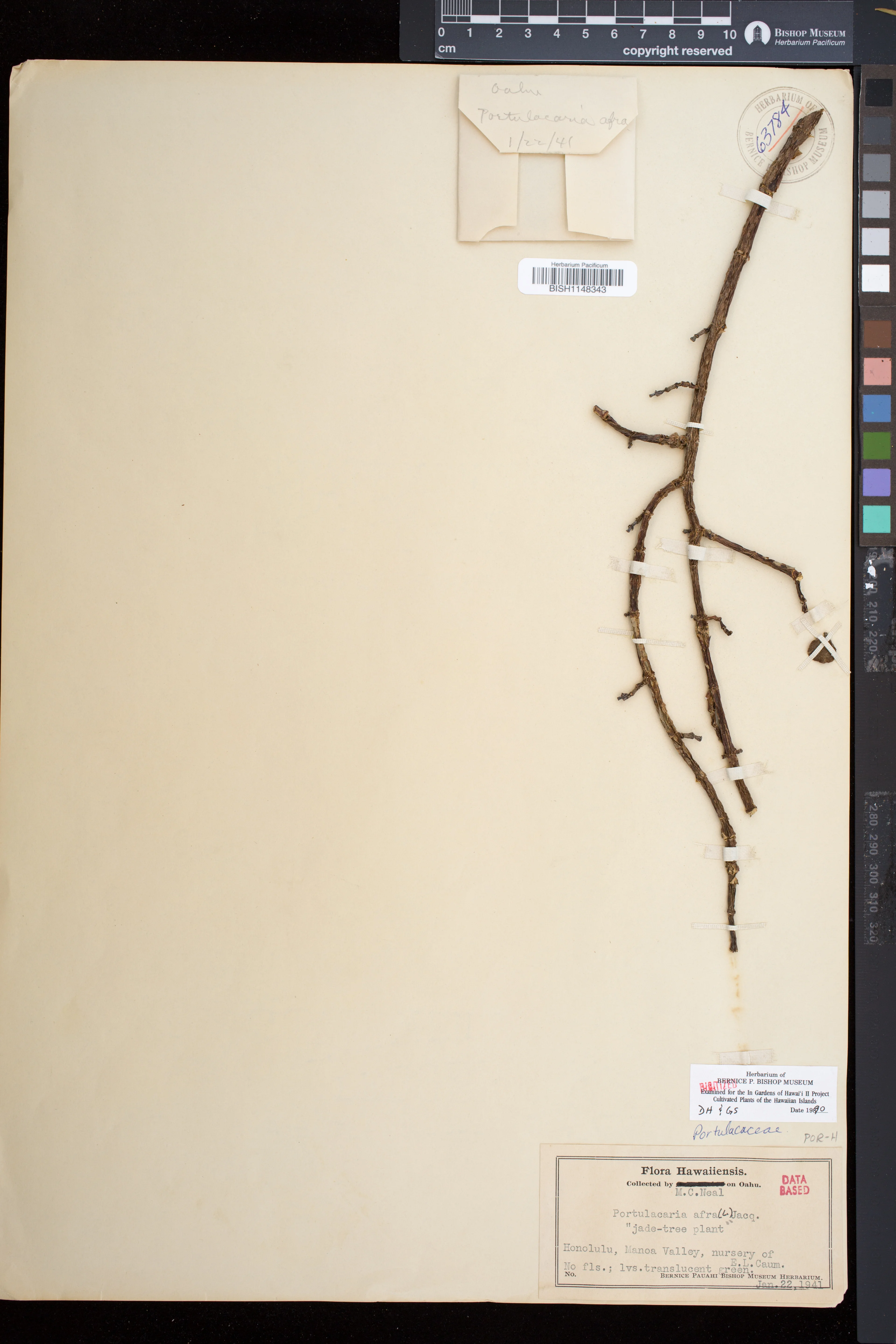 | 2 | Portulacaria afra | Jacq. | Honolulu, Manoa Valley nursery of E.L. Caum | PRESERVED_SPECIMEN | Neal, M.C. | s.n. | Oahu | BISH | 1/22/1941 | |