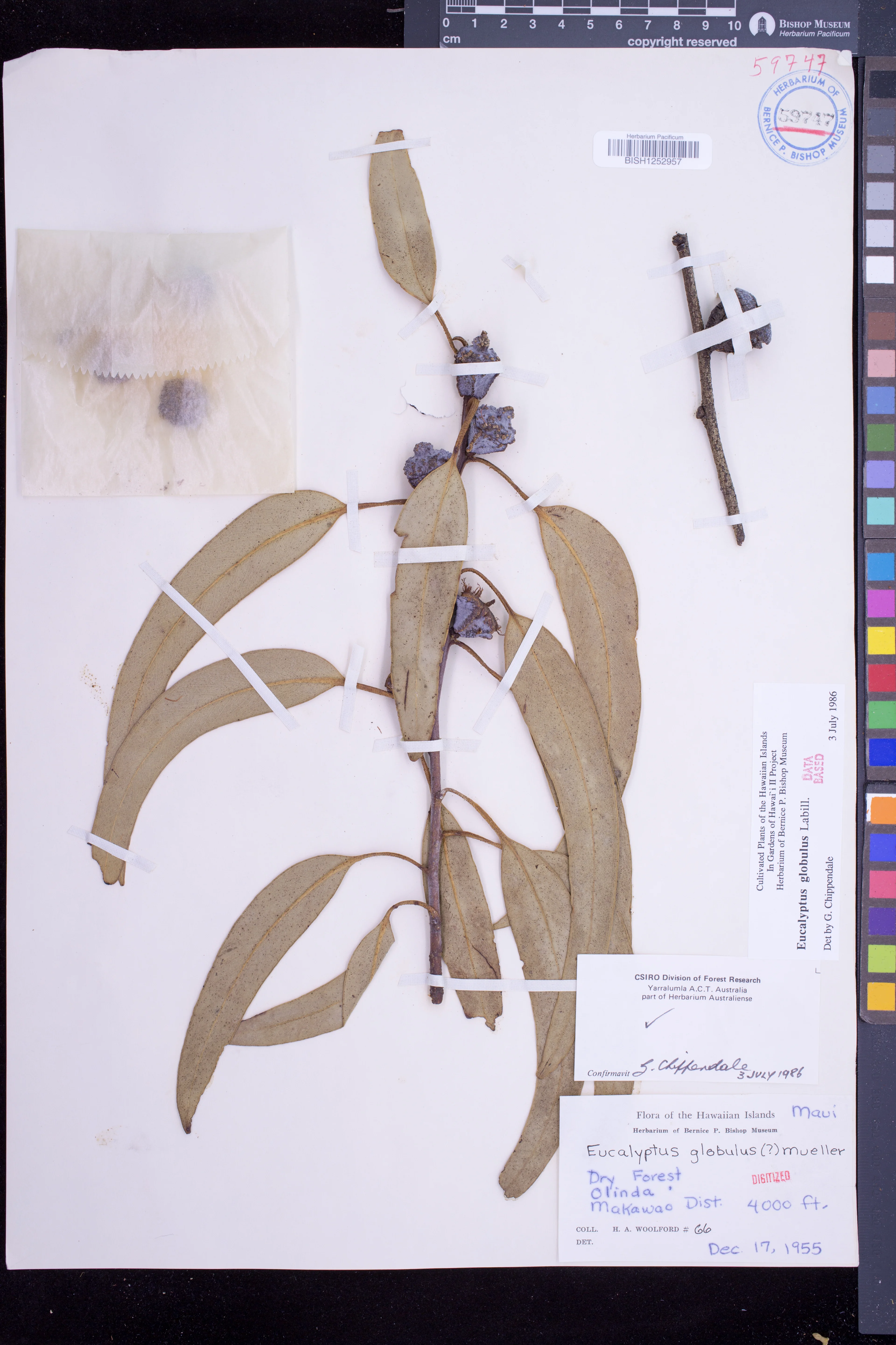 | 2 | Eucalyptus globulus | Labill. | makawao district, olinda | Dry forest. | PRESERVED_SPECIMEN | woolford, h.a. | collector number: 66 | Maui | BISH | 12/17/1955 |