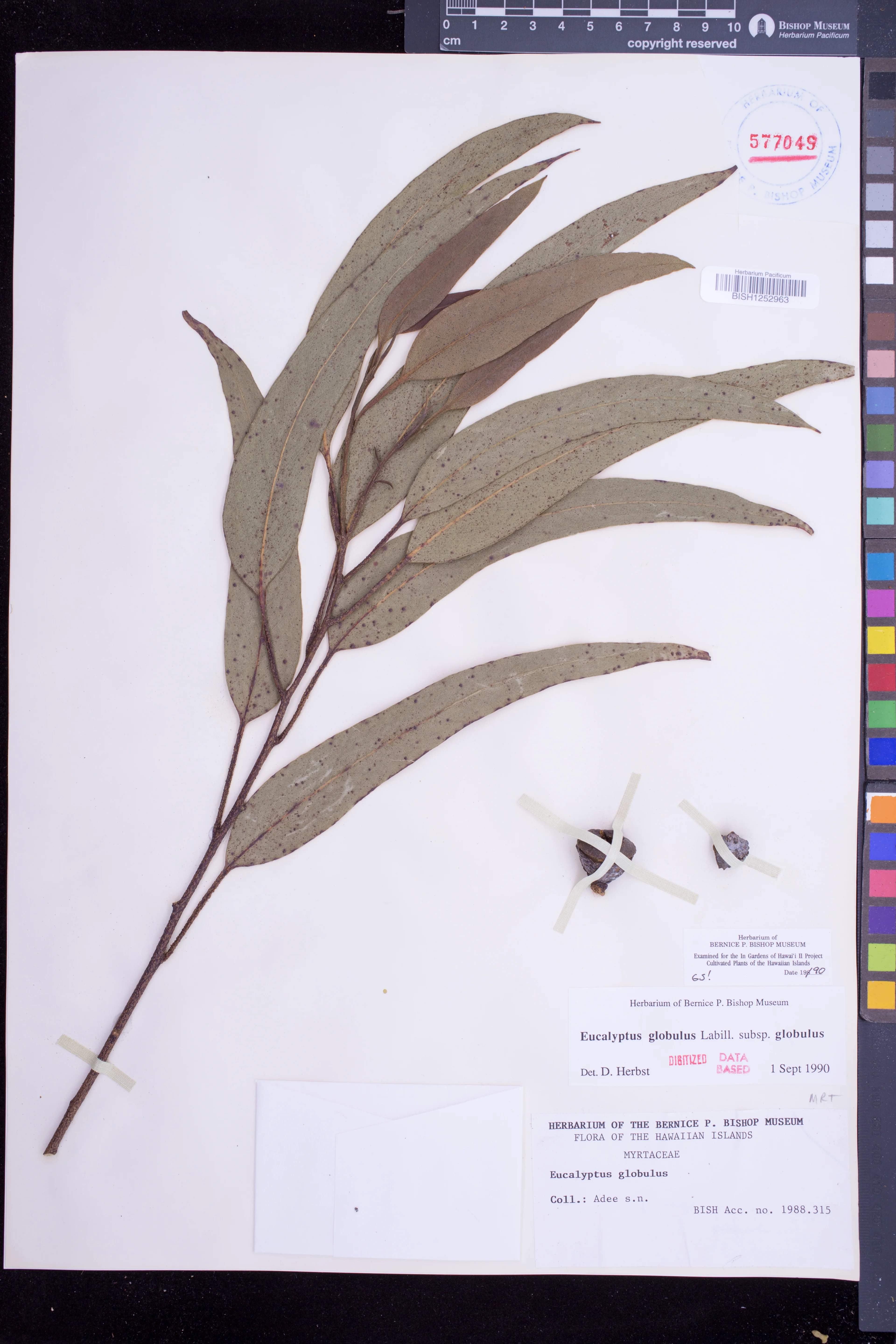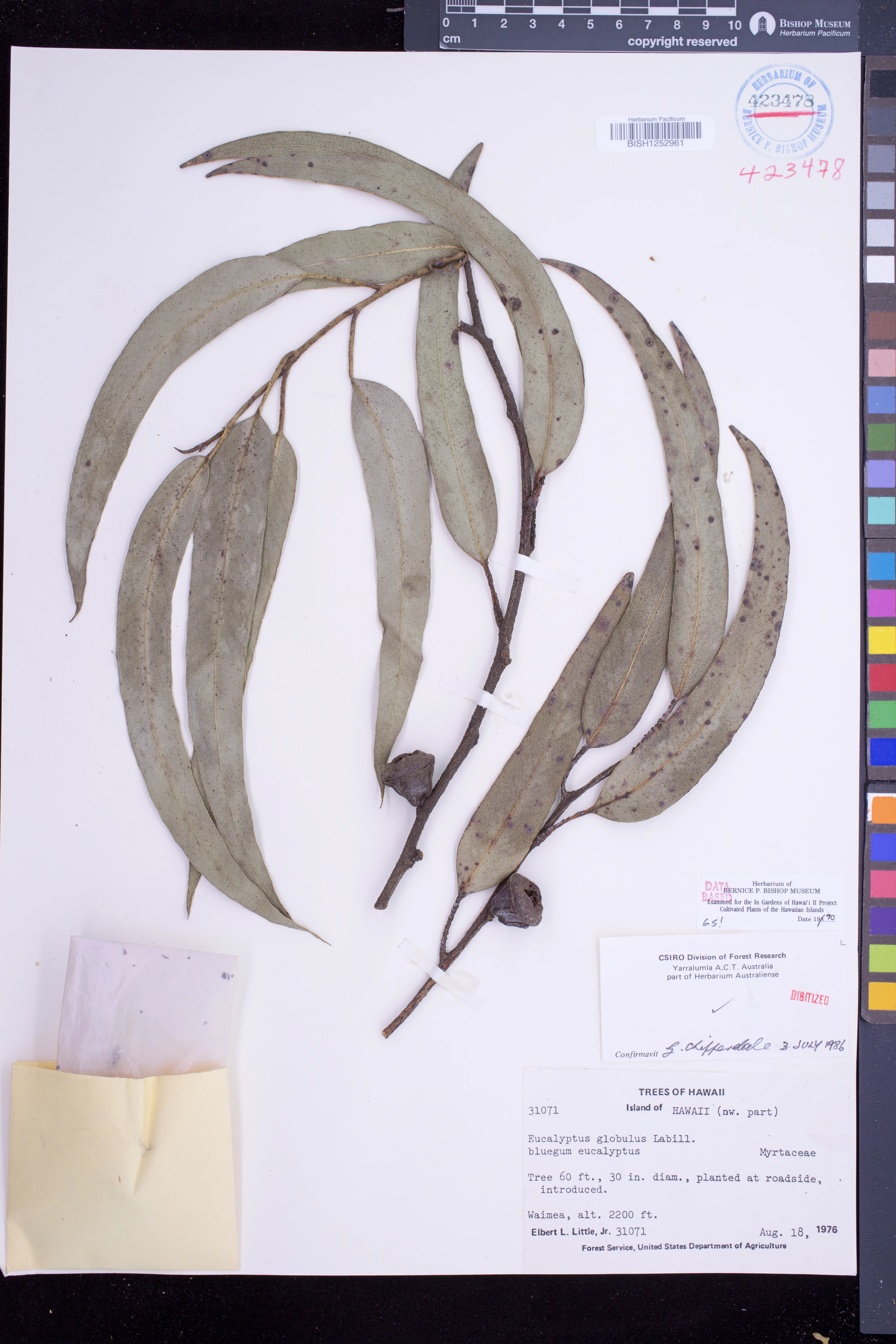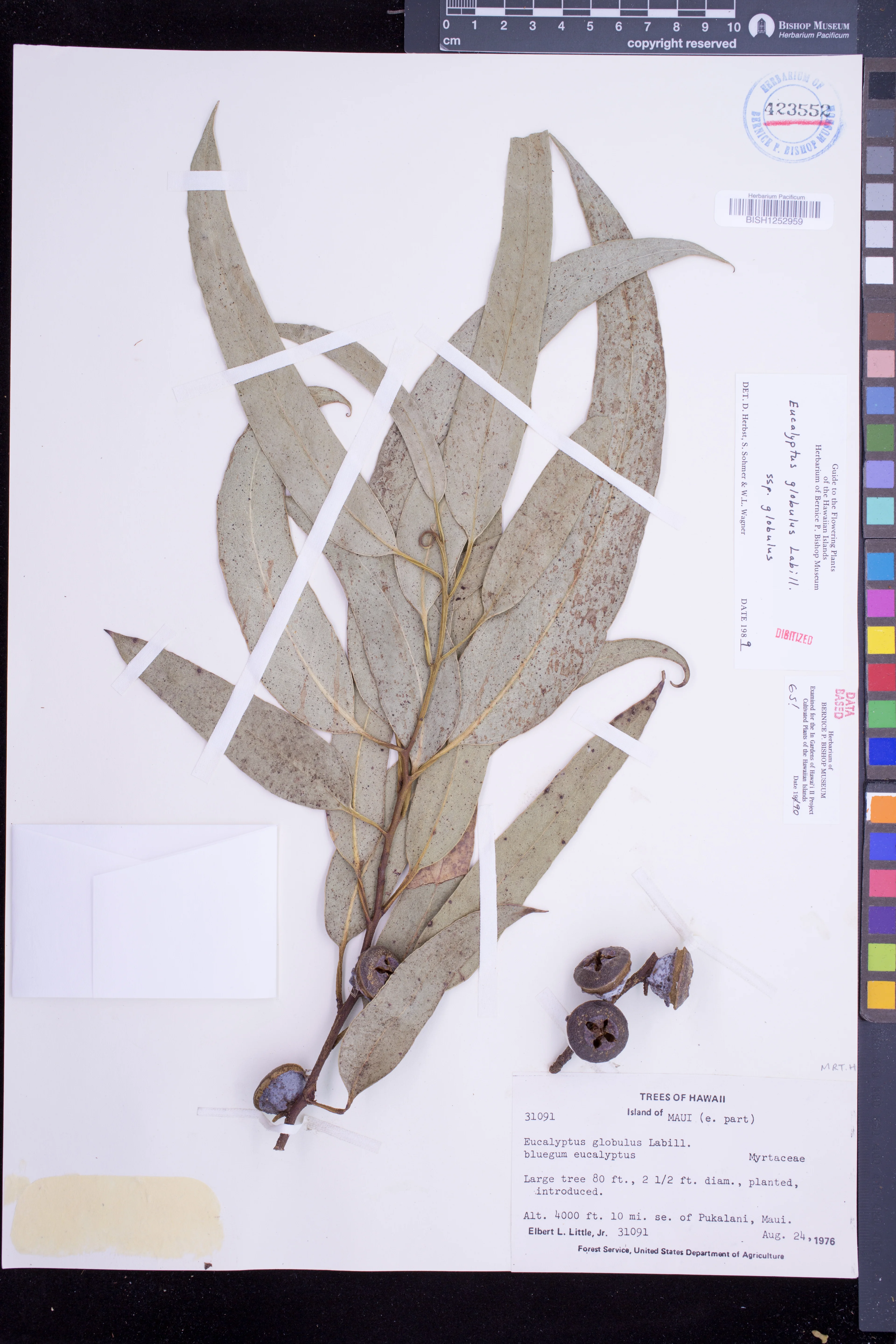 | 21 | Eucalyptus globulus | Labill. | waimea | Planted at roadside, introduced. | PRESERVED_SPECIMEN | little jr., e.l. | collector number: 31071 | Hawaii | BISH | 8/18/1976 |