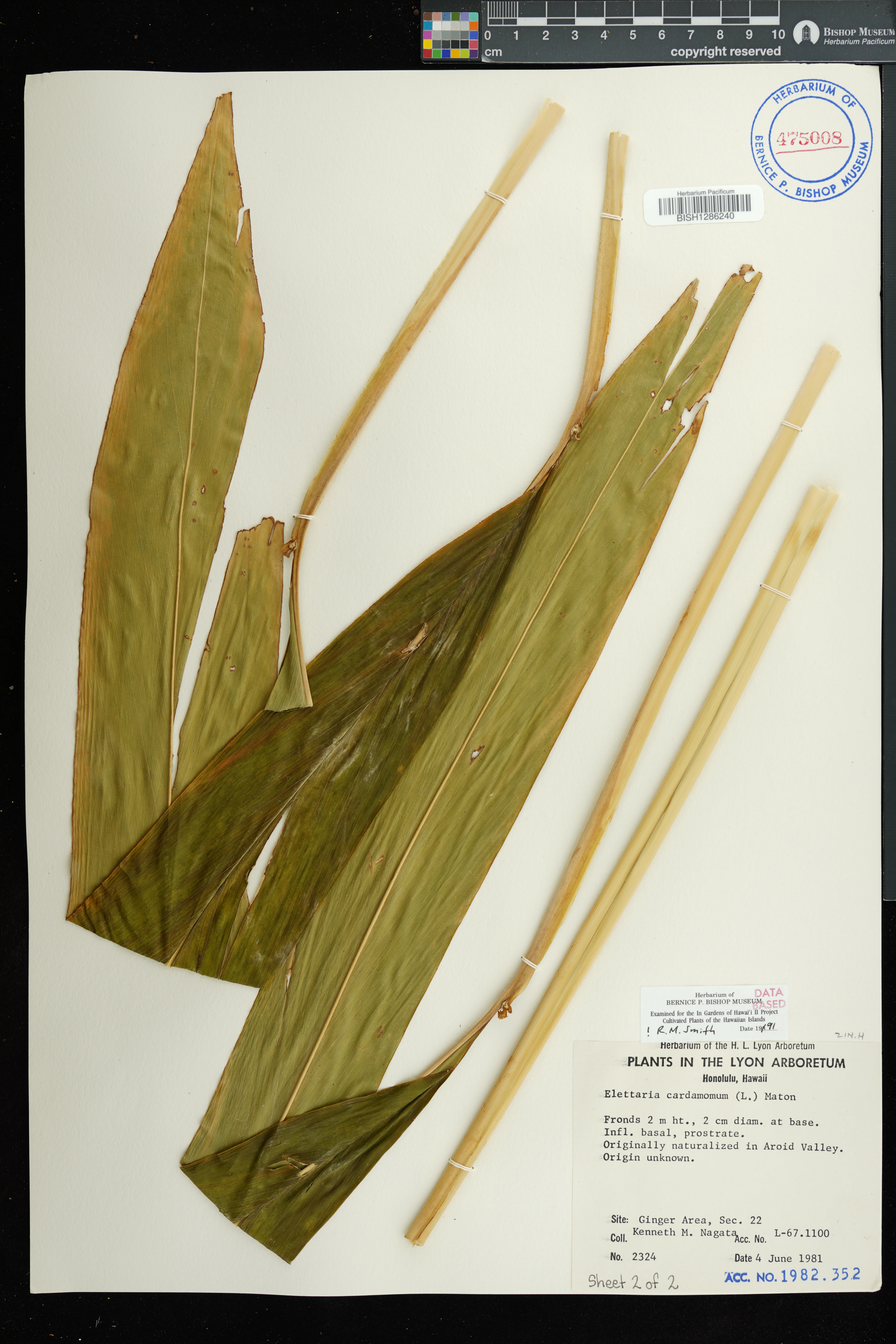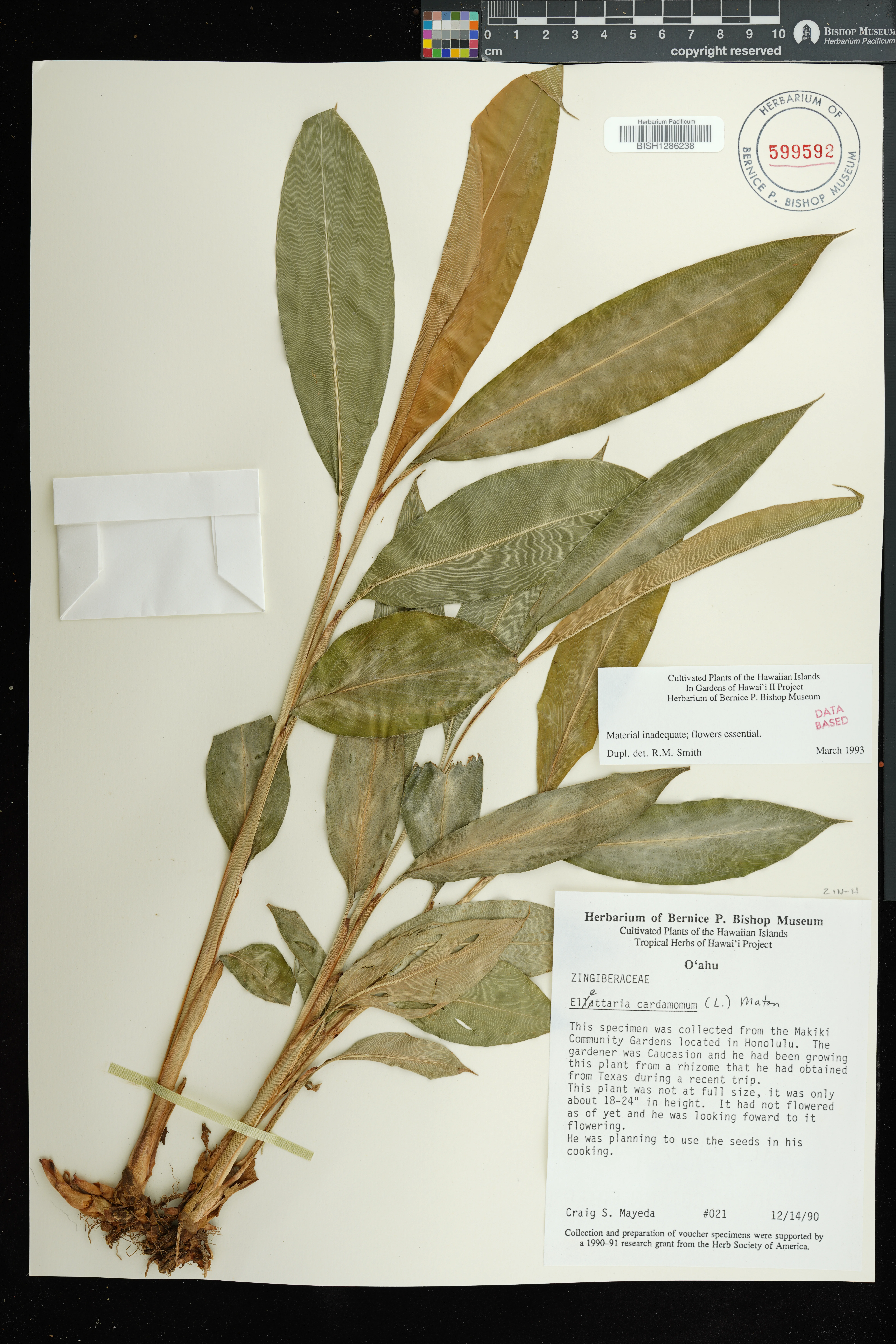 | 2 | Elettaria cardamomum | (L.) Maton | Makiki Community Gardens, Honolulu | PRESERVED_SPECIMEN | Mayeda, C.S. | 21 | Oahu | BISH | 12/14/1990 | |