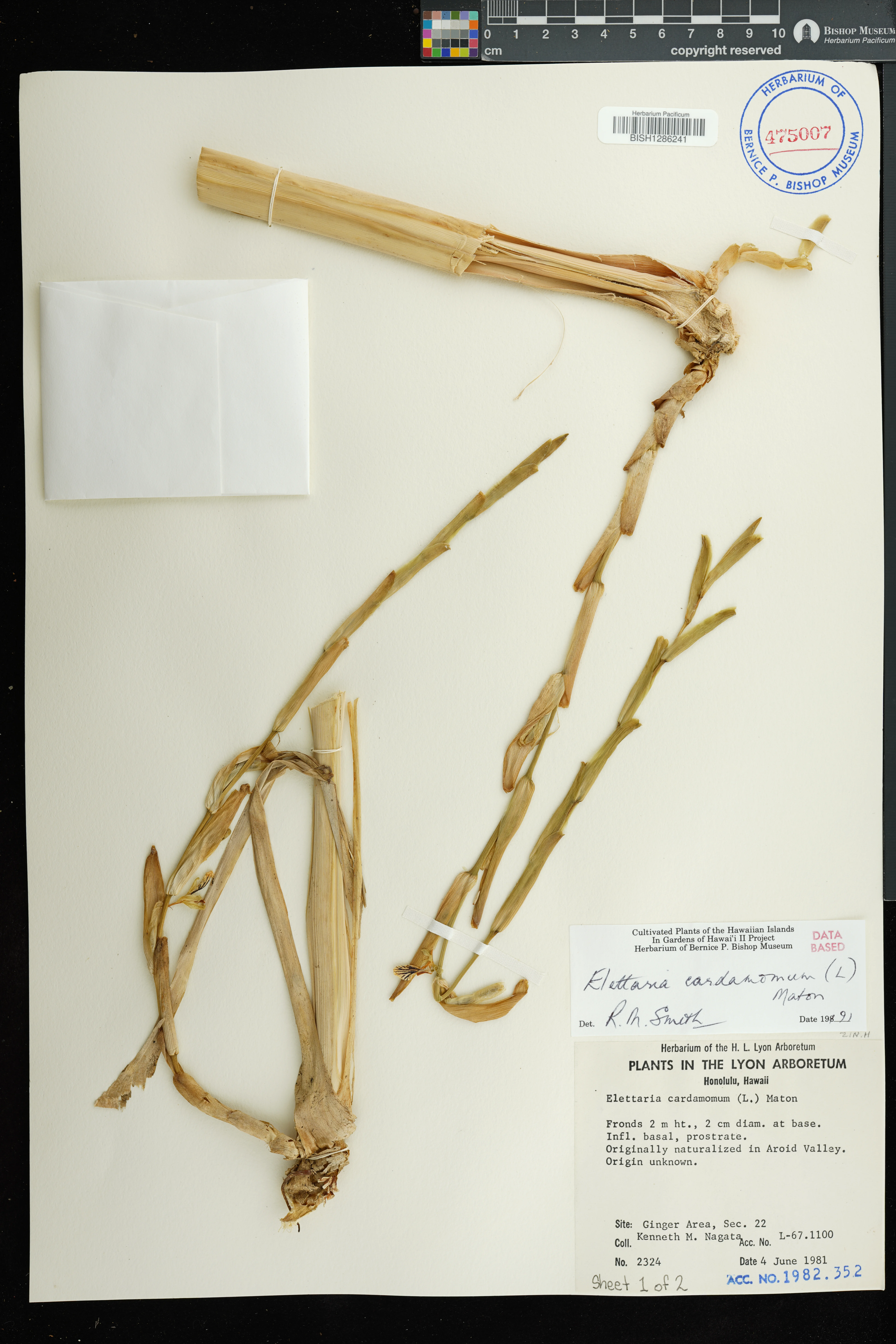 | 3 | Elettaria cardamomum | (L.) Maton | Lyon Arboretum, Ginger Area, Sec. 22, Honolulu | PRESERVED_SPECIMEN | Nagata, K.M. | 2324 | Oahu | BISH | 6/4/1981 | |