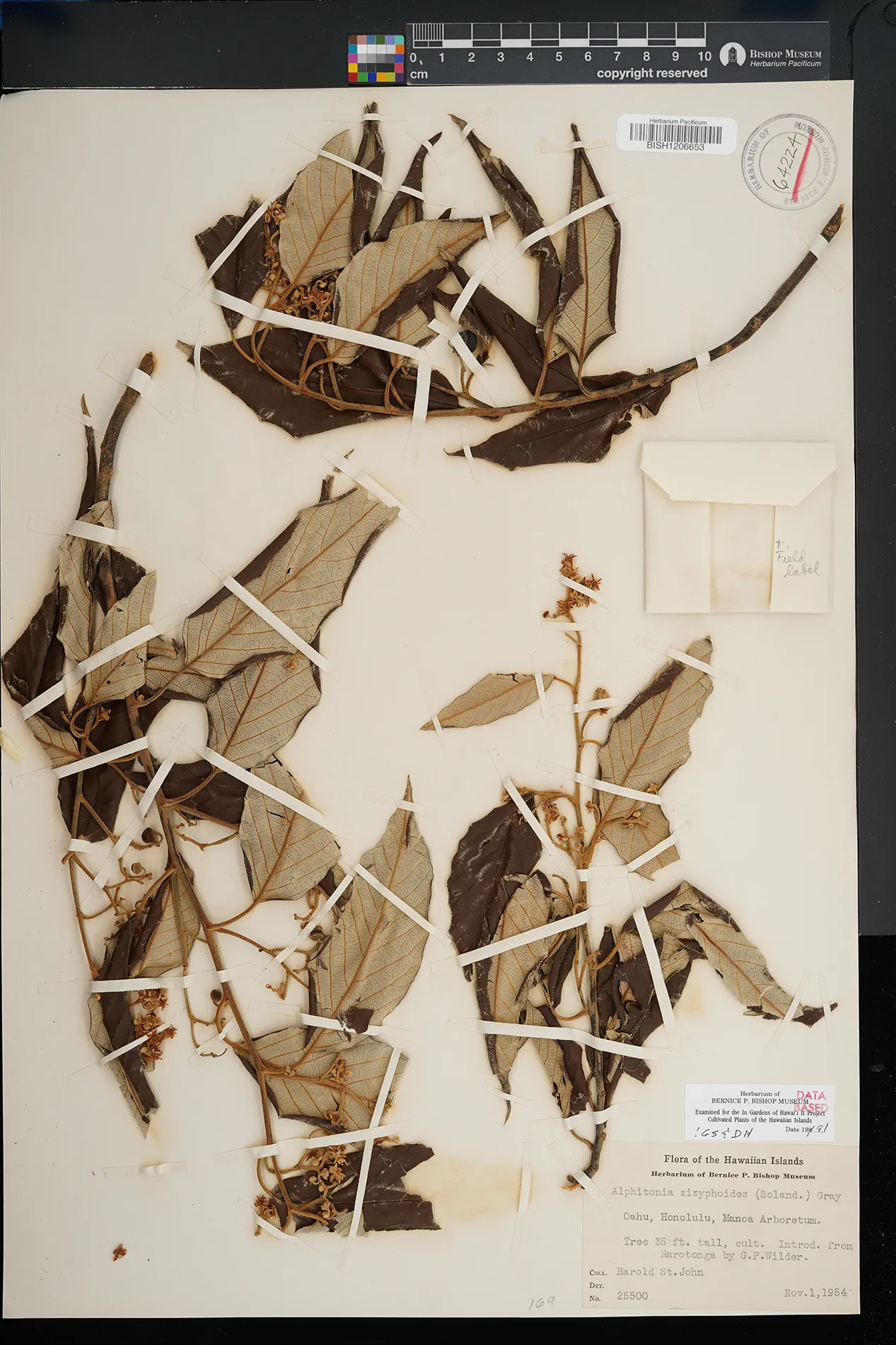| 6 | Alphitonia zizyphoides | (Biehler) A.Gray | Honolulu: Manoa arboretum | PRESERVED_SPECIMEN | St. John, H. | 25500 | Oahu | BISH | 11/1/1954 | |
