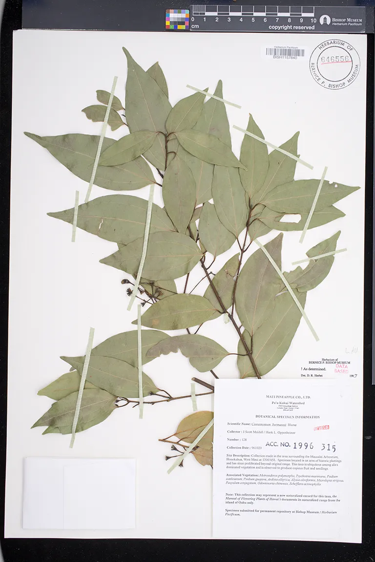 Located in an area of historic plantings and has since proliferated beyond original range. Associated vegetation: Metrosideros polymorpha, Psychotria mariniana, Psidium cattleianum, Psidium guajava, Ardisia elliptica, Alyxia oliviformis, Microlepia strigosa, Paspalum conjugatum, Odontosoria chinensis, Schefflera actinophylla. |