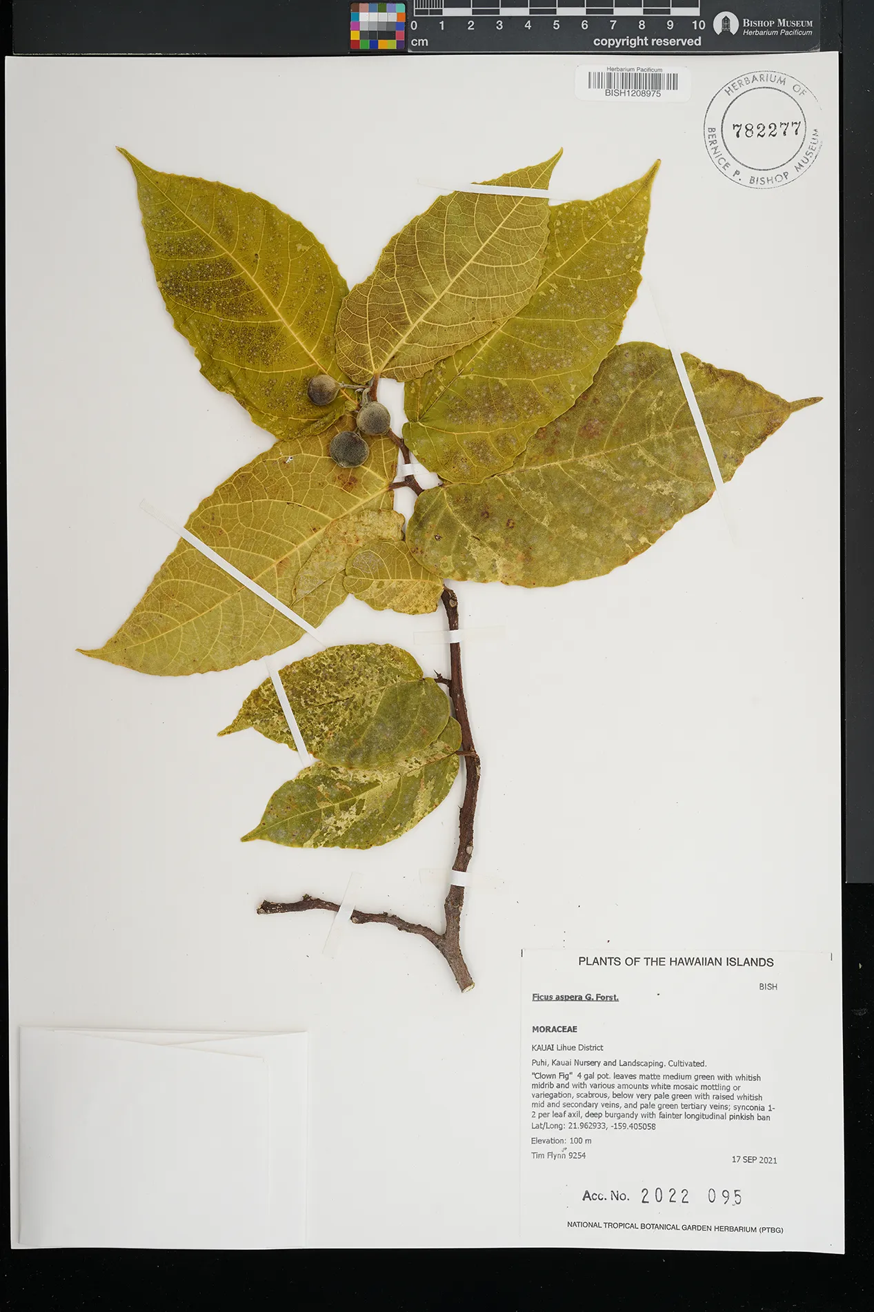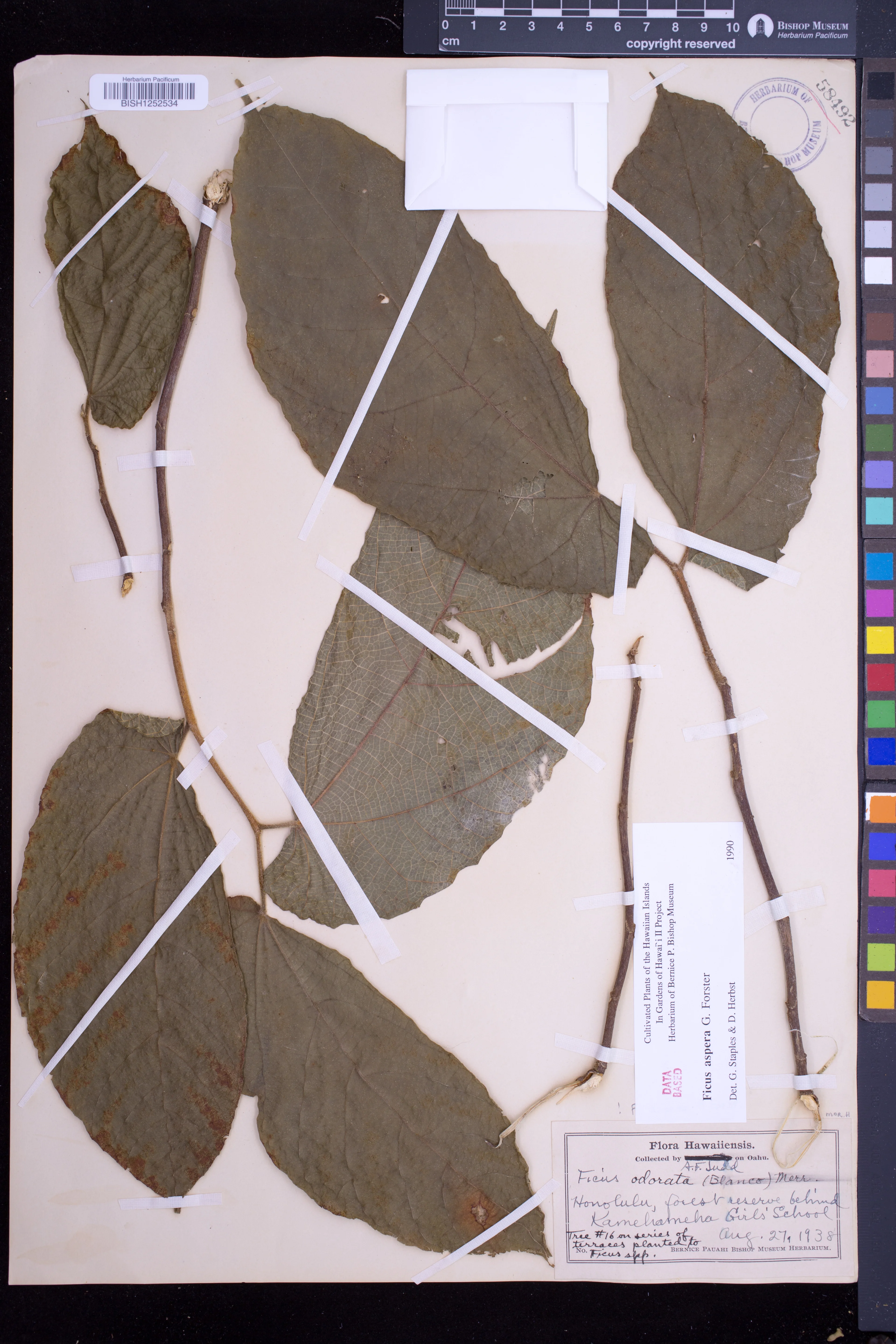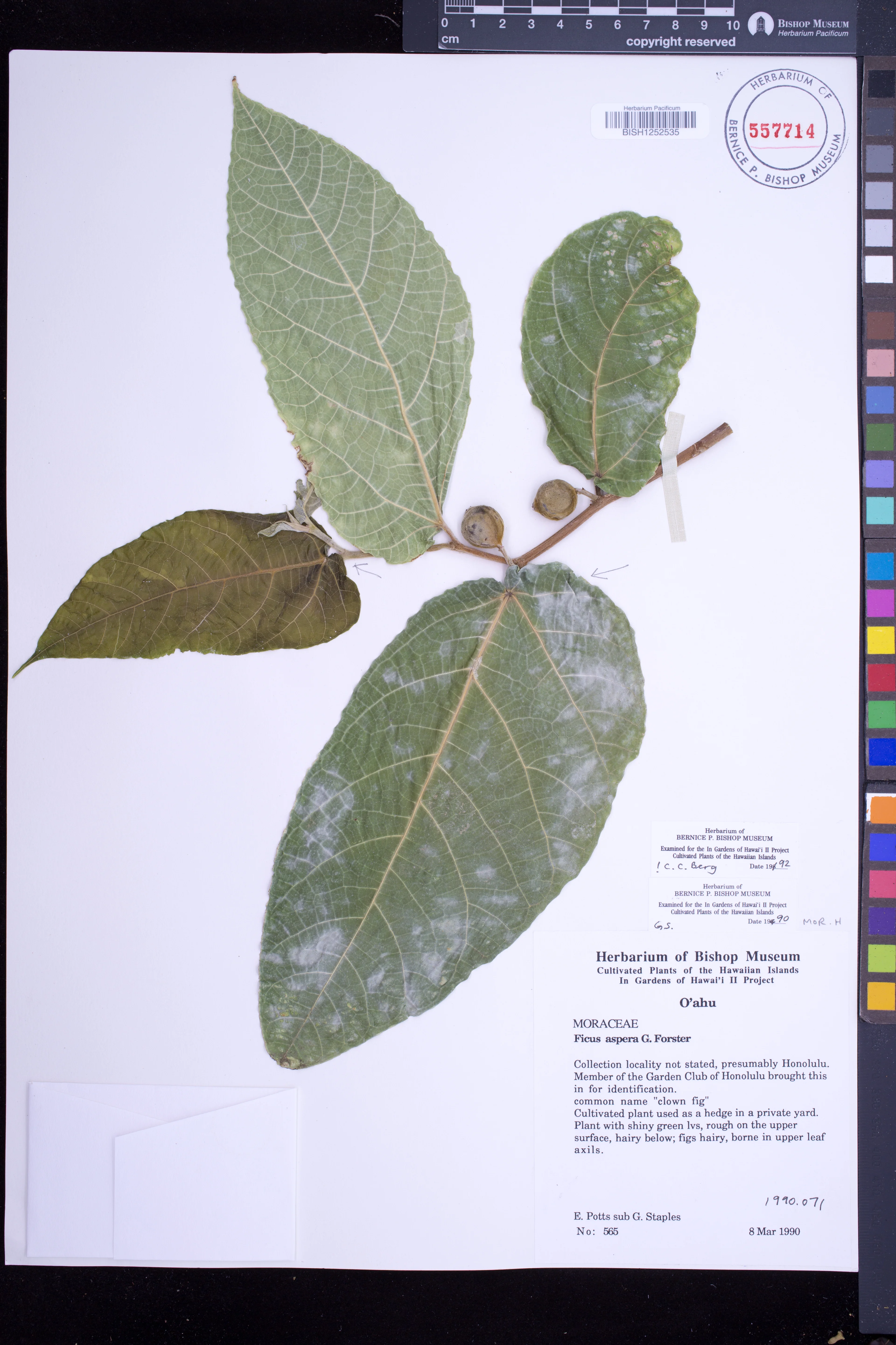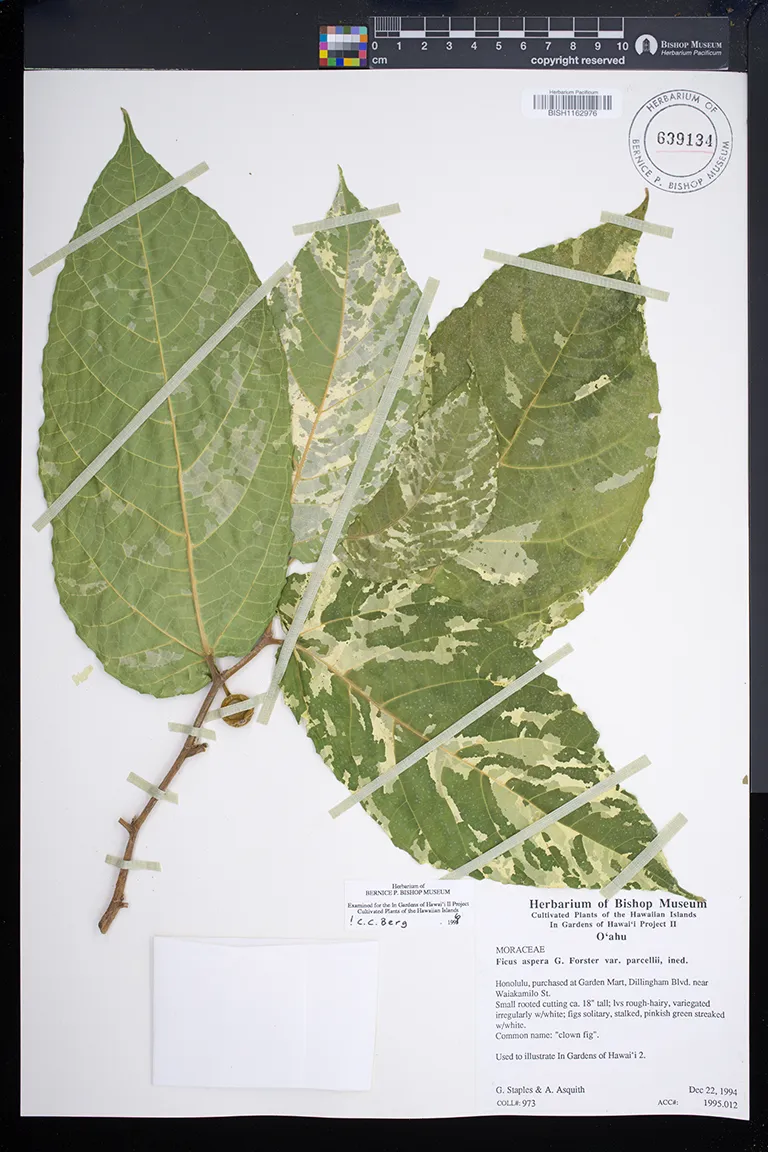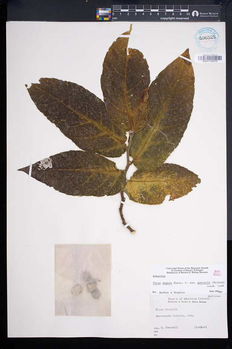 | 7 | Ficus aspera | G.Forst. | Collection locality not stated, presumably Honolulu | PRESERVED_SPECIMEN | Staples, G. | 565 | Oahu | BISH | 3/8/1990 | |