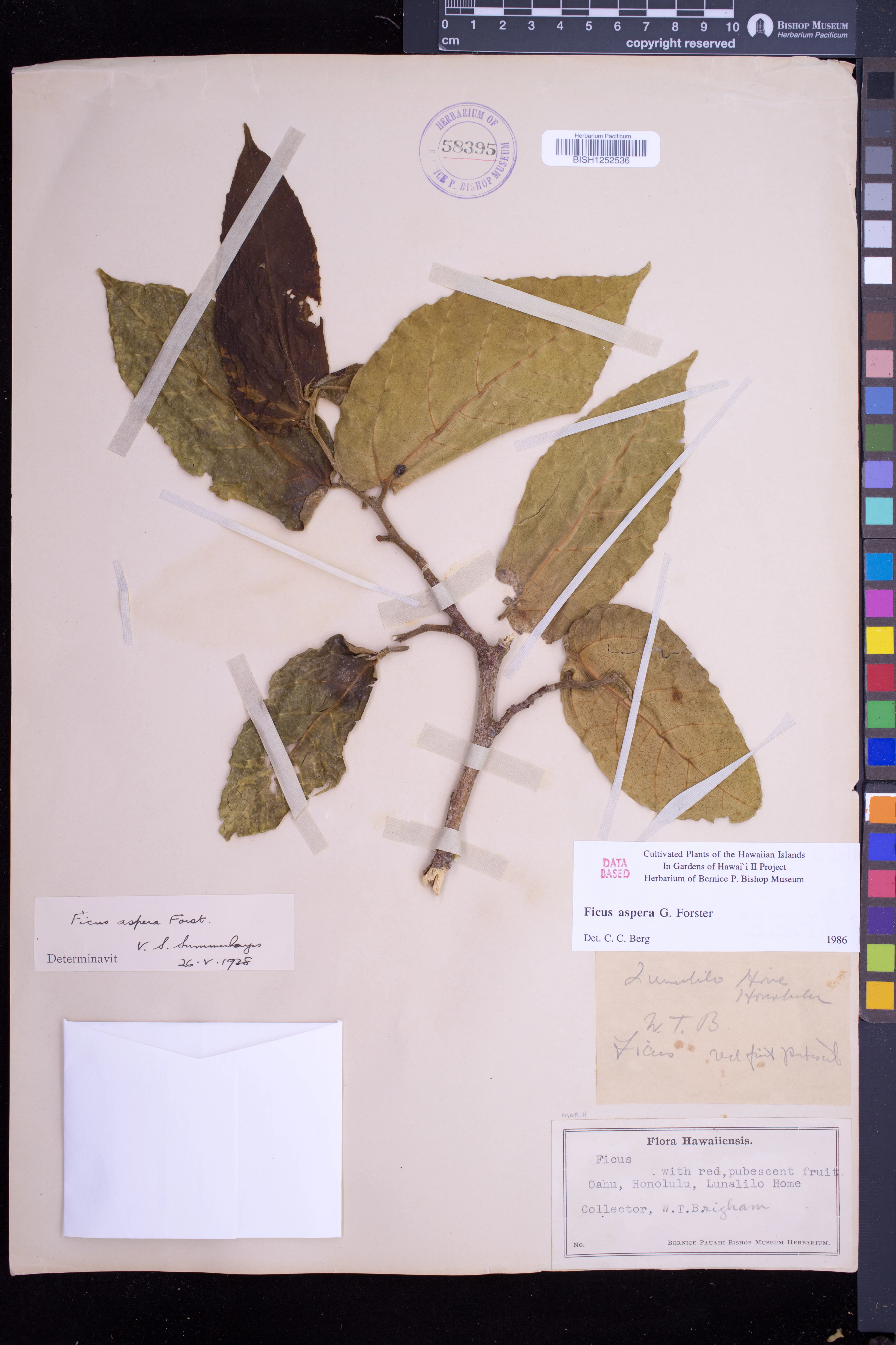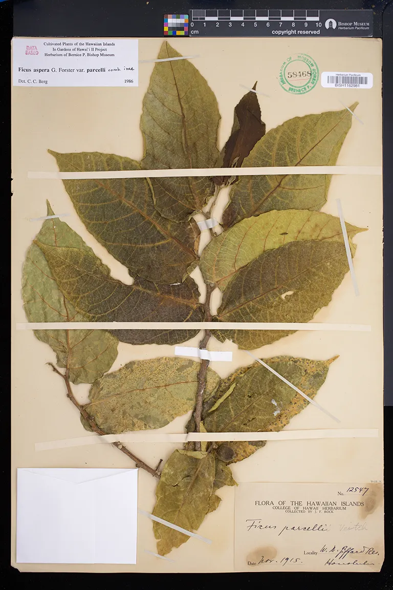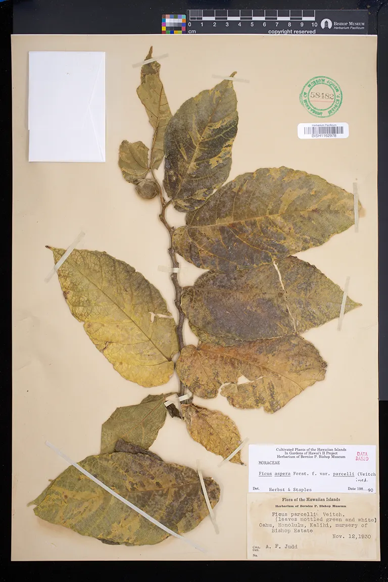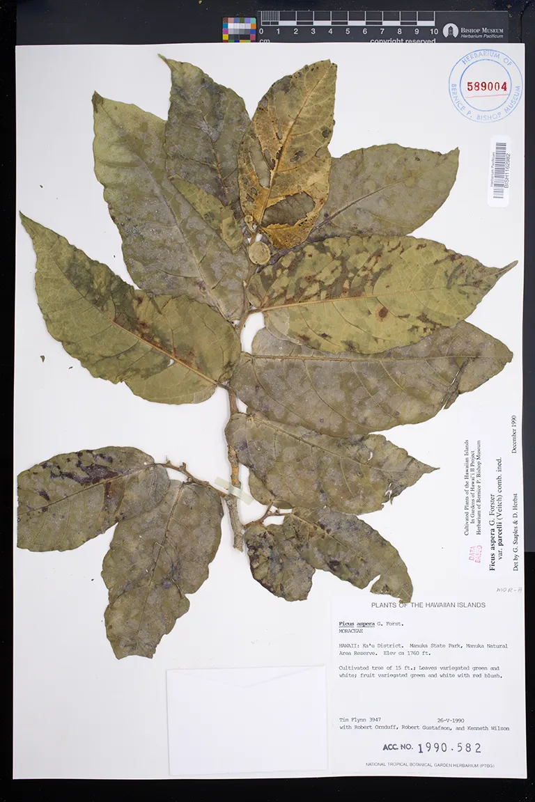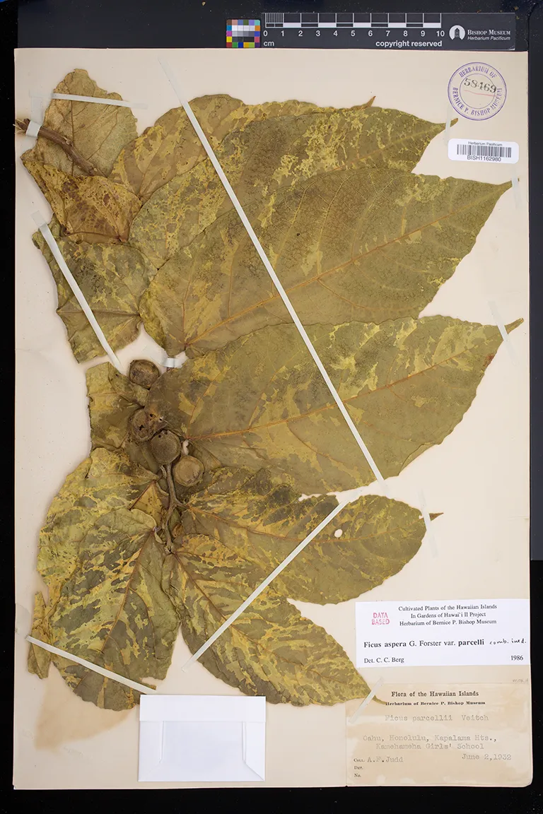 | 6 | Ficus aspera | G.Forst. | Honolulu, Lunalilo Home | PRESERVED_SPECIMEN | Brigham, W.T. | s.n. | Oahu | BISH | ||