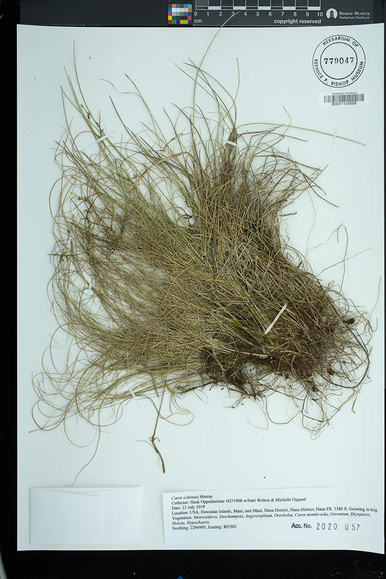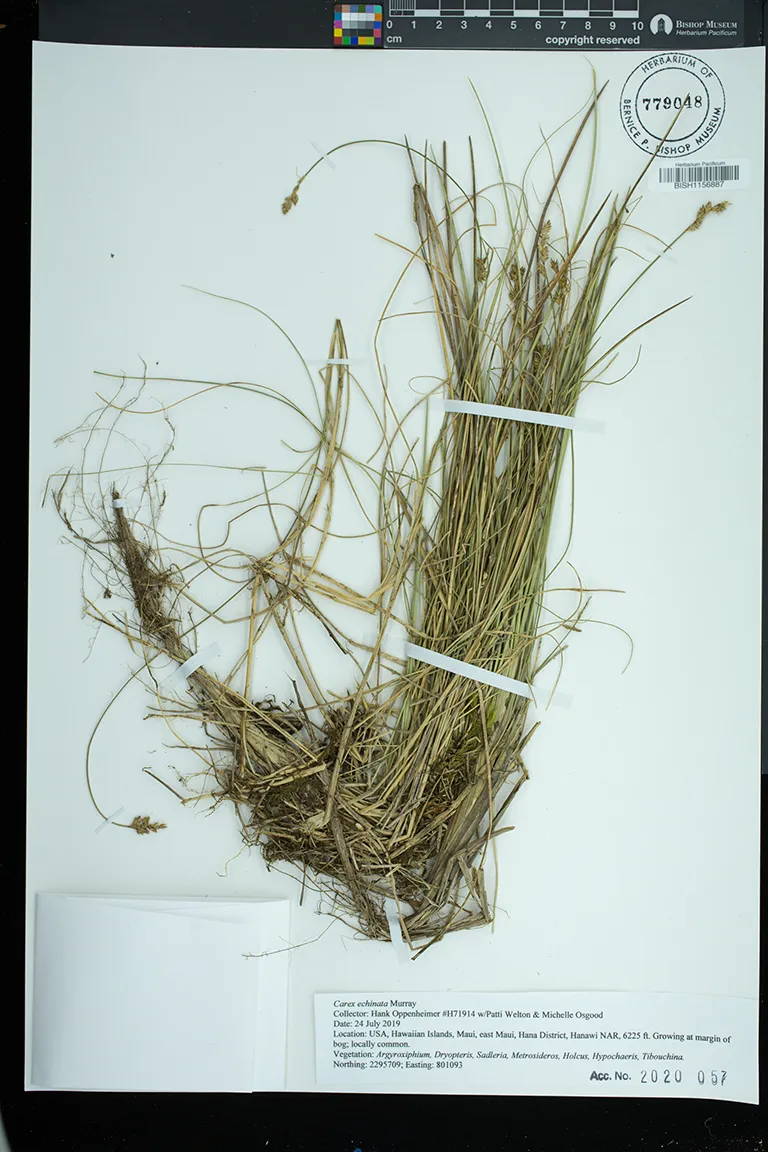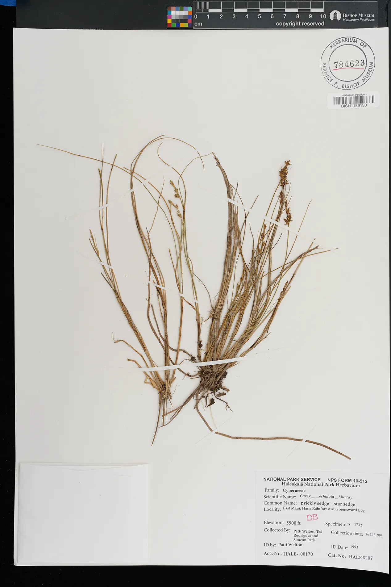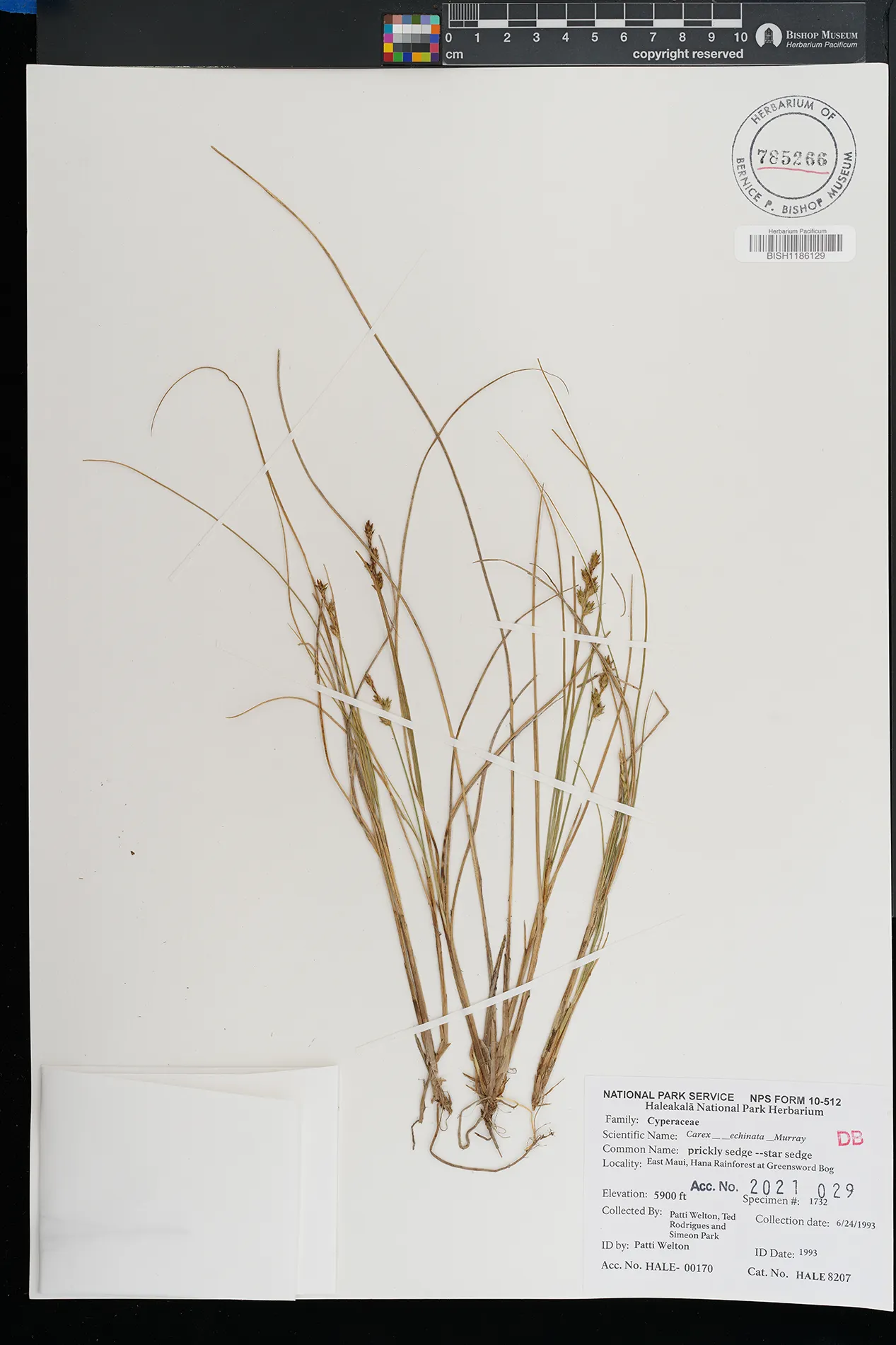 Common sedge in silversword bog, most abundant toward forest edge. Associated with Carex alligata, C. montis-eeka, Oreobolus, Rhynchospora spiciformis, Deschampsia and Panicum hillebrandianum. |
