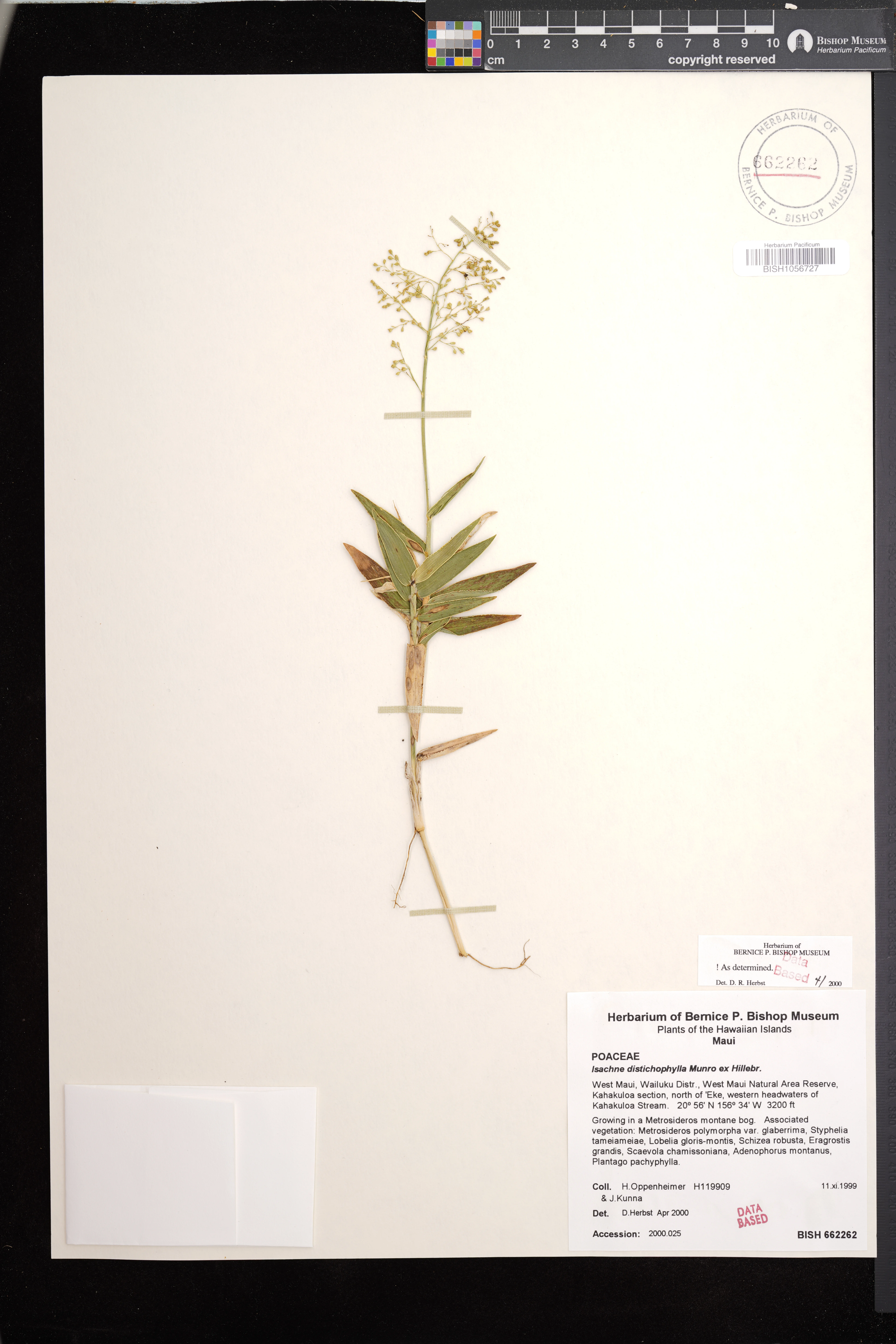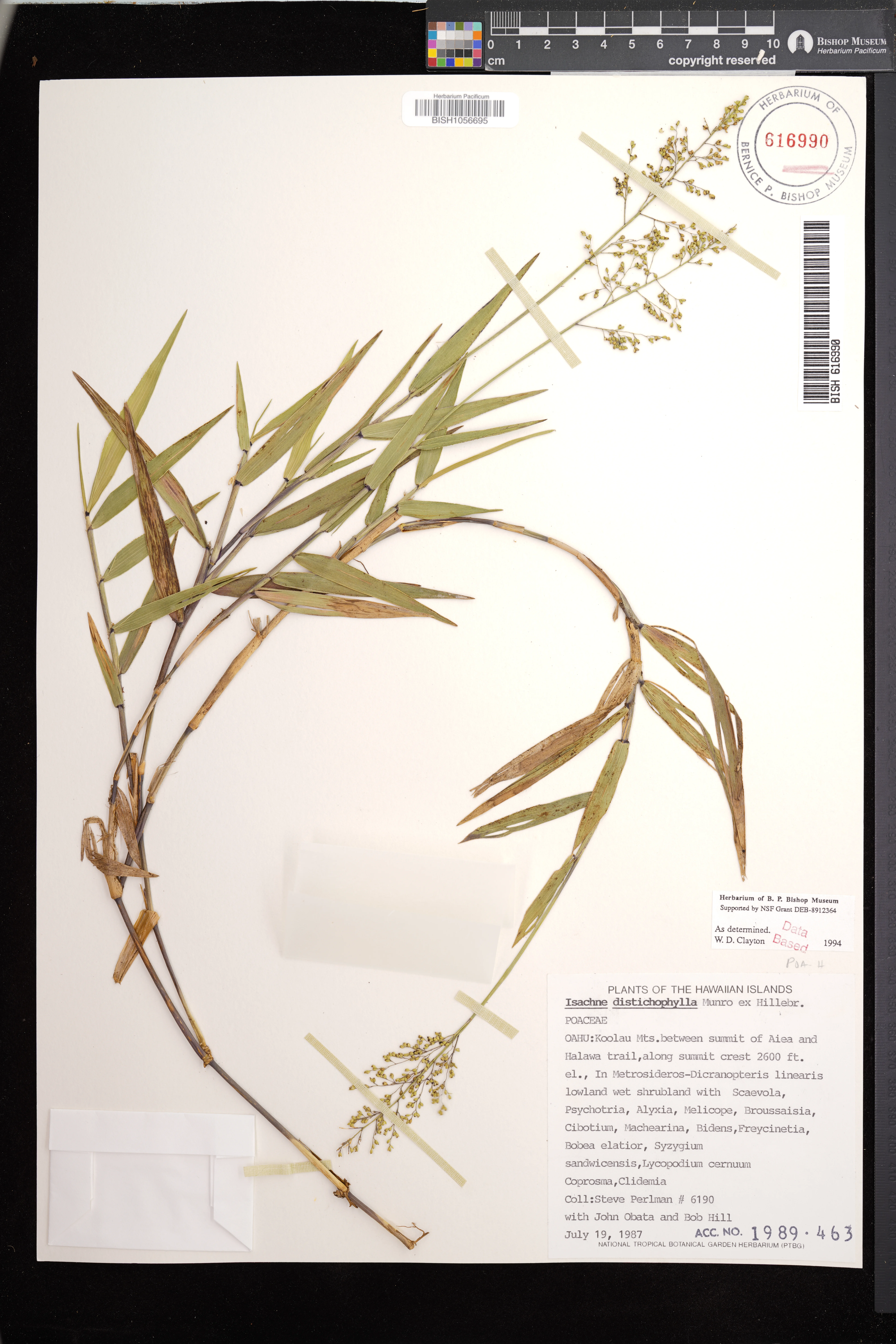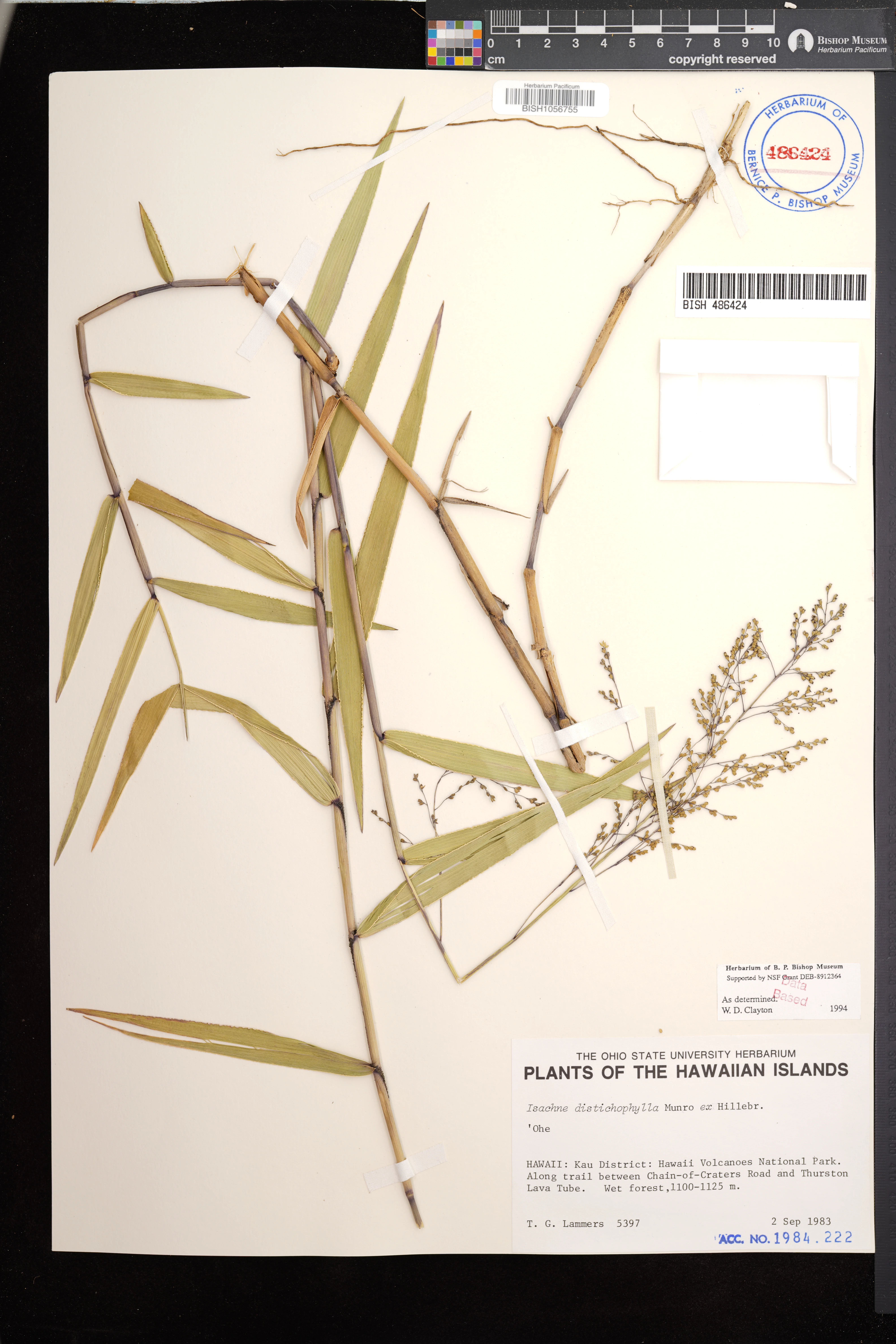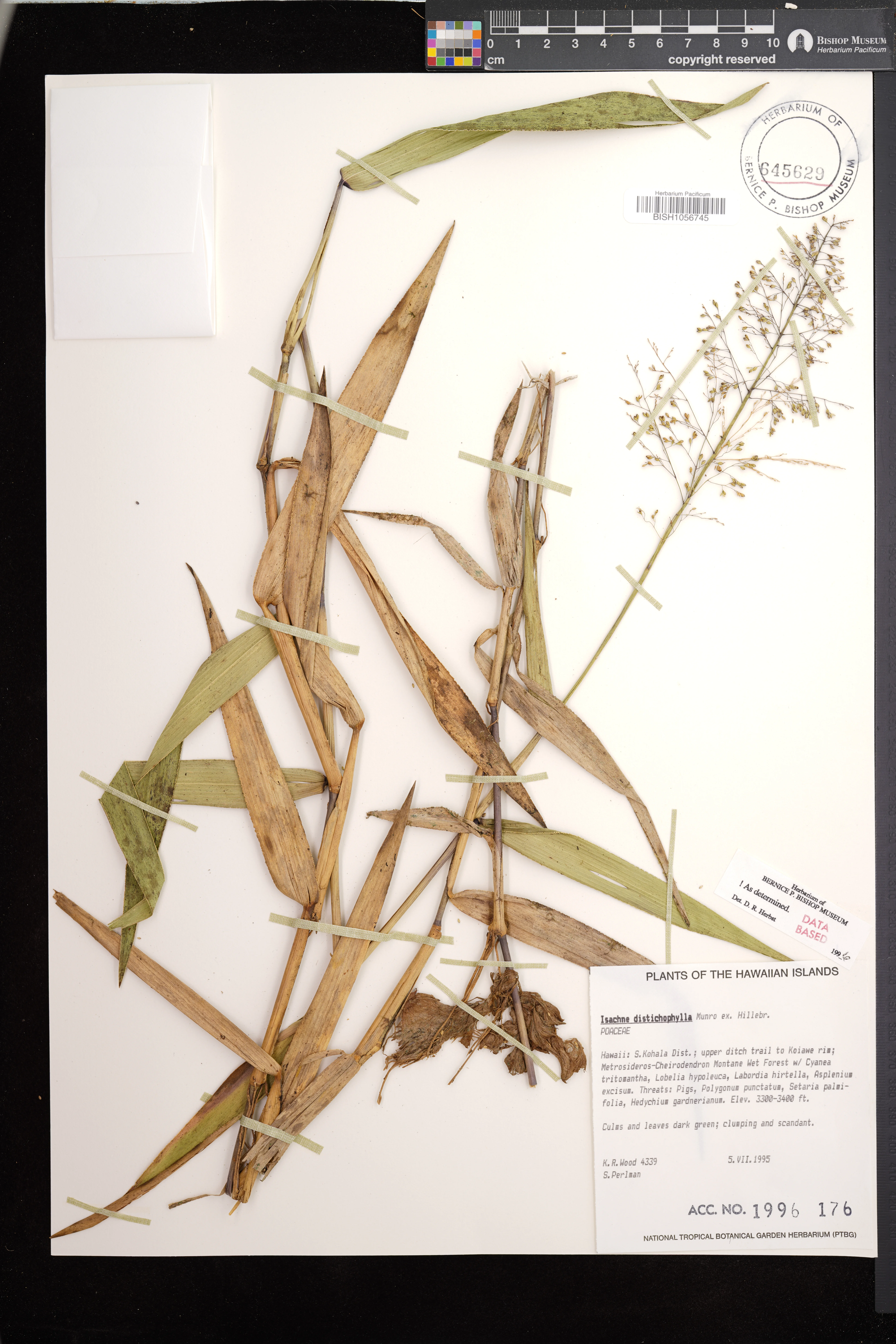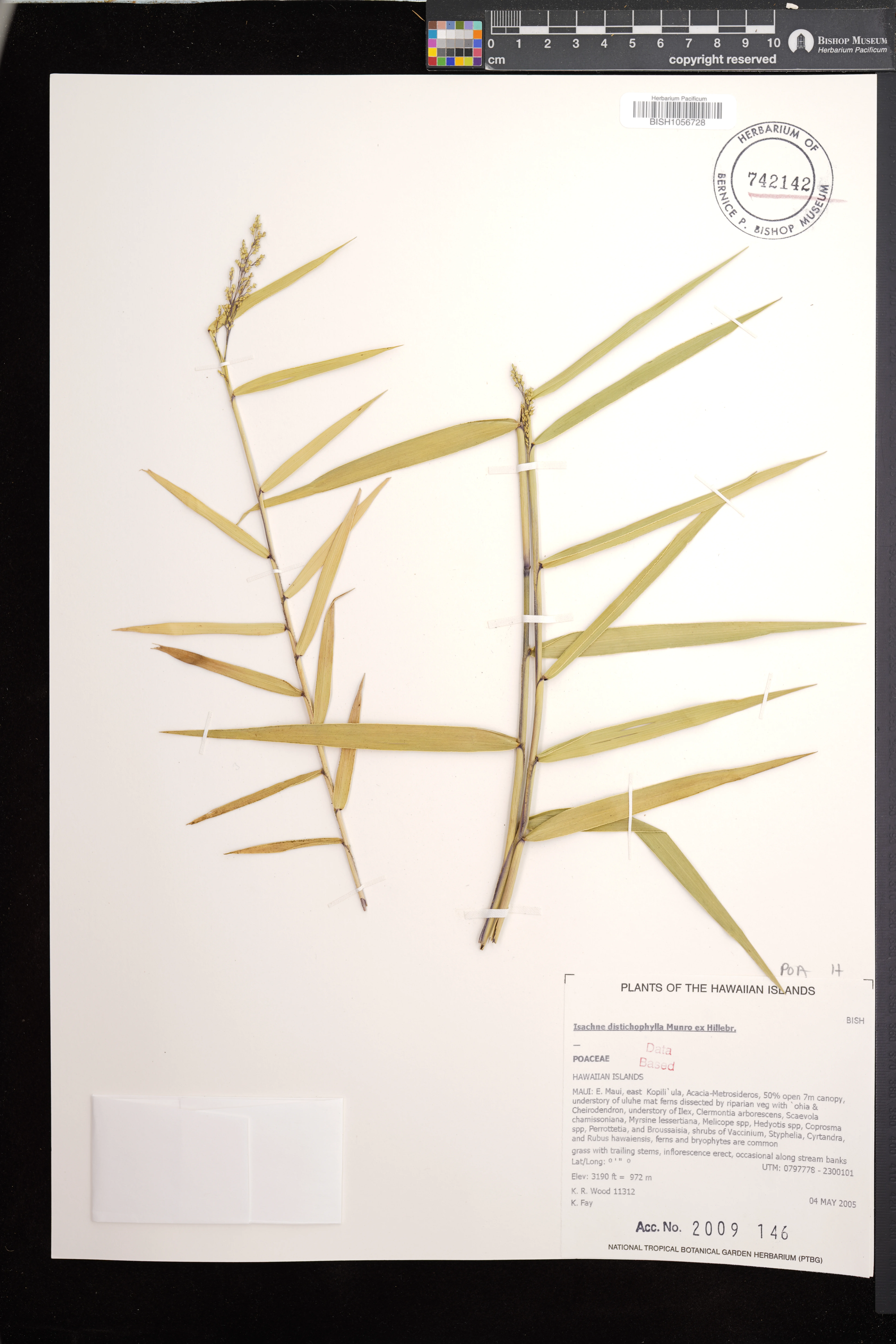 Forming small patches often w/ Oplismenus. Assoc w/Tetraplasandra-Broussaisia-Metrosideros-Dicranopteris. |