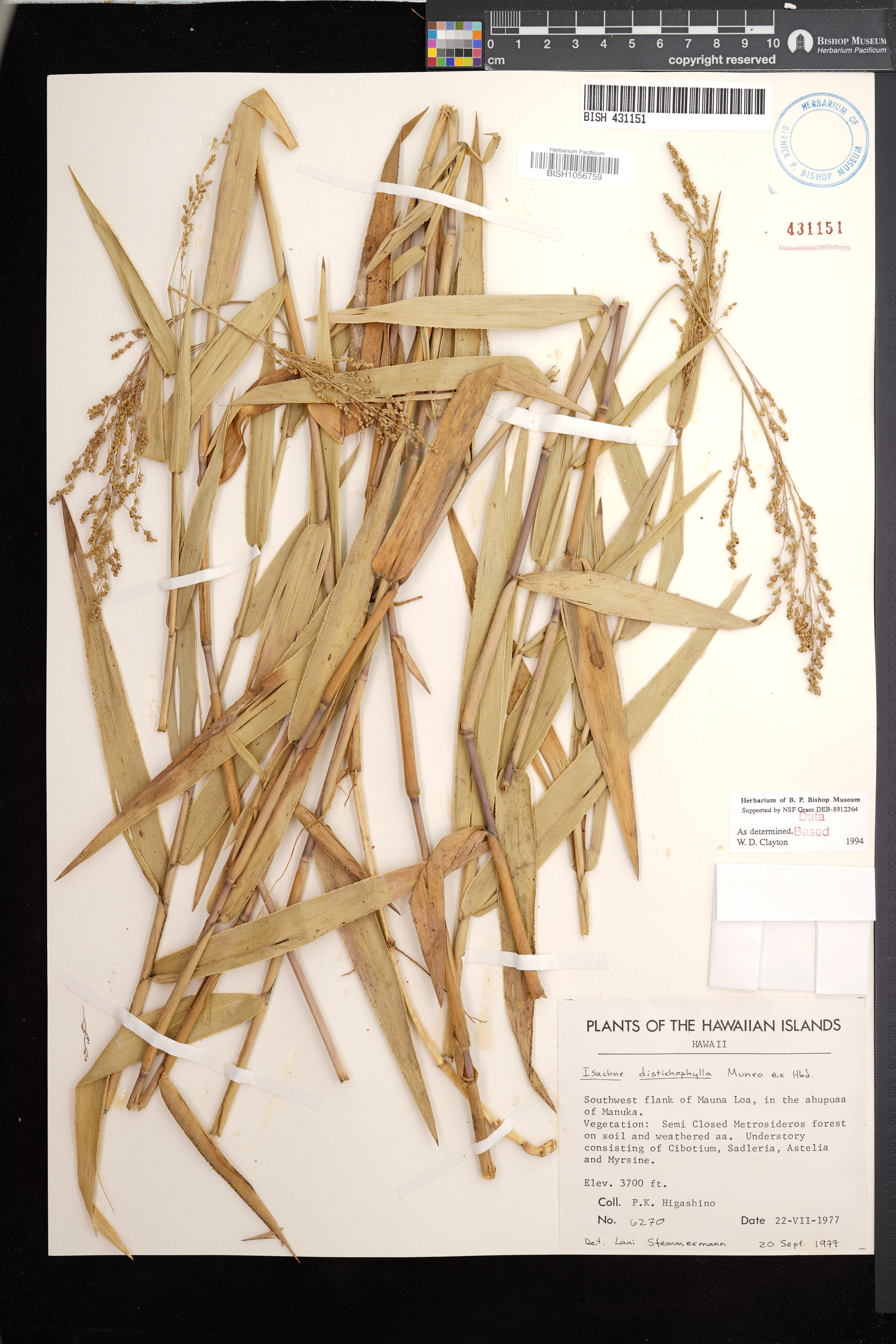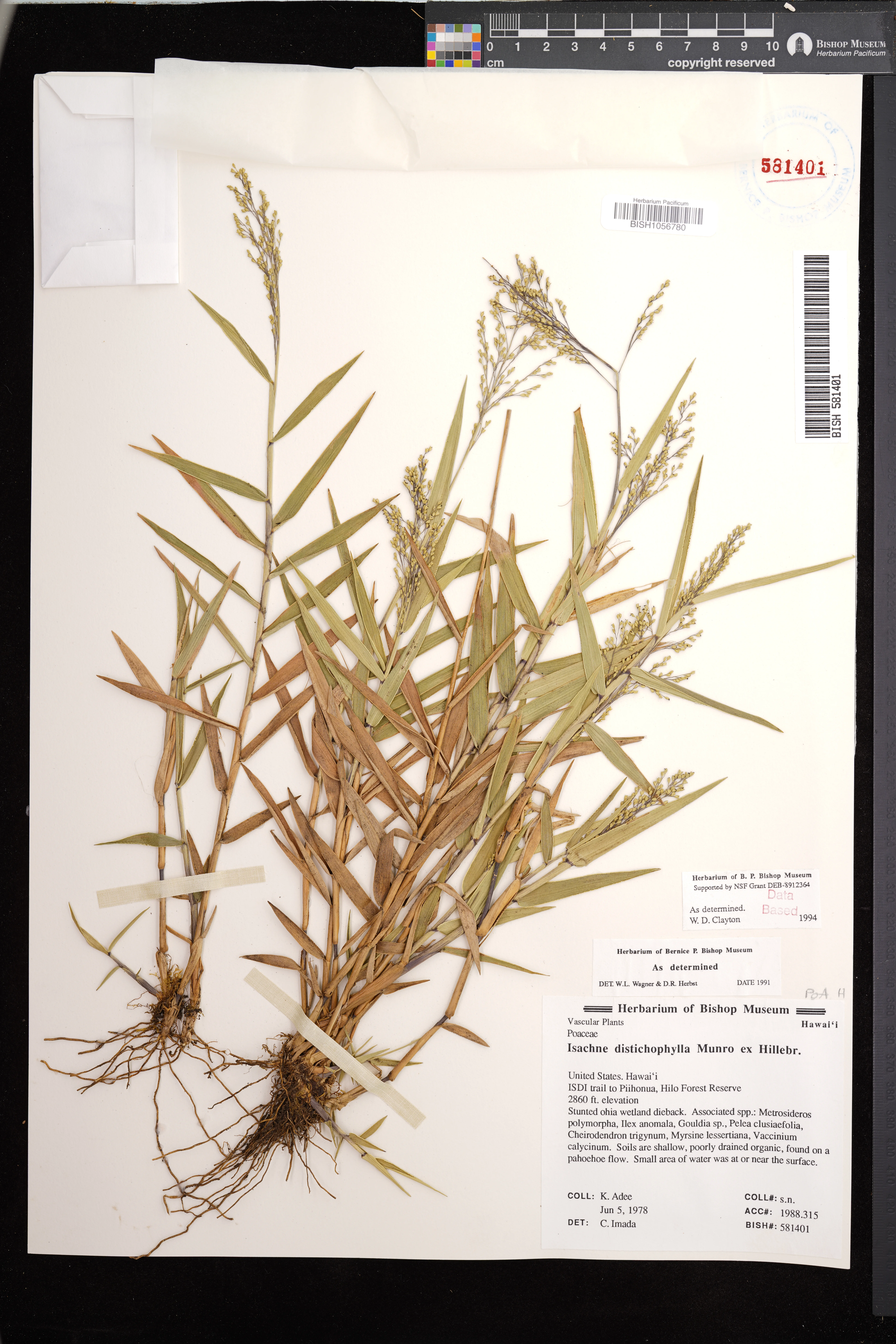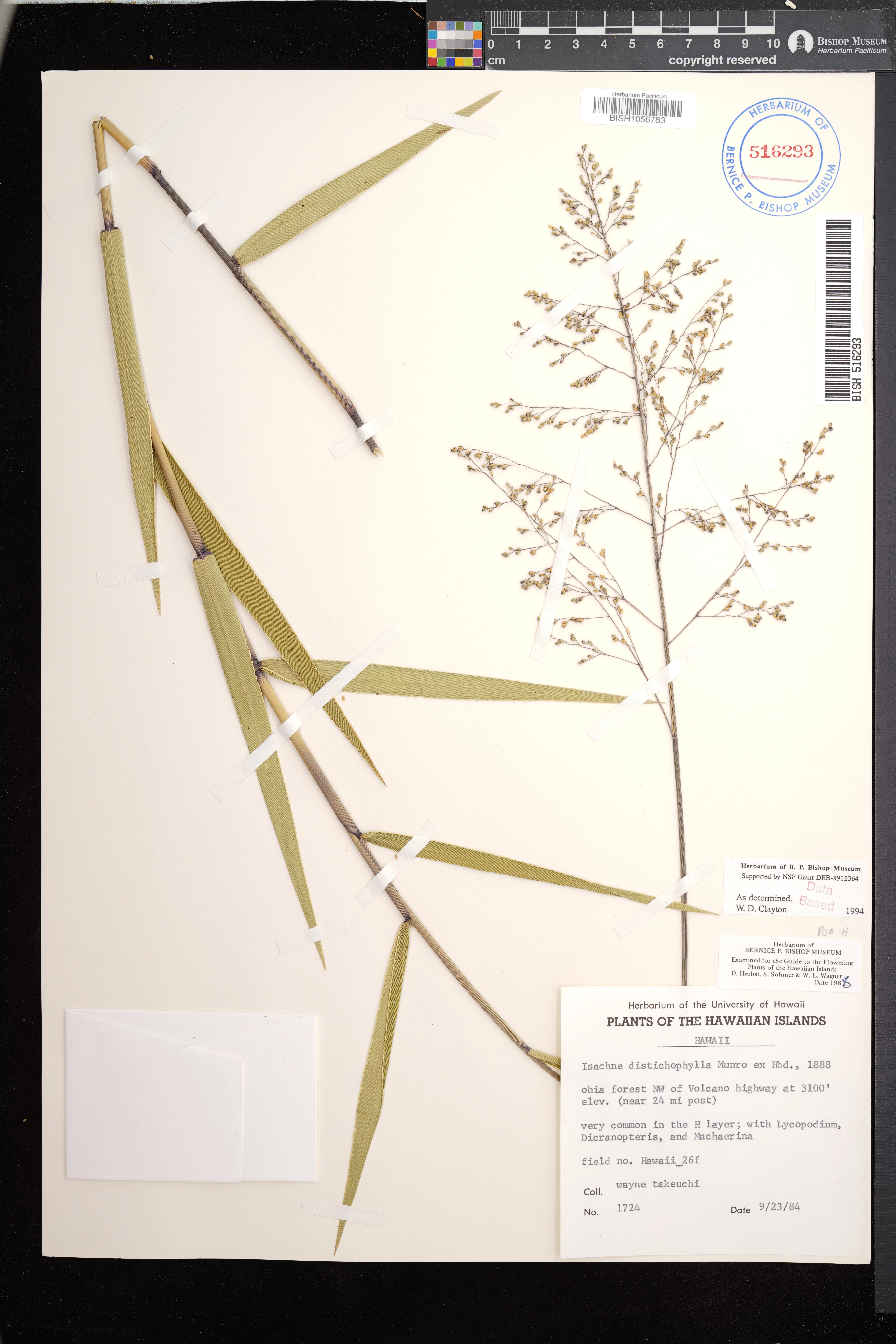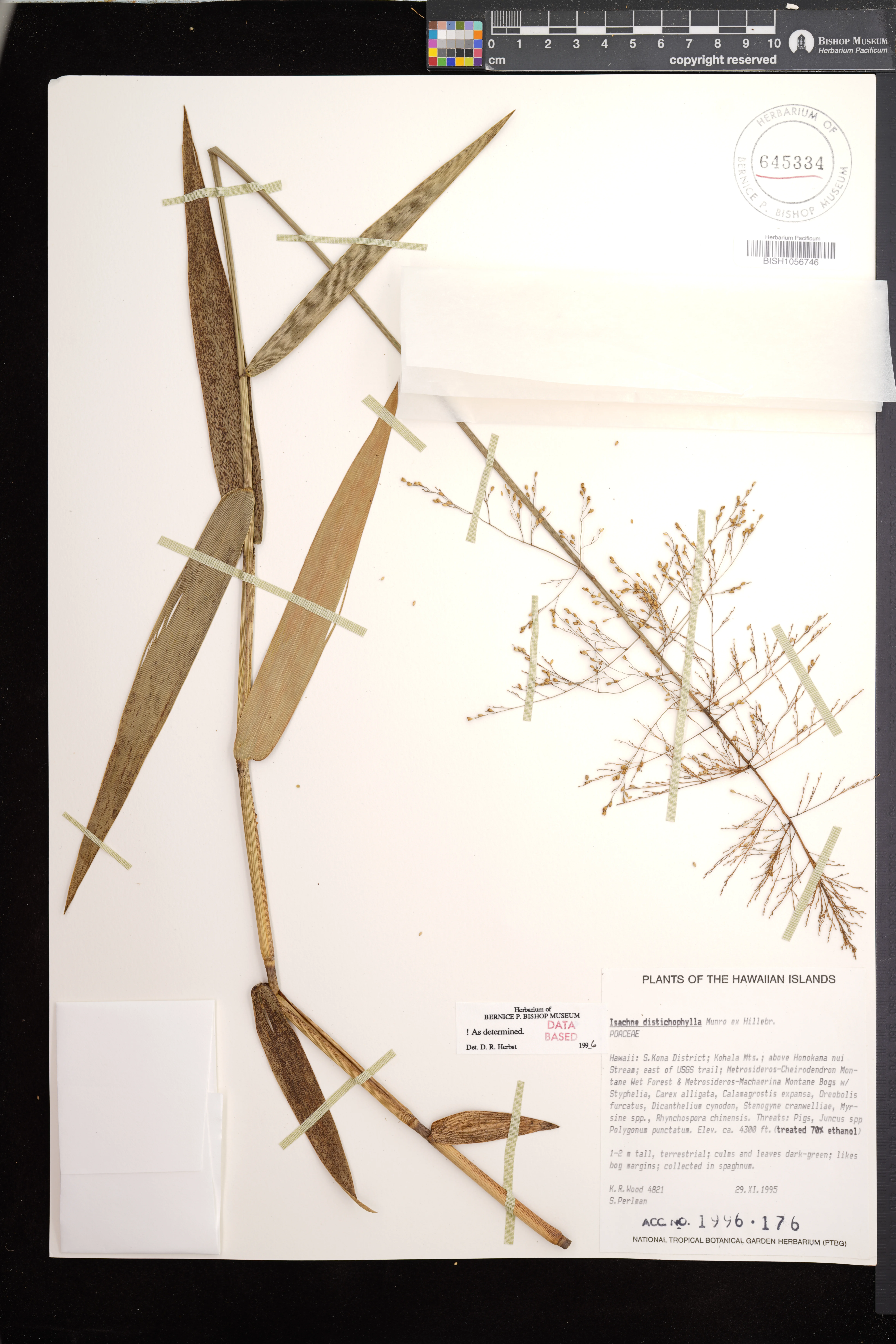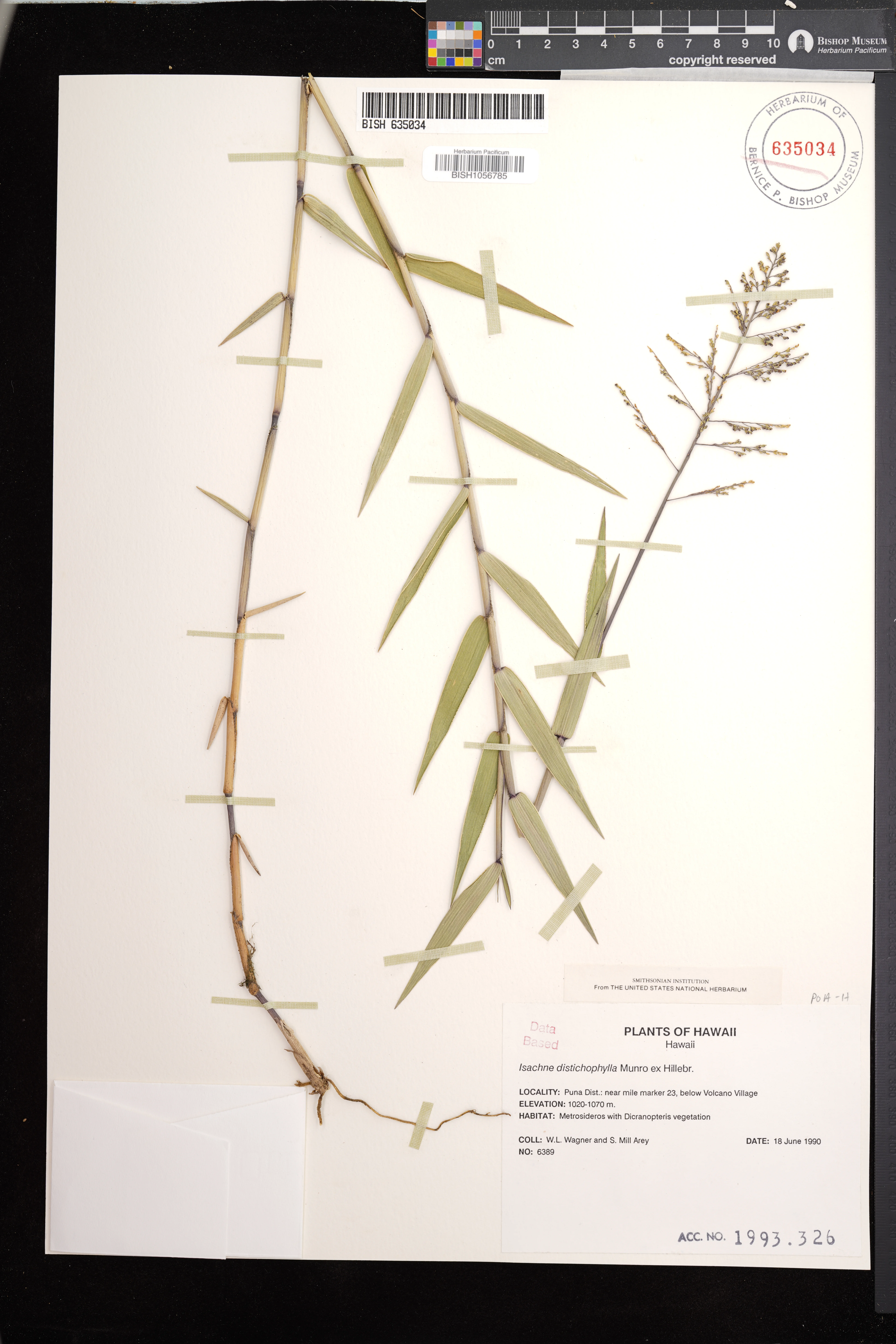 Forming small patches often w/ Oplismenus. Assoc w/Tetraplasandra-Broussaisia-Metrosideros-Dicranopteris. |