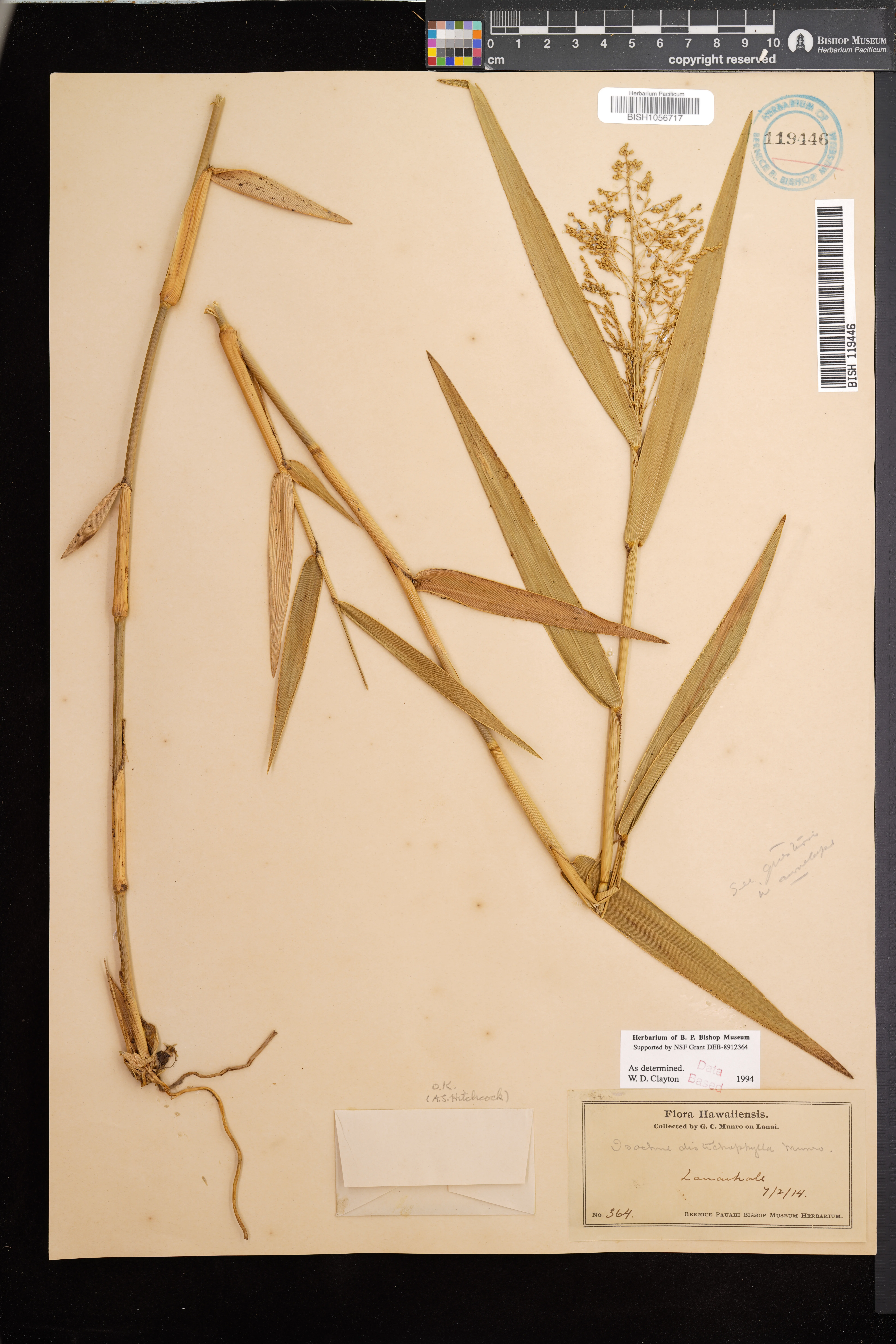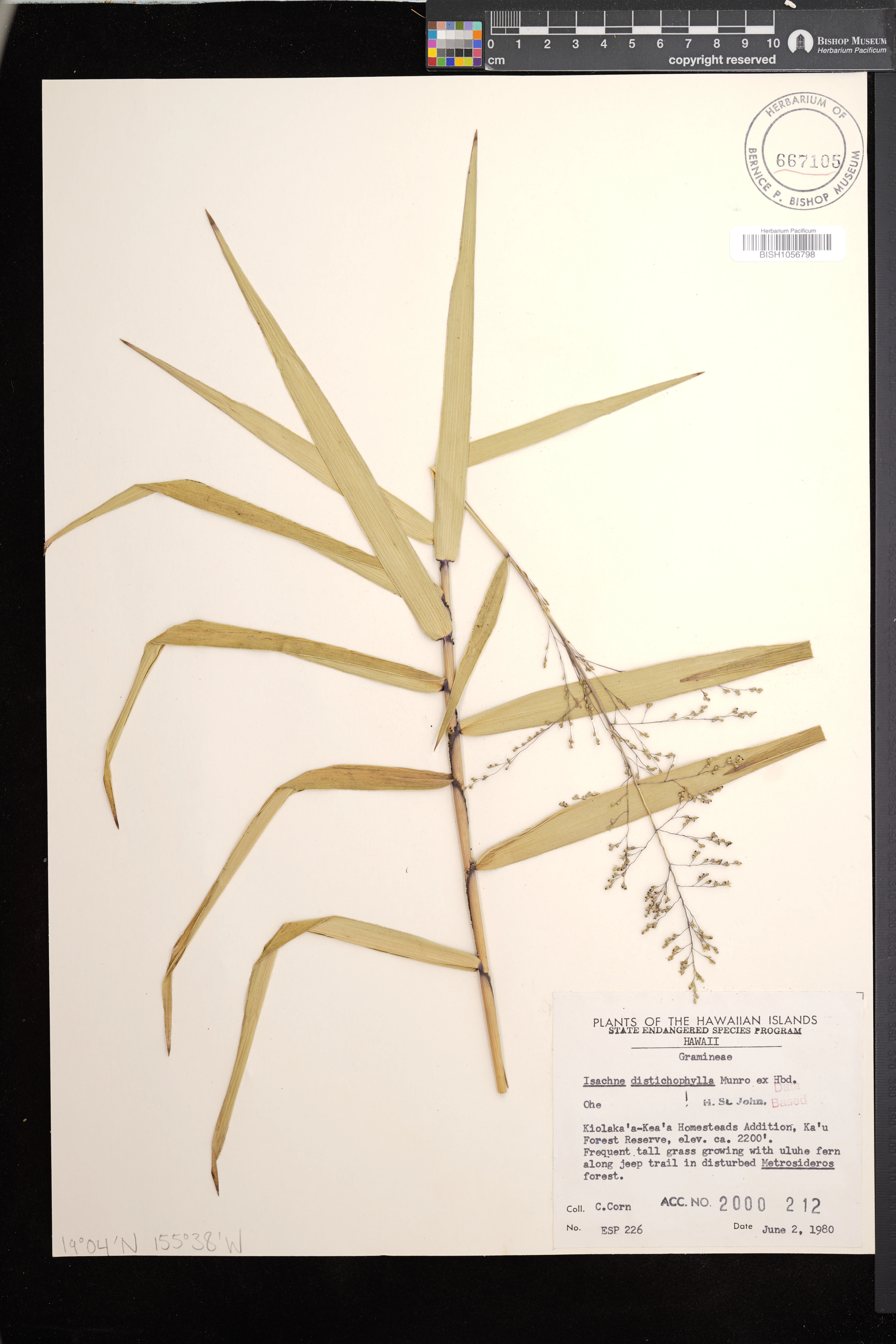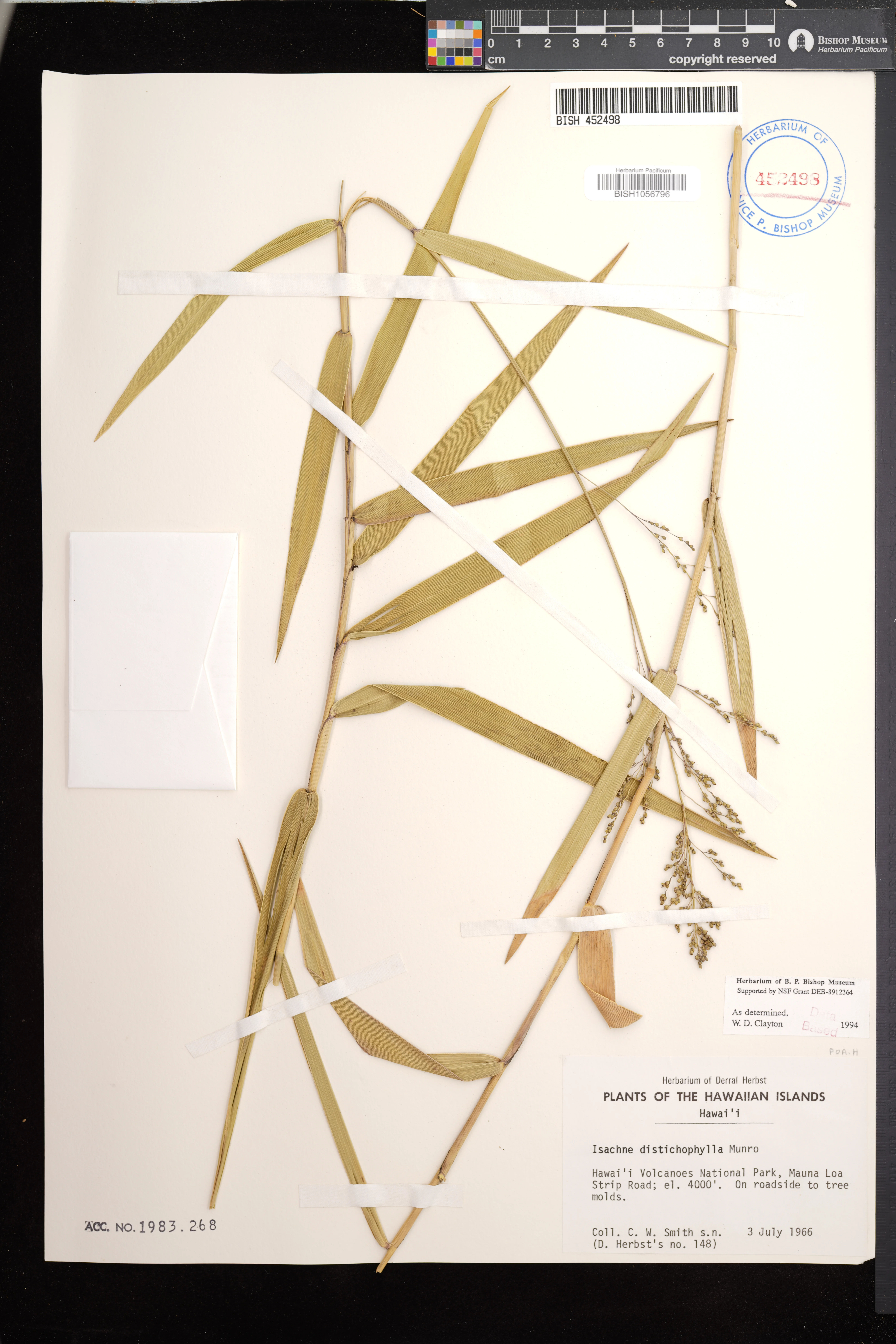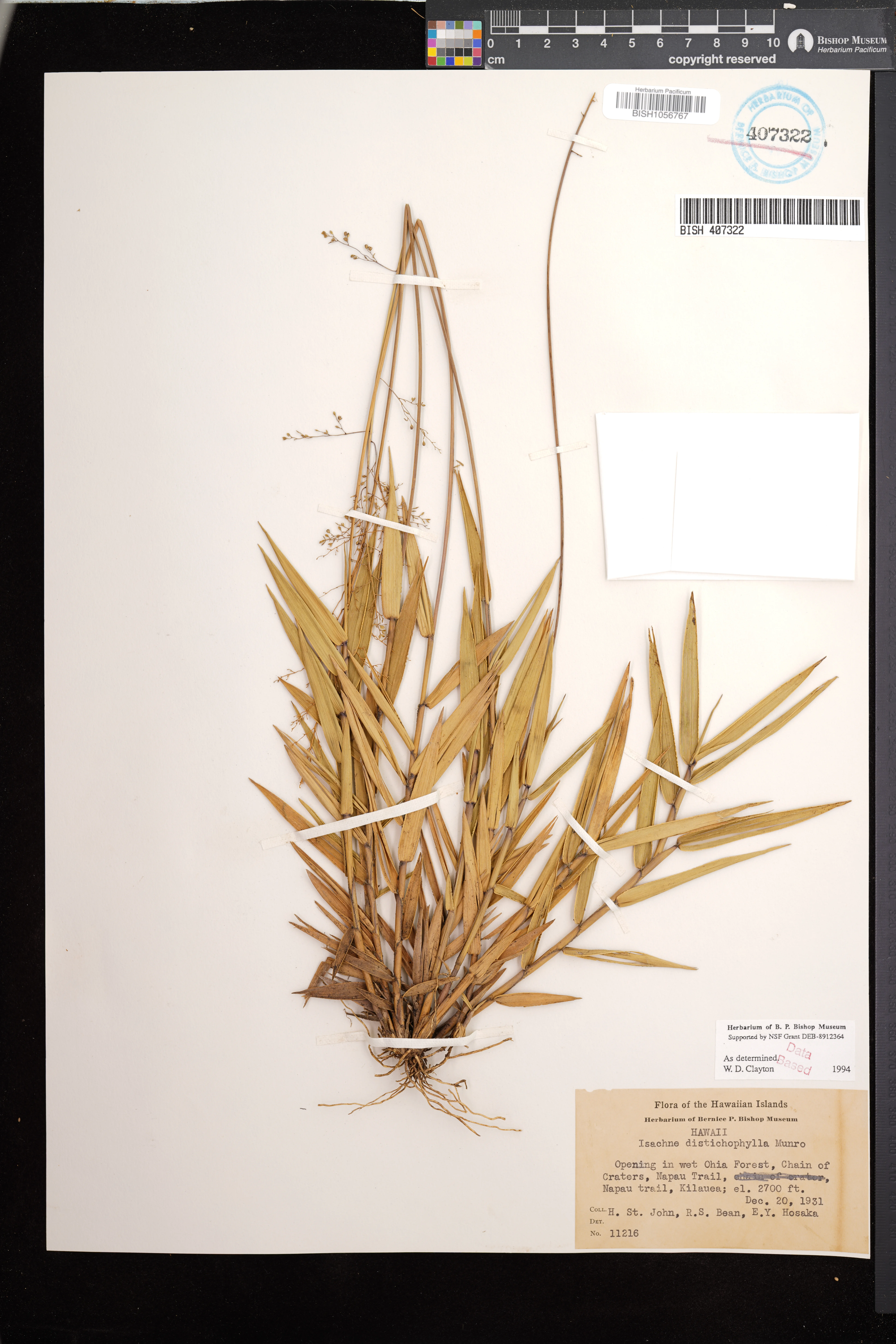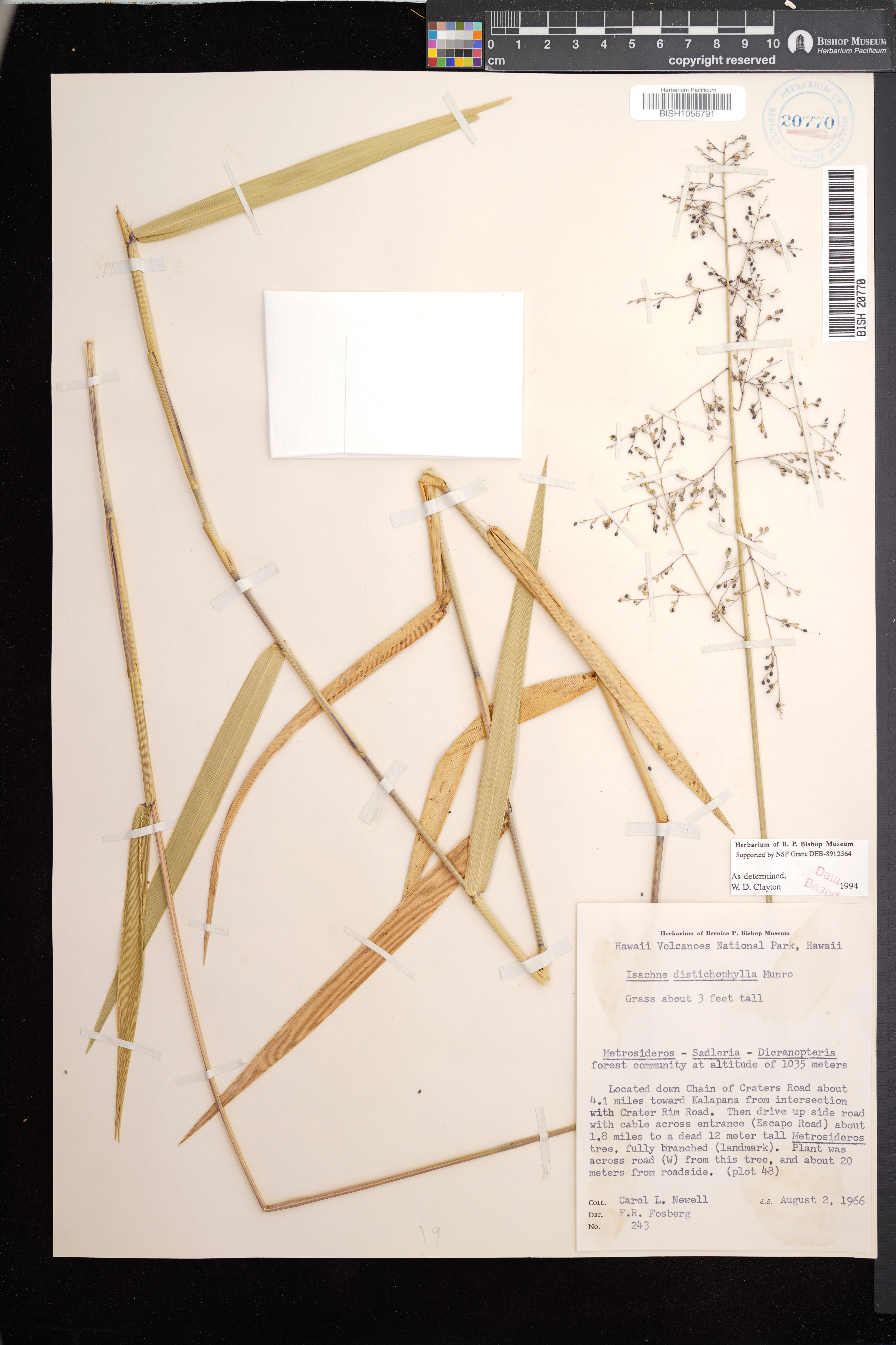 Forming small patches often w/ Oplismenus. Assoc w/Tetraplasandra-Broussaisia-Metrosideros-Dicranopteris. |