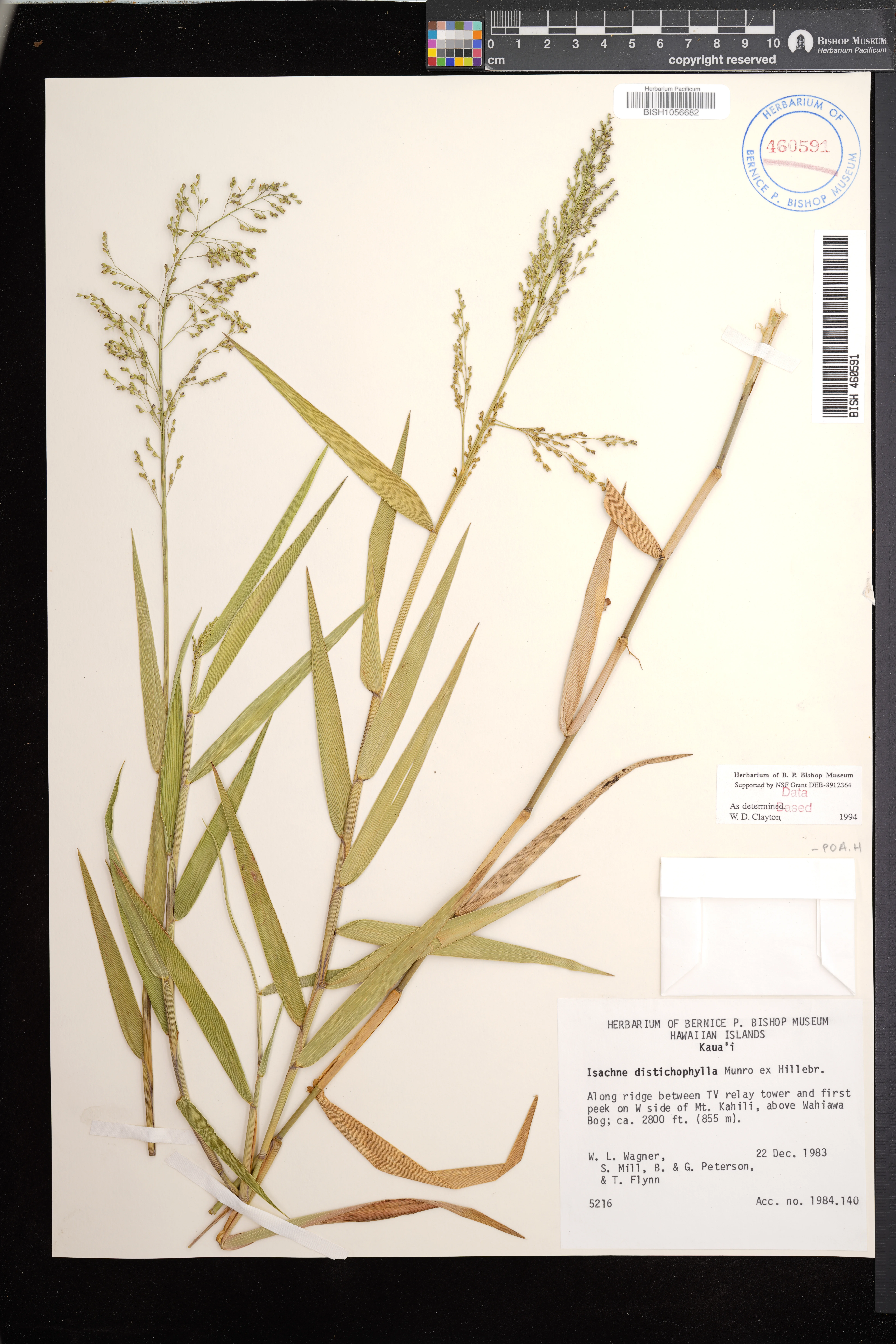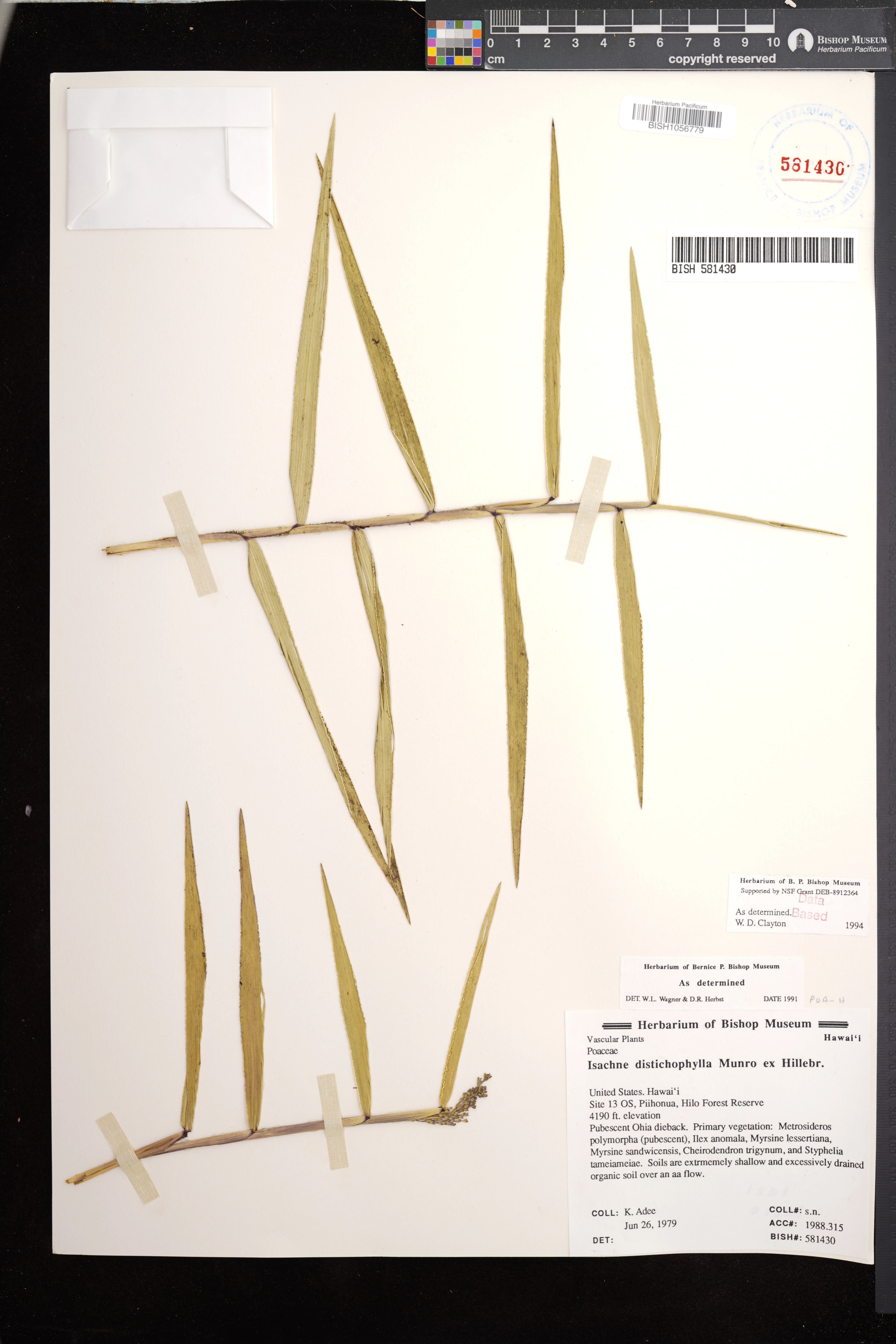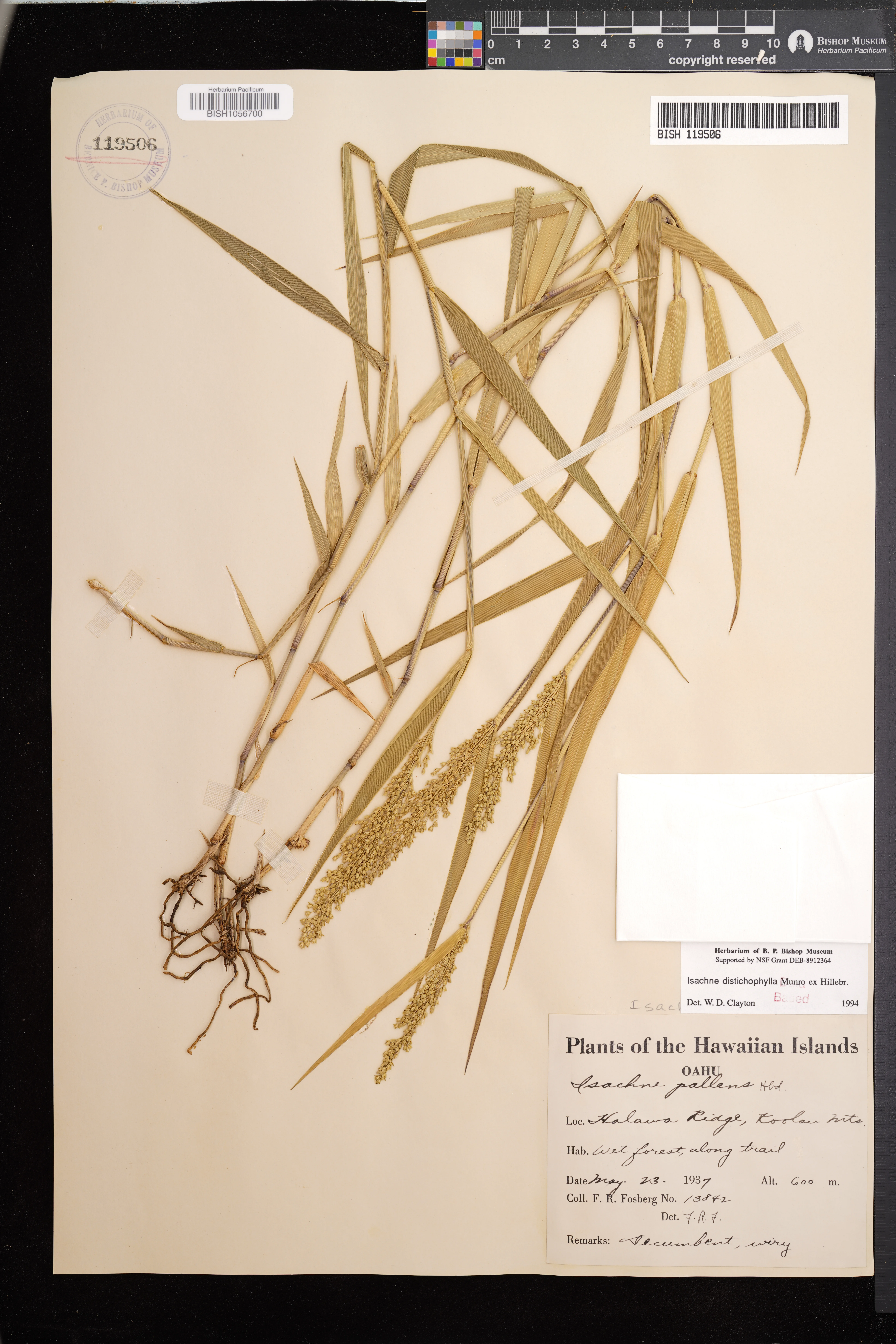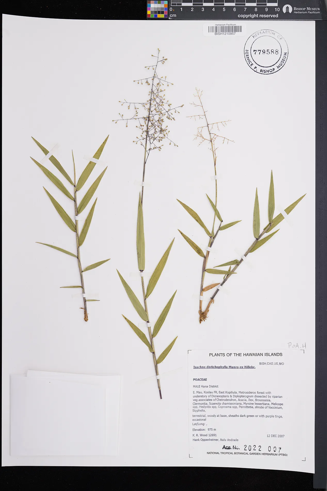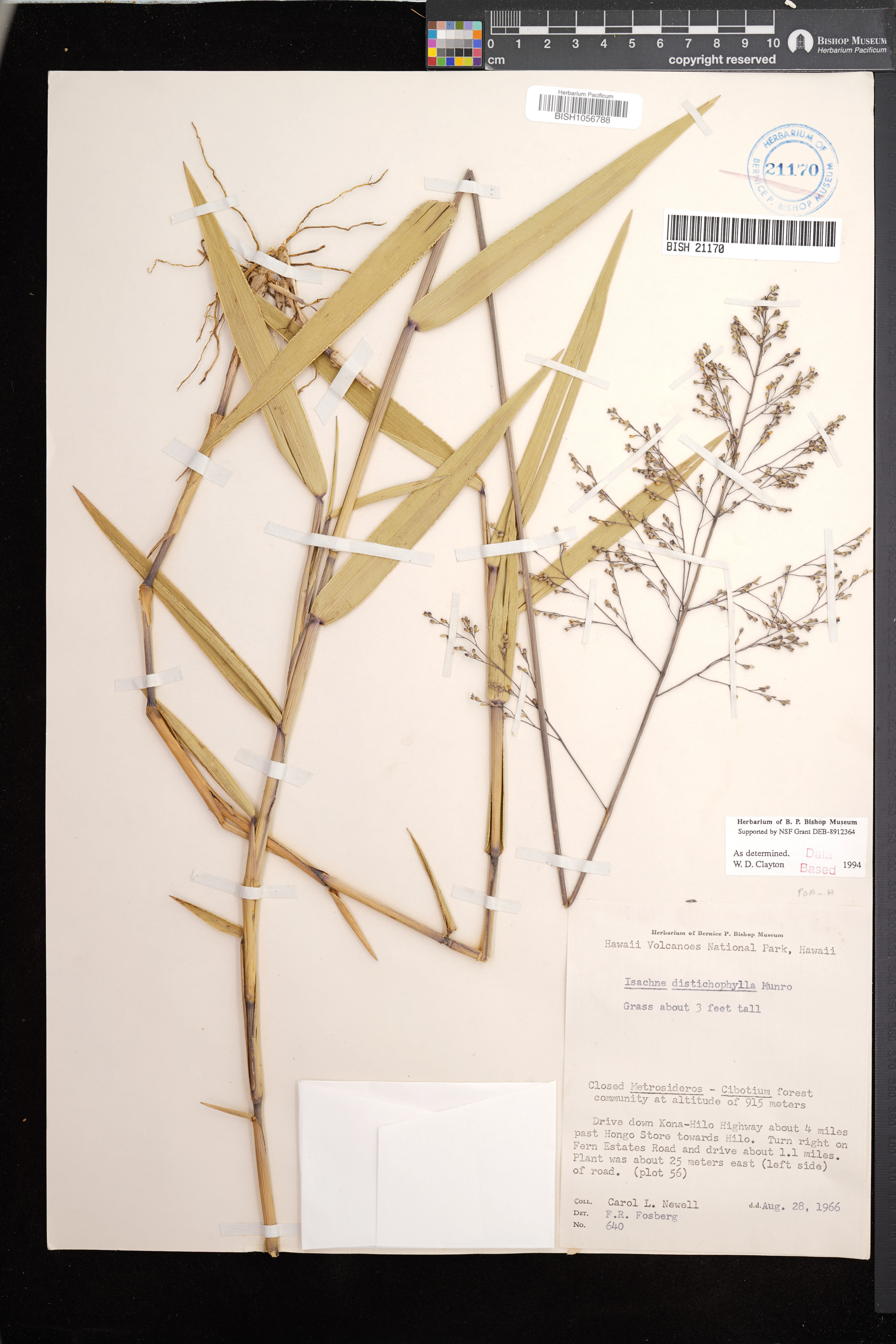 Forming small patches often w/ Oplismenus. Assoc w/Tetraplasandra-Broussaisia-Metrosideros-Dicranopteris. |