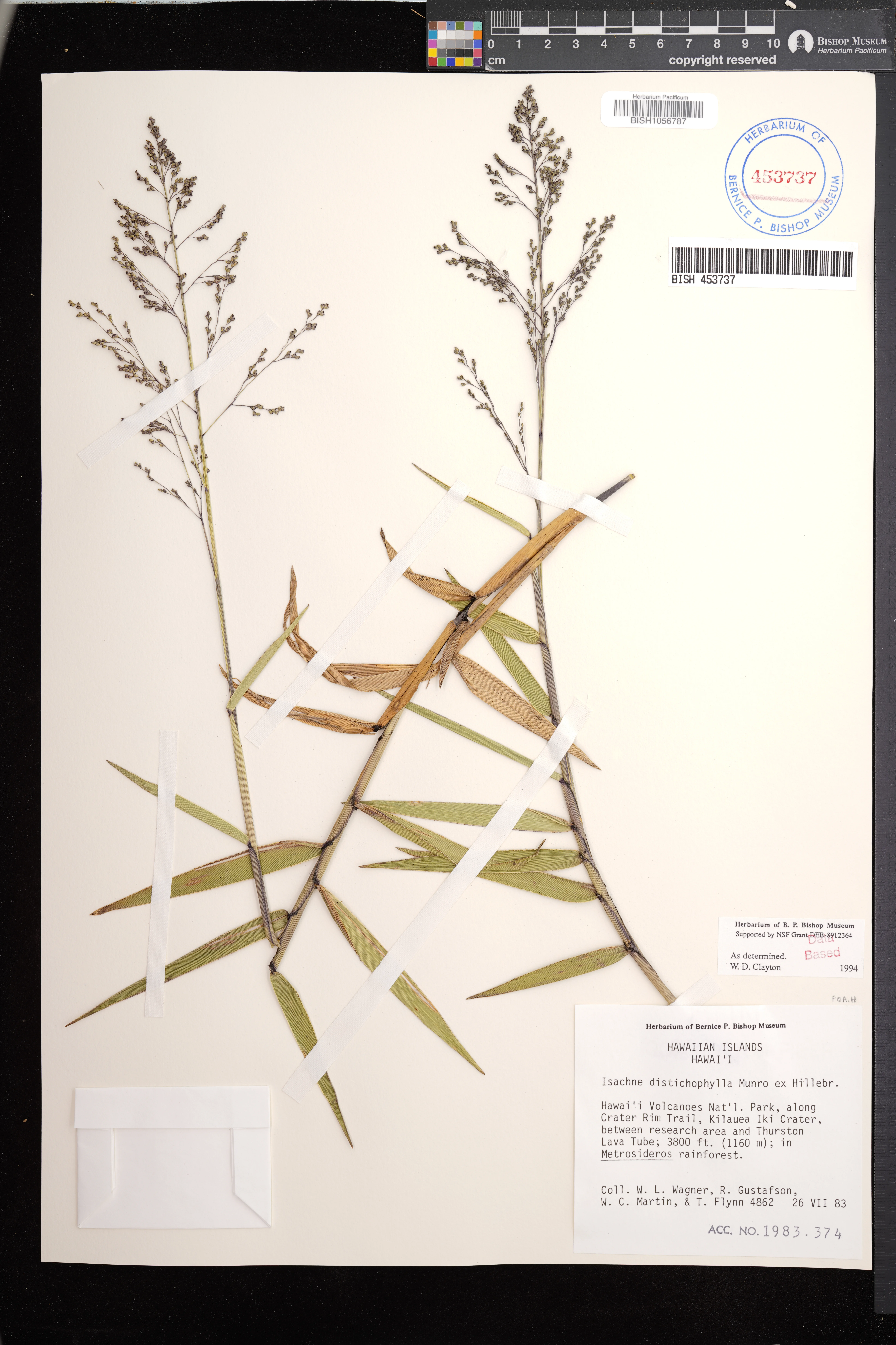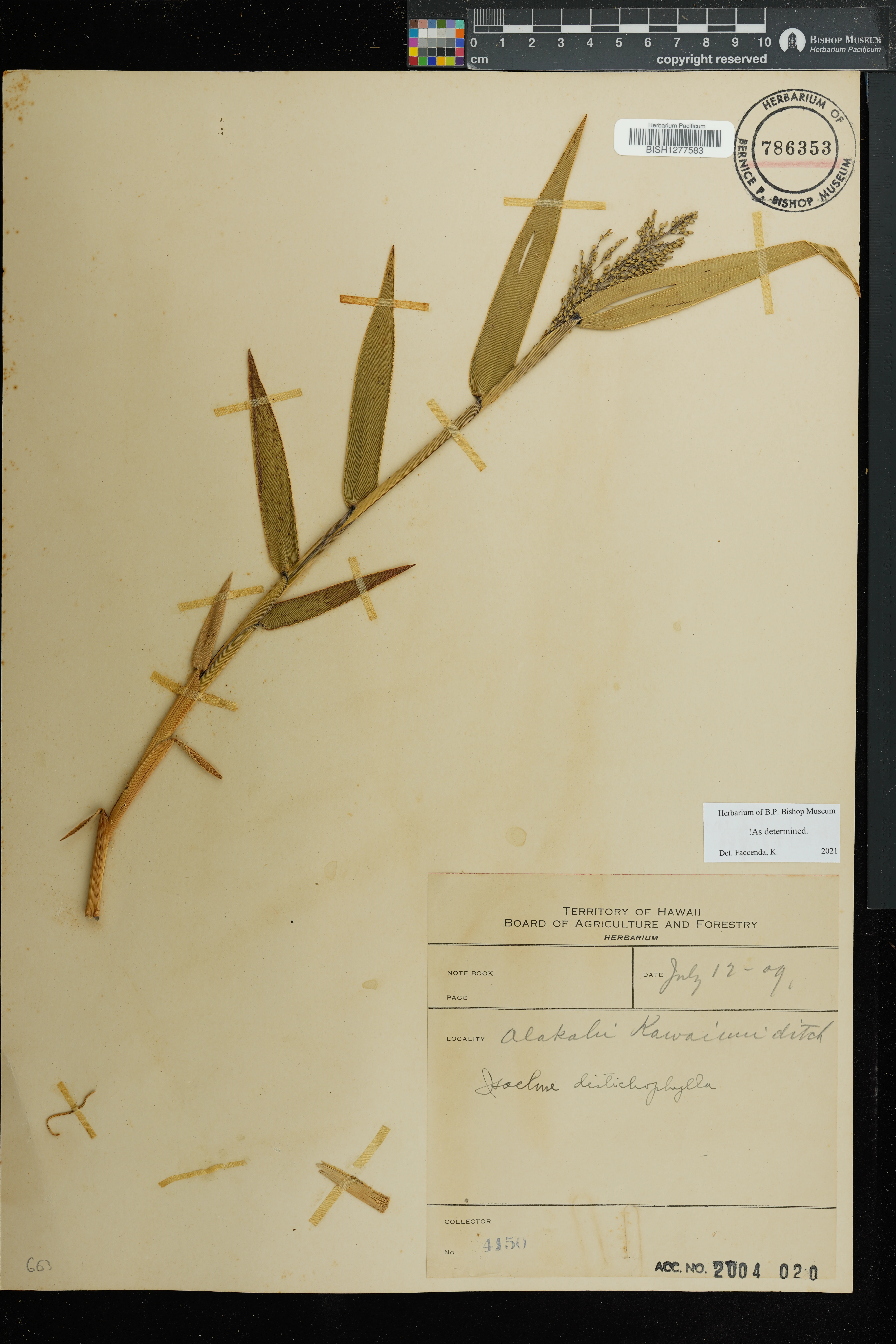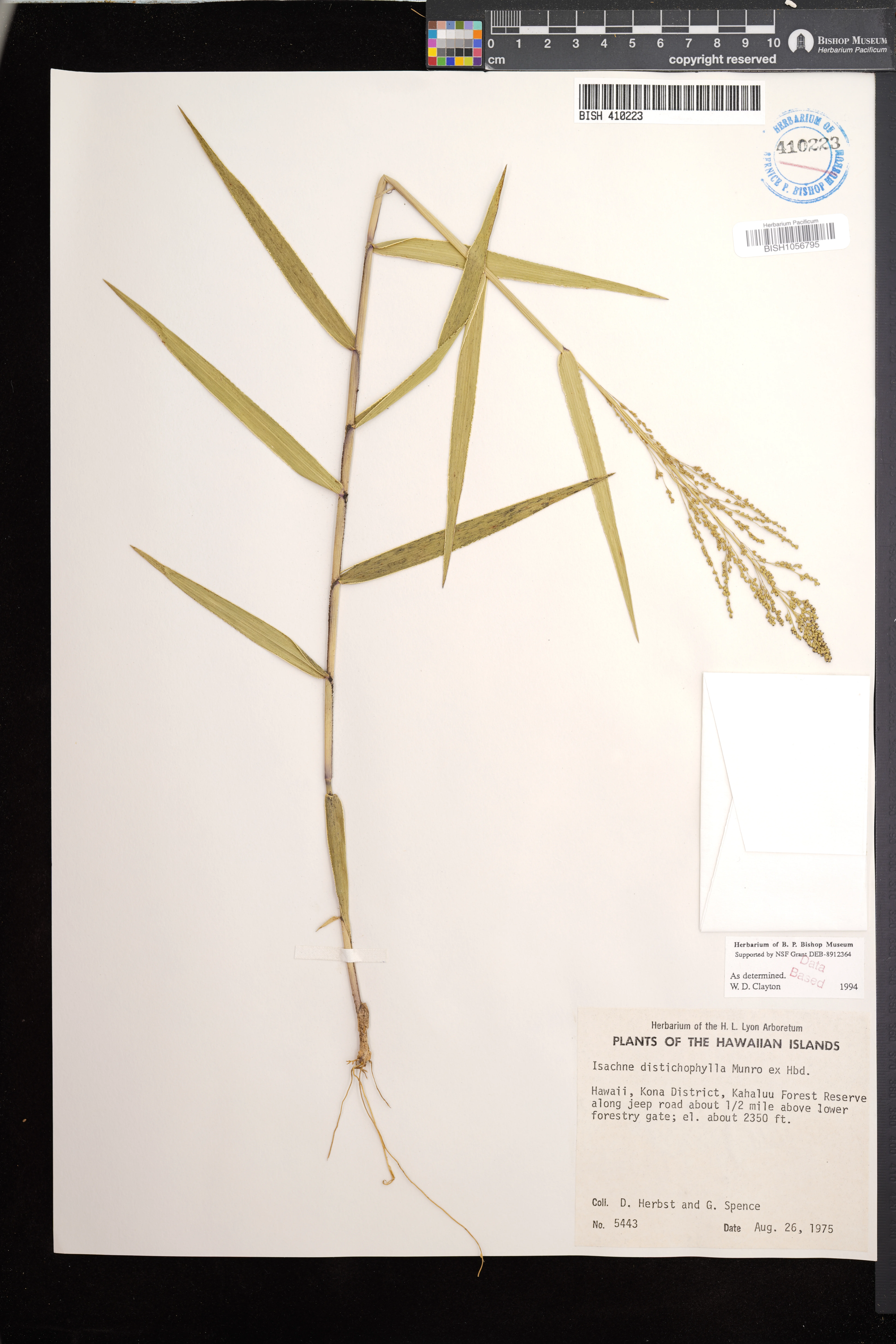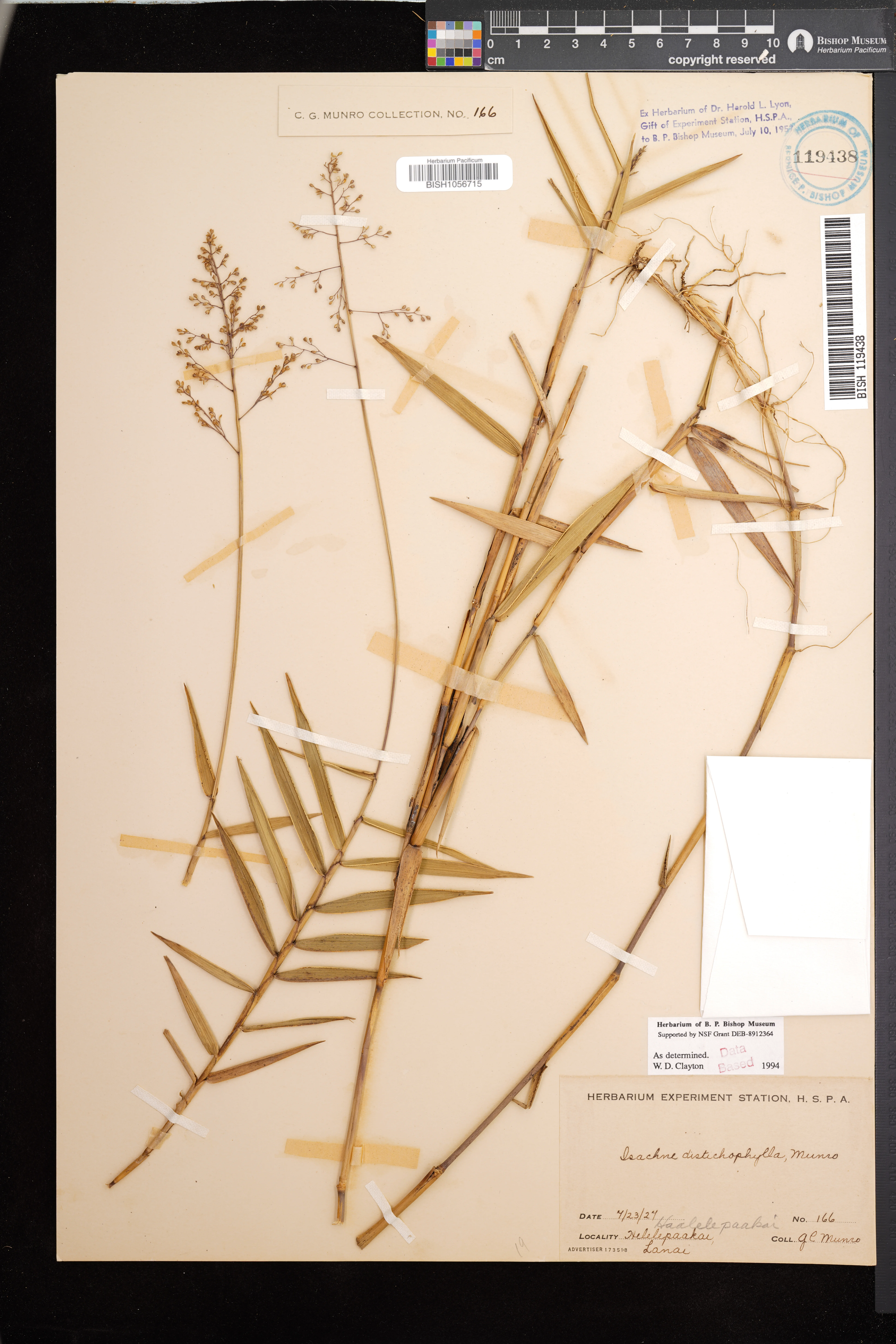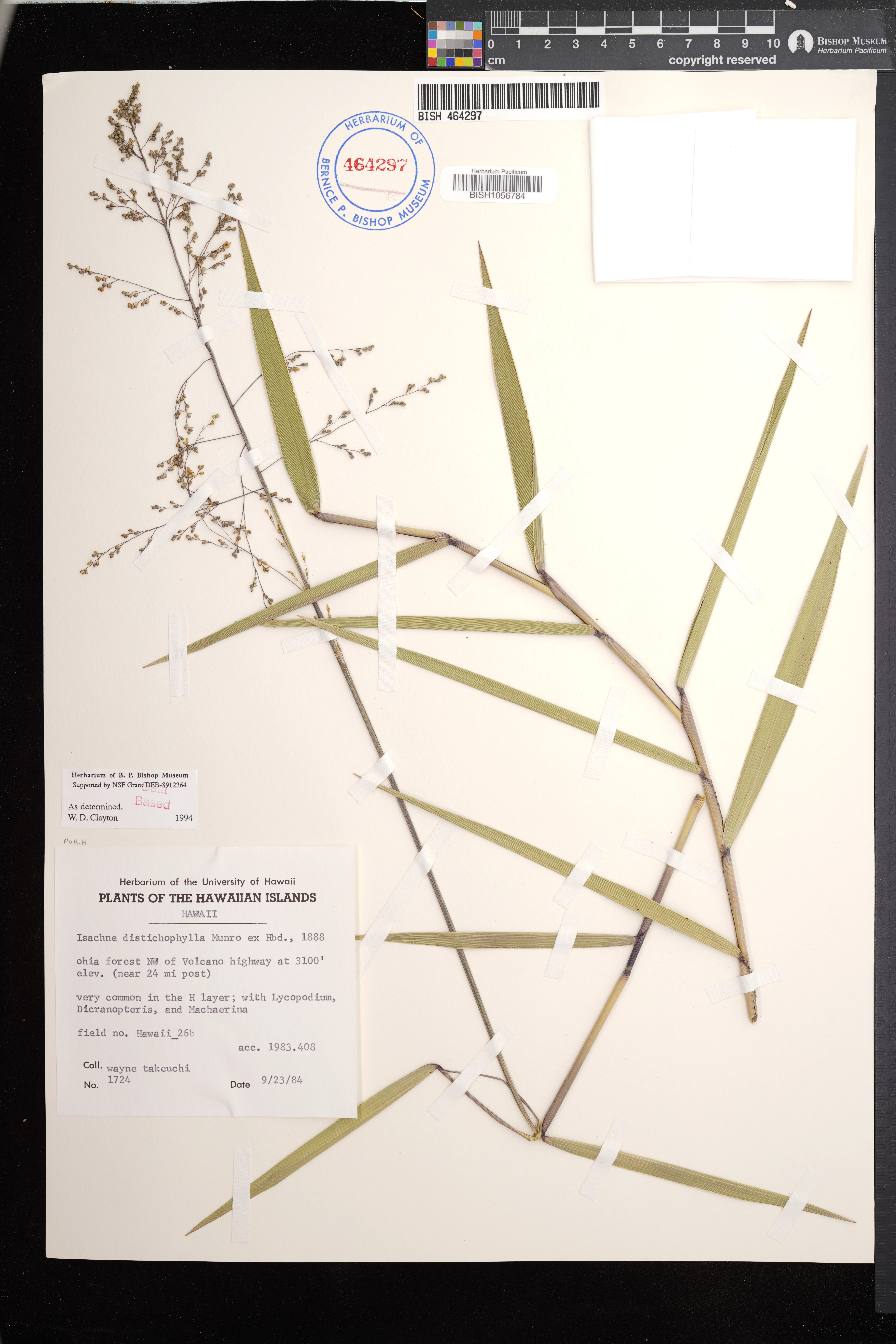 Forming small patches often w/ Oplismenus. Assoc w/Tetraplasandra-Broussaisia-Metrosideros-Dicranopteris. |