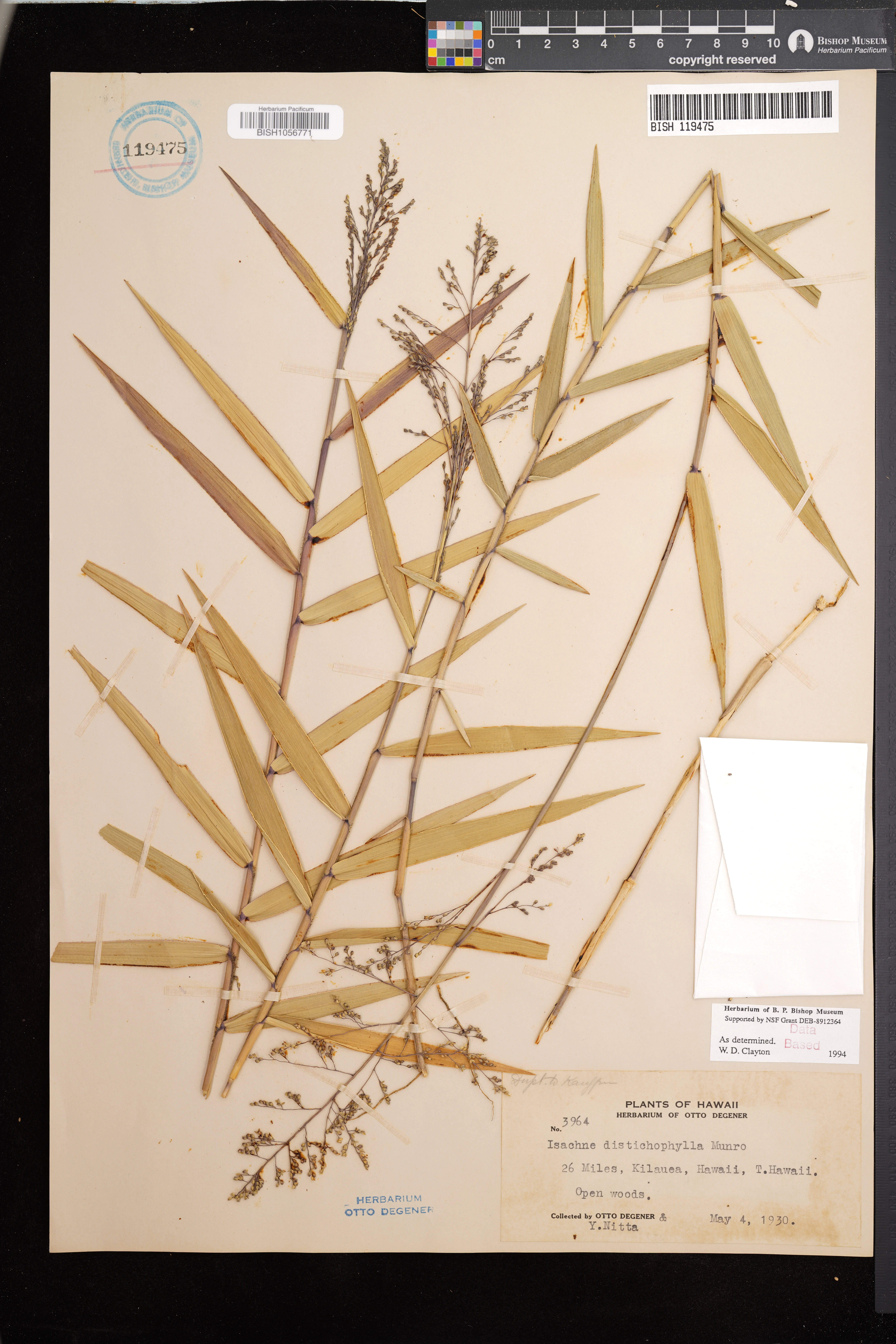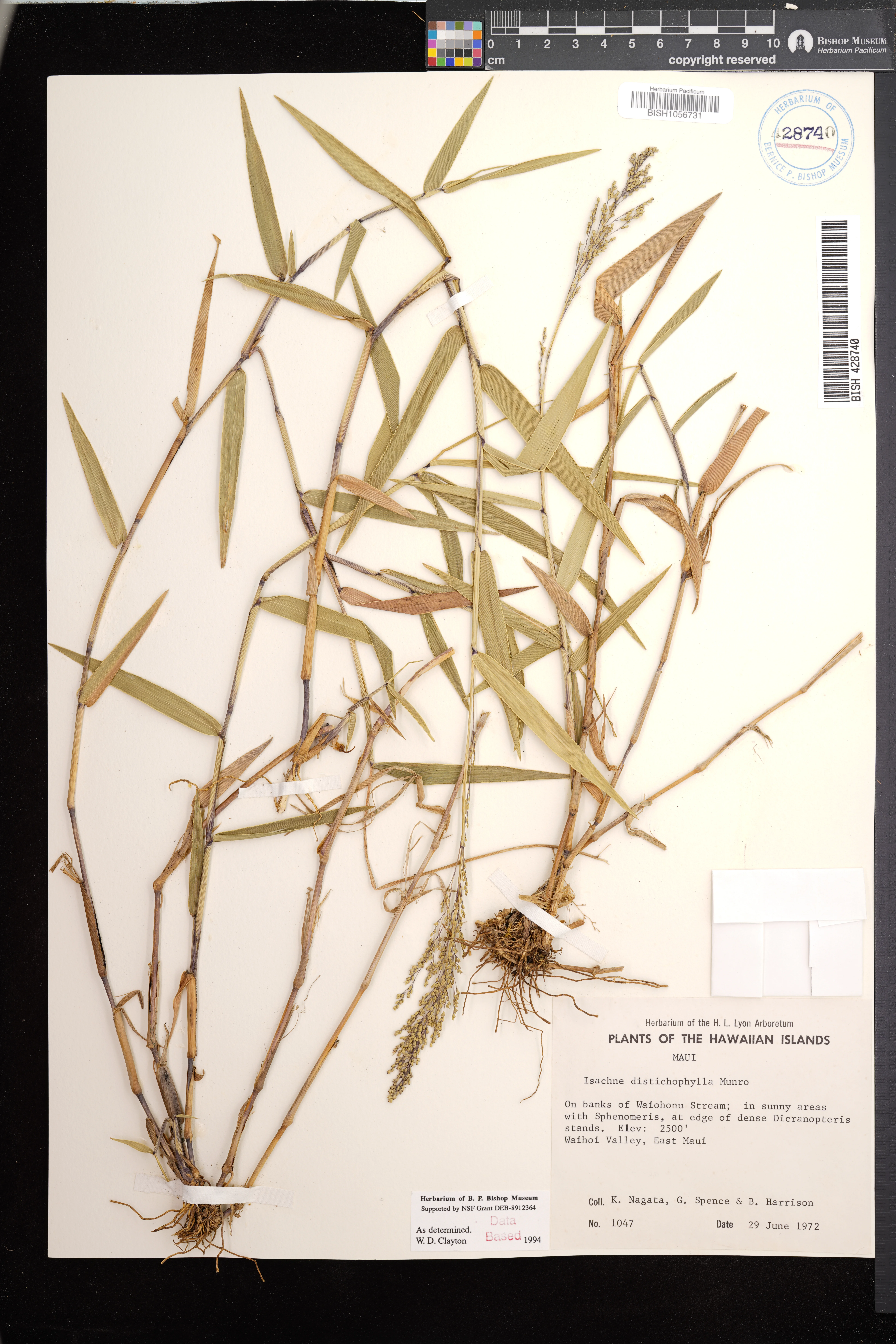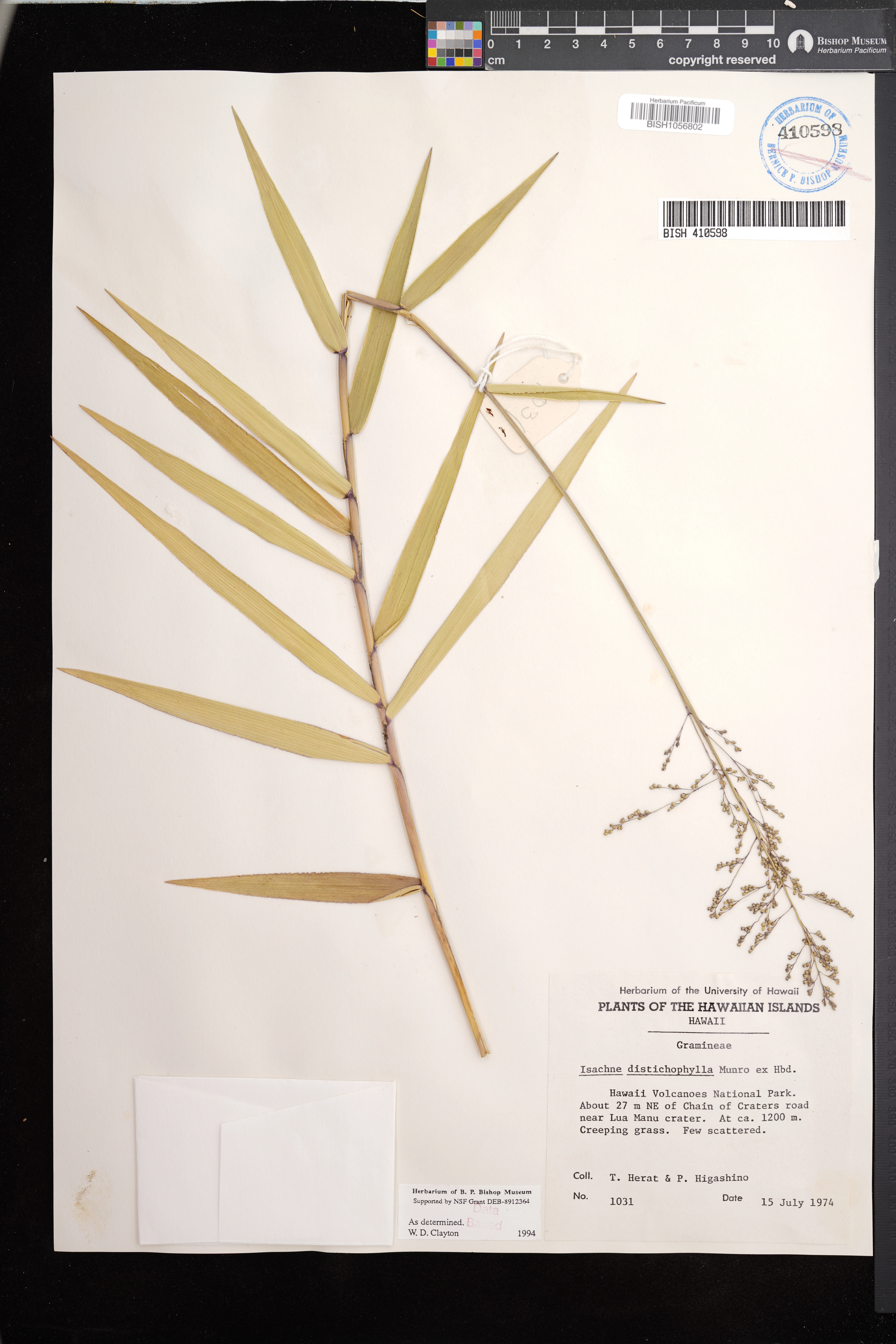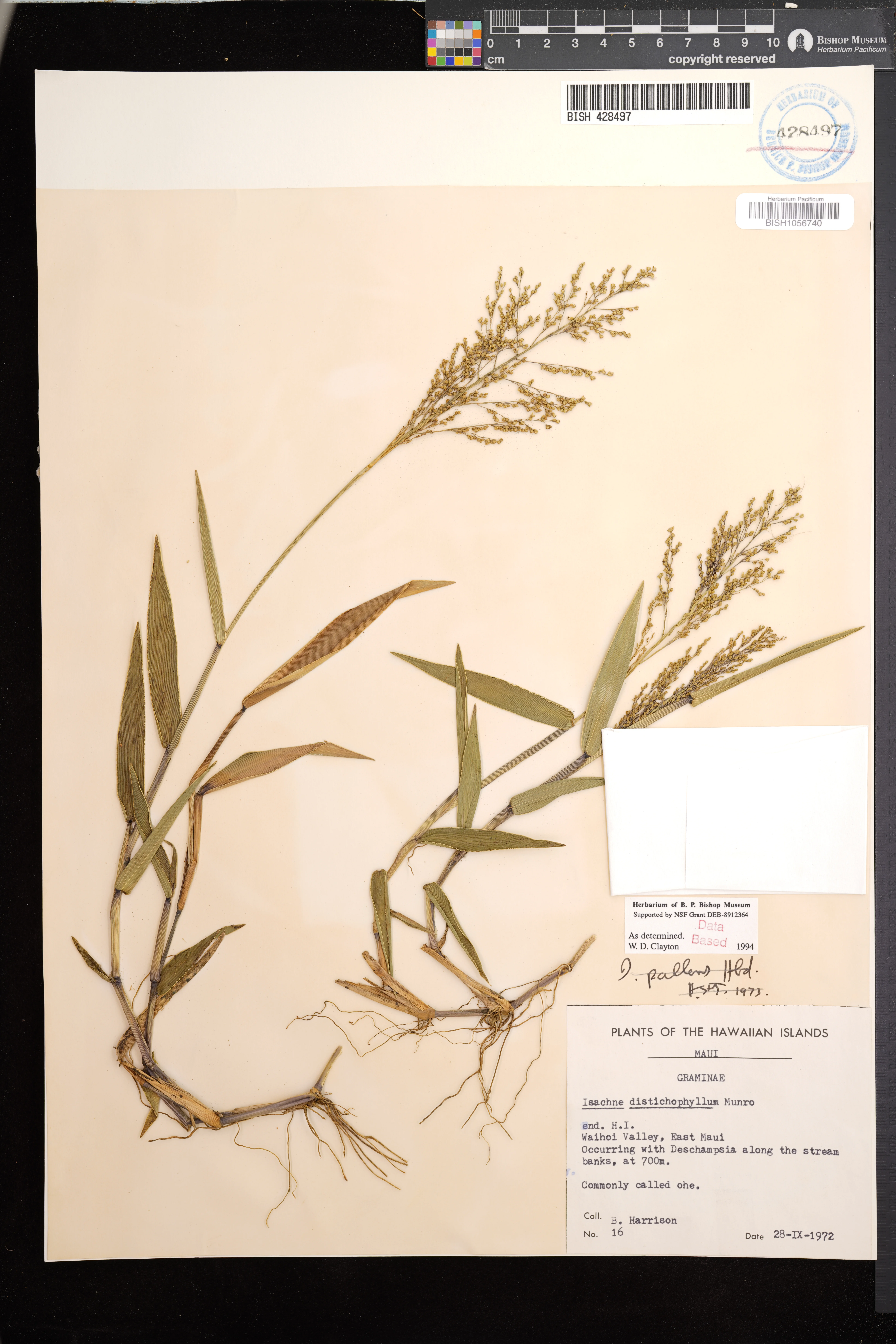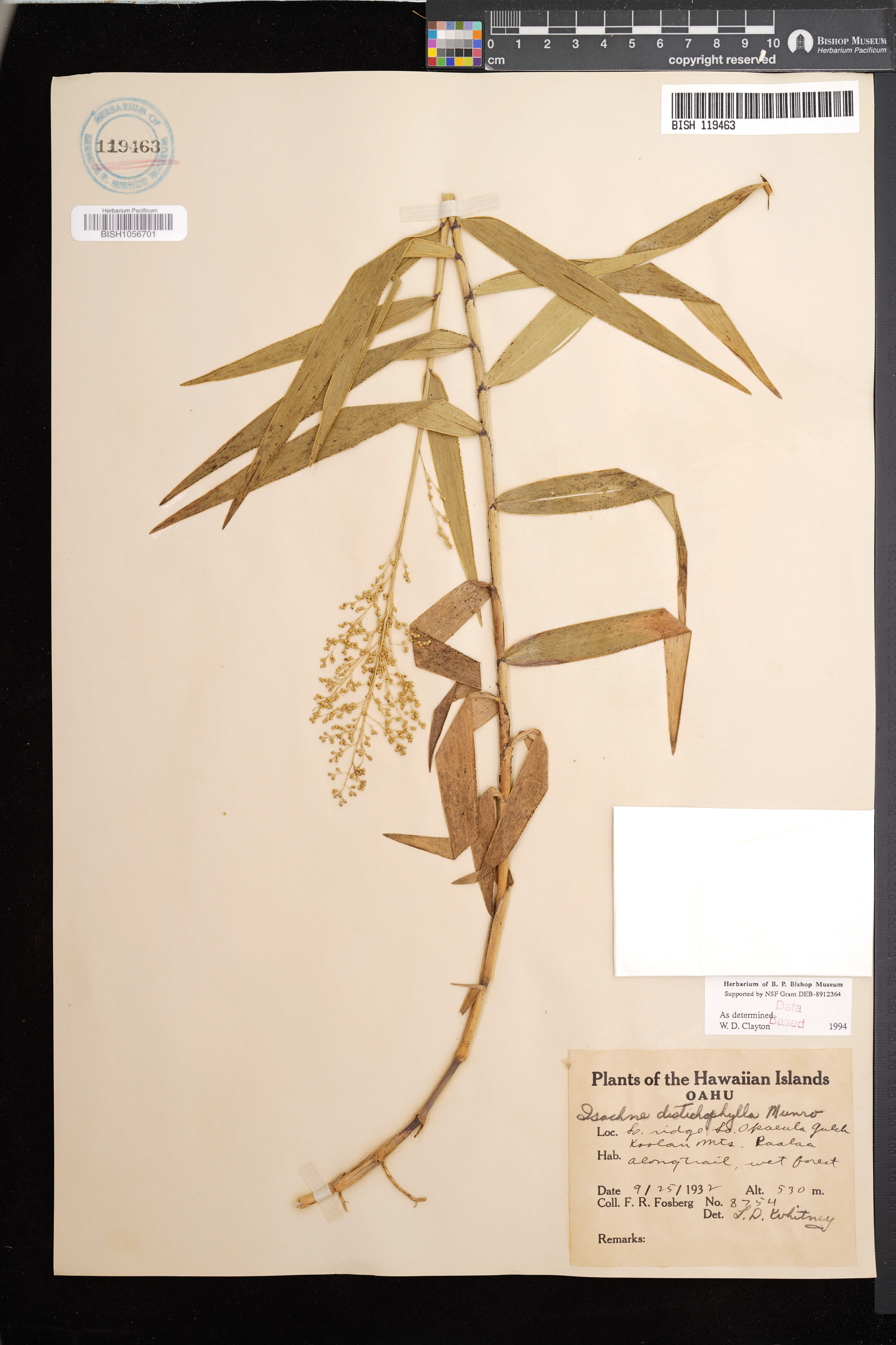 Forming small patches often w/ Oplismenus. Assoc w/Tetraplasandra-Broussaisia-Metrosideros-Dicranopteris. |