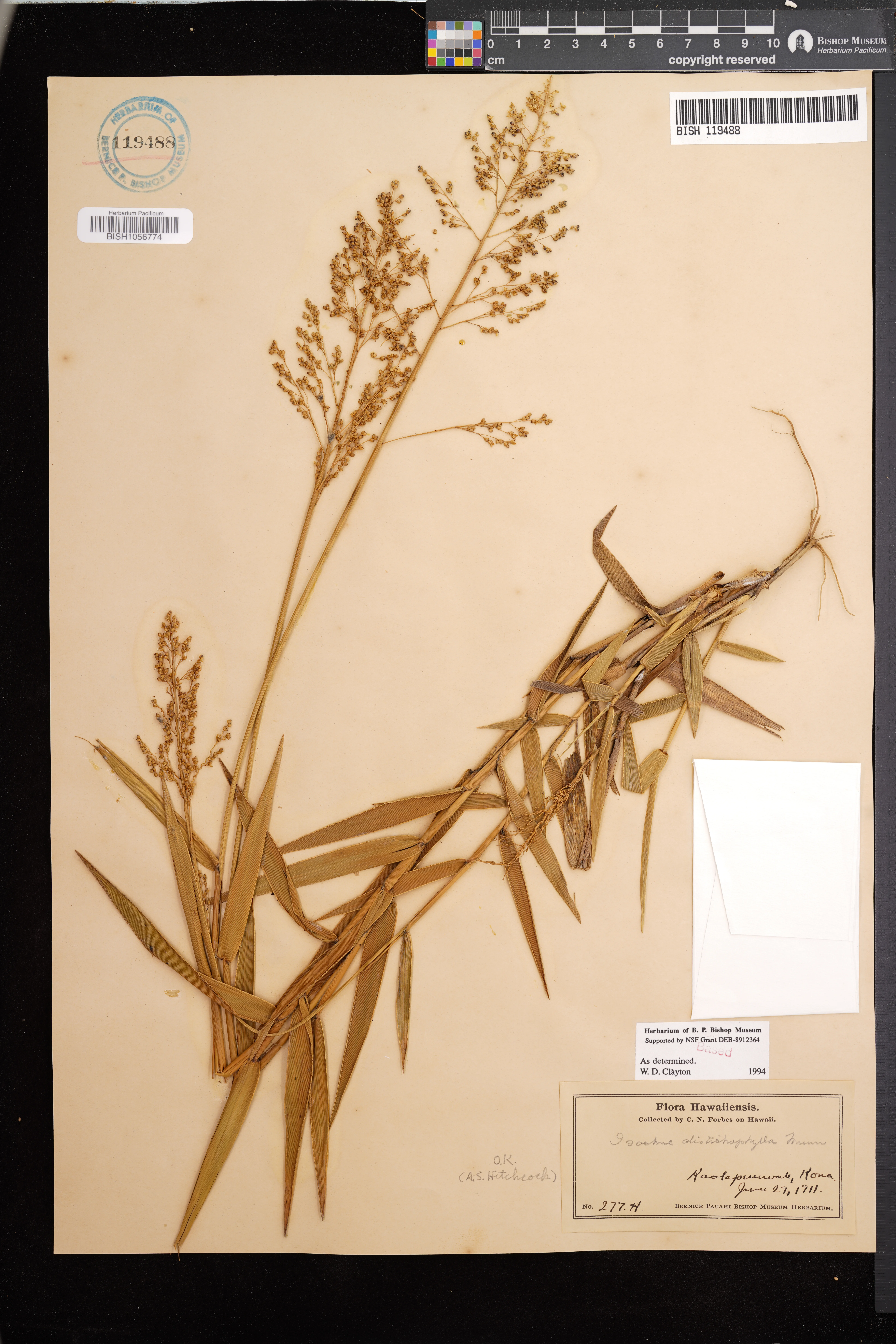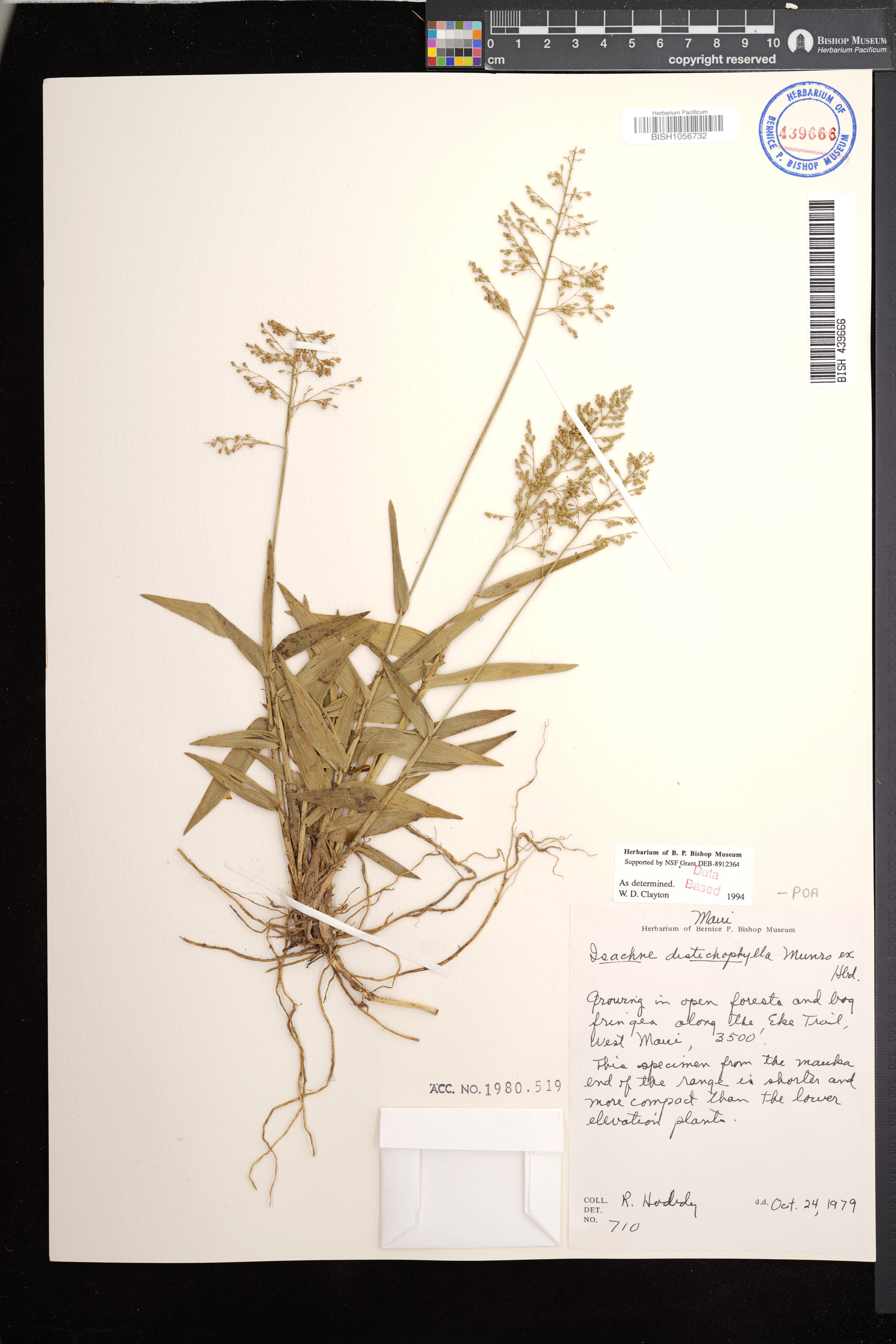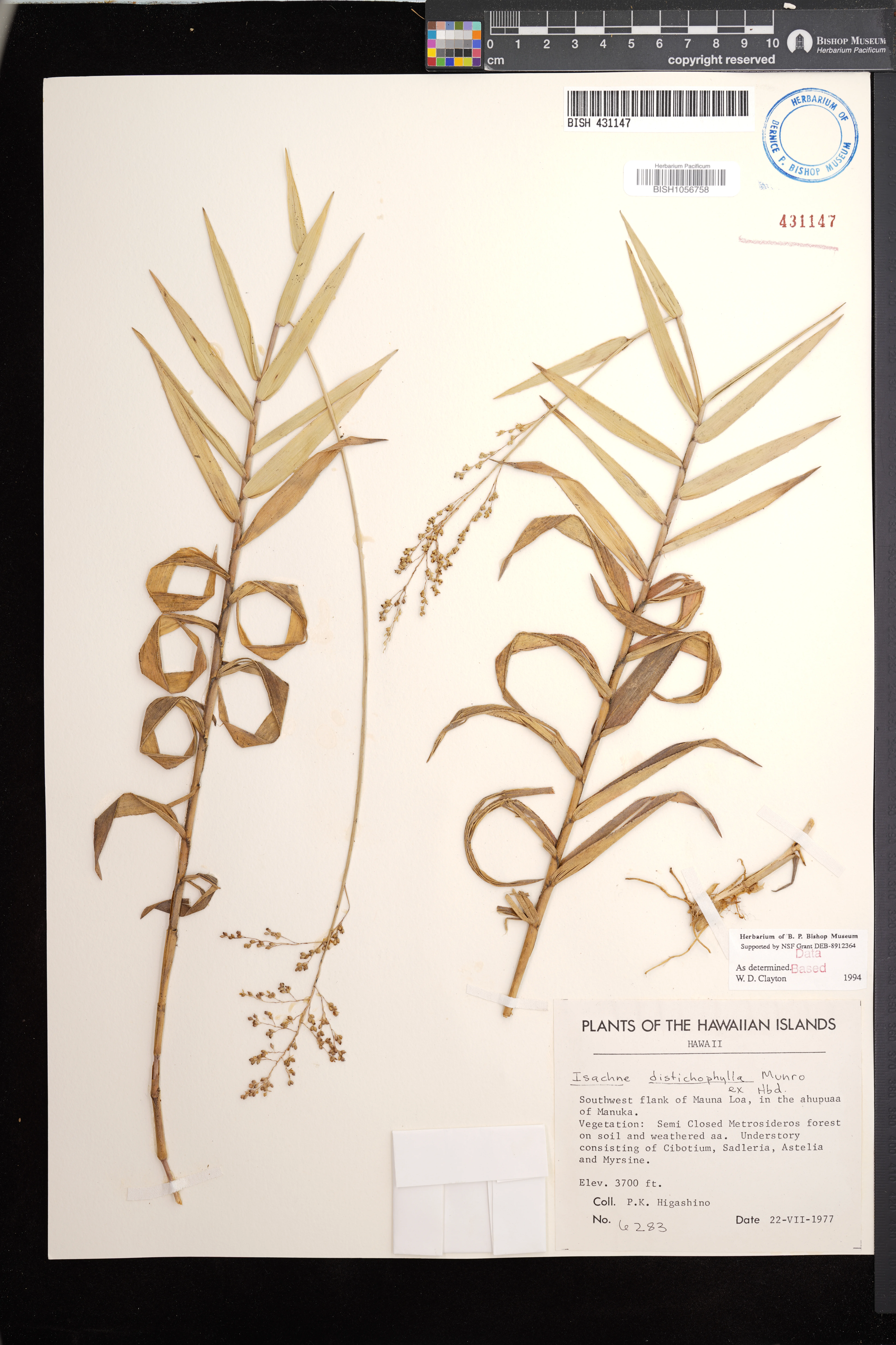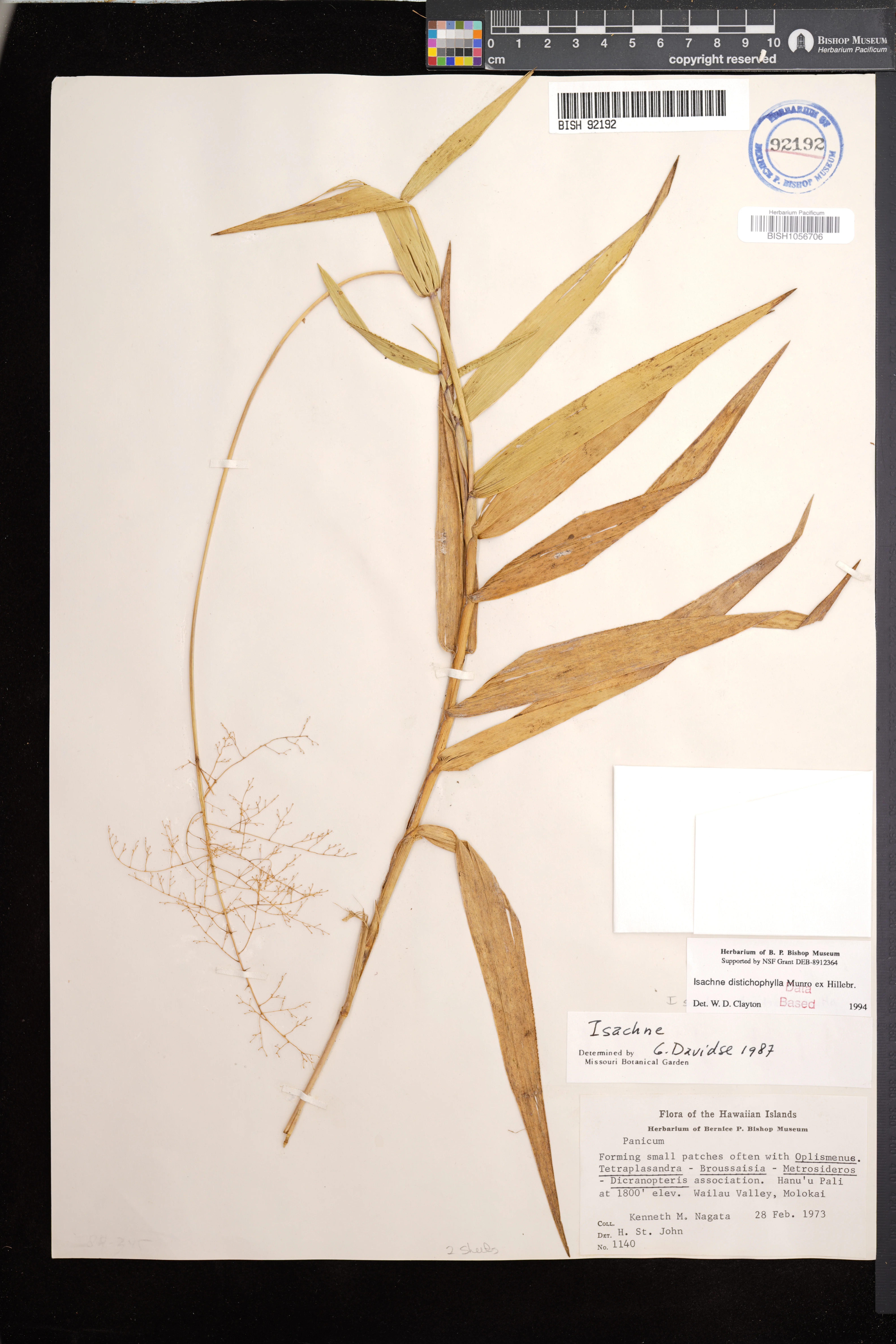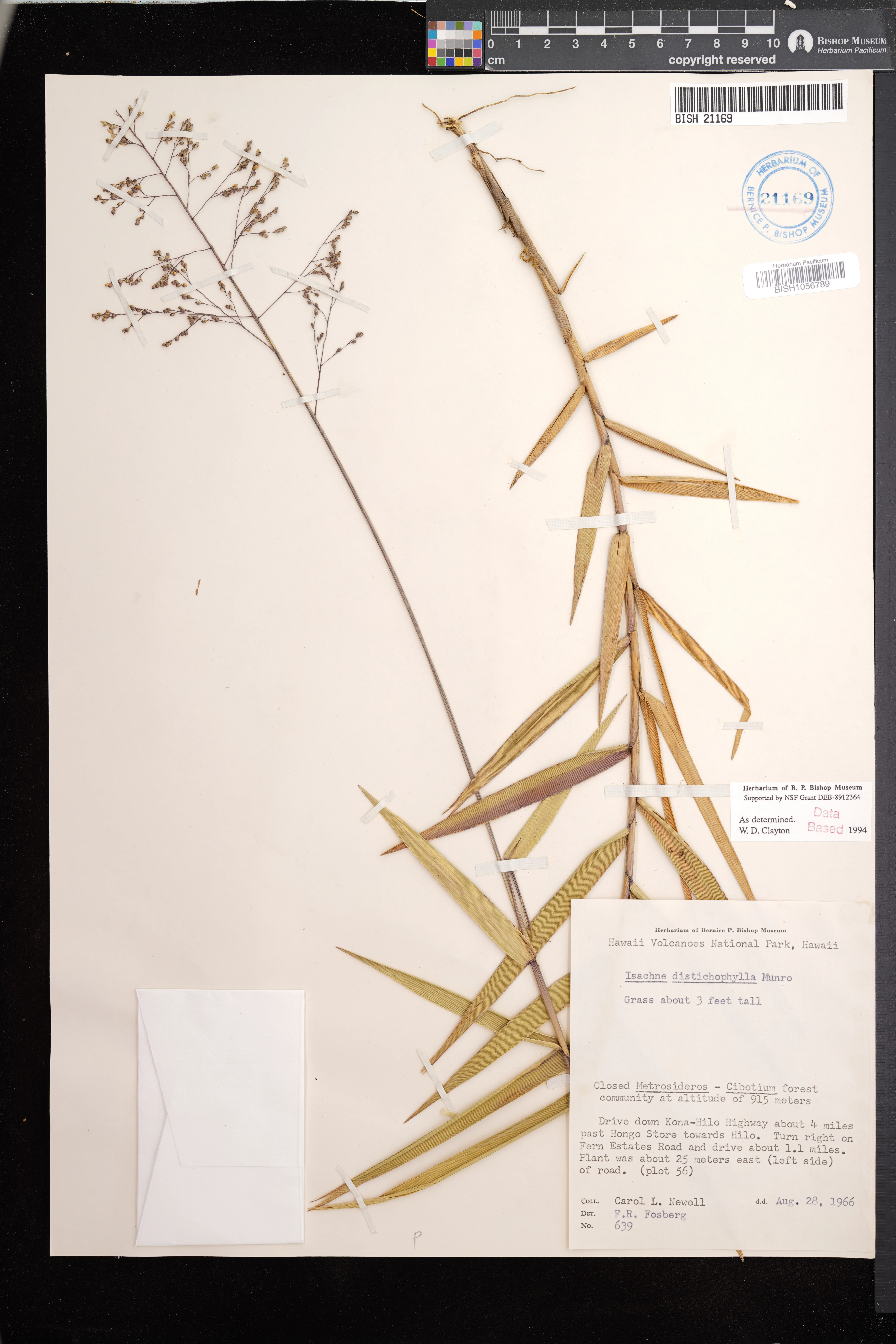 Forming small patches often w/ Oplismenus. Assoc w/Tetraplasandra-Broussaisia-Metrosideros-Dicranopteris. |