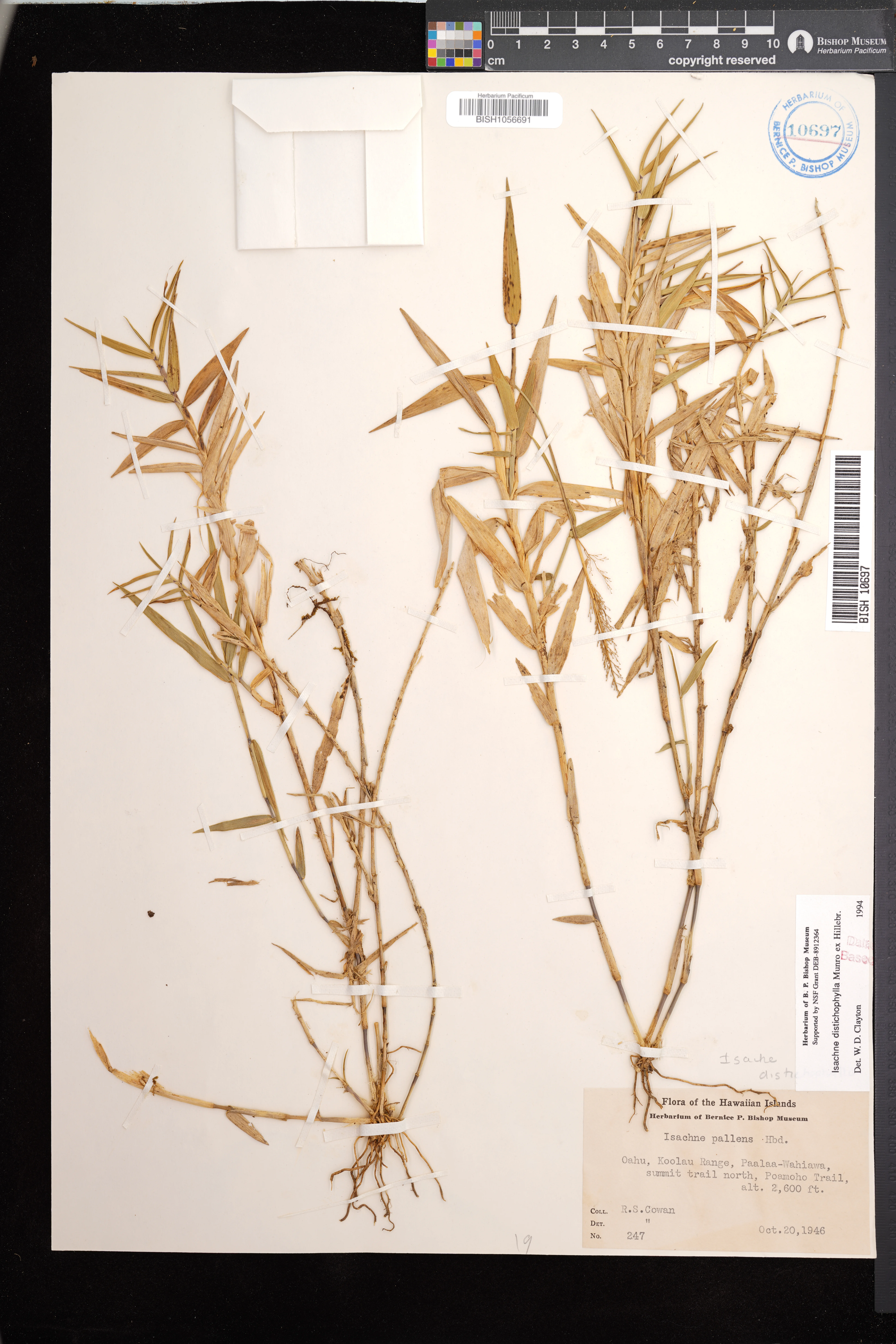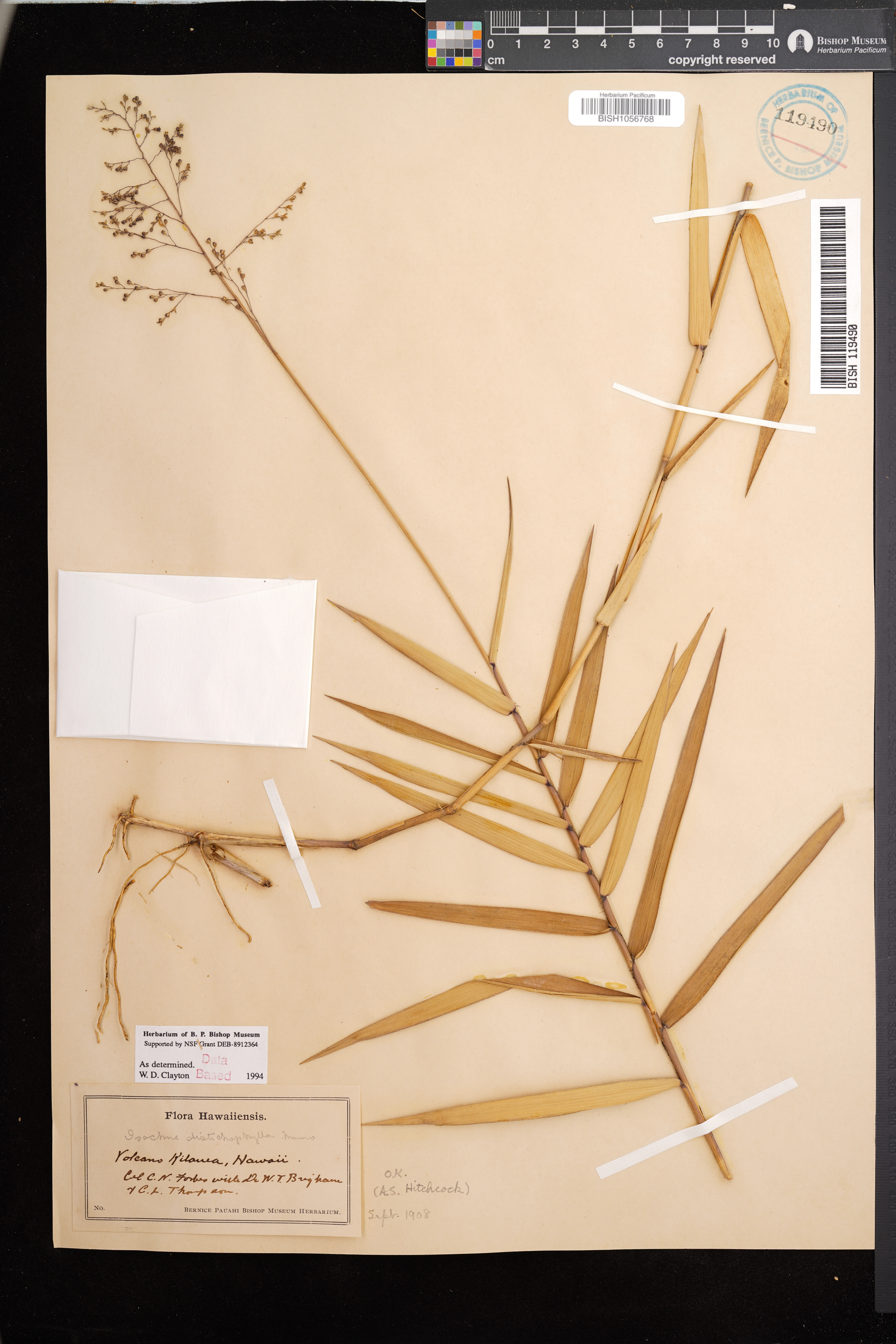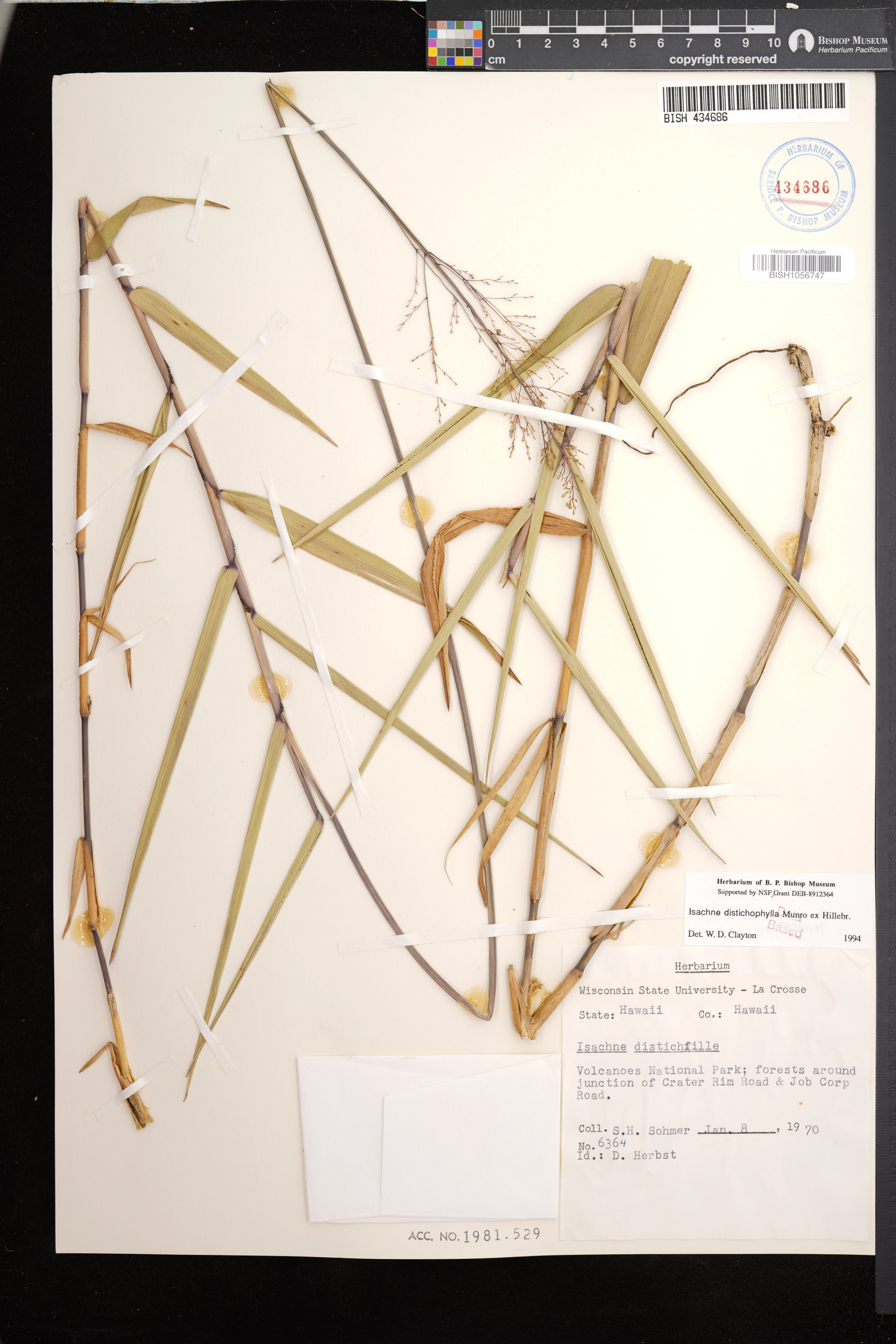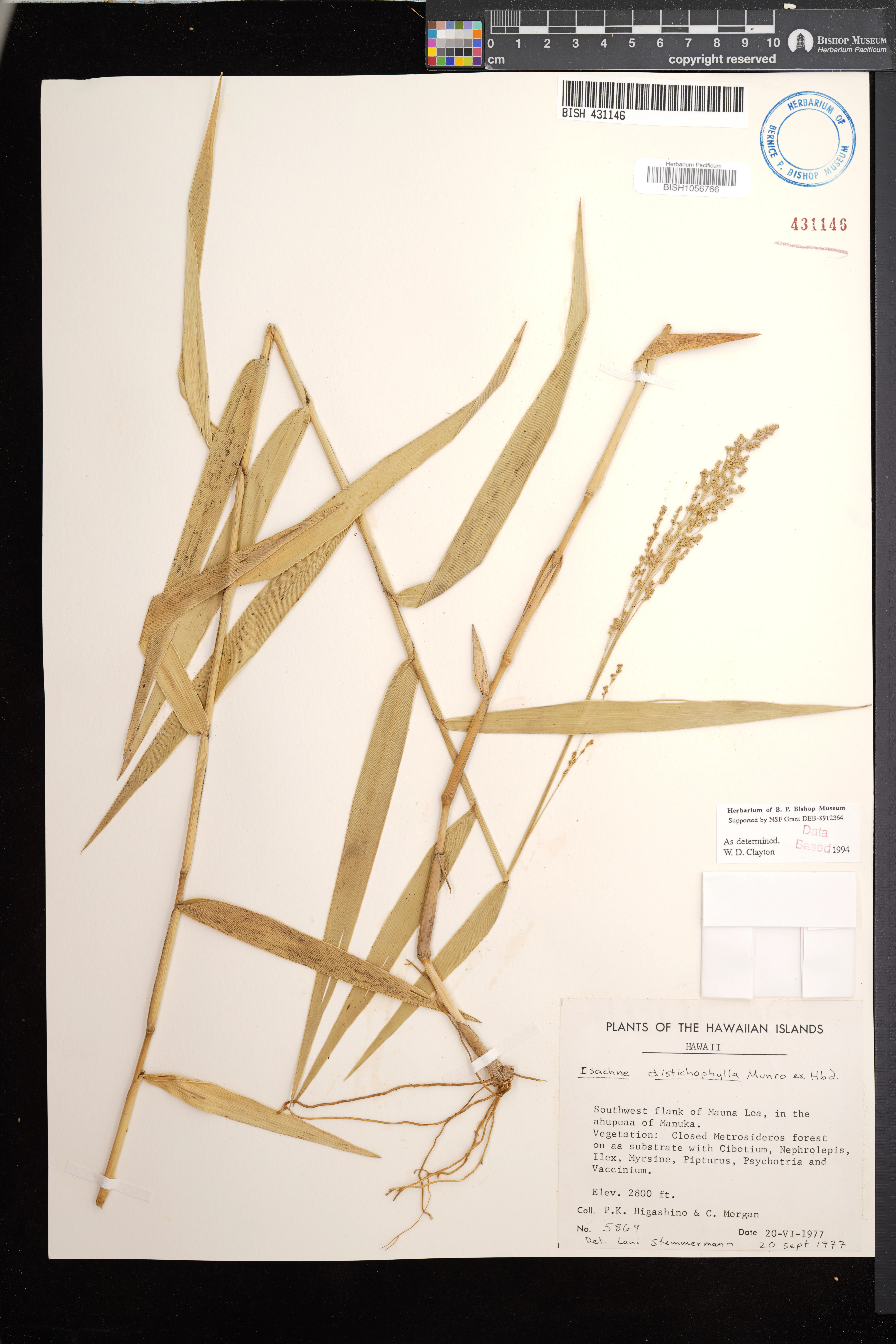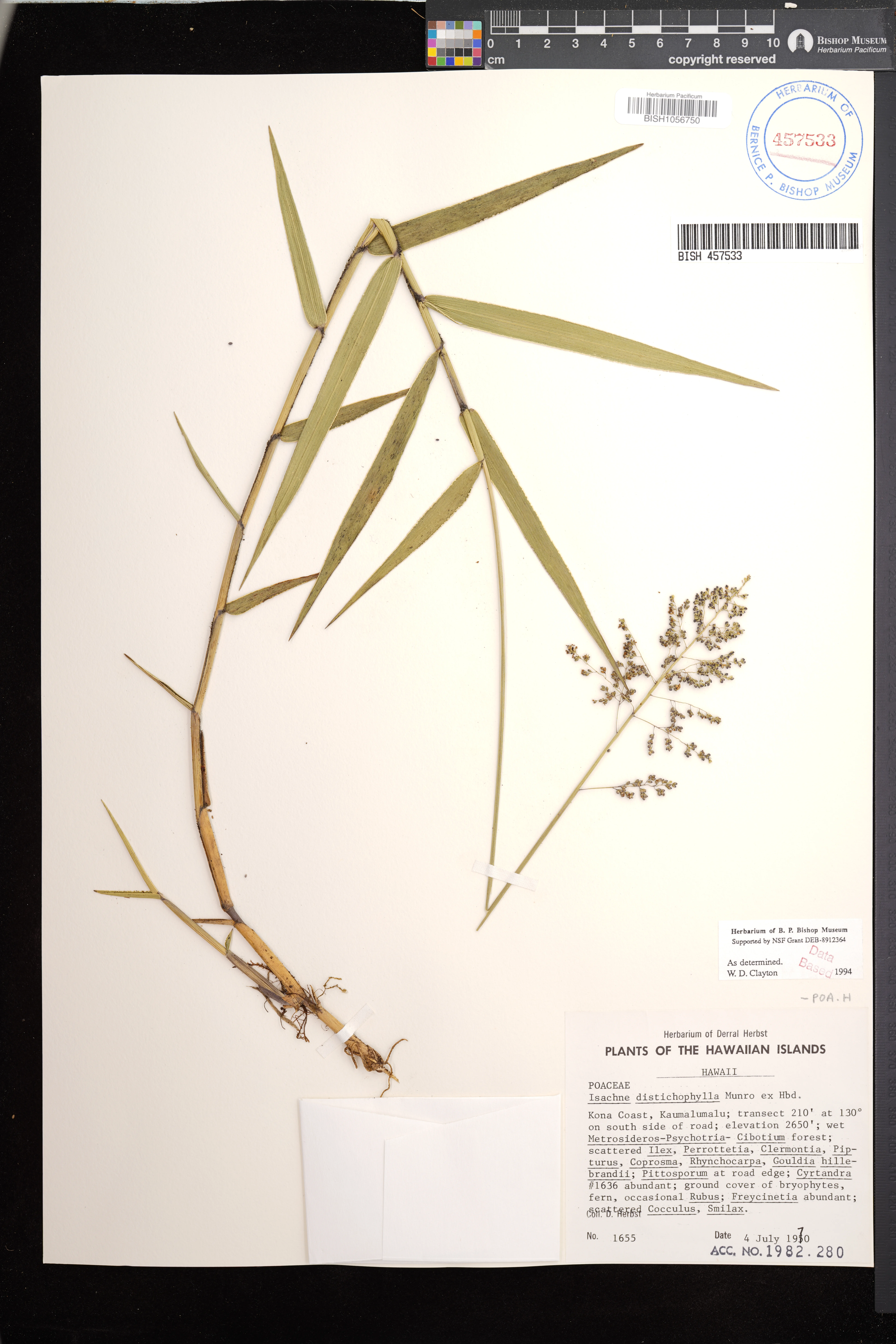 Forming small patches often w/ Oplismenus. Assoc w/Tetraplasandra-Broussaisia-Metrosideros-Dicranopteris. |