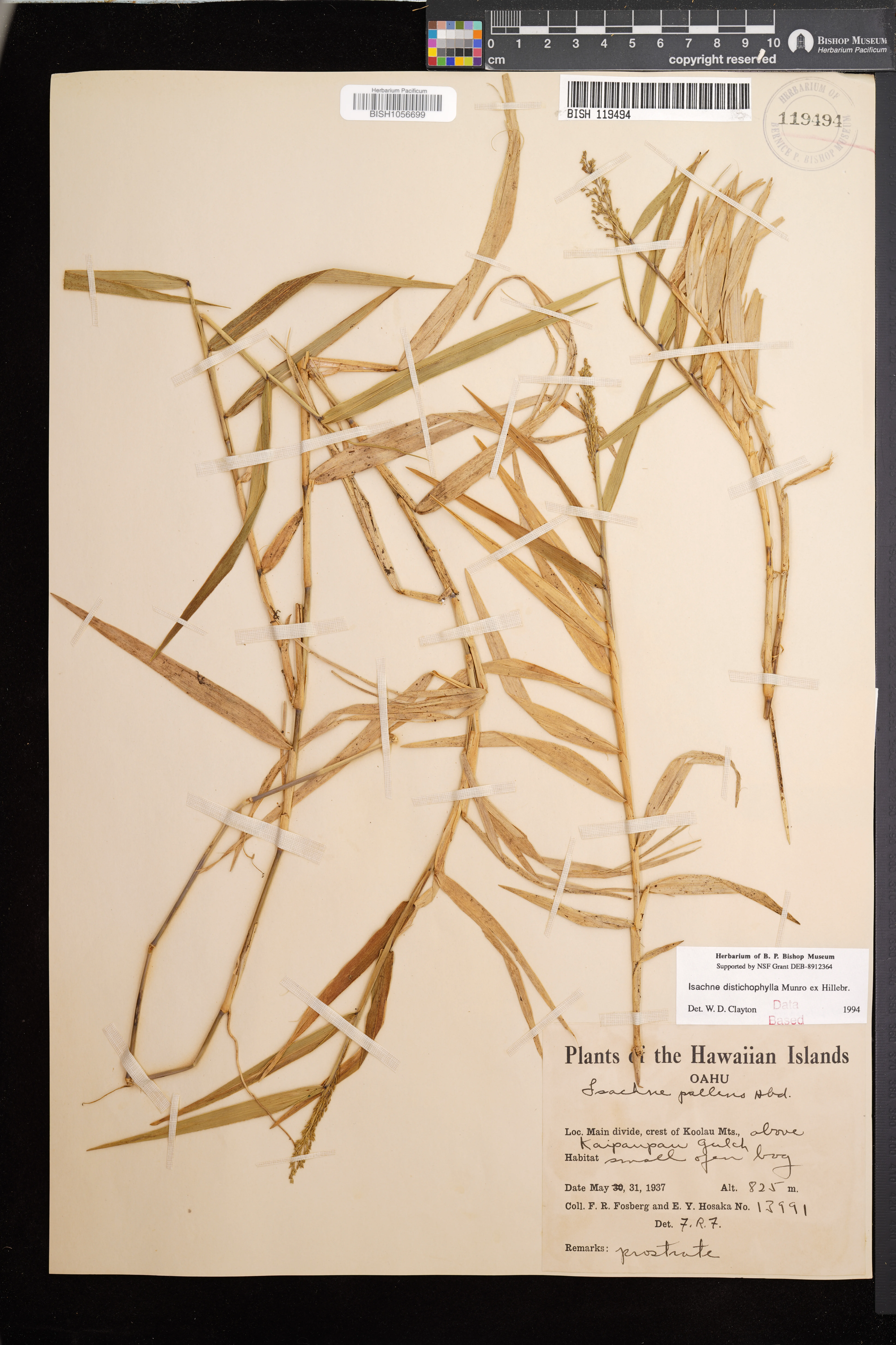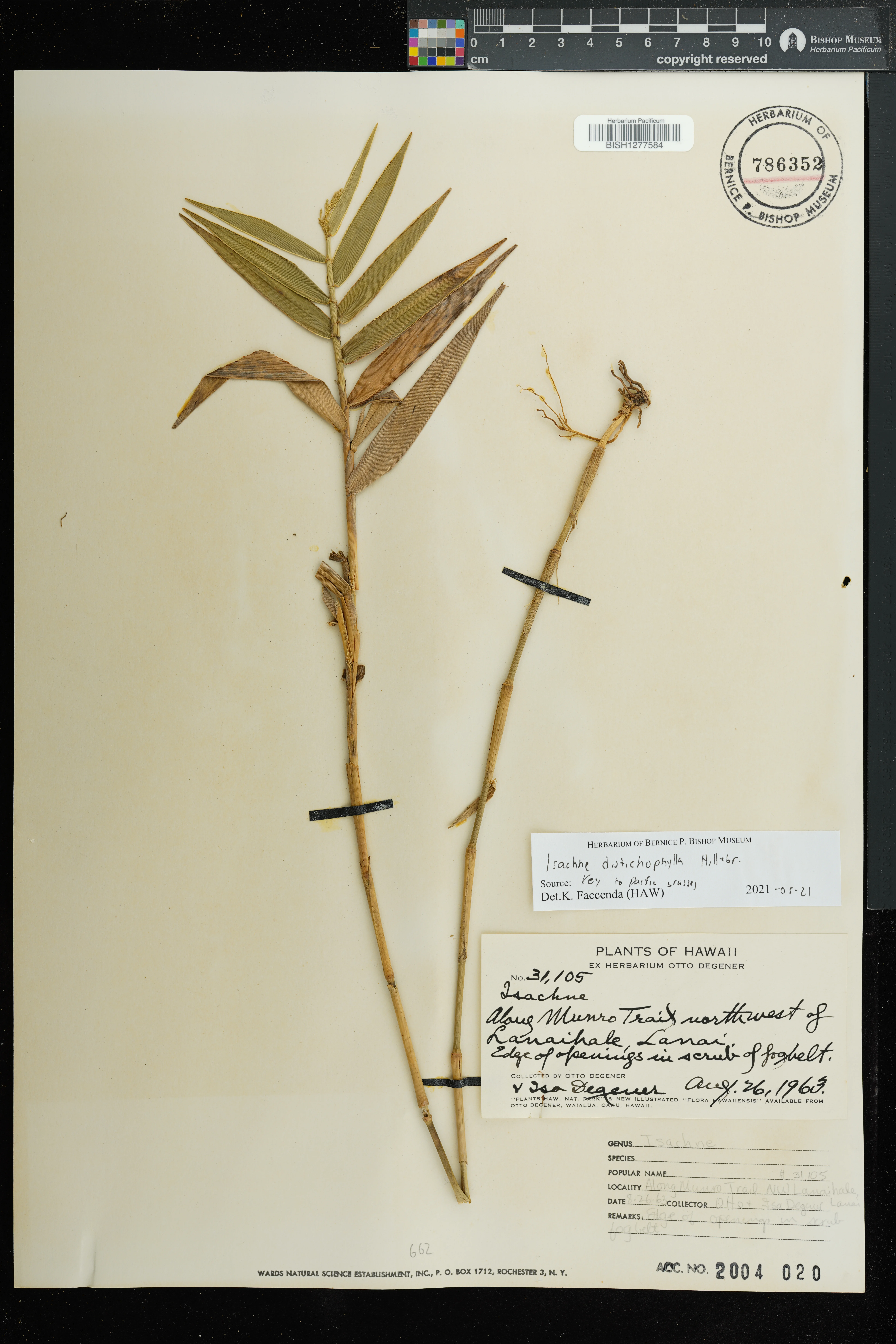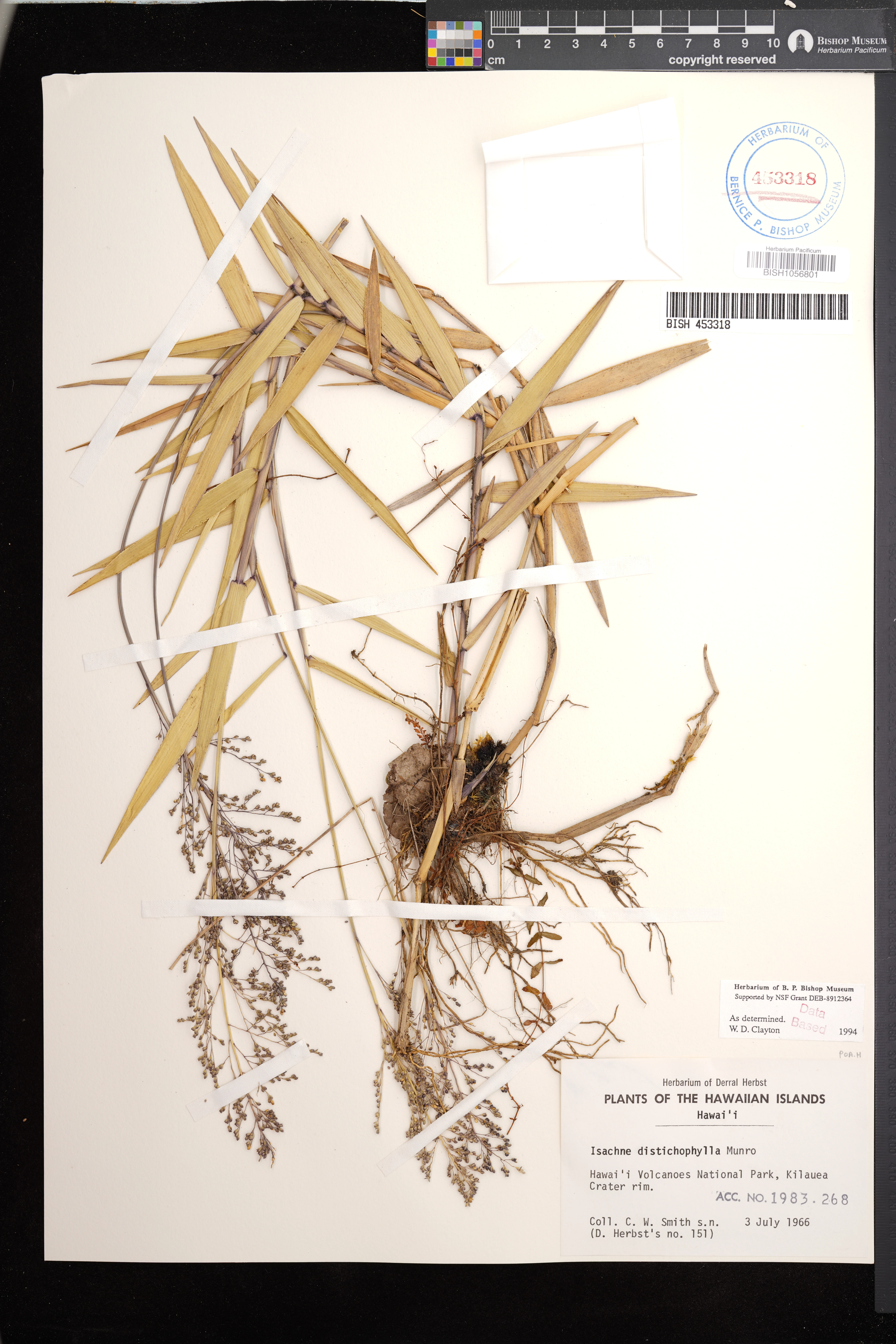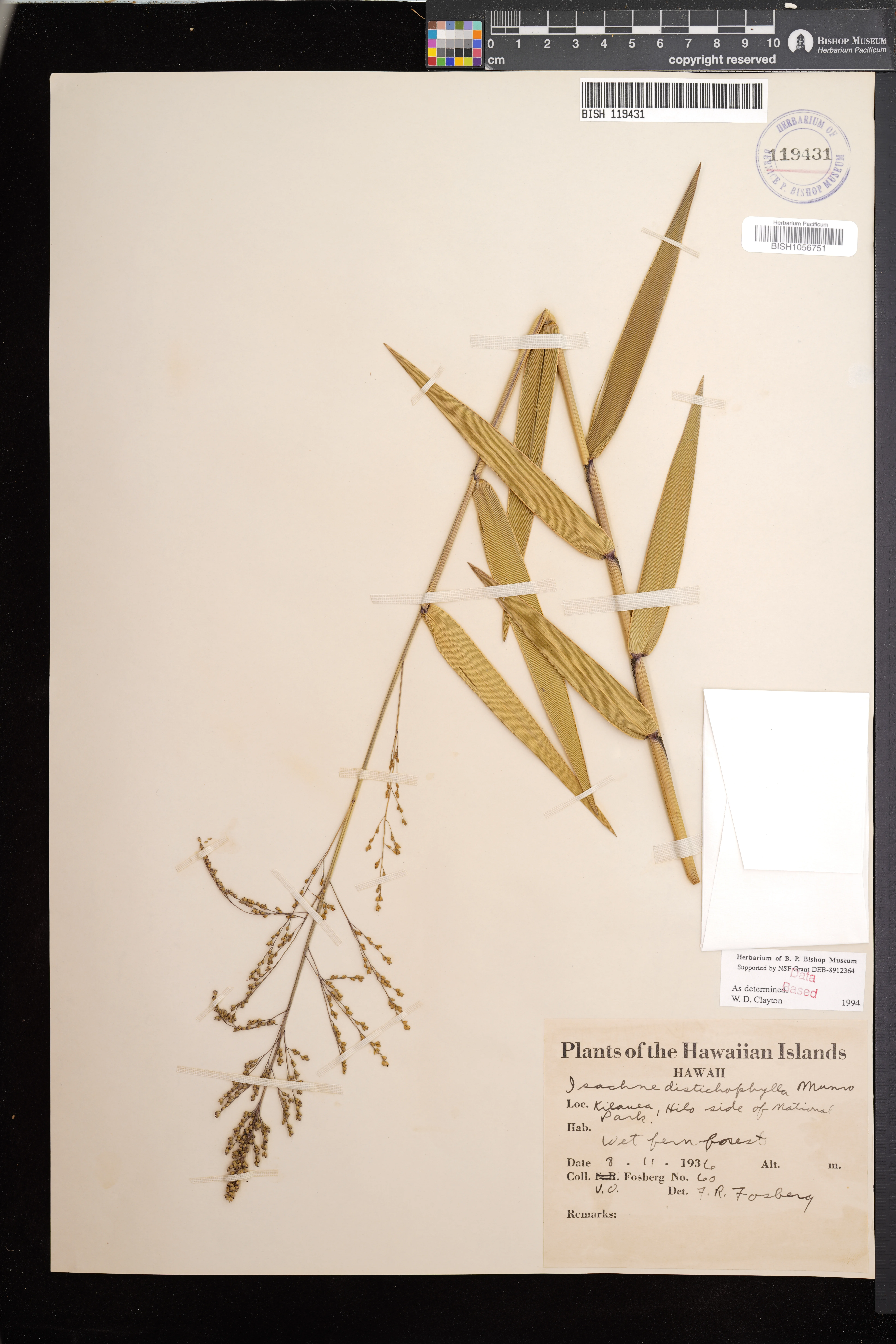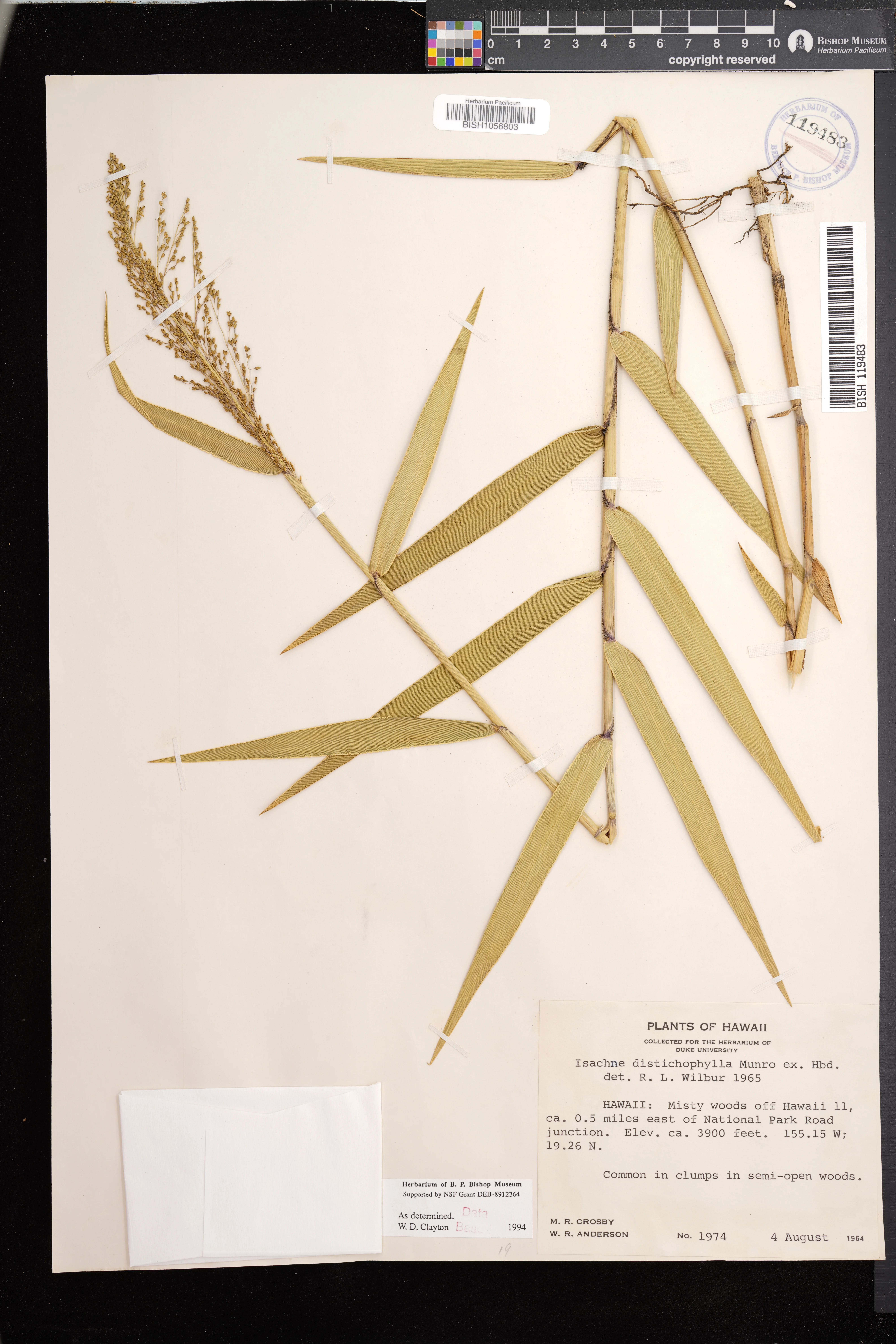 Forming small patches often w/ Oplismenus. Assoc w/Tetraplasandra-Broussaisia-Metrosideros-Dicranopteris. |