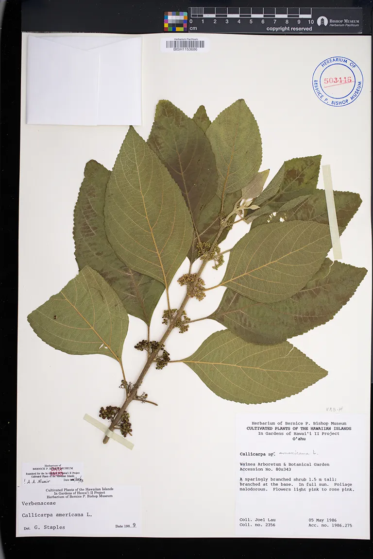 | 5 | Callicarpa americana | L. | waimea arboretum & botanical garden | full sun | PRESERVED_SPECIMEN | lau, j. | collector number: 2356 | Oahu | BISH | 5/5/1986 |