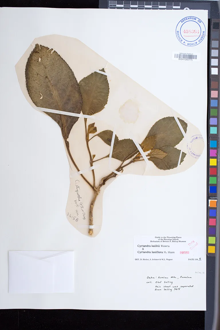 | 4 | Cyrtandra × chartacea | Koolau Mts., Punaluu | Preserved_Specimen | Selling, O. | Oahu | BISH | ||||
