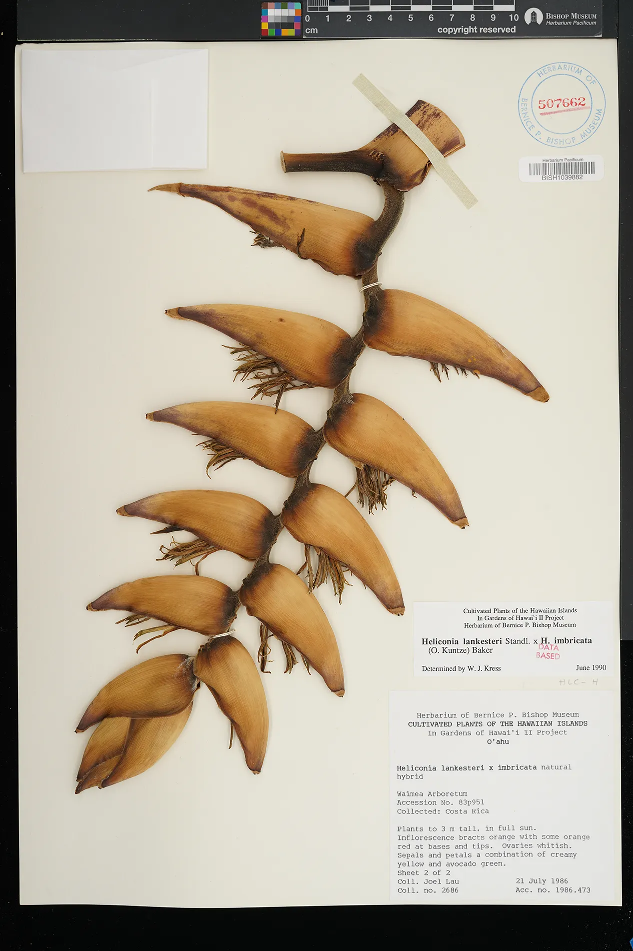 | 2 | Heliconia lankesteri × Heliconia imbricata | Waimea Arboretum | In full sun. | Preserved_Specimen | Plants to 3 m tall; infl. bracts orange w/some orange-red at bases & tips; ovaries whitish; sepals & petals a combination of creamy yellow & avocado green. | Lau, J. | 2686 | Oahu | BISH | 1986-07-21 |