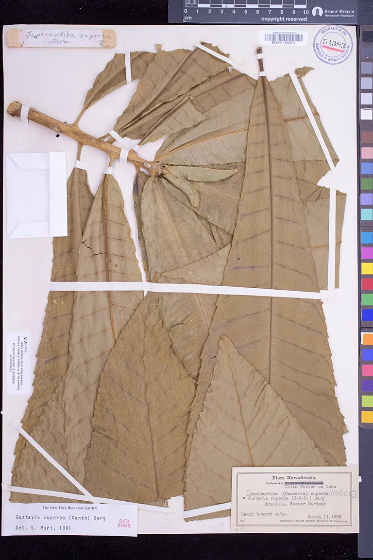 | 1 | Gustavia superba | (Kunth) O.Berg | Honolulu; Foster Gardens | PRESERVED_SPECIMEN | Potter, C. | s.n. | Oahu | BISH | 3/11/1958 | |