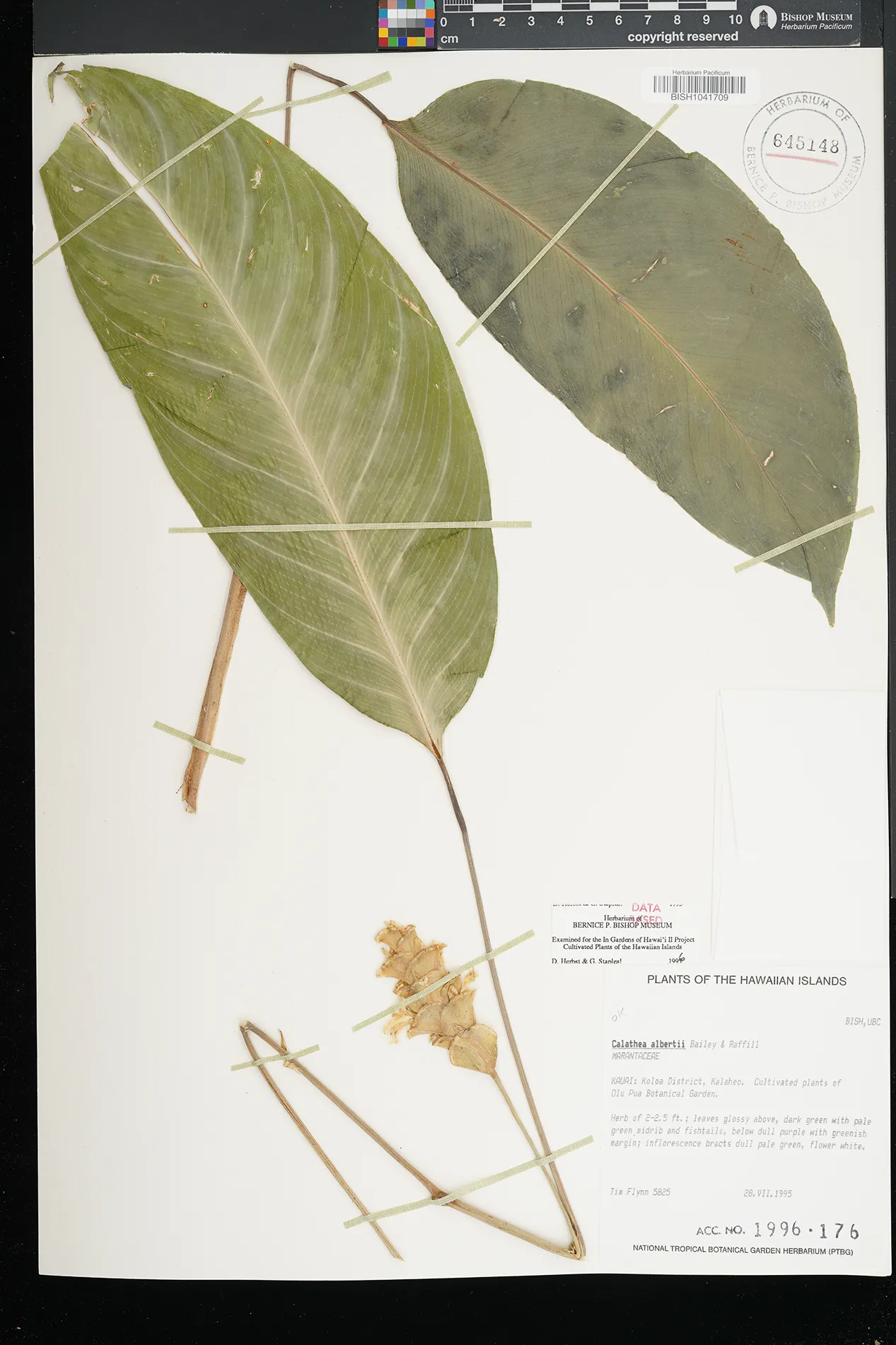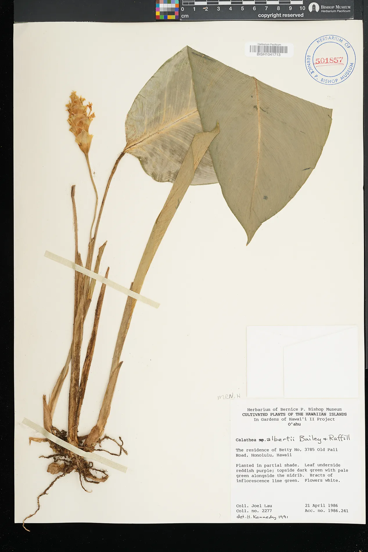 | 12 | Goeppertia albertii | (L.H.Bailey & Raffill) Borchs. & S.Suárez | PRESERVED_SPECIMEN | Lau, J. | 2277 | Hawaii | BISH | 4/21/1986 | ||