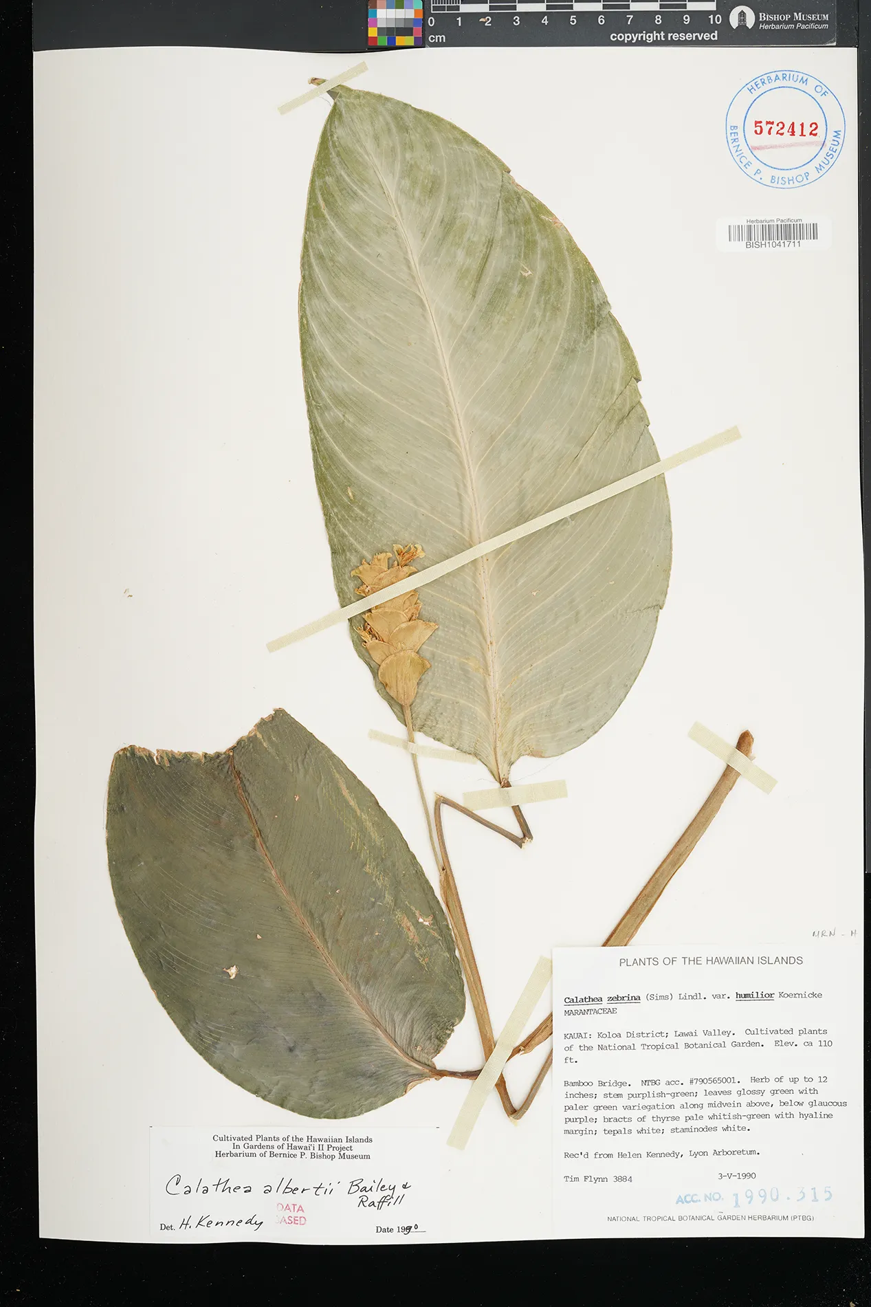 | 13 | Goeppertia albertii | (L.H.Bailey & Raffill) Borchs. & S.Suárez | koloa dist.; lawai valley, ntbg, bamboo bridge | PRESERVED_SPECIMEN | flynn, t. | collector number: 3884 | Kauai | BISH | 5/3/1990 |