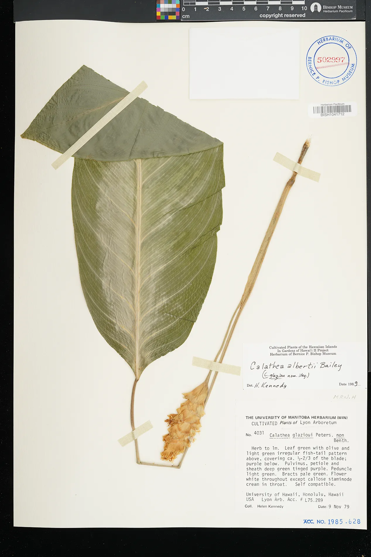| 8 | Goeppertia albertii | (L.H.Bailey & Raffill) Borchs. & S.Suárez | Lyon Arboretum | PRESERVED_SPECIMEN | Kennedy, H. | 4031 | Oahu | BISH | 11/9/1979 | |