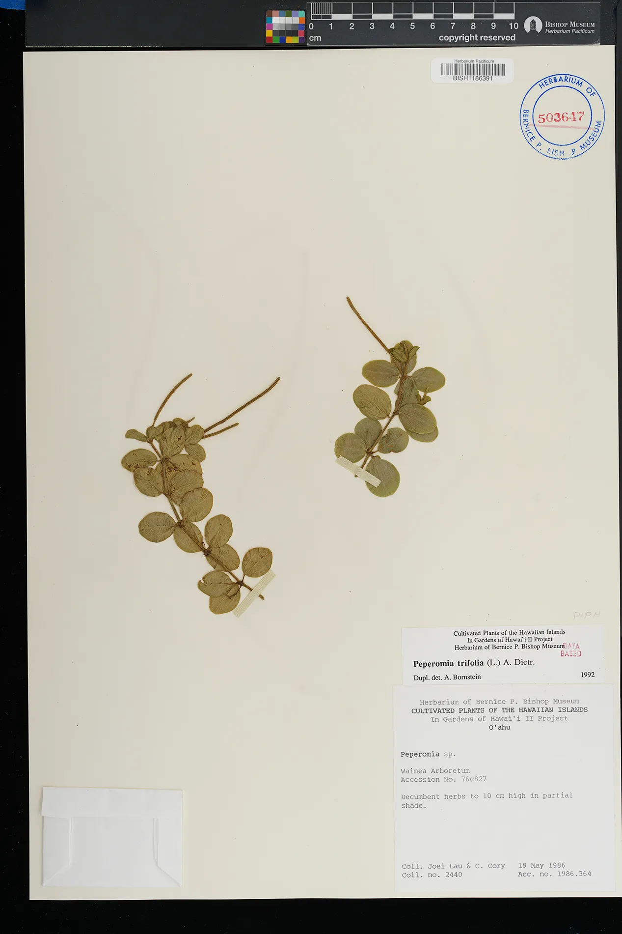 | 1 | Peperomia trifolia | Waimea Arboretum | In partial shade. | Preserved_Specimen | Decumbent herbs to 10cm ht. | Lau, J. | 2440 | Oahu | BISH | 1986-05-19 |
