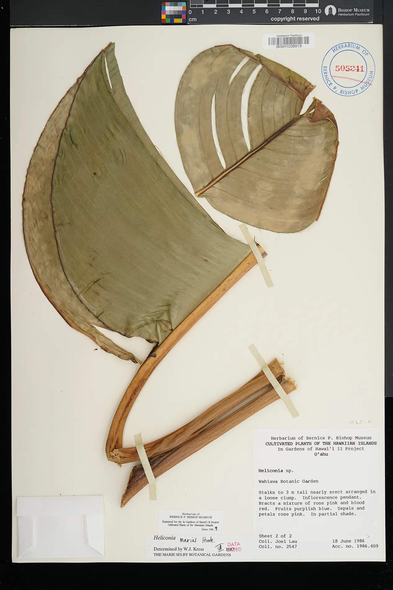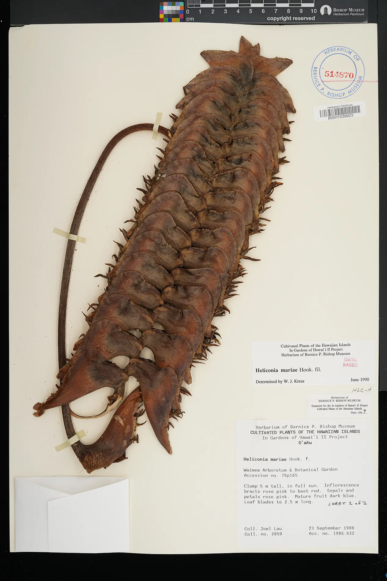 | 2 | Heliconia mariae | Waimea Arboretum | In full sun. | Preserved_Specimen | Clump 5 m ht; inflor bracts rose pink to beet red; sepals & petals rose pink; mature fruit dark blue; leaf blades to 2.5 m long. | Lau, J. | 2859 | Oahu | BISH | 1986-09-23 |
