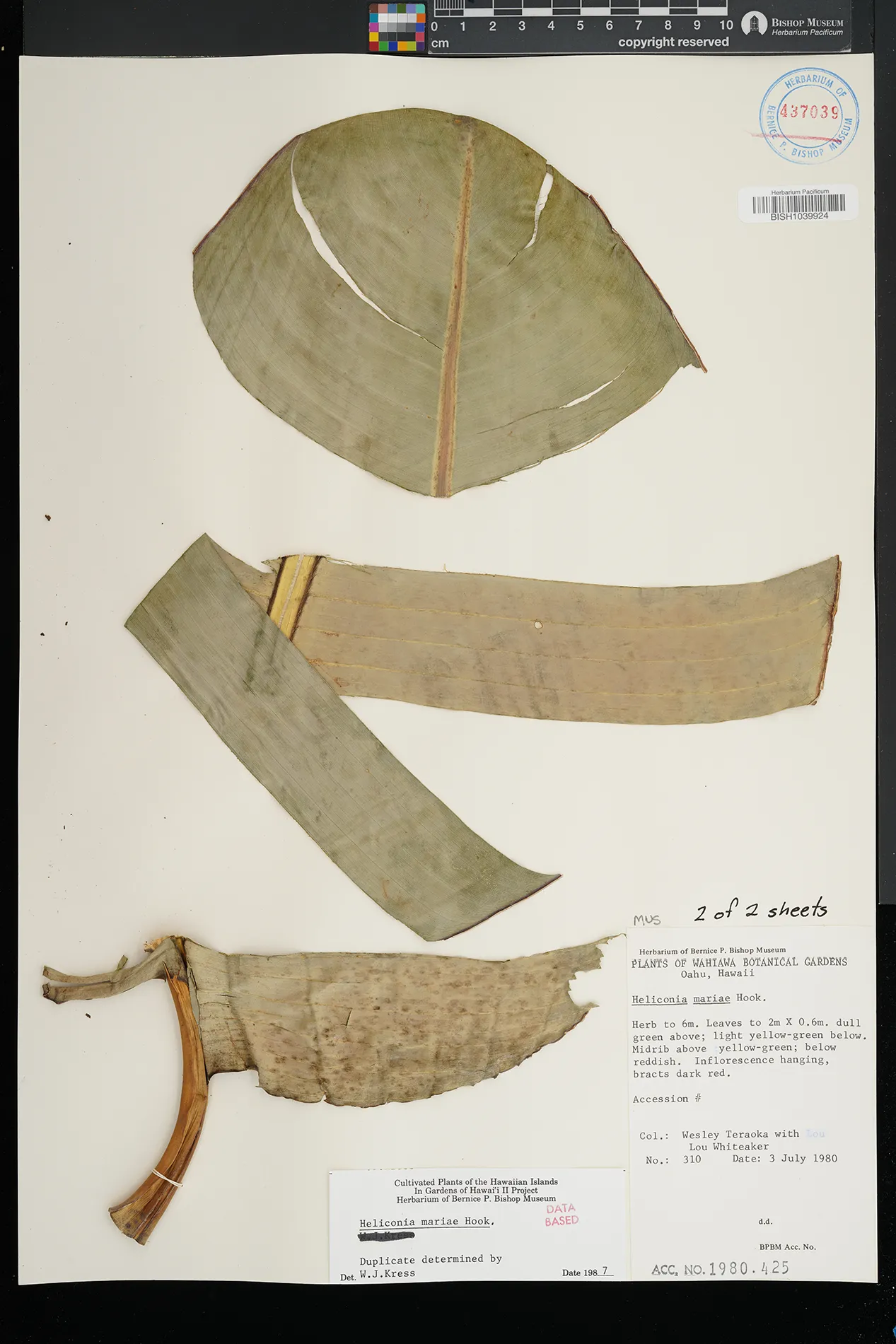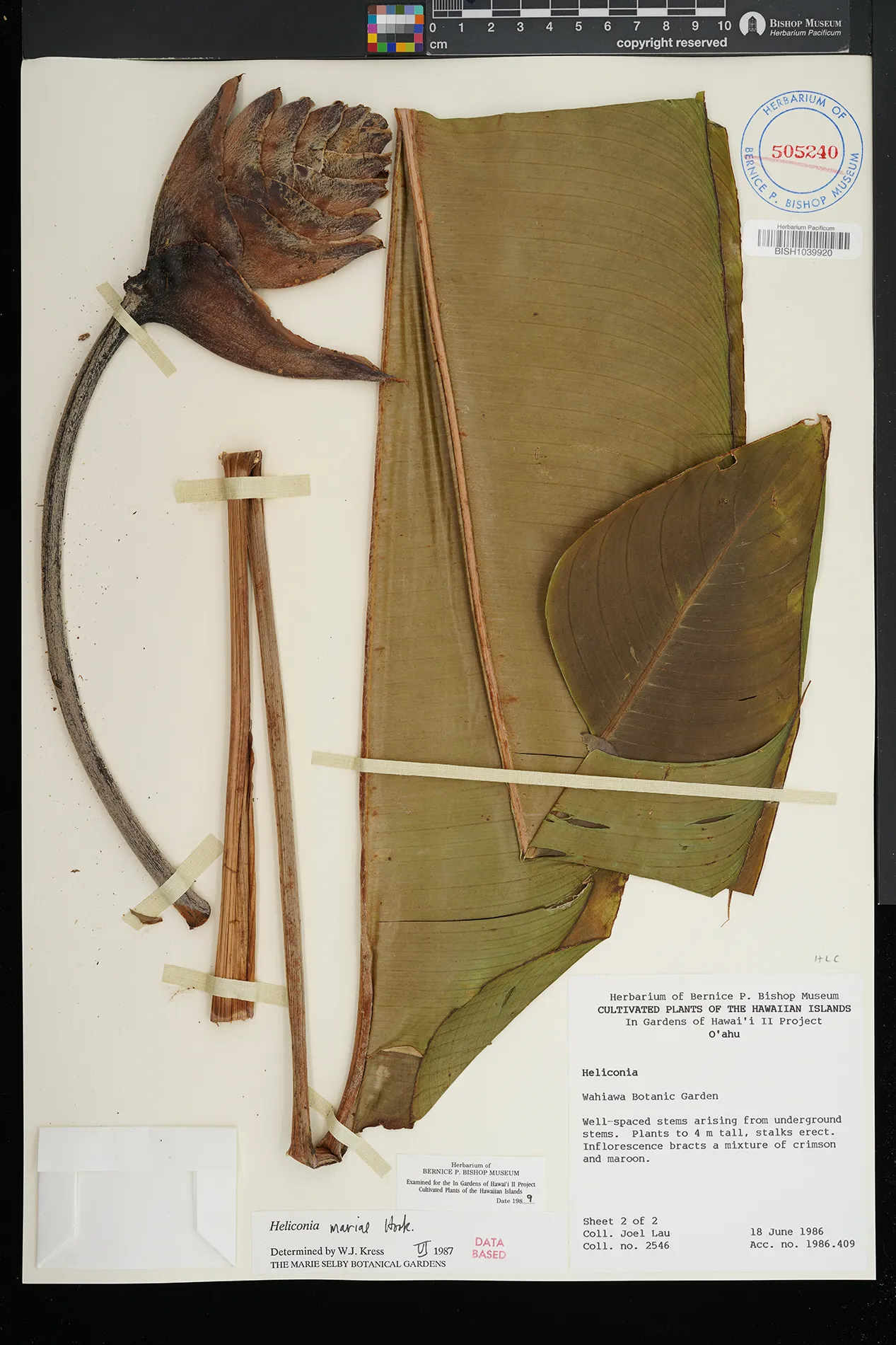 | 7 | Heliconia mariae | Wahiawa Botanical Gardens | Preserved_Specimen | Herb to 6 m, lvs to 2m x 0.6 m dull grn above; light yellow-grn below. Midrib above yellow-grn below reddish. Inflor hanging, bracts dark red. | Teraoka, W. | 310 | Oahu | BISH | 1980-07-03 | |