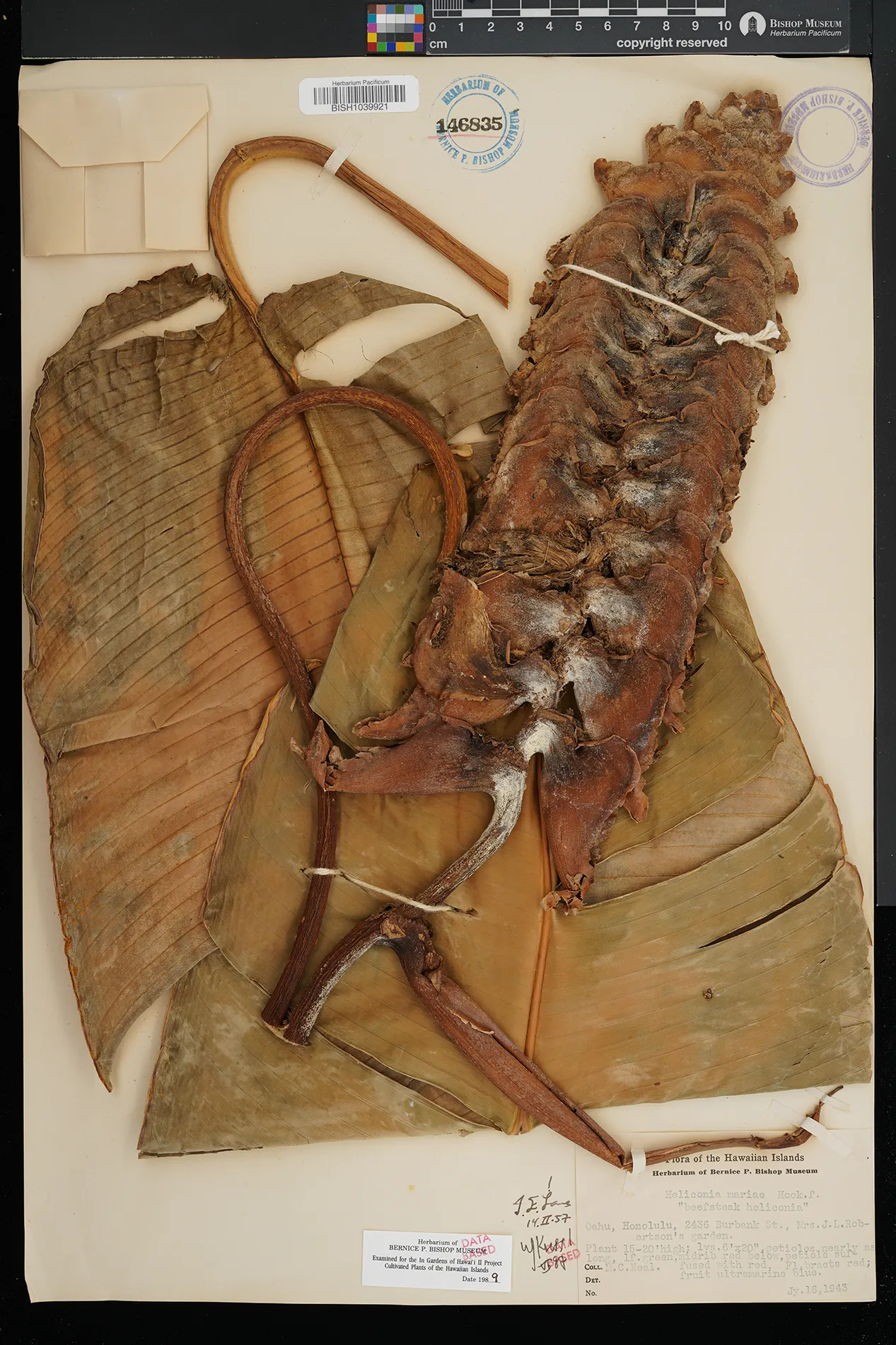 | 8 | Heliconia mariae | Honolulu, 2436 Burbank St, Mrs. J. L. Robertson's garden | Preserved_Specimen | Plant 15-20' ht; lvs 6'x20; petioles nearly as long; lf green, midrib red below; petiole suffused w. red. Fl bracts red; fruit ultramarine blue. | Neal, M.C. | Oahu | BISH | 1943-07-16 |