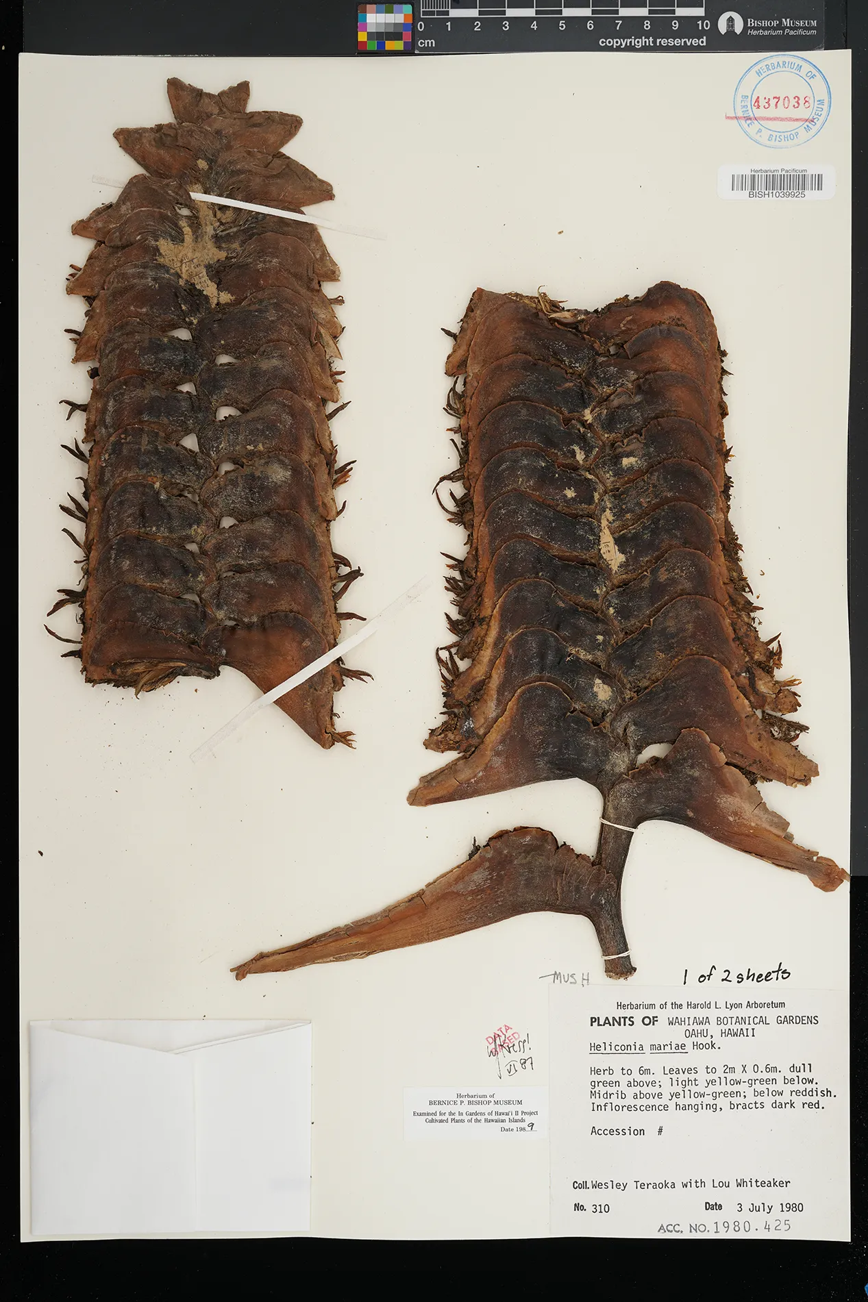 | 6 | Heliconia mariae | Wahiawa Botanical Gardens | Preserved_Specimen | Herb to 6 m, lvs to 2m x 0.6 m dull grn above; light yellow-grn below. Midrib above yellow-grn below reddish. Inflor hanging, bracts dark red. | Teraoka, W. | 310 | Oahu | BISH | 1980-07-03 | |