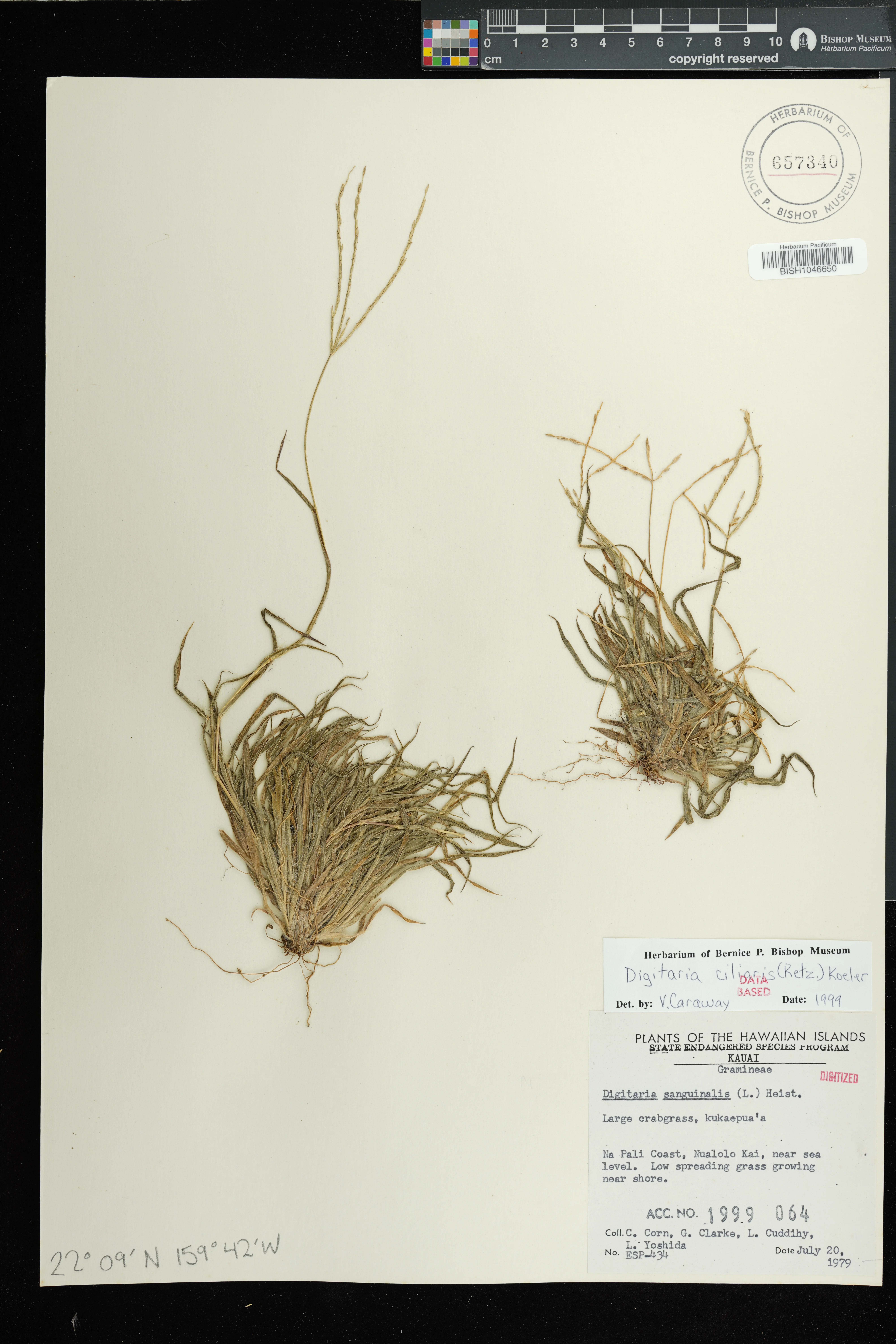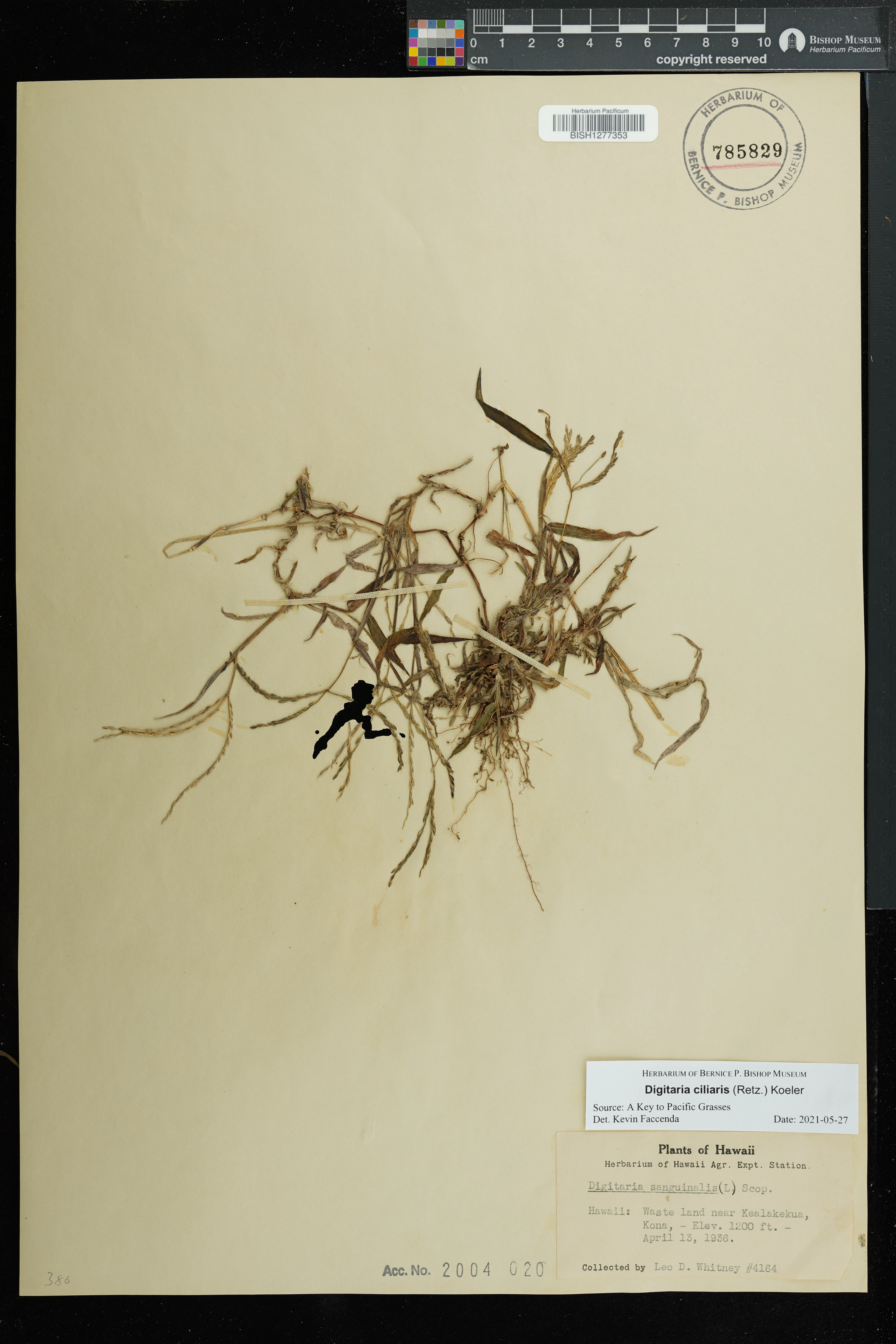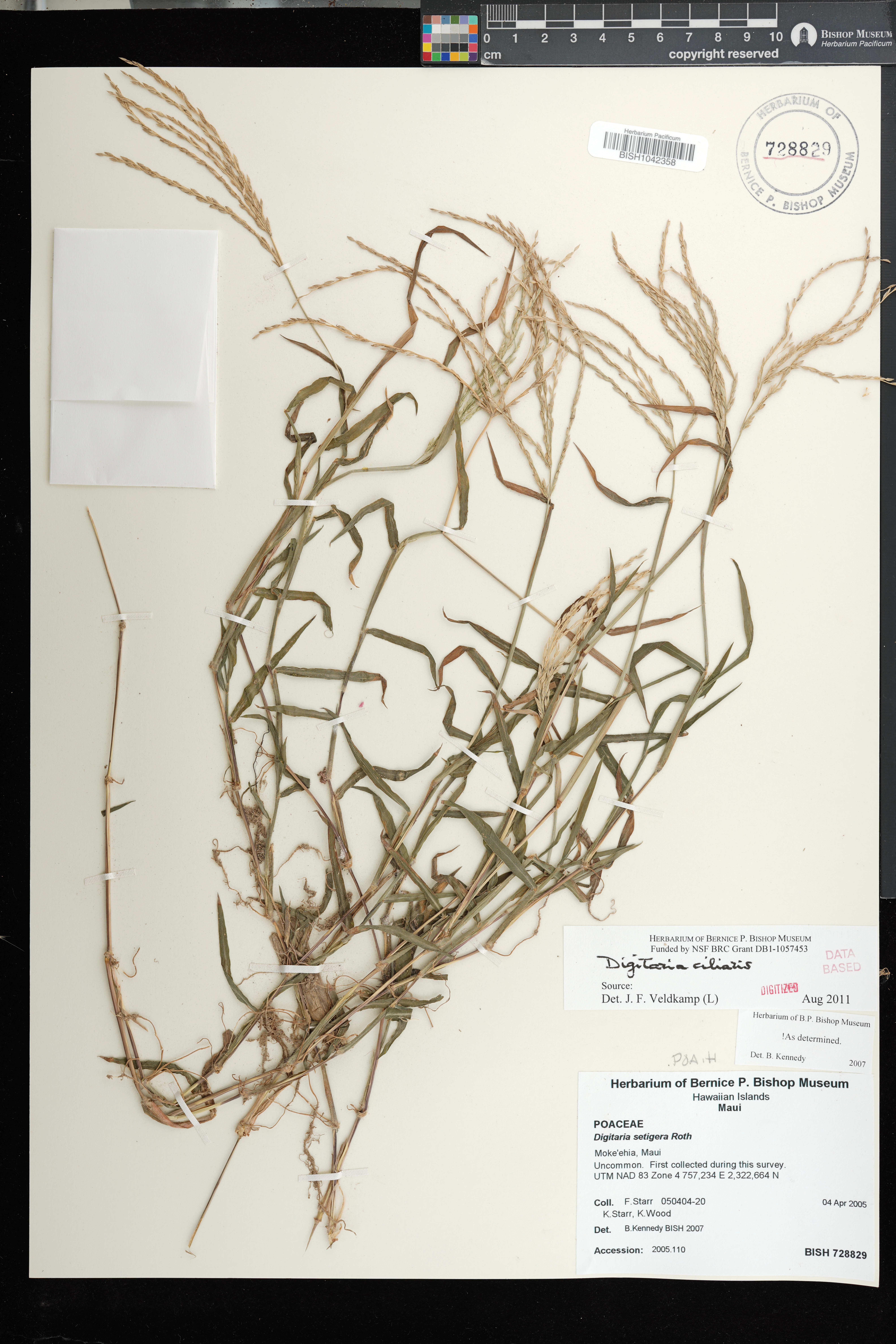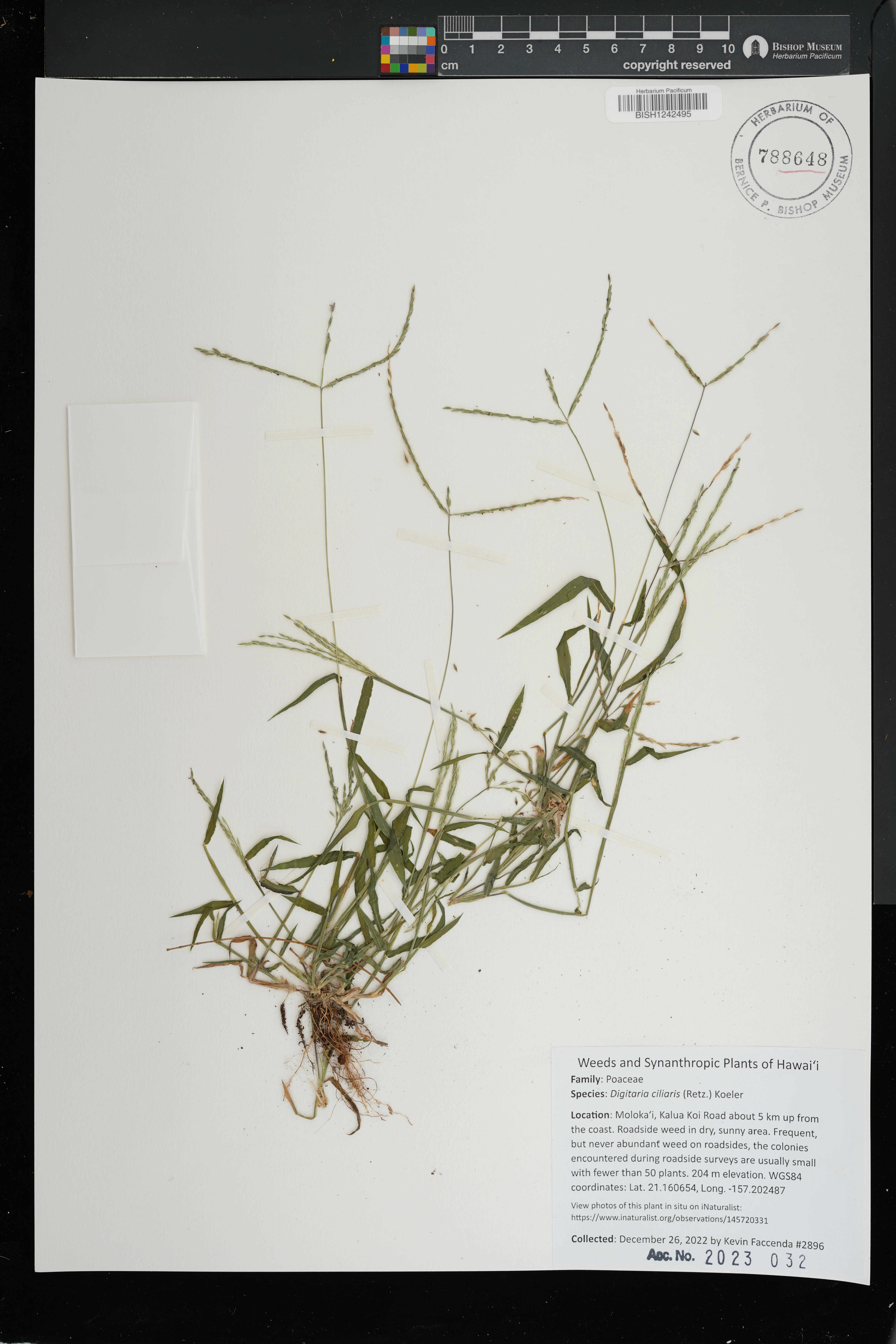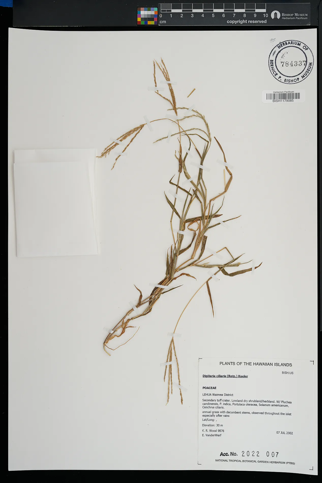 at edge of grassy swale planted with Brachiaria mutica between pineapple fields, with Digitaria ciliaris, Sonchus oleraceus, Emilia sonchifolia, Emilia fosbergii, Anagallis arvensis, Oxalis corniculata, Eragrostis pectinacea, Eleusine indica, Digitaria insularis, Melinis repens, Paspalum urvillei, Cynodon dactylon. |