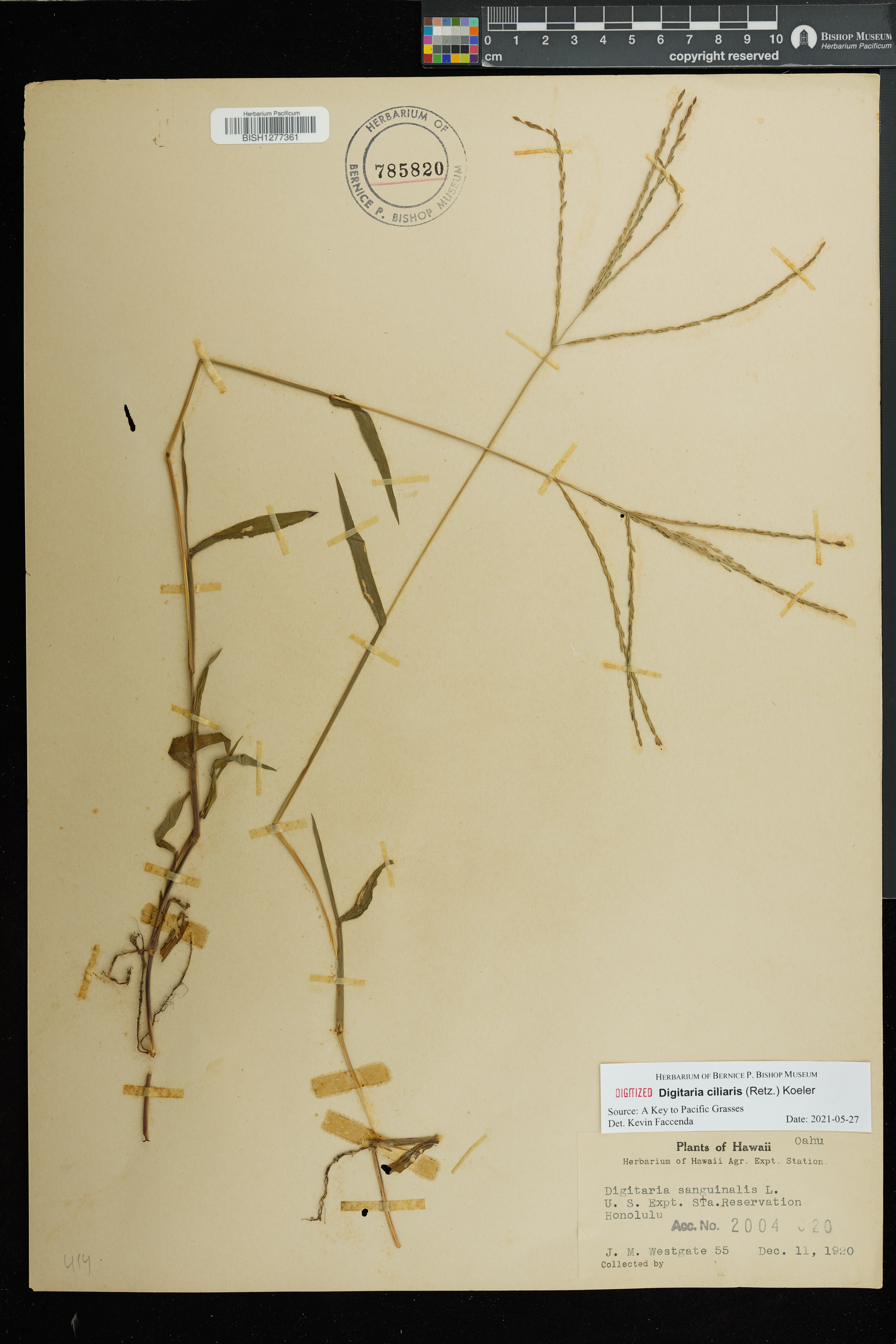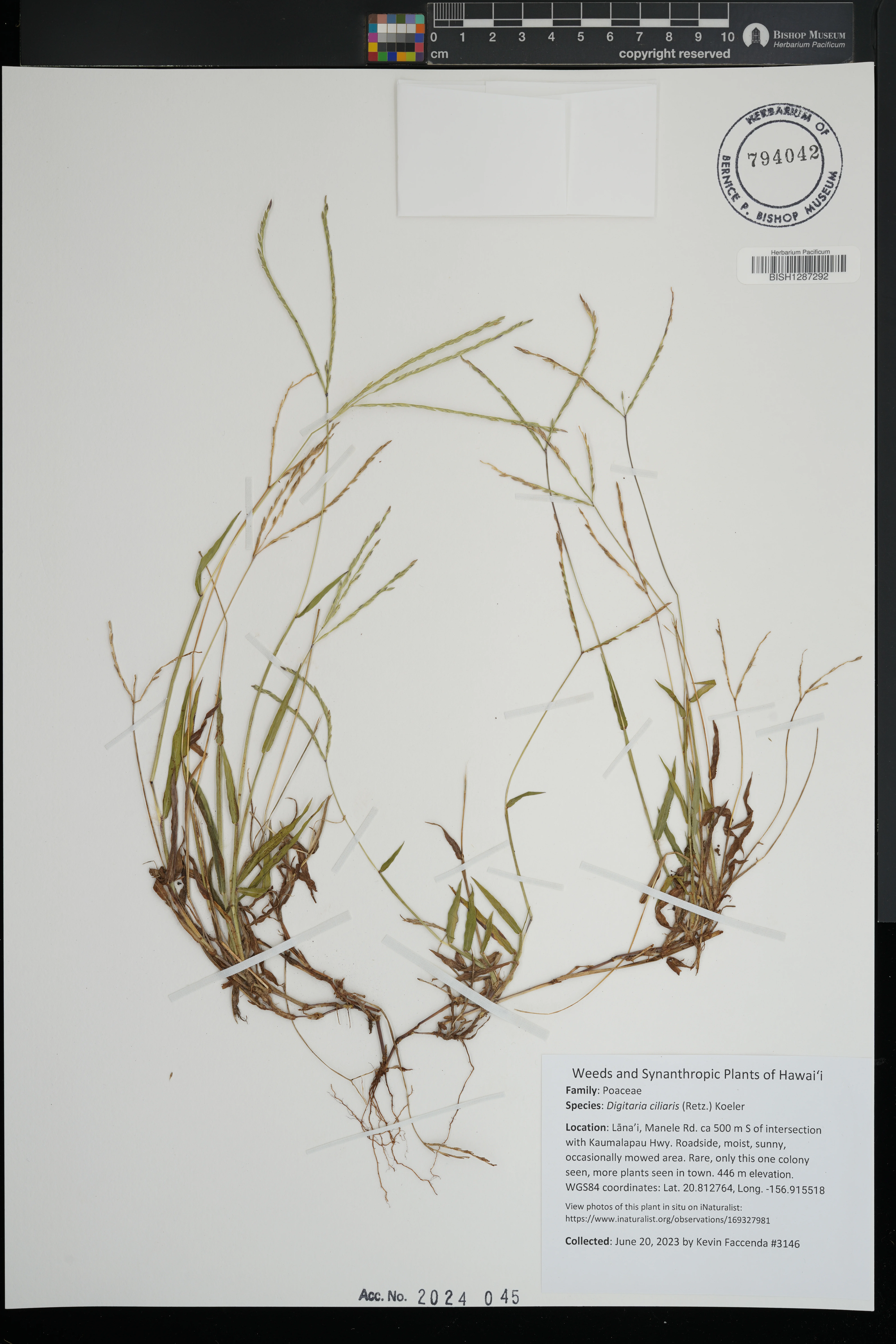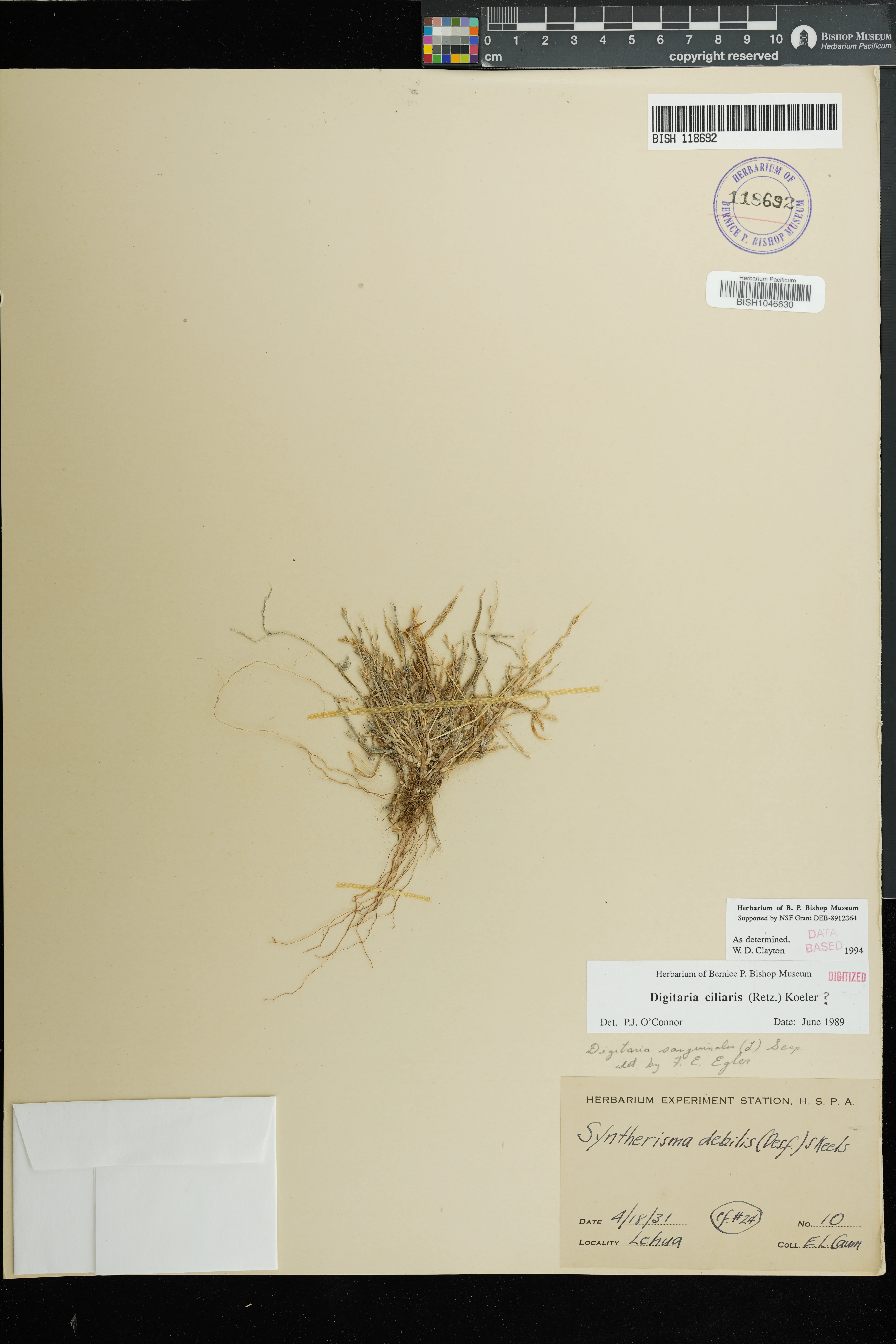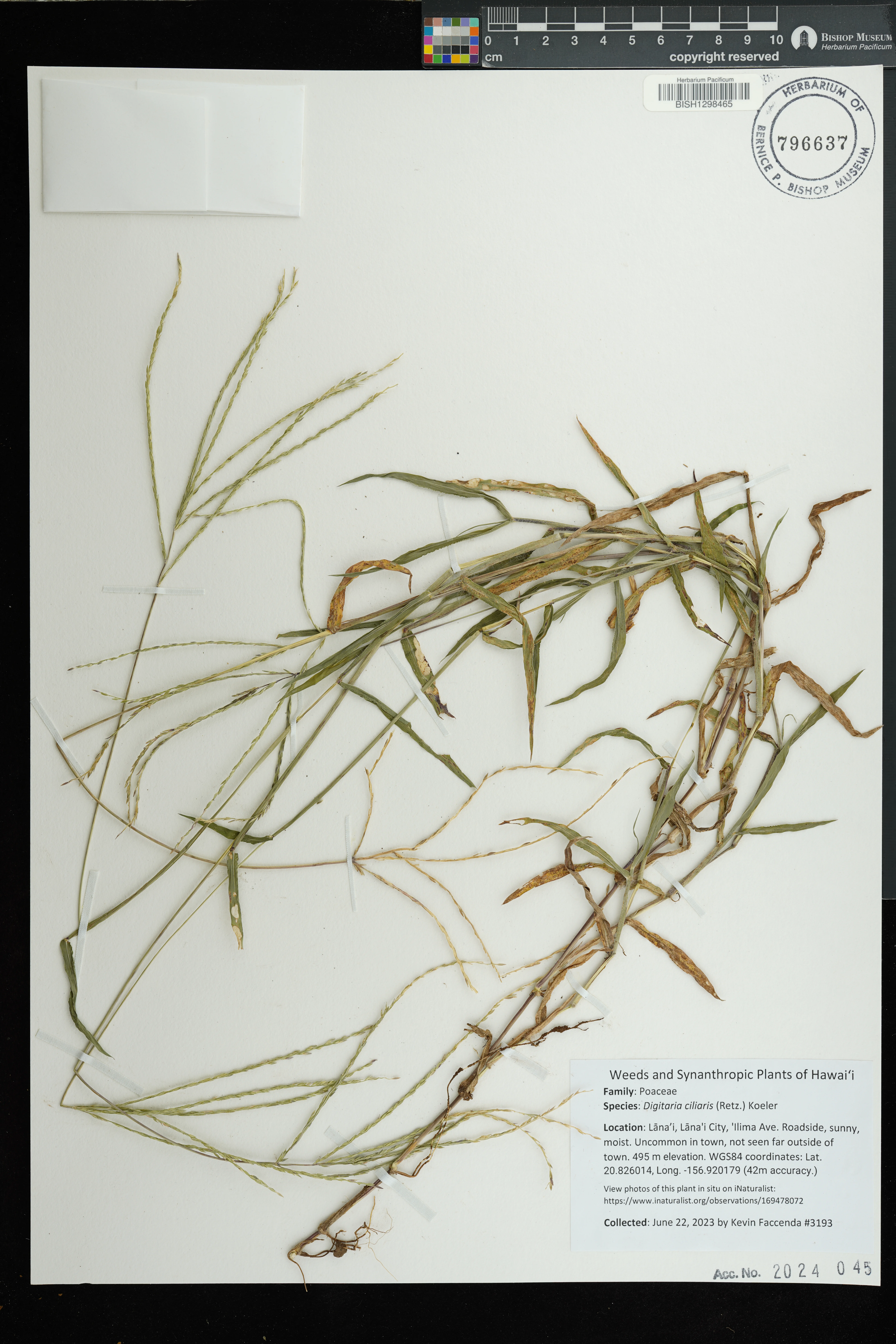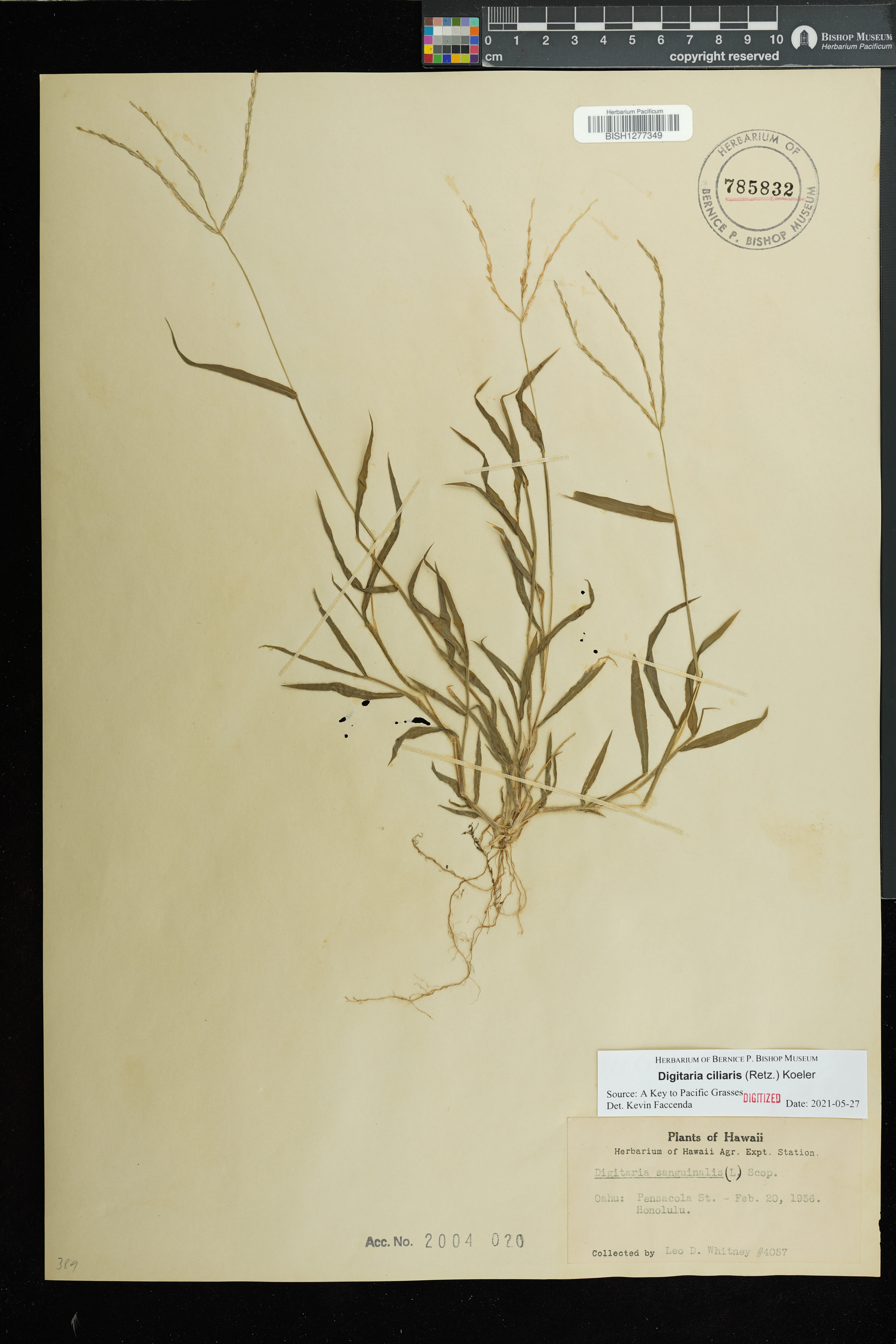at edge of grassy swale planted with Brachiaria mutica between pineapple fields, with Digitaria ciliaris, Sonchus oleraceus, Emilia sonchifolia, Emilia fosbergii, Anagallis arvensis, Oxalis corniculata, Eragrostis pectinacea, Eleusine indica, Digitaria insularis, Melinis repens, Paspalum urvillei, Cynodon dactylon. |