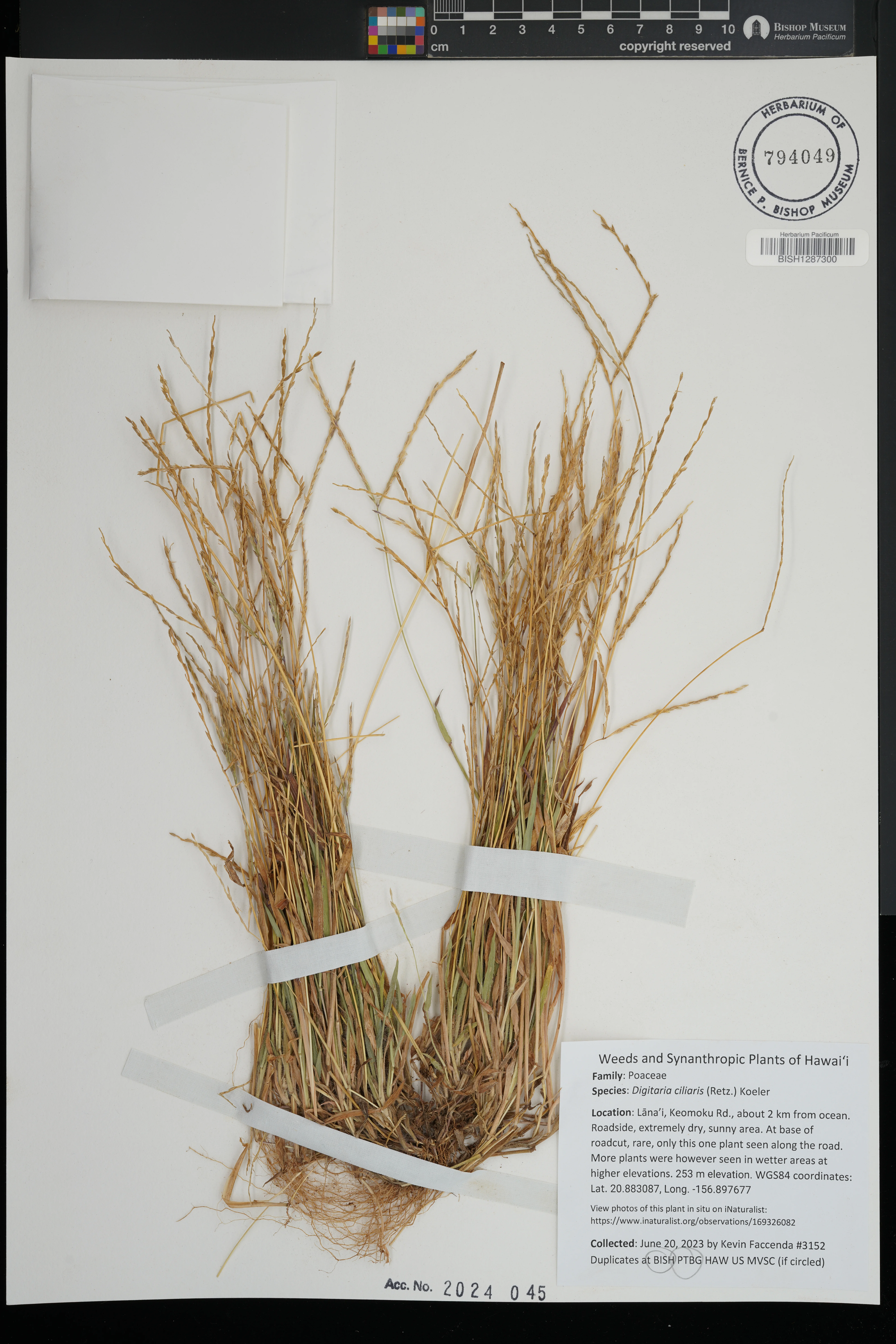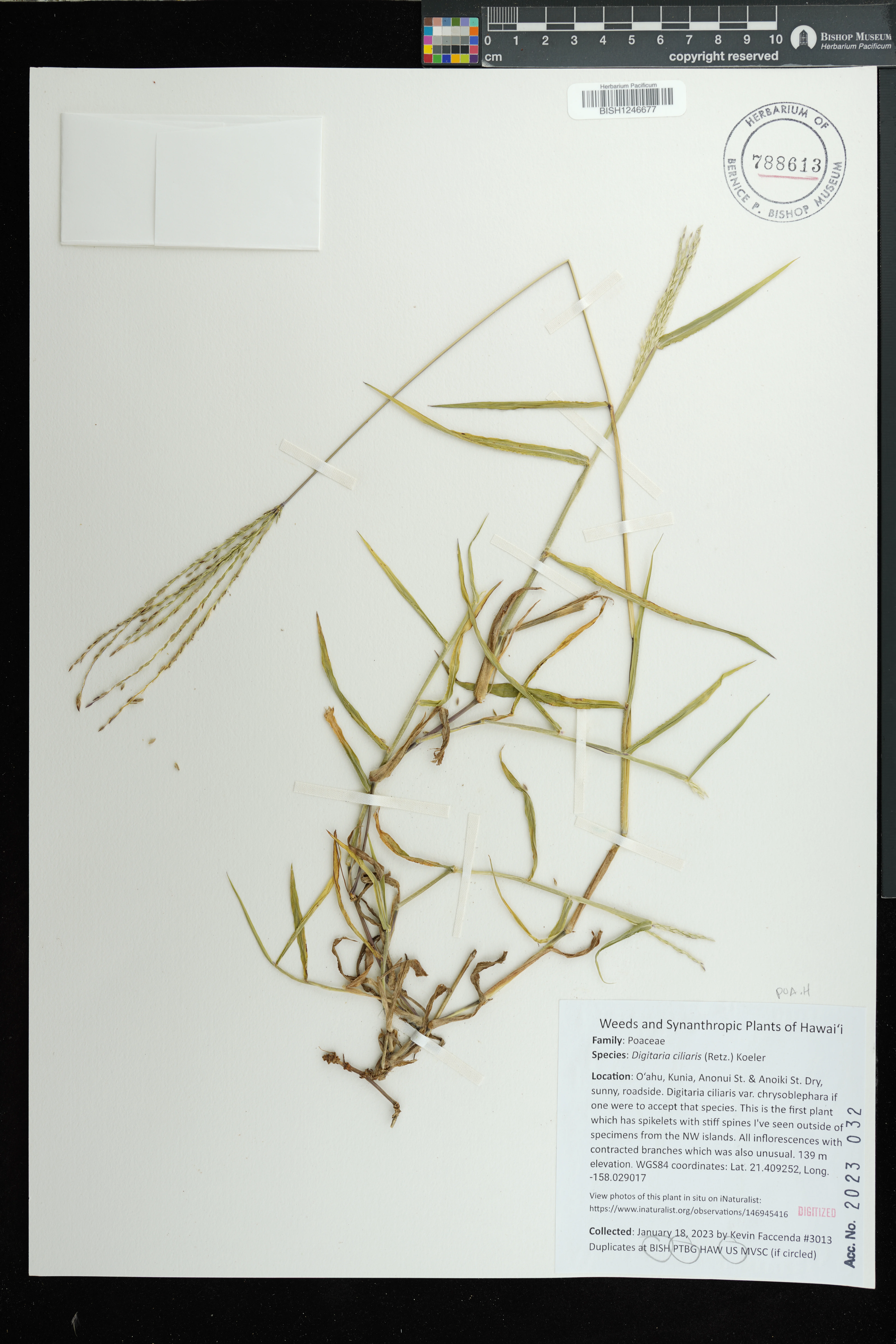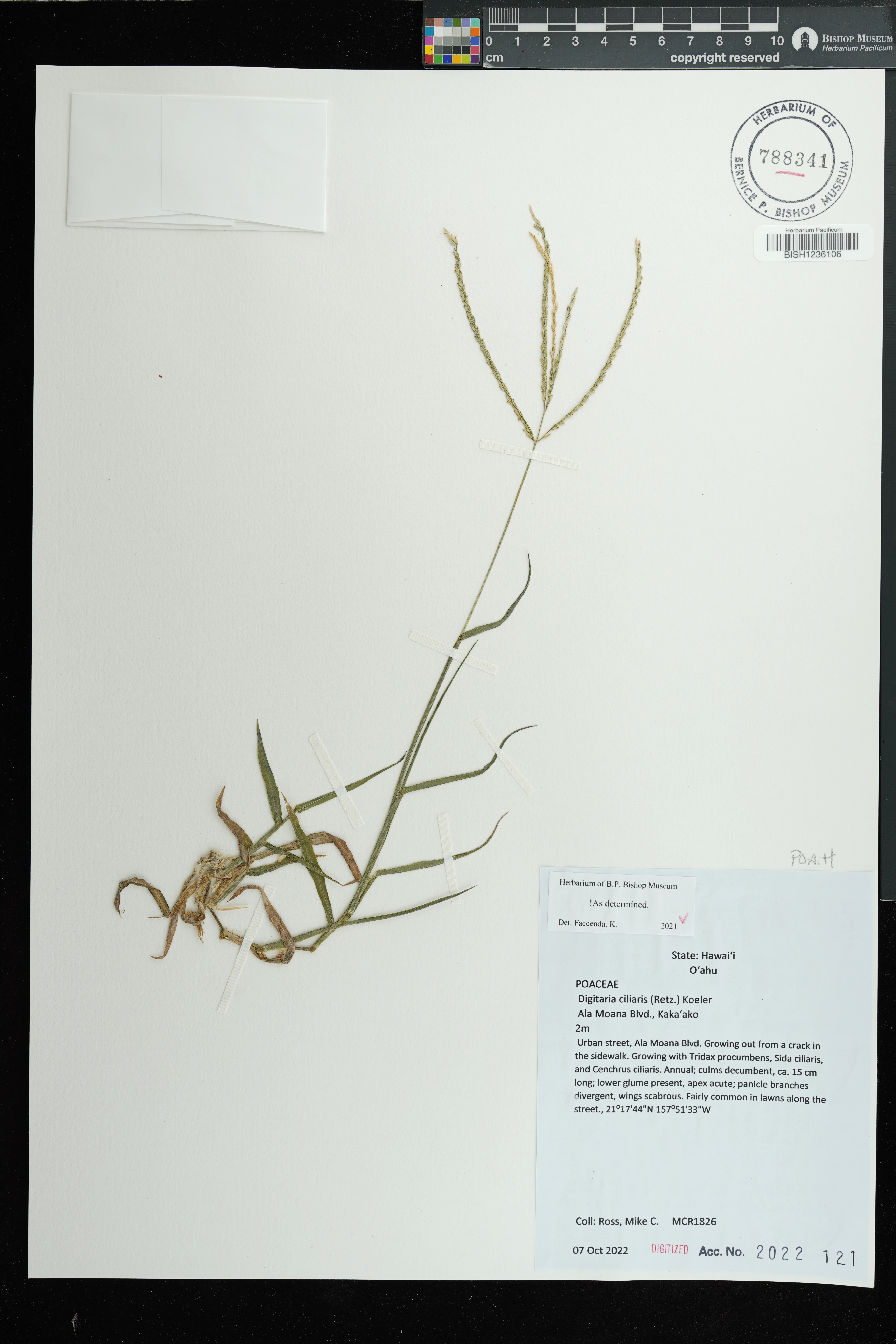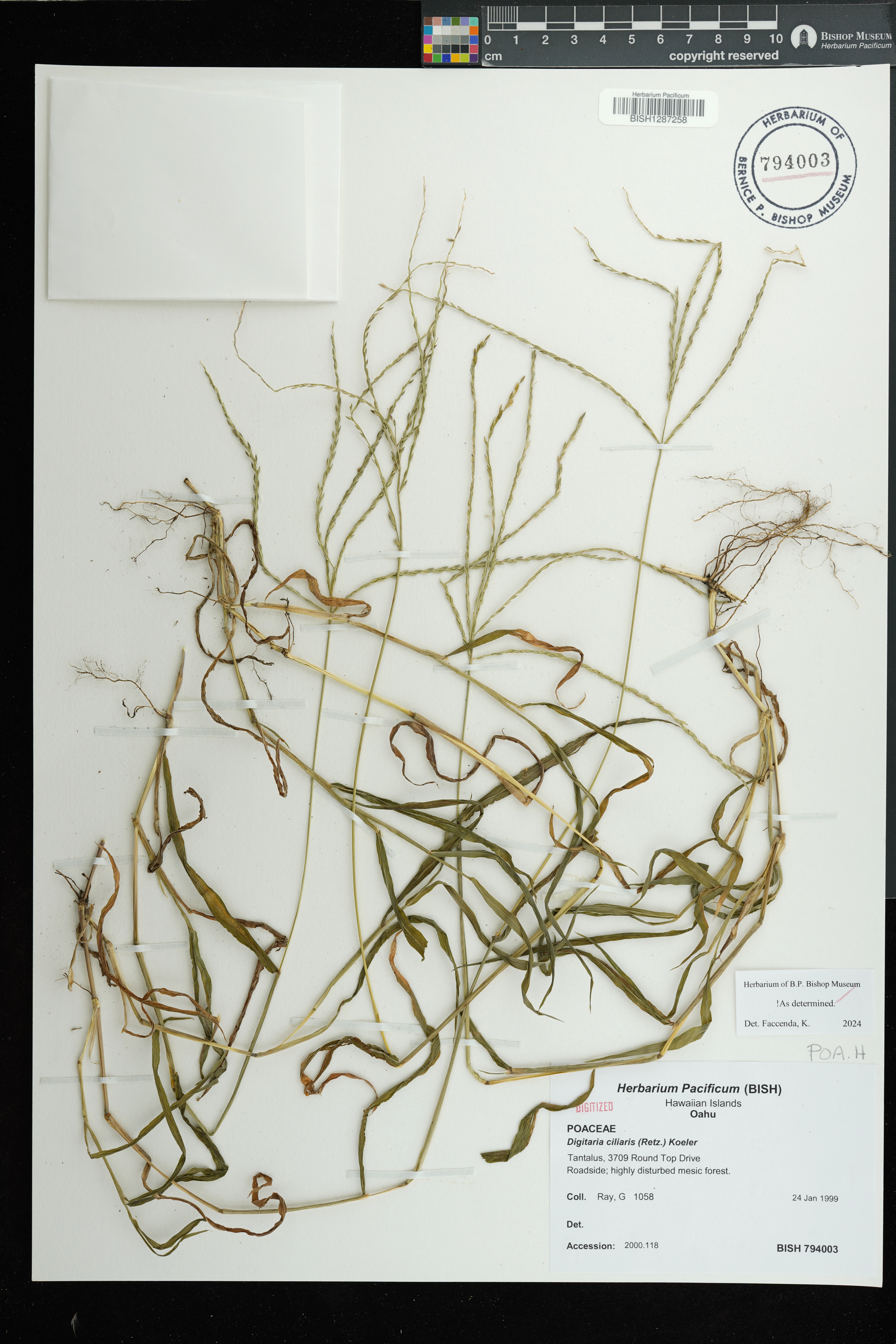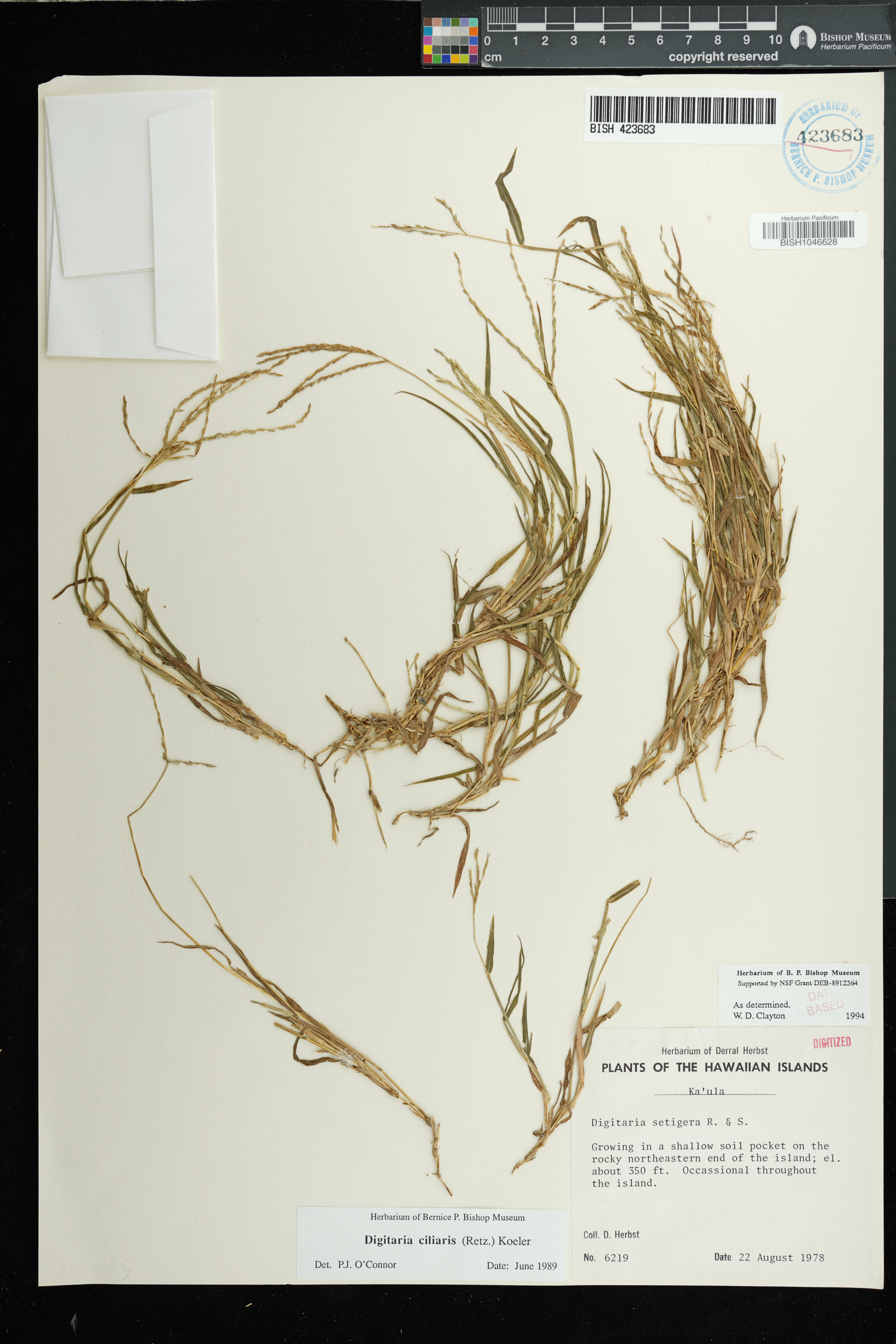 at edge of grassy swale planted with Brachiaria mutica between pineapple fields, with Digitaria ciliaris, Sonchus oleraceus, Emilia sonchifolia, Emilia fosbergii, Anagallis arvensis, Oxalis corniculata, Eragrostis pectinacea, Eleusine indica, Digitaria insularis, Melinis repens, Paspalum urvillei, Cynodon dactylon. |