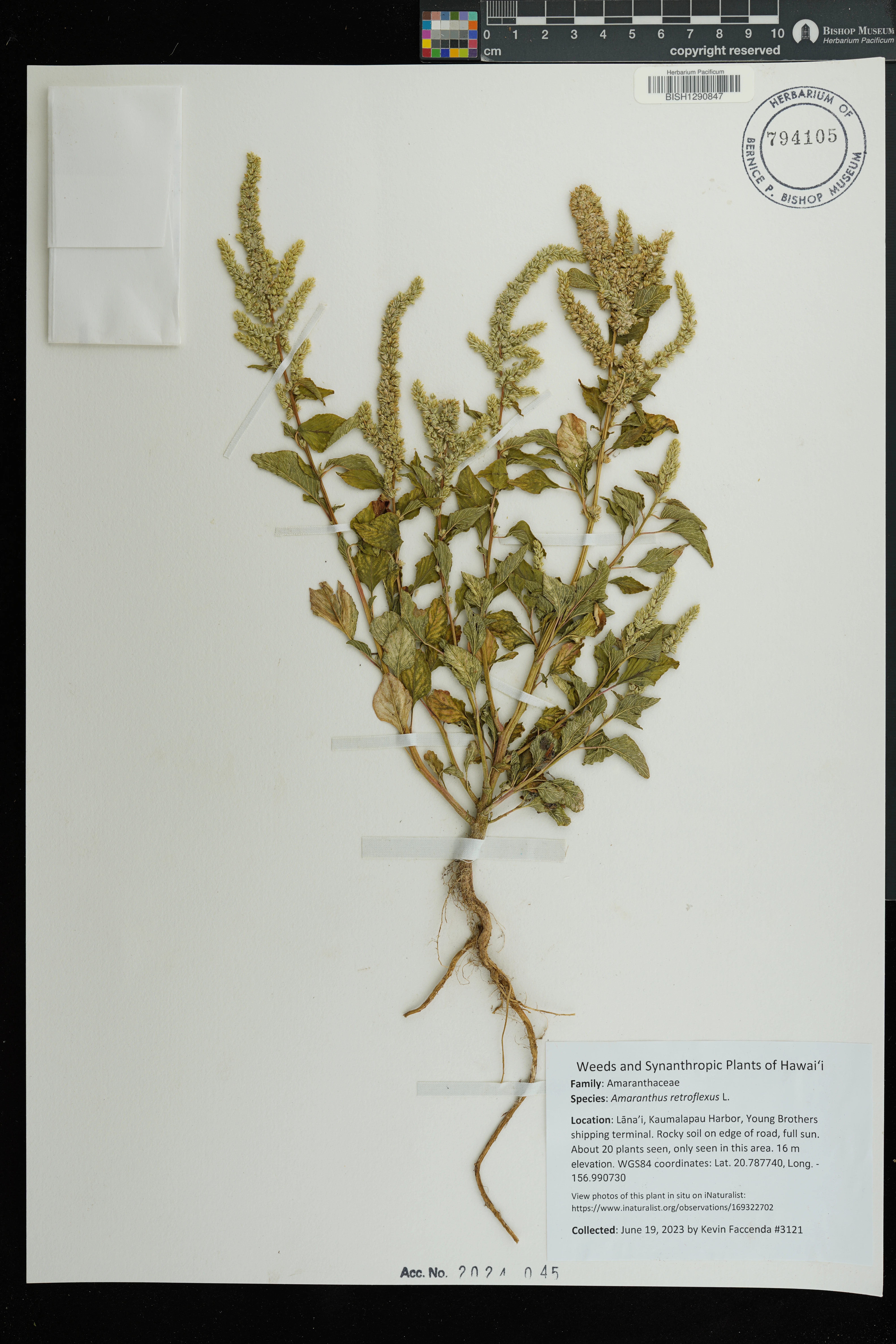 10 Amaranthus retroflexus L. east maui, puu o kali Lowland seasonal dry scrub w. a`a lava substrate. Associated vegetation: Cenchrus ciliaris, Prosopis pallida, Sida fallax. PRESERVED_SPECIMEN starr, f. starr, k. collector number: 040527-1 Maui BISH 5/27/2004