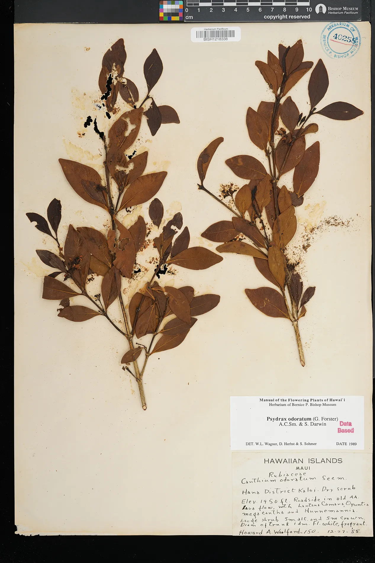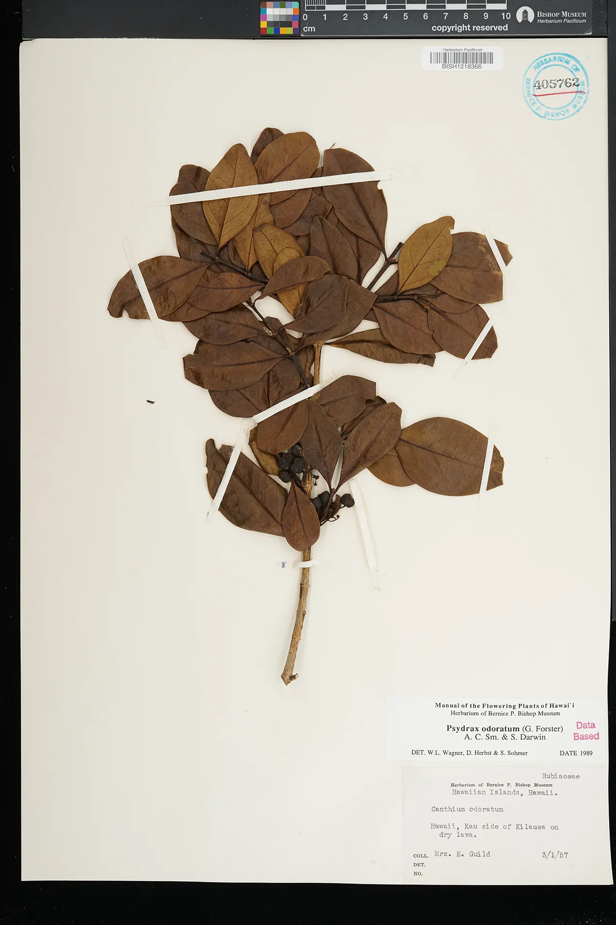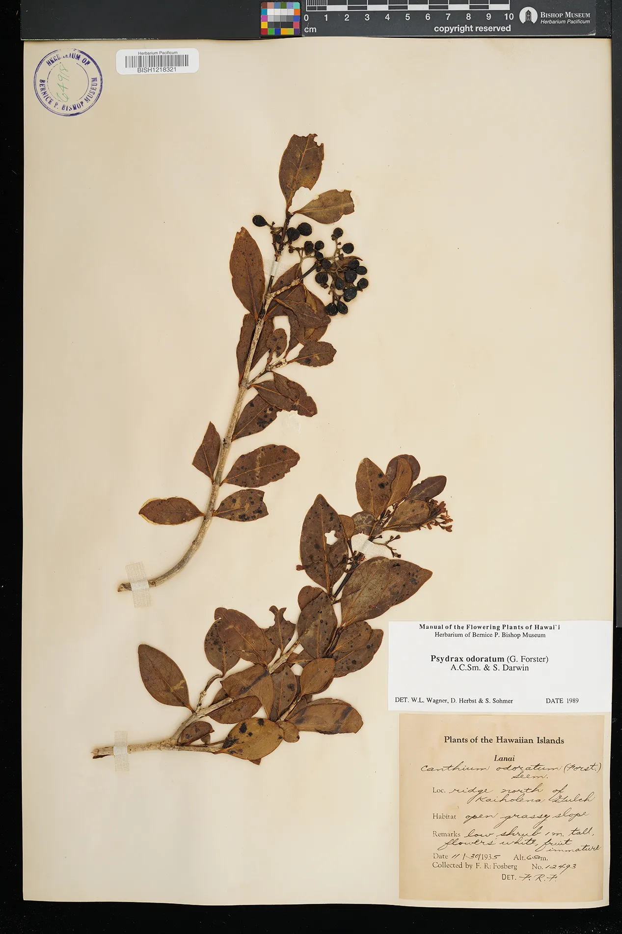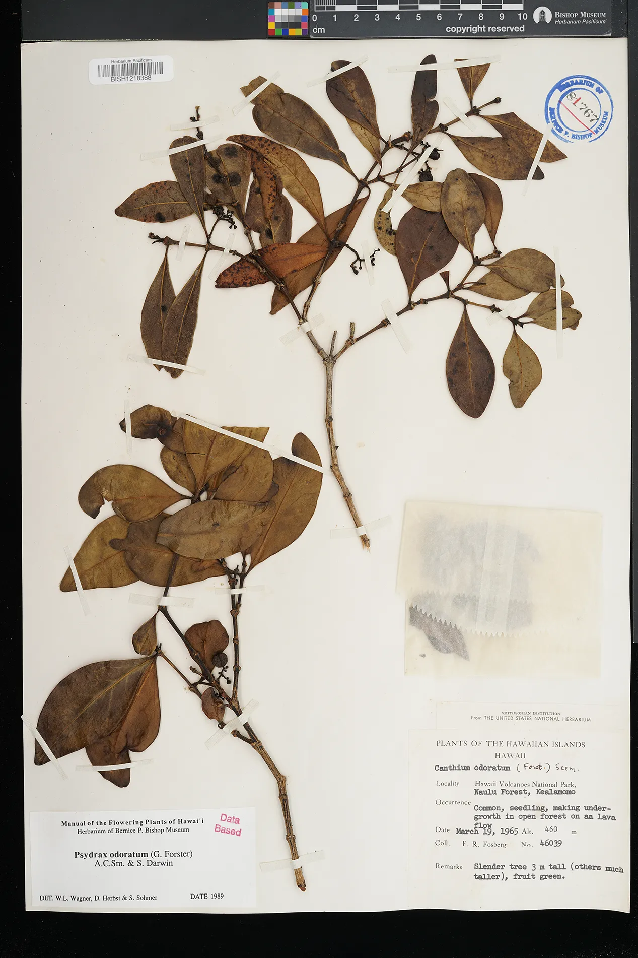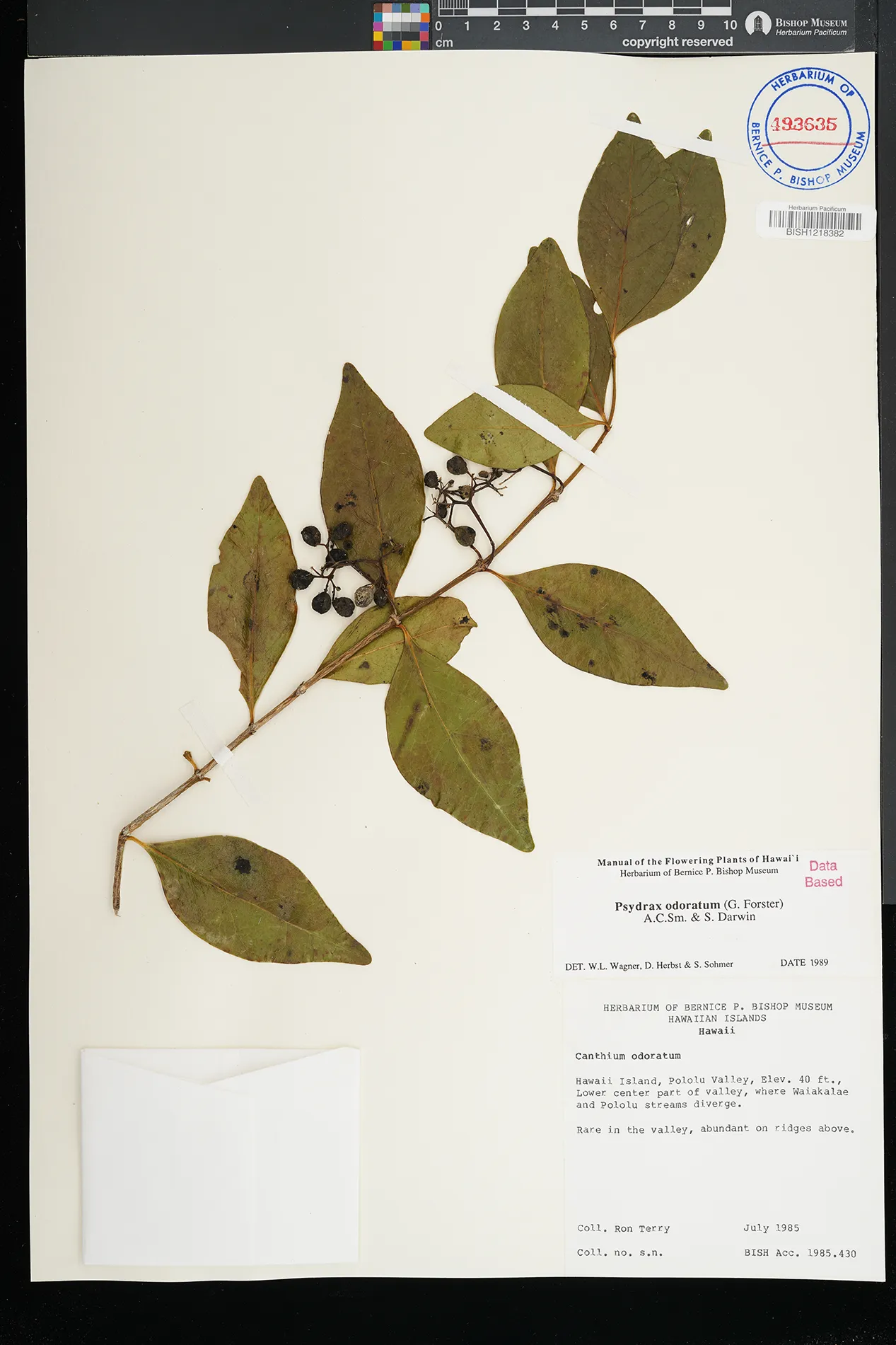 • The fruit of Psydrax odorata is about 3/8 inch in diameter, more or less round, and glossy black and juicy when ripe. The fruits are generally ripe in the late fall and winter. The pulpy fruits generally contain two seeds. Although many seeds are produced, they are often attacked by the larvae of the moth Orneodes objurgatella. These seeds have holes in them, are generally not viable, and should be discarded. Criley notes that fewer than 10% of seeds may be viable due to insect damage.