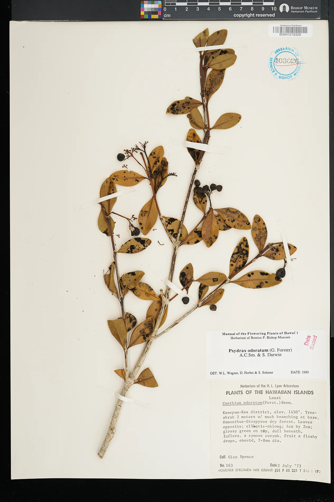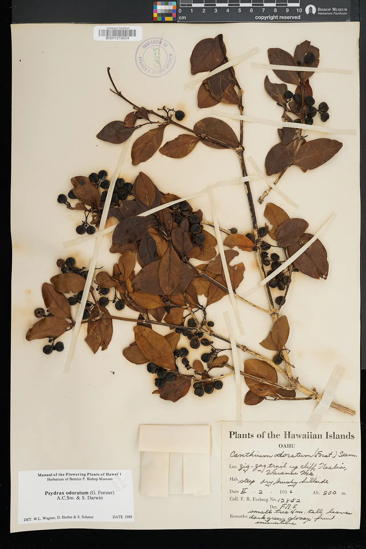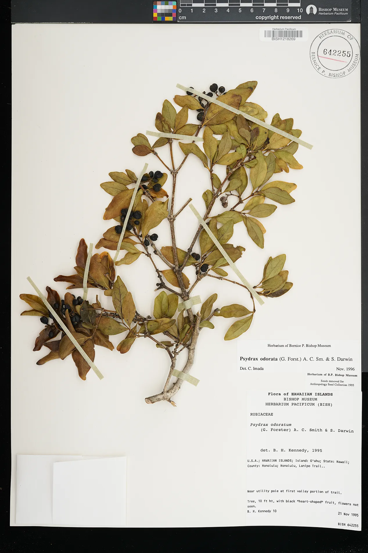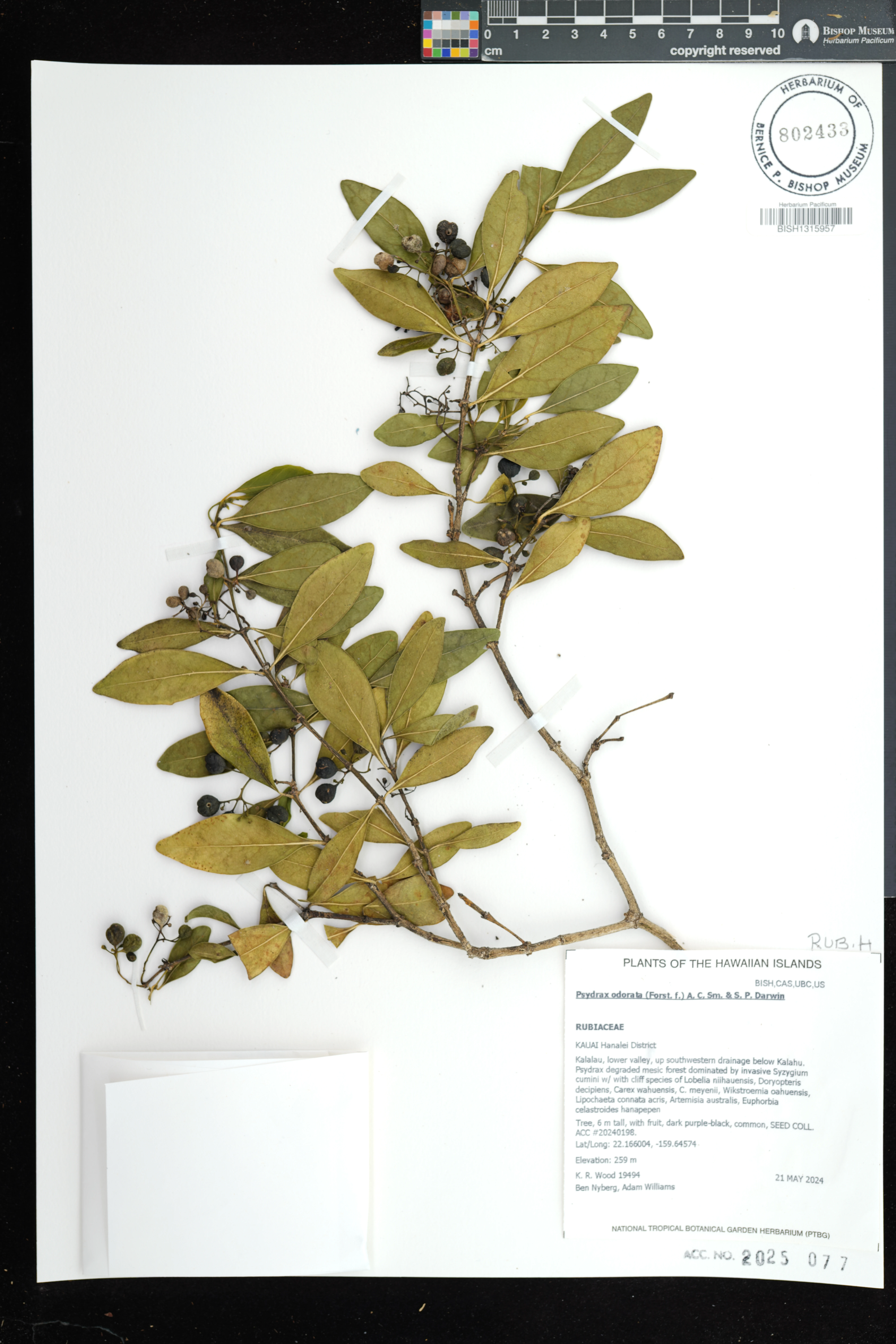 • The fruit of Psydrax odorata is about 3/8 inch in diameter, more or less round, and glossy black and juicy when ripe. The fruits are generally ripe in the late fall and winter. The pulpy fruits generally contain two seeds. Although many seeds are produced, they are often attacked by the larvae of the moth Orneodes objurgatella. These seeds have holes in them, are generally not viable, and should be discarded. Criley notes that fewer than 10% of seeds may be viable due to insect damage.