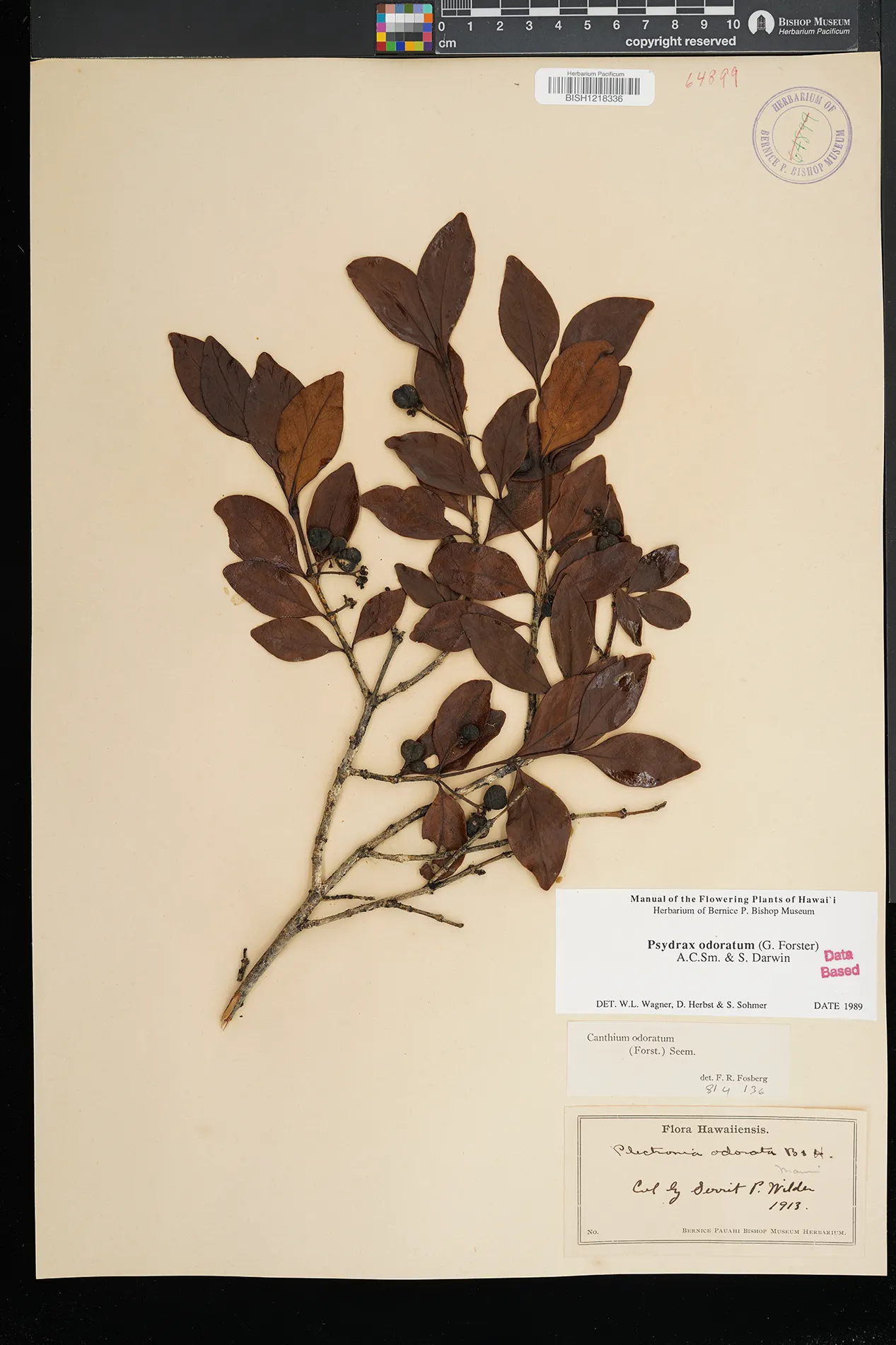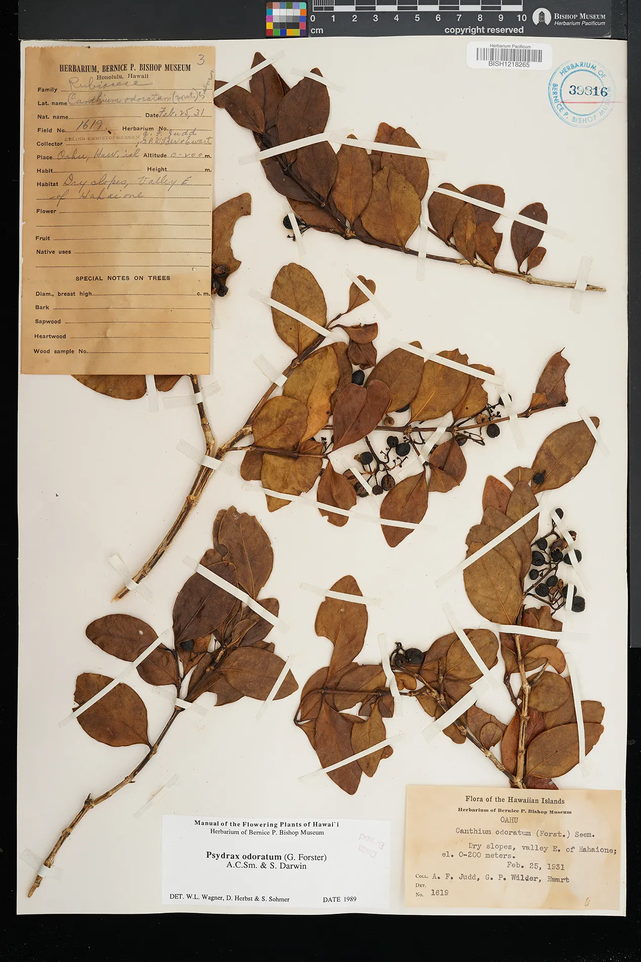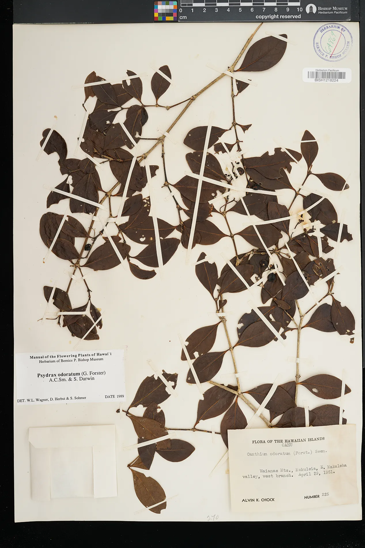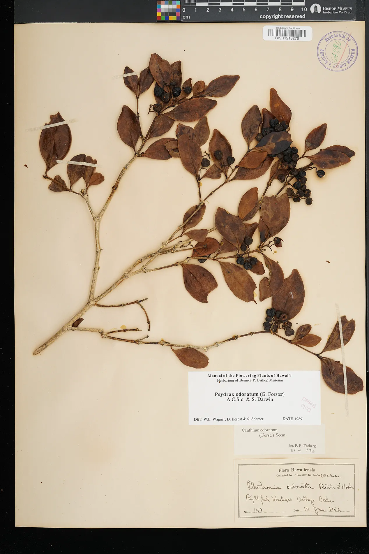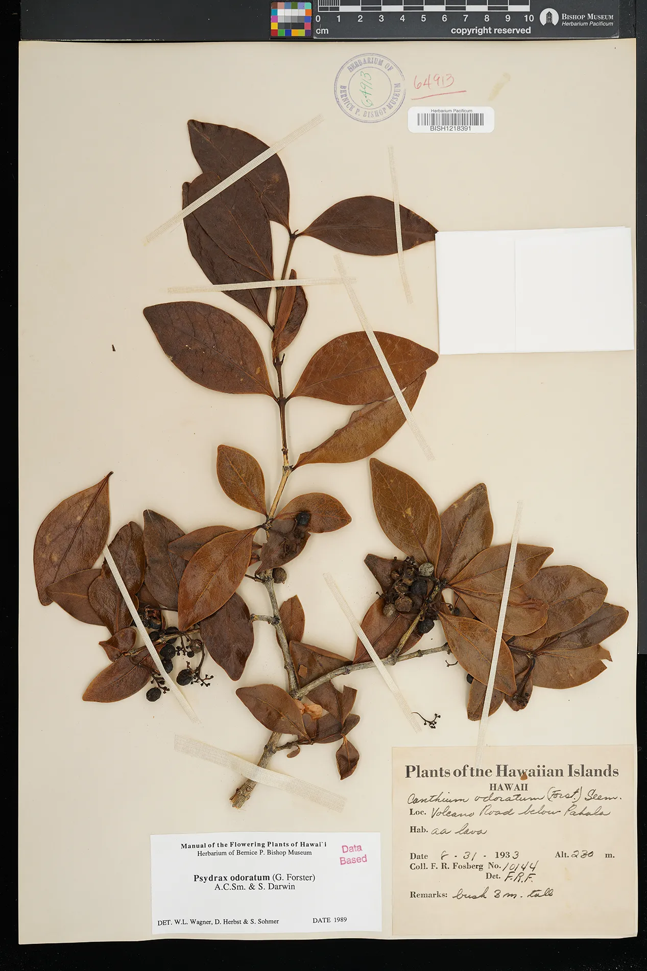 • The fruit of Psydrax odorata is about 3/8 inch in diameter, more or less round, and glossy black and juicy when ripe. The fruits are generally ripe in the late fall and winter. The pulpy fruits generally contain two seeds. Although many seeds are produced, they are often attacked by the larvae of the moth Orneodes objurgatella. These seeds have holes in them, are generally not viable, and should be discarded. Criley notes that fewer than 10% of seeds may be viable due to insect damage.