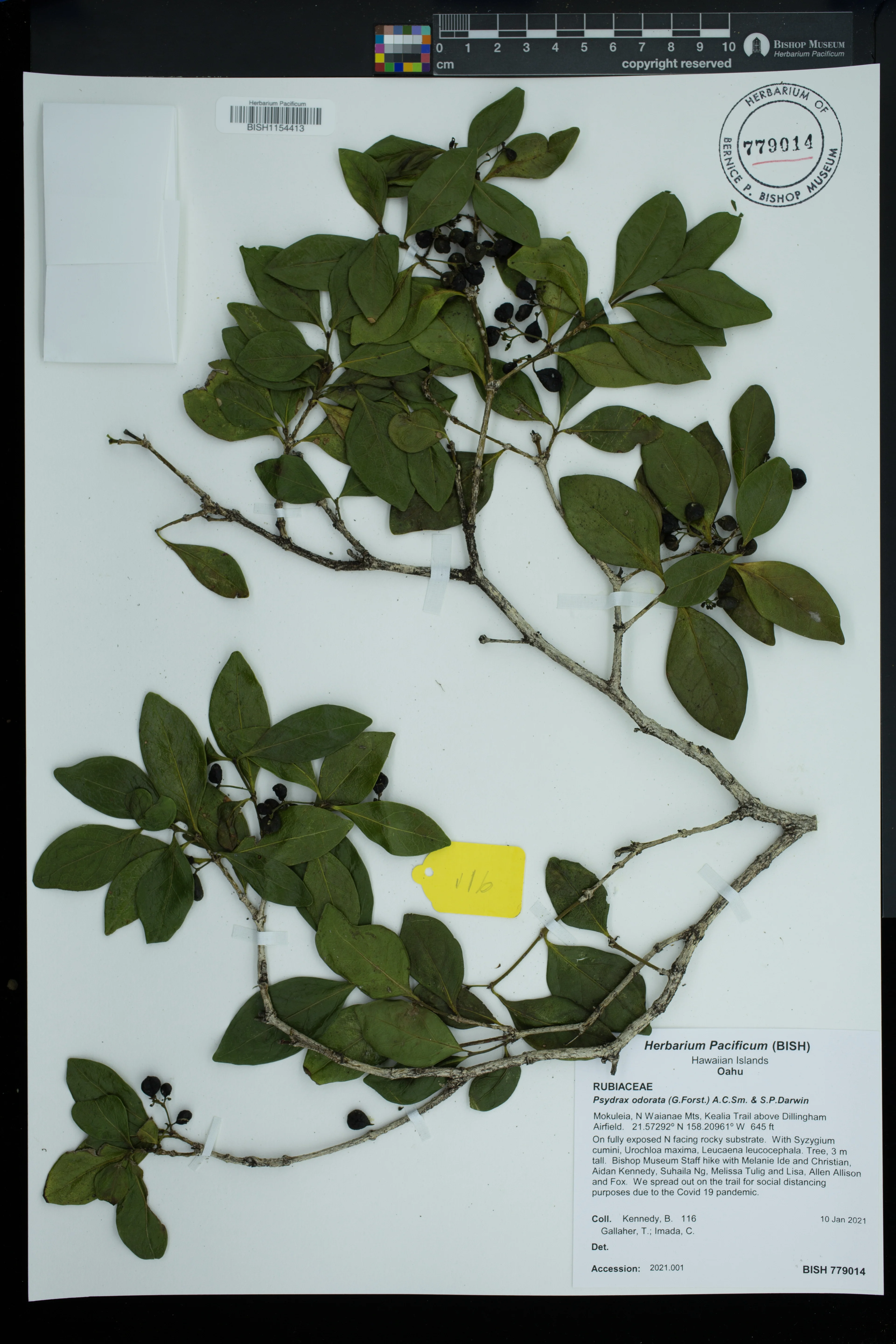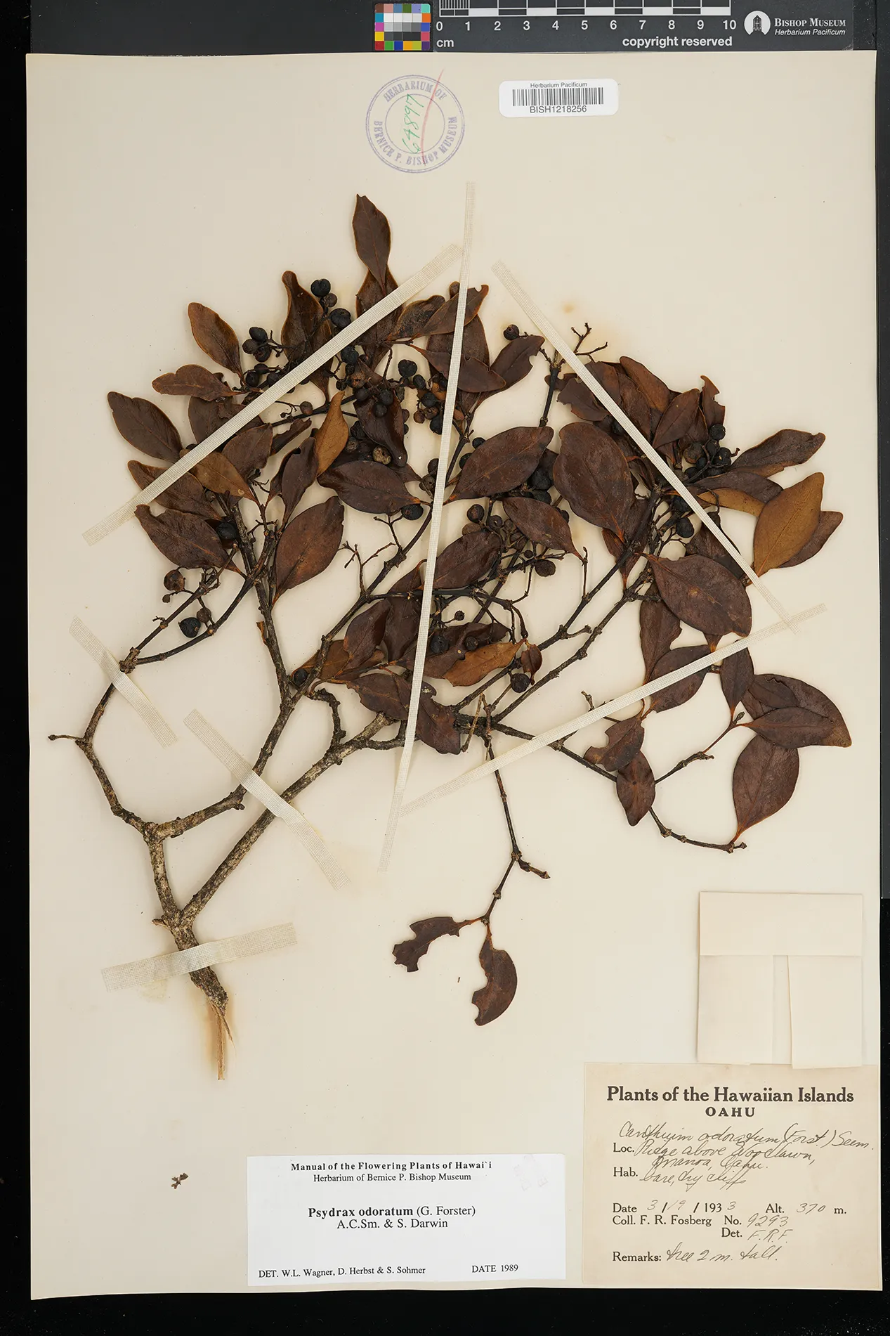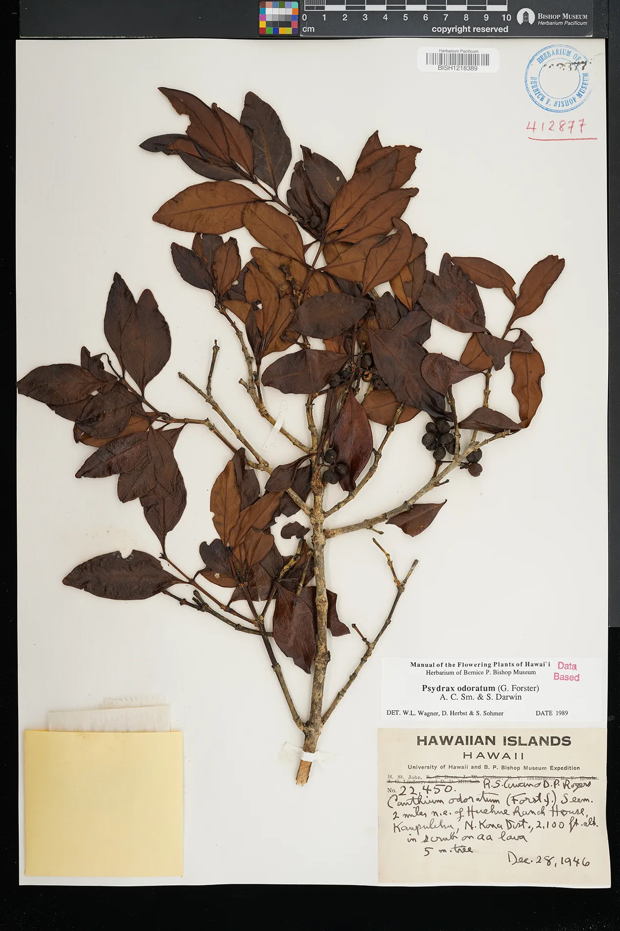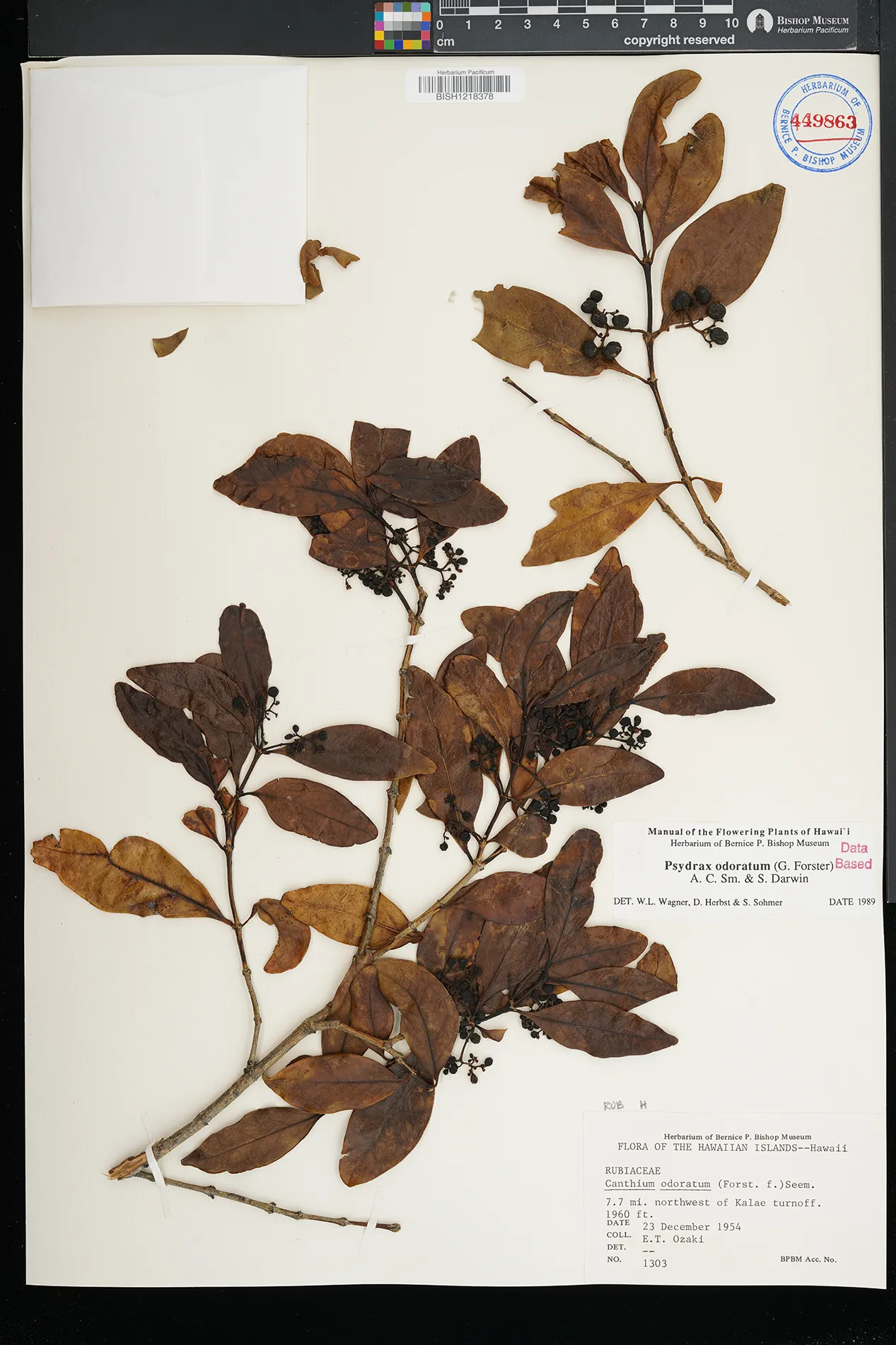 • The fruit of Psydrax odorata is about 3/8 inch in diameter, more or less round, and glossy black and juicy when ripe. The fruits are generally ripe in the late fall and winter. The pulpy fruits generally contain two seeds. Although many seeds are produced, they are often attacked by the larvae of the moth Orneodes objurgatella. These seeds have holes in them, are generally not viable, and should be discarded. Criley notes that fewer than 10% of seeds may be viable due to insect damage.