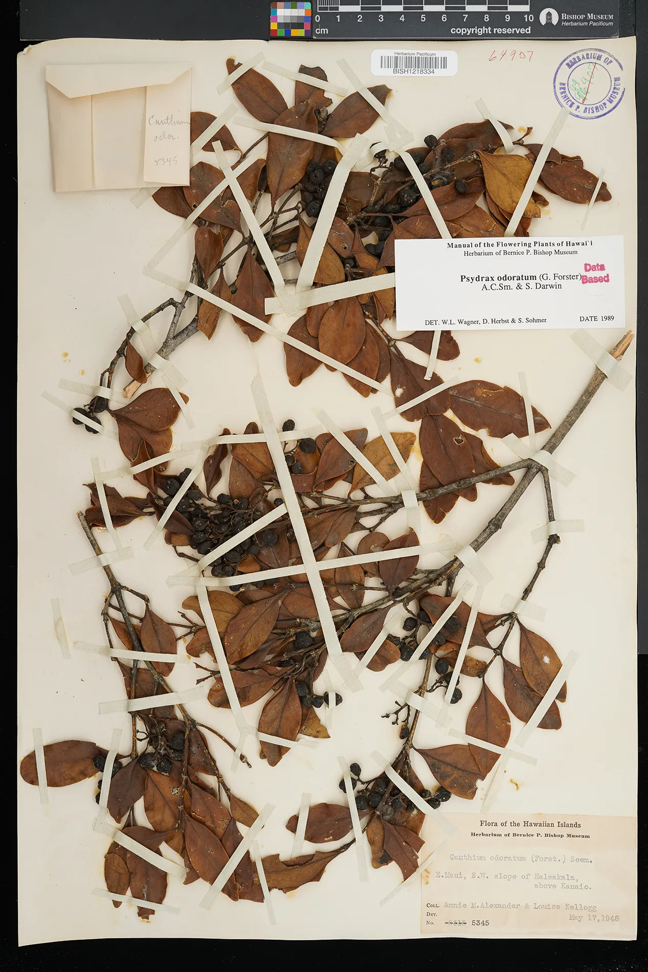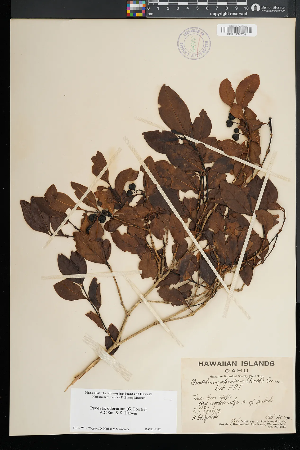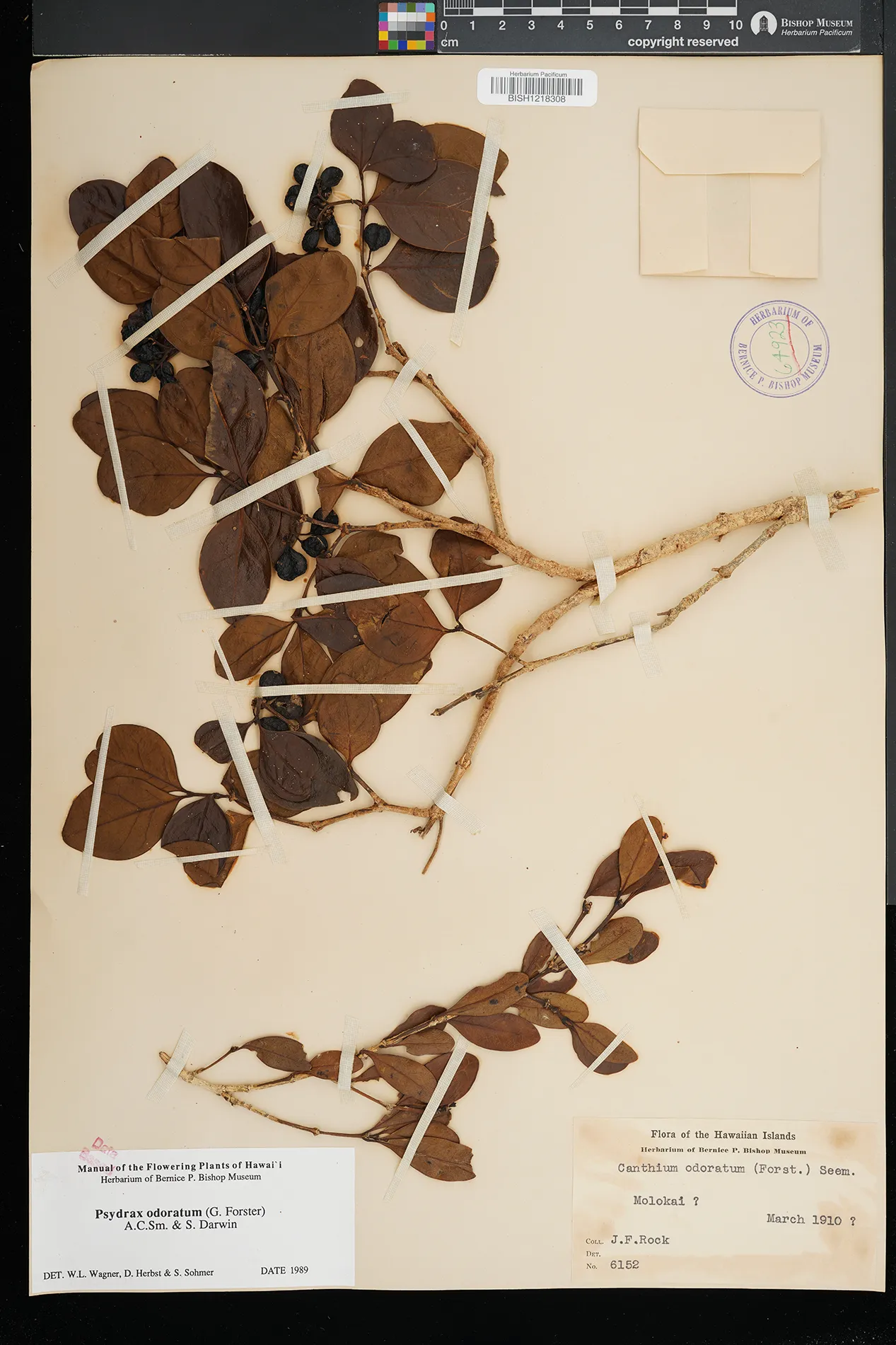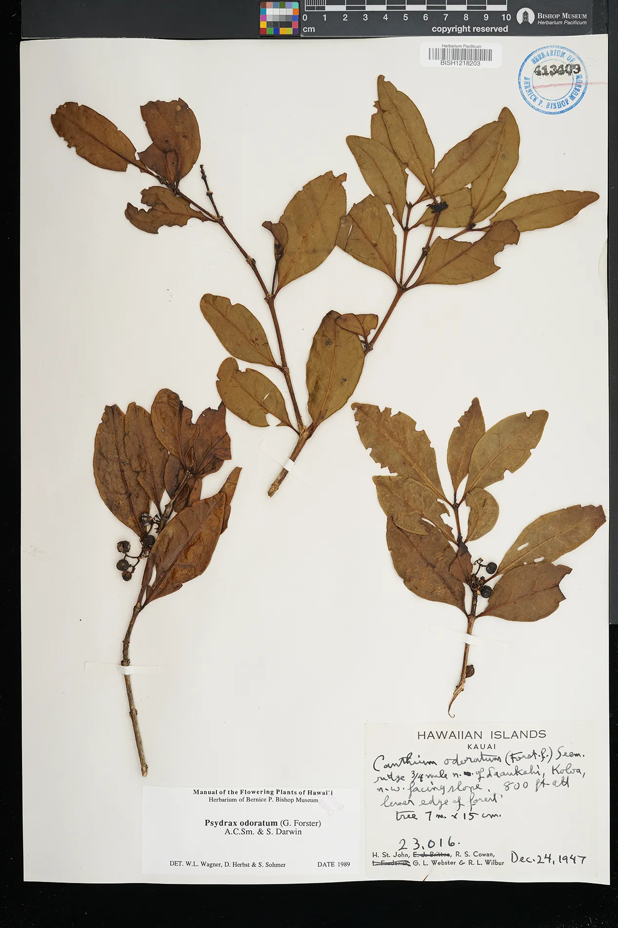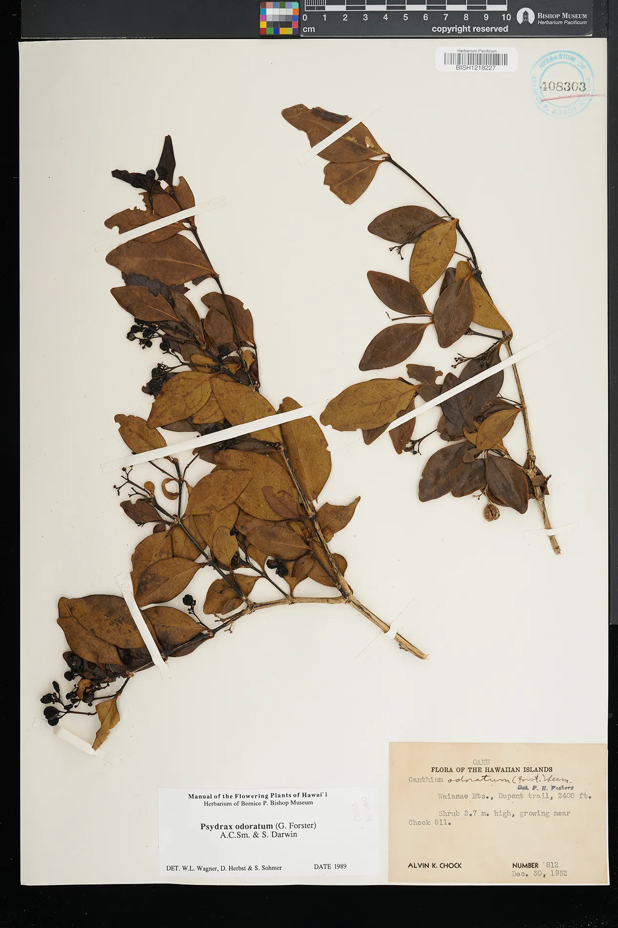 • The fruit of Psydrax odorata is about 3/8 inch in diameter, more or less round, and glossy black and juicy when ripe. The fruits are generally ripe in the late fall and winter. The pulpy fruits generally contain two seeds. Although many seeds are produced, they are often attacked by the larvae of the moth Orneodes objurgatella. These seeds have holes in them, are generally not viable, and should be discarded. Criley notes that fewer than 10% of seeds may be viable due to insect damage.