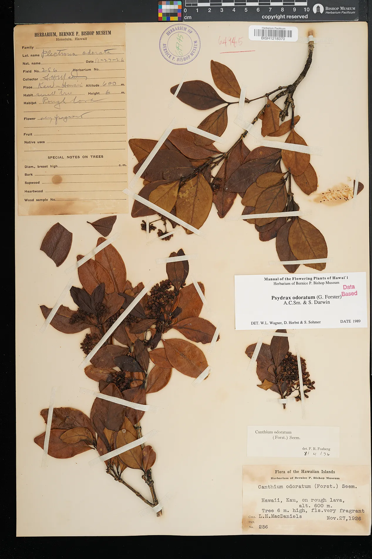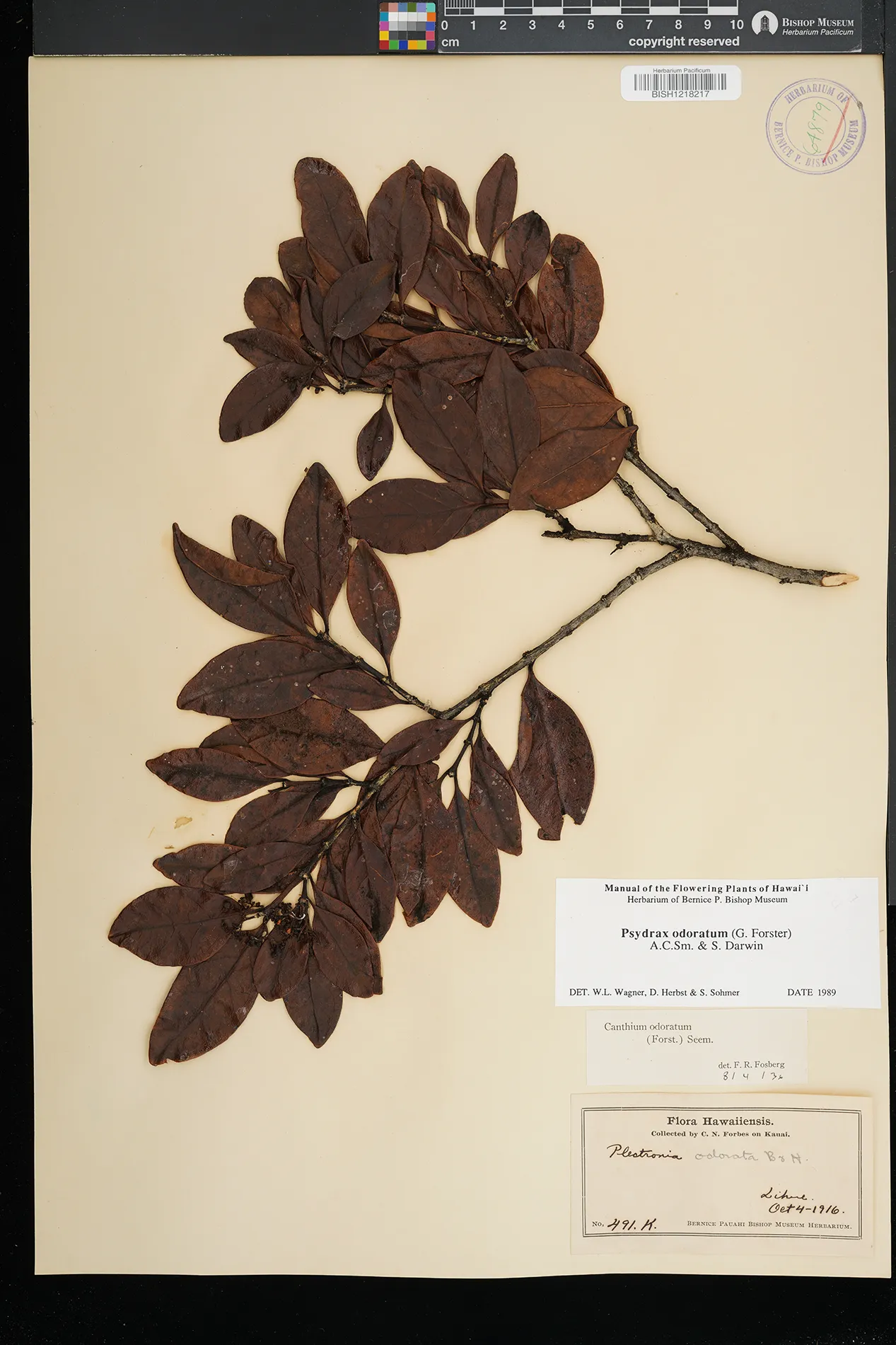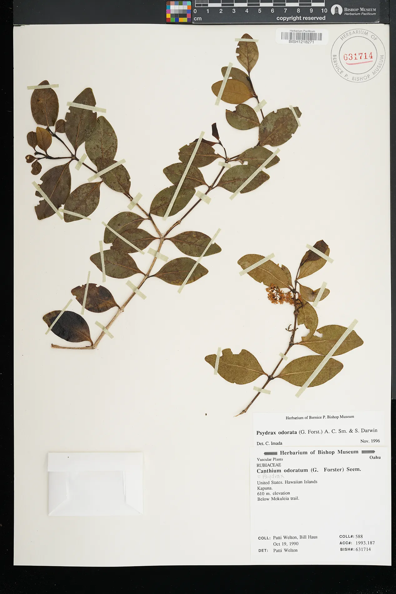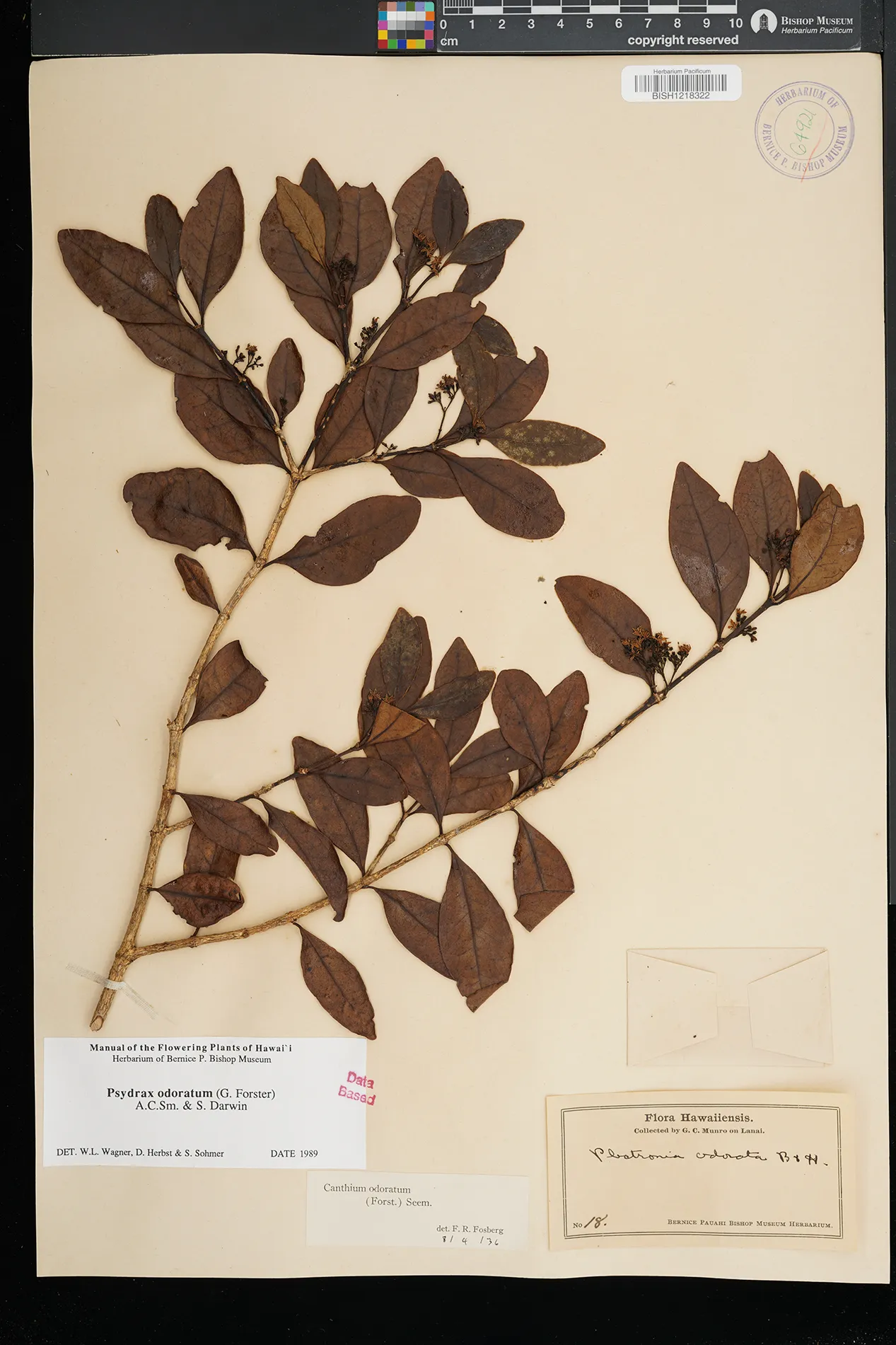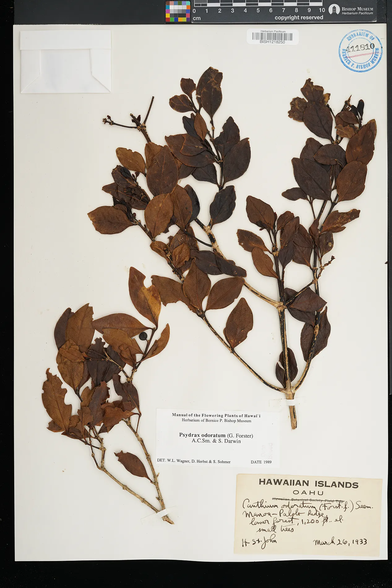 Wagner et al. 1990:1119 (K, O, Mo, L, M, H [as Canthium odoratum]); Smith 1988:230/Herbst & Wagner 1999:31 (COMBNOV, Syn. C. odoratum = P. odorata); Staples & Herbst 2005:484 (KEY), 499 (DESCR)