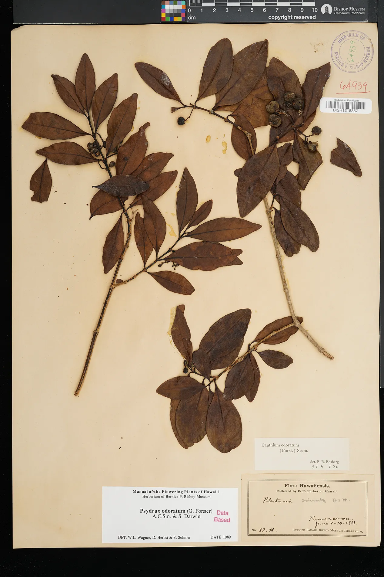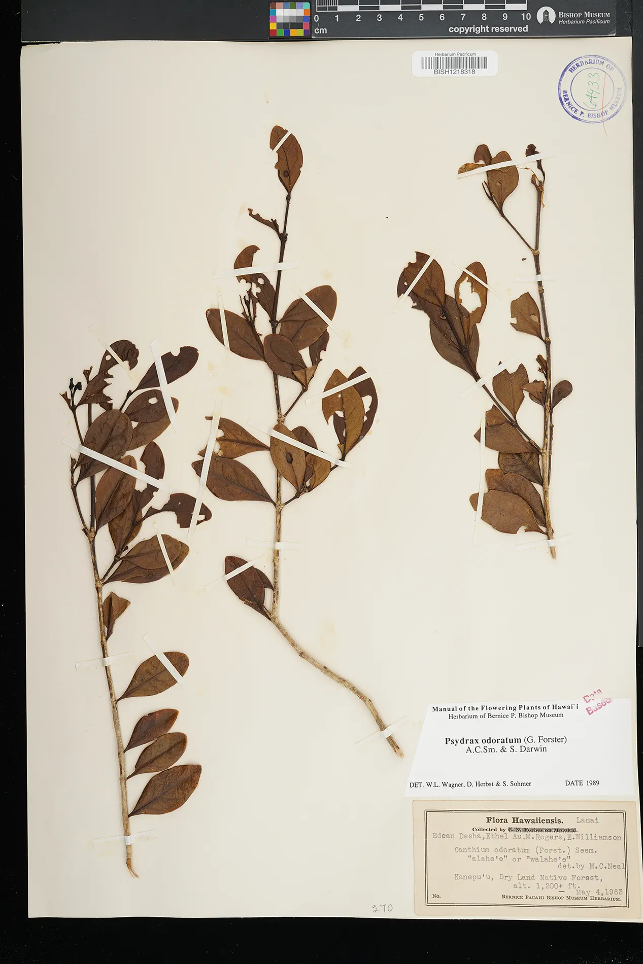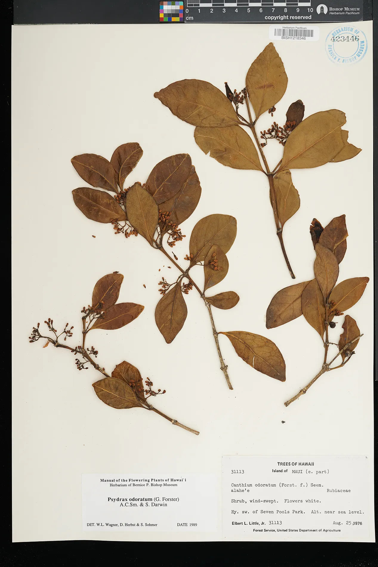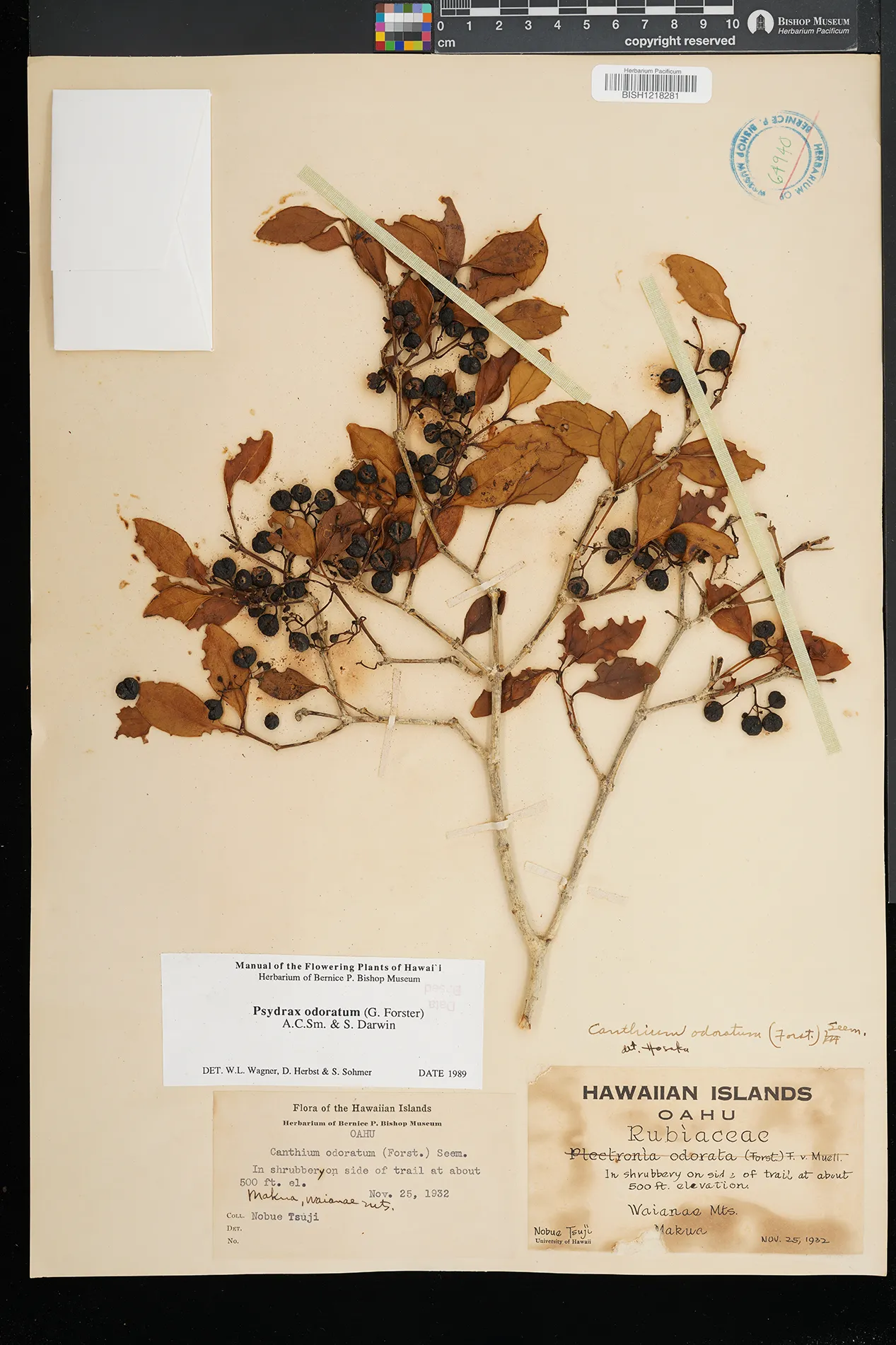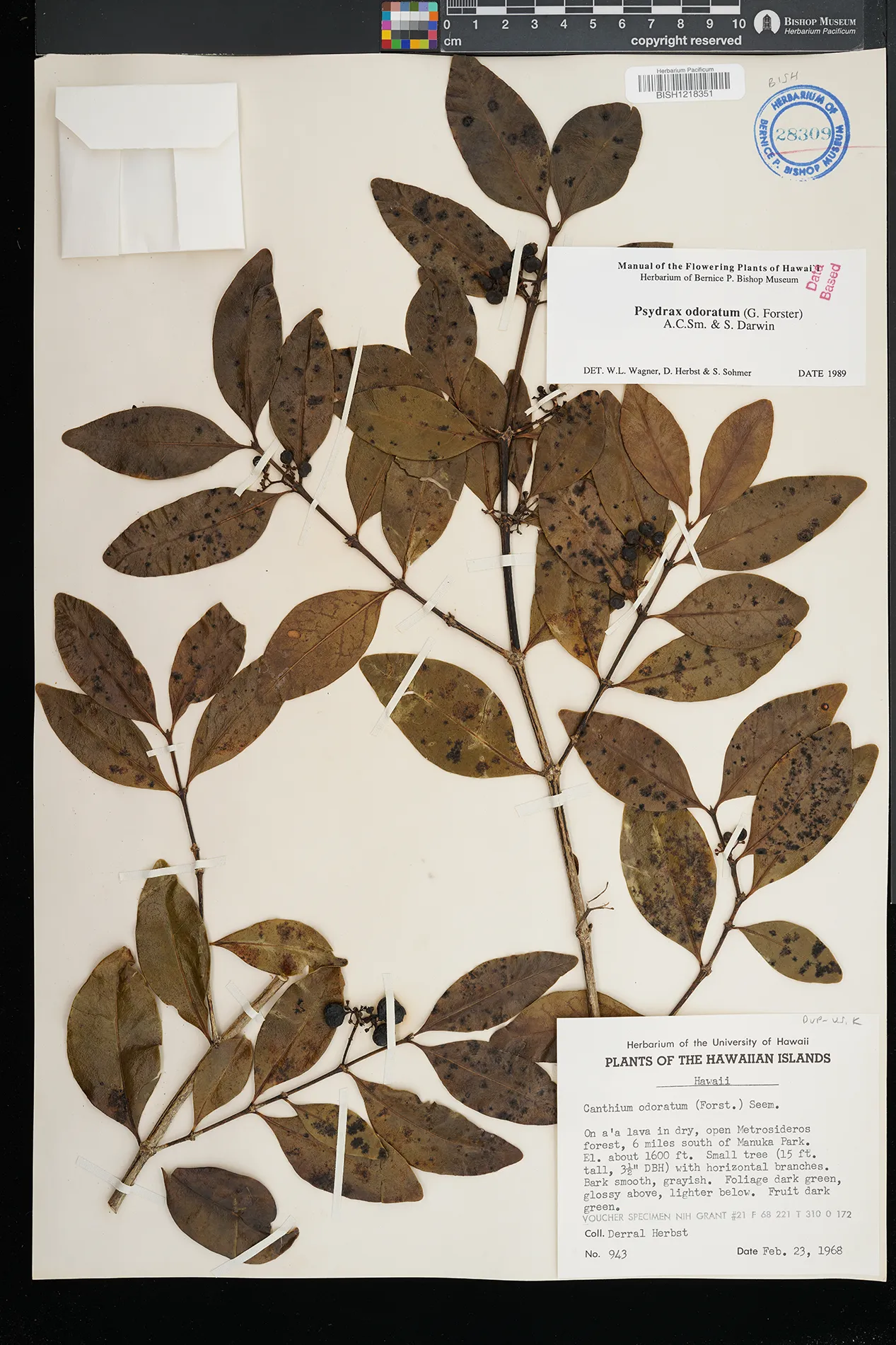 Wagner et al. 1990:1119 (K, O, Mo, L, M, H [as Canthium odoratum]); Smith 1988:230/Herbst & Wagner 1999:31 (COMBNOV, Syn. C. odoratum = P. odorata); Staples & Herbst 2005:484 (KEY), 499 (DESCR)