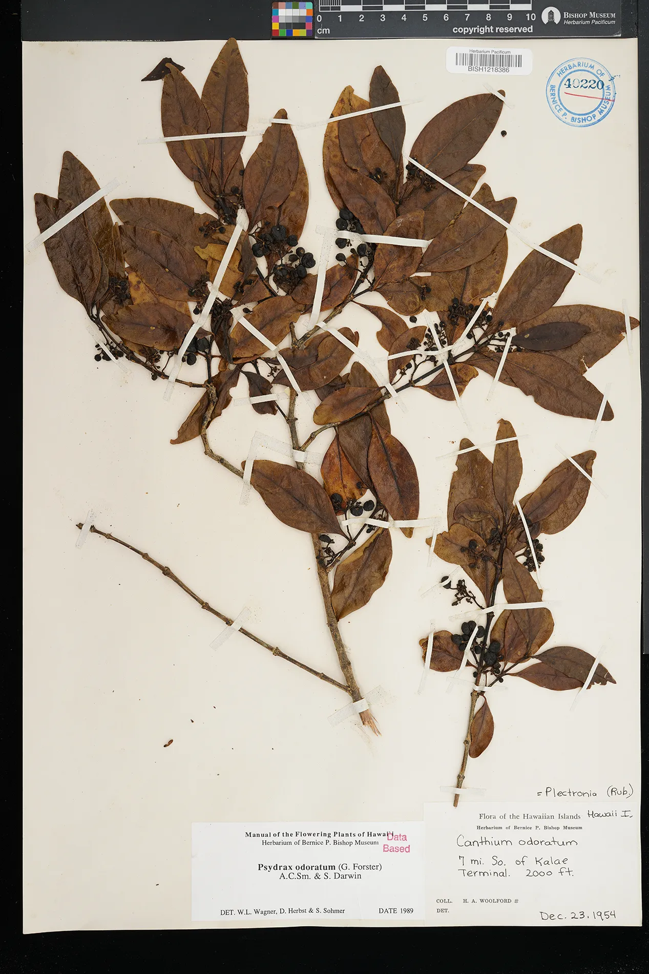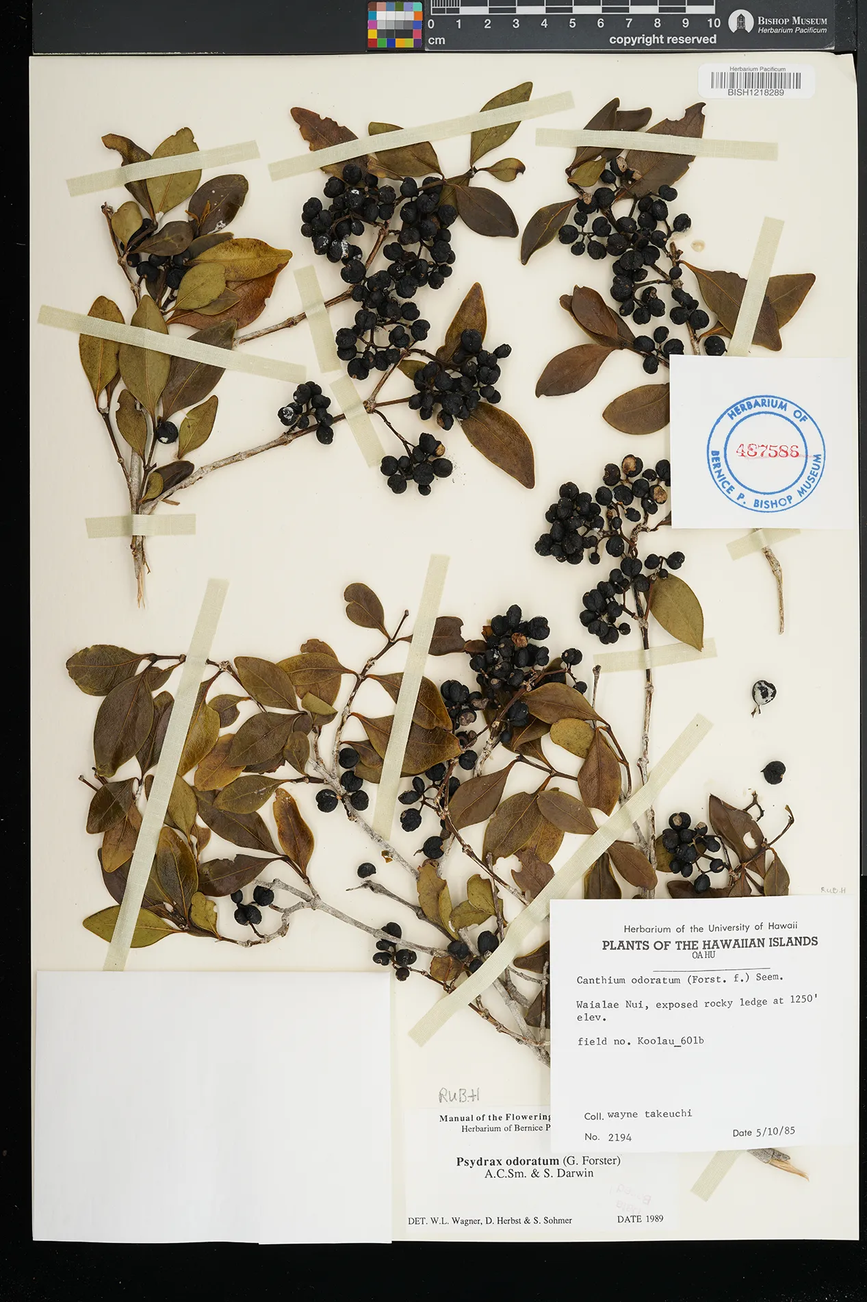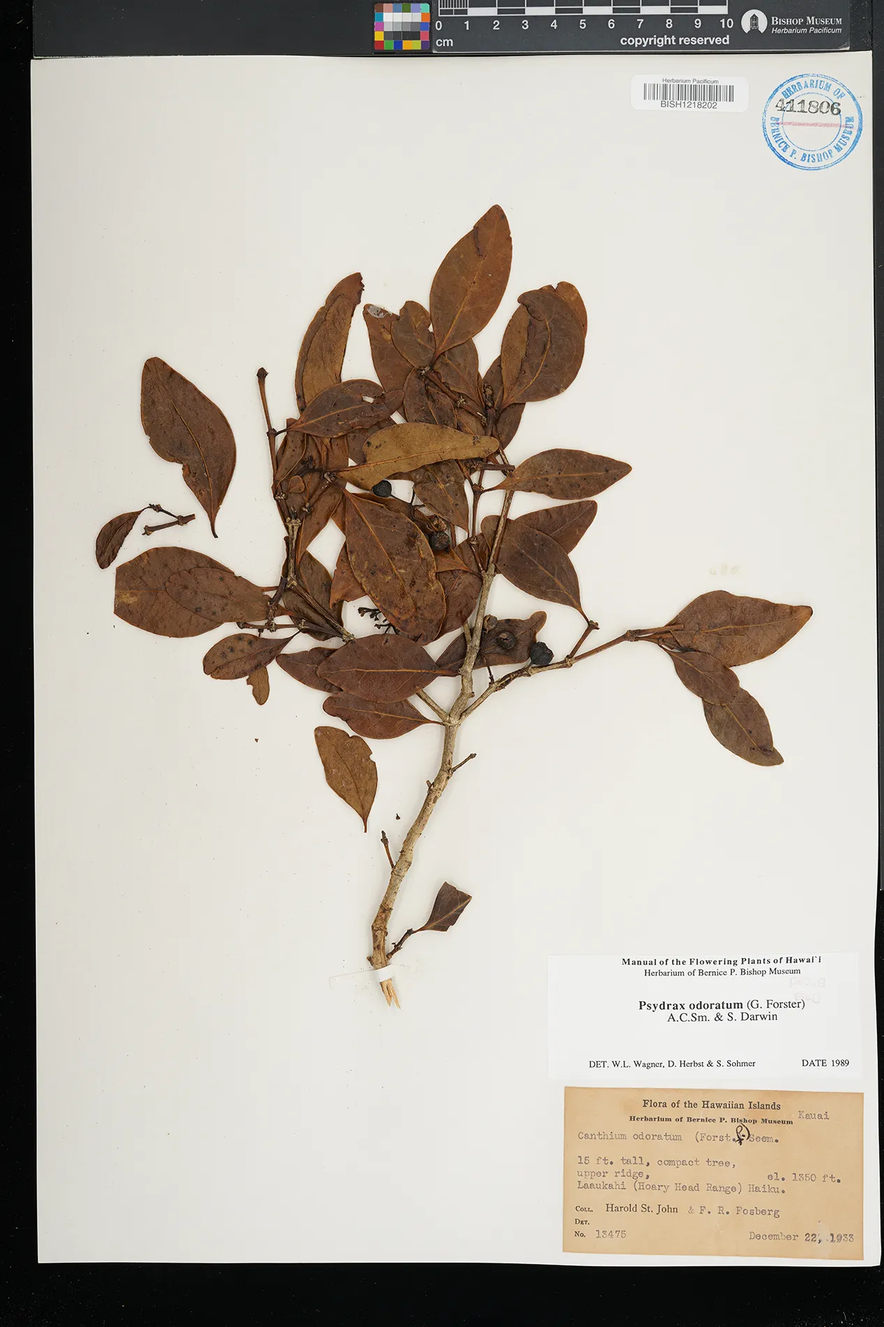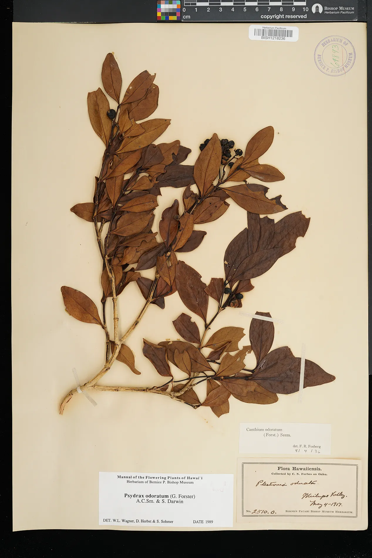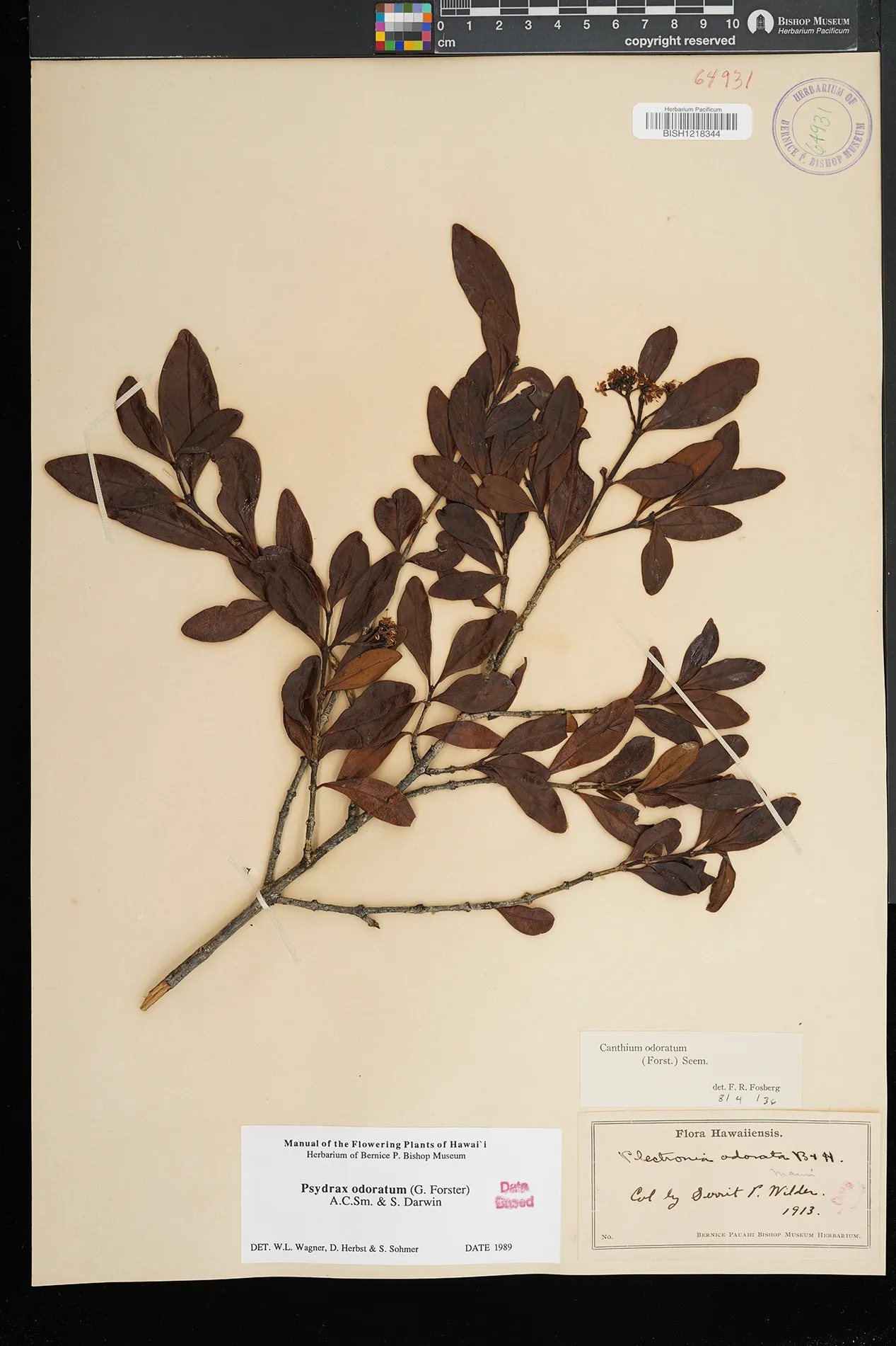 Wagner et al. 1990:1119 (K, O, Mo, L, M, H [as Canthium odoratum]); Smith 1988:230/Herbst & Wagner 1999:31 (COMBNOV, Syn. C. odoratum = P. odorata); Staples & Herbst 2005:484 (KEY), 499 (DESCR)
