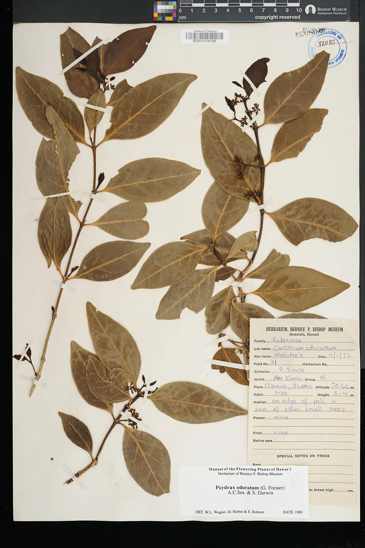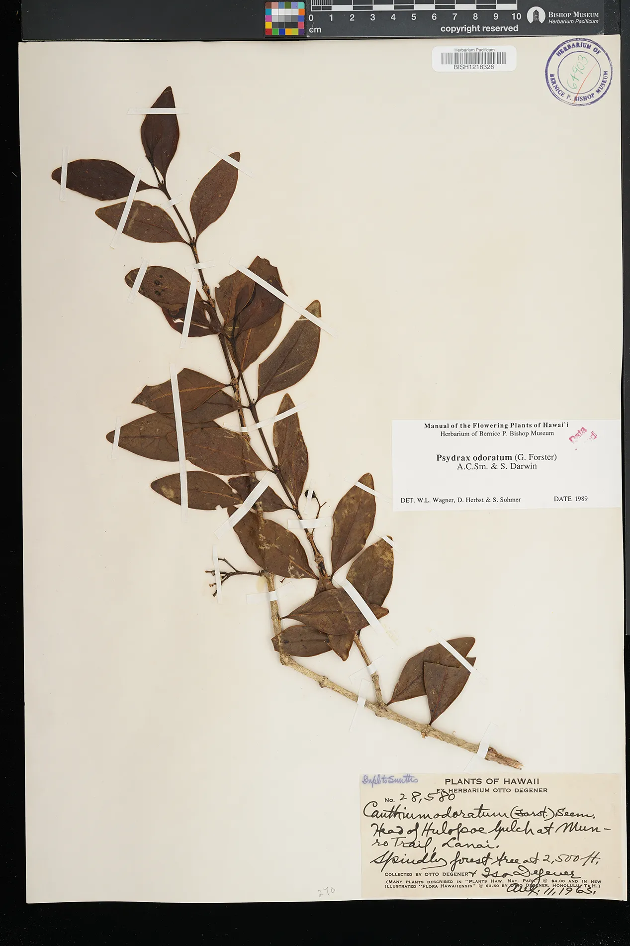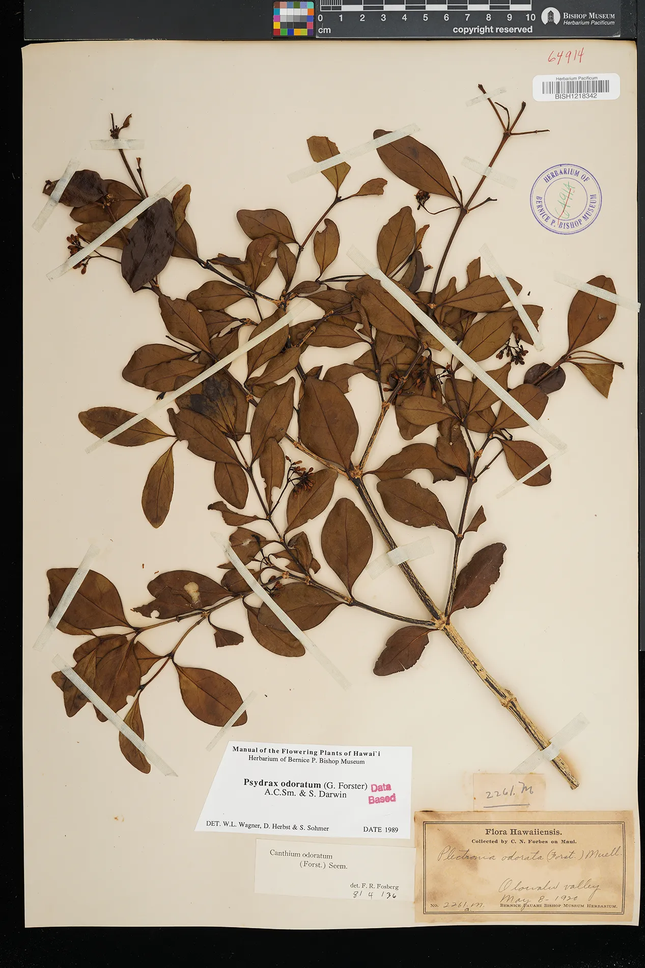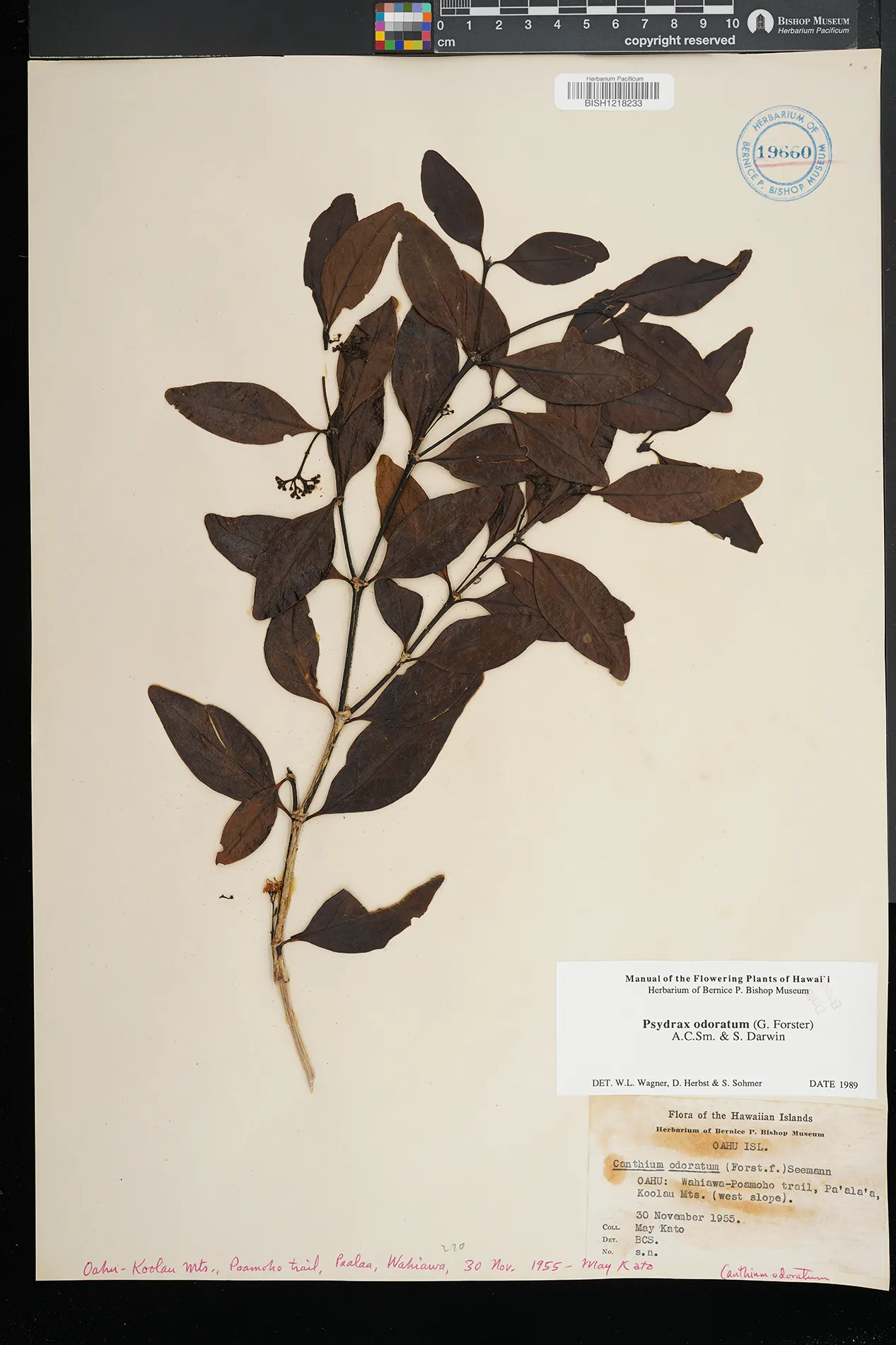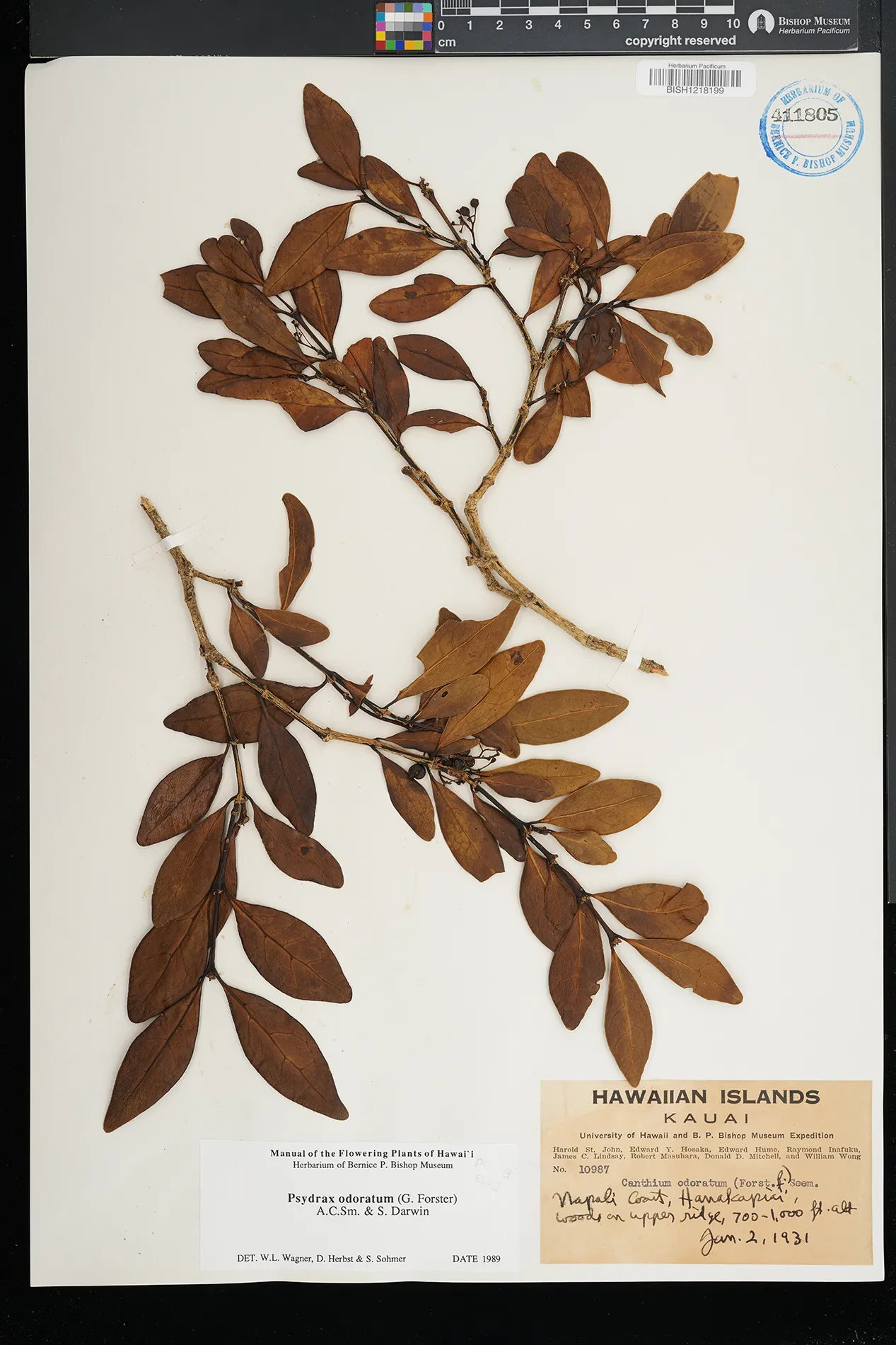Wagner et al. 1990:1119 (K, O, Mo, L, M, H [as Canthium odoratum]); Smith 1988:230/Herbst & Wagner 1999:31 (COMBNOV, Syn. C. odoratum = P. odorata); Staples & Herbst 2005:484 (KEY), 499 (DESCR)