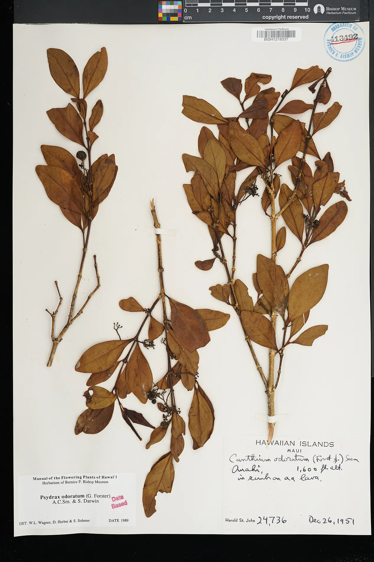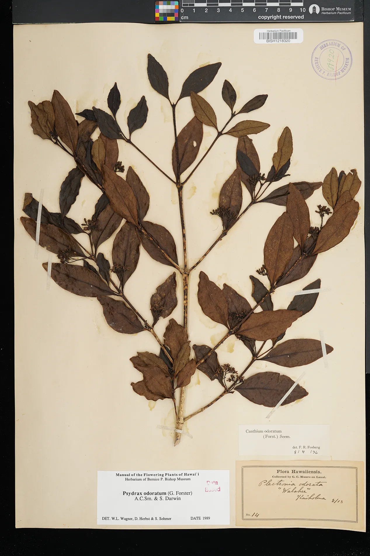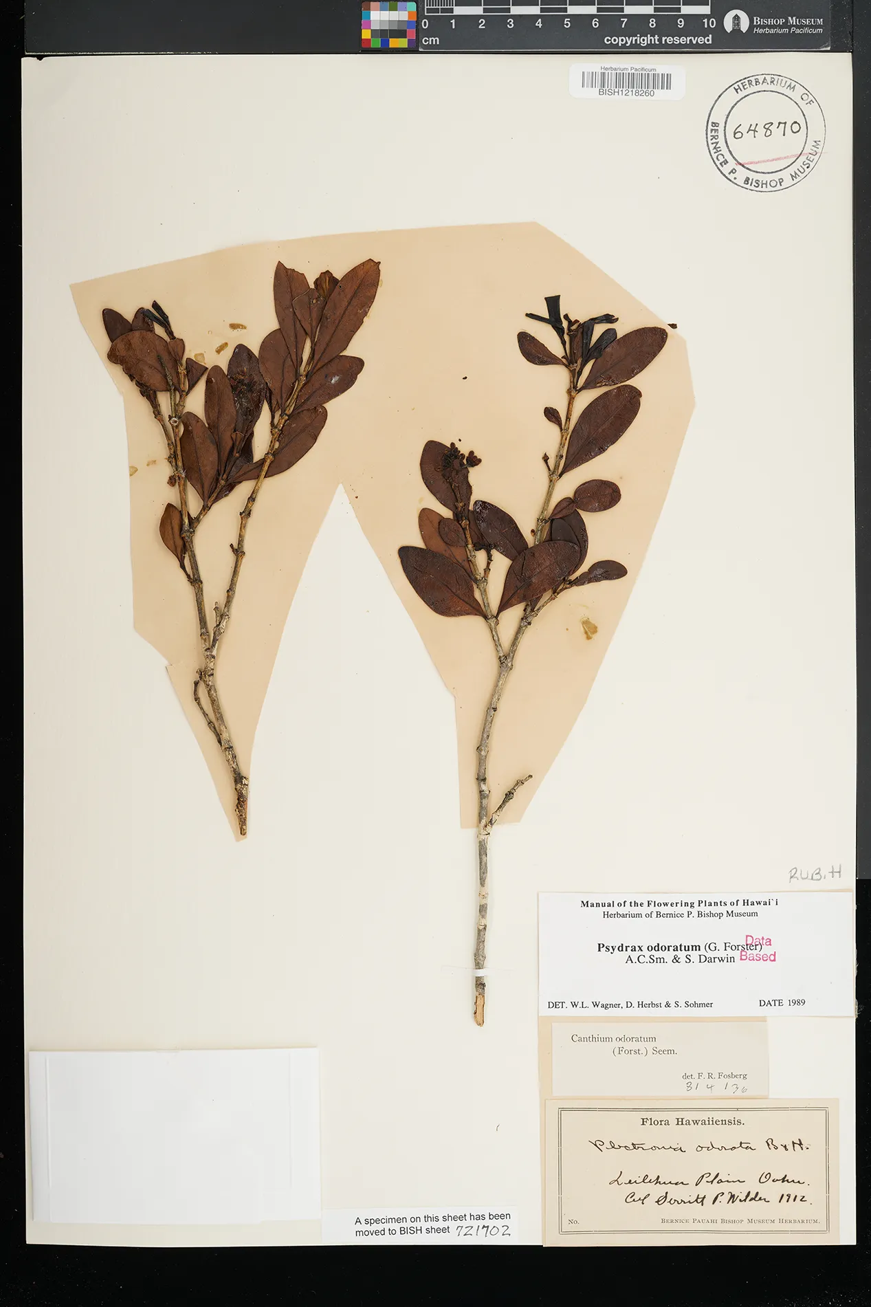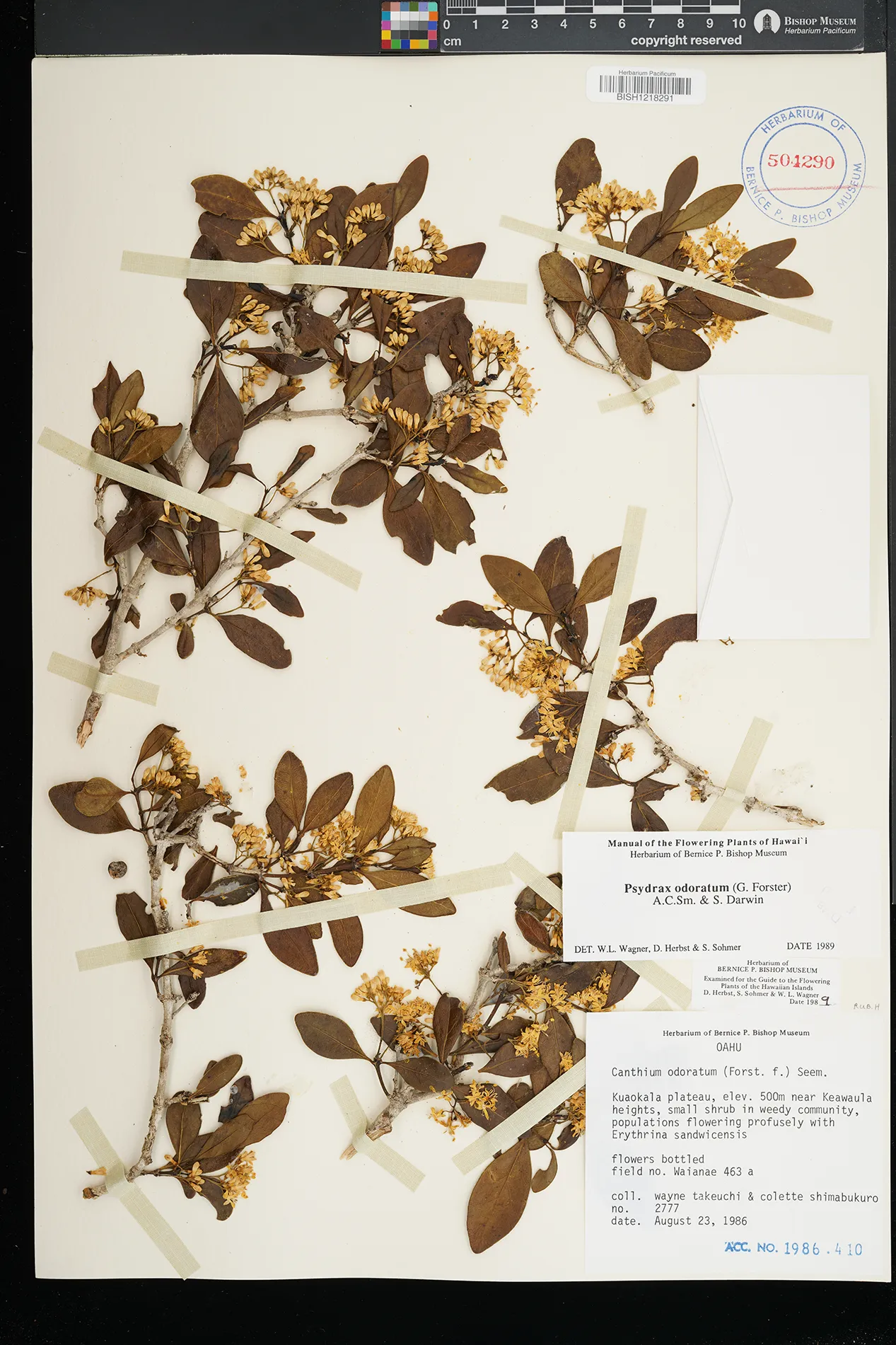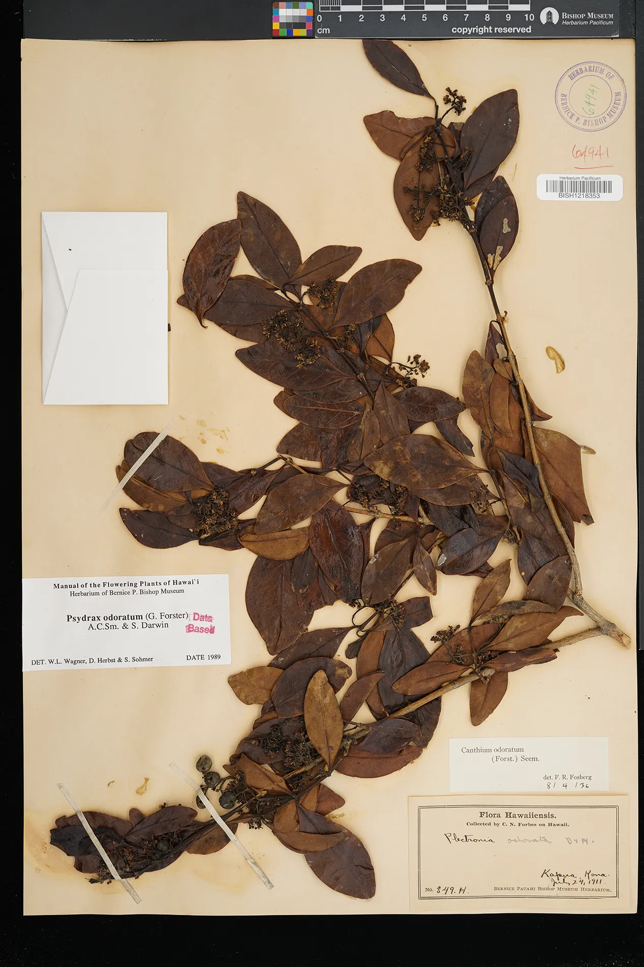 Wagner et al. 1990:1119 (K, O, Mo, L, M, H [as Canthium odoratum]); Smith 1988:230/Herbst & Wagner 1999:31 (COMBNOV, Syn. C. odoratum = P. odorata); Staples & Herbst 2005:484 (KEY), 499 (DESCR)