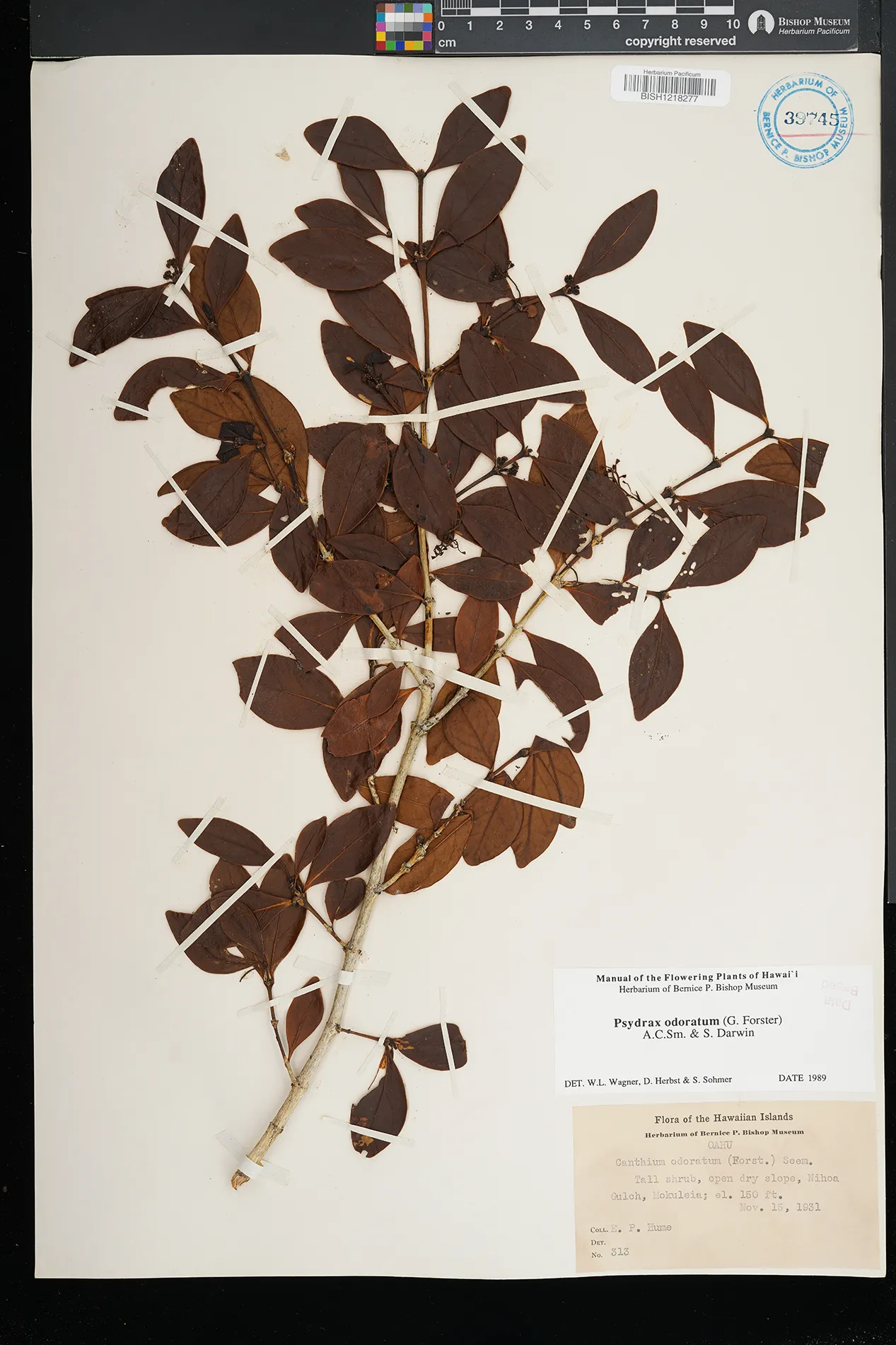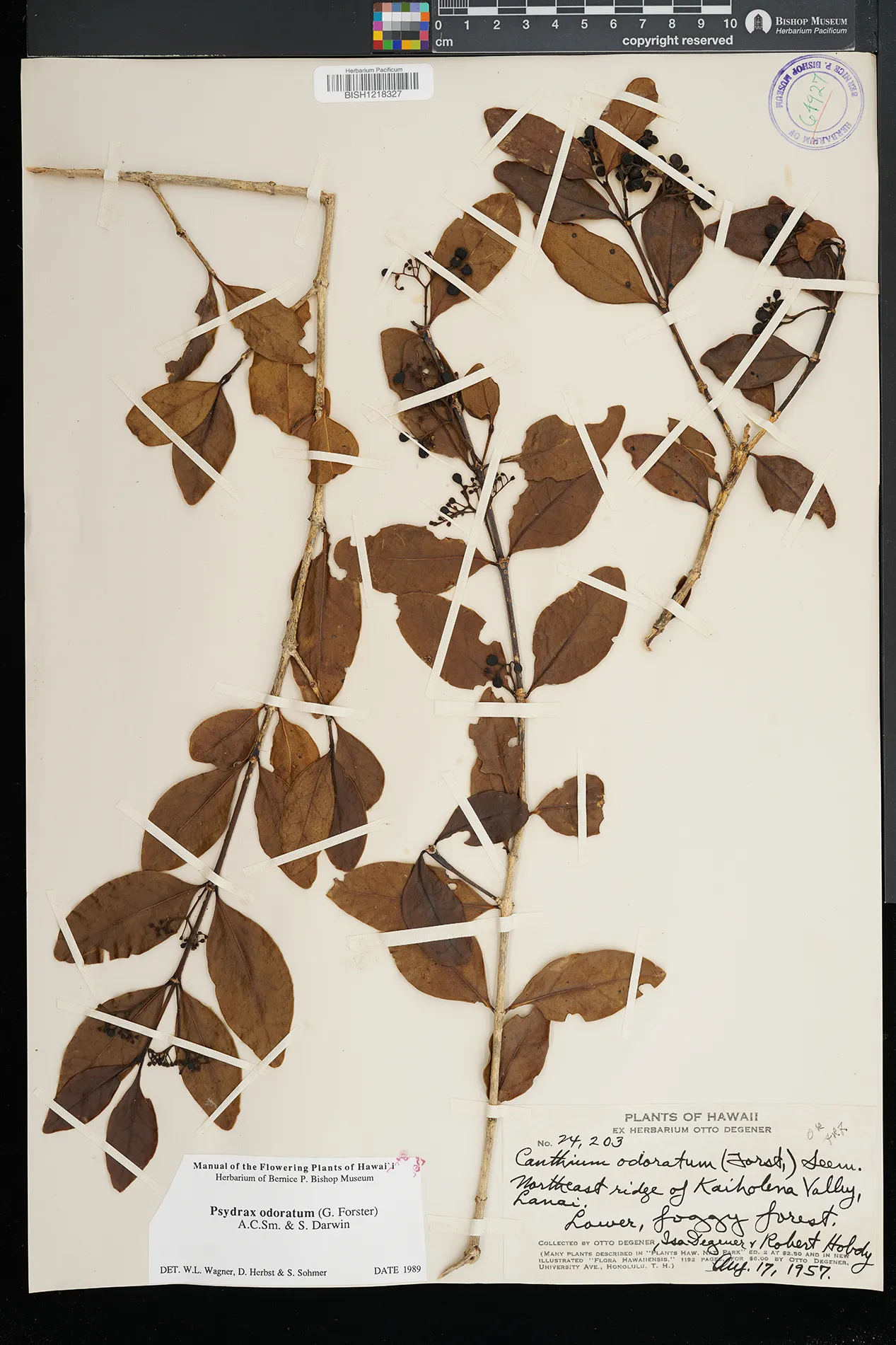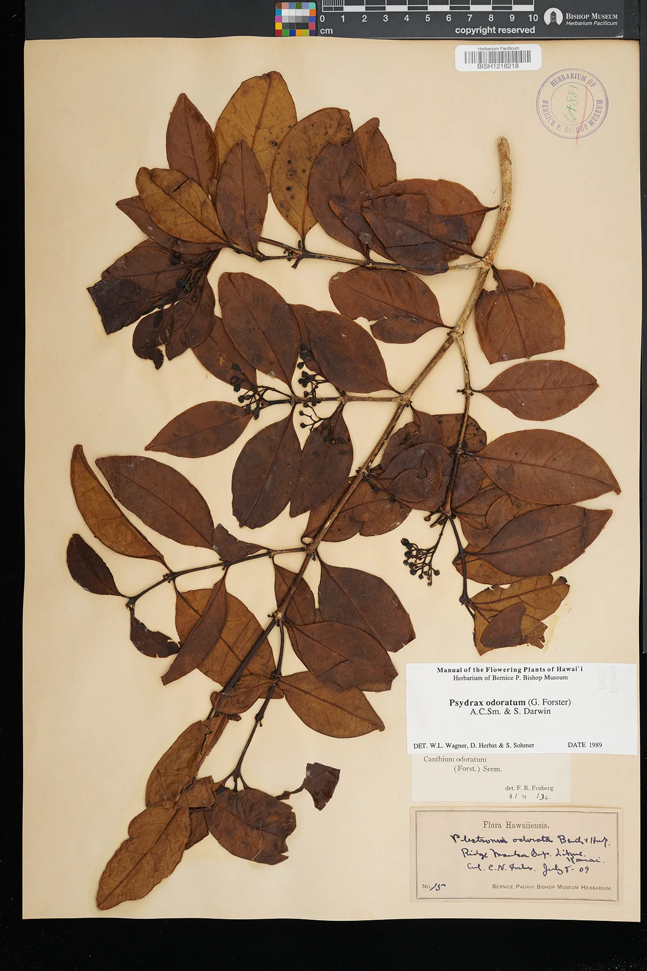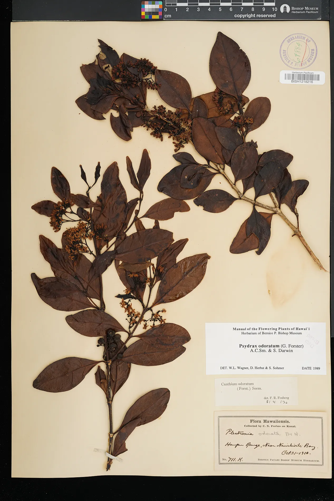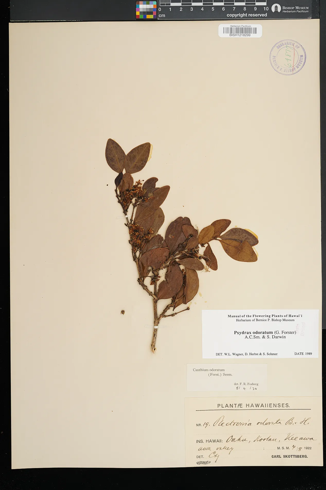 Wagner et al. 1990:1119 (K, O, Mo, L, M, H [as Canthium odoratum]); Smith 1988:230/Herbst & Wagner 1999:31 (COMBNOV, Syn. C. odoratum = P. odorata); Staples & Herbst 2005:484 (KEY), 499 (DESCR)