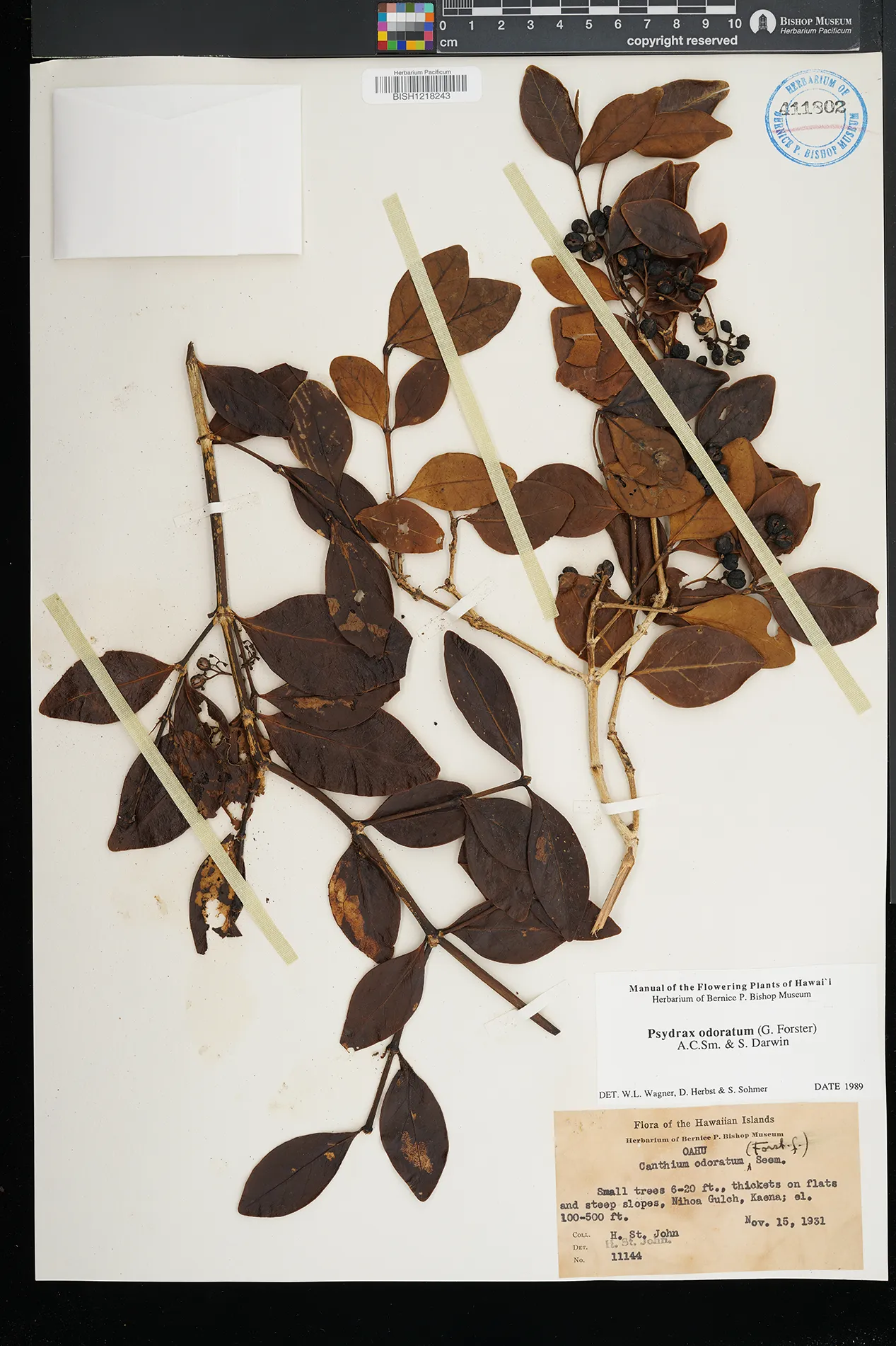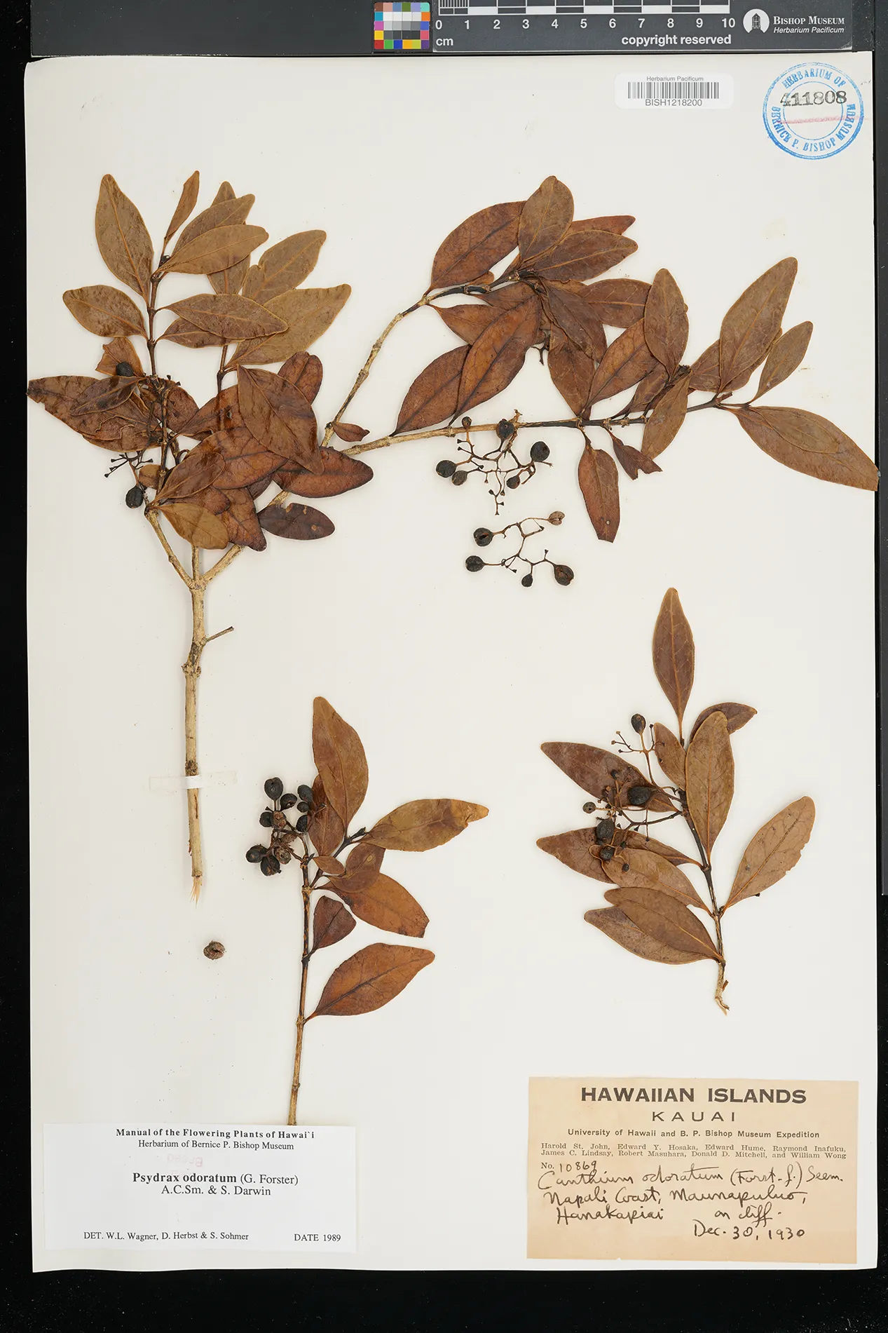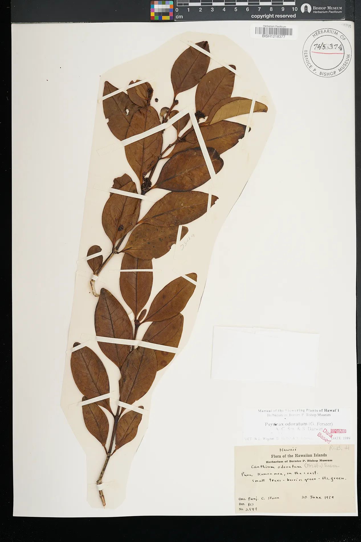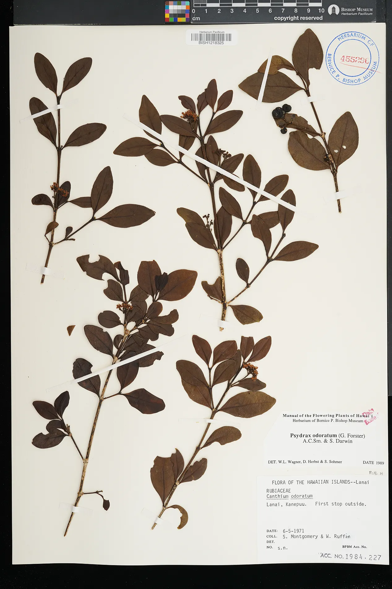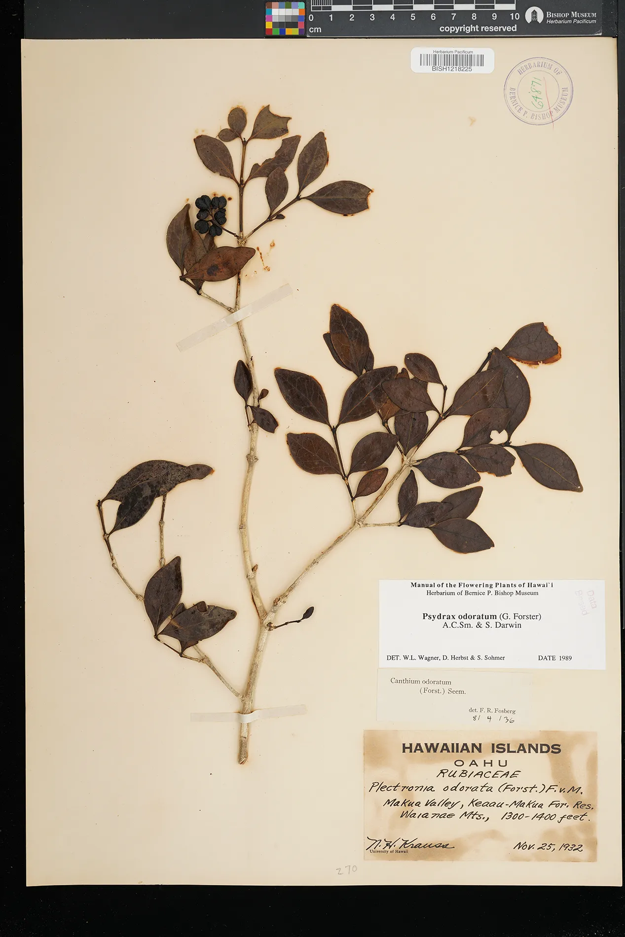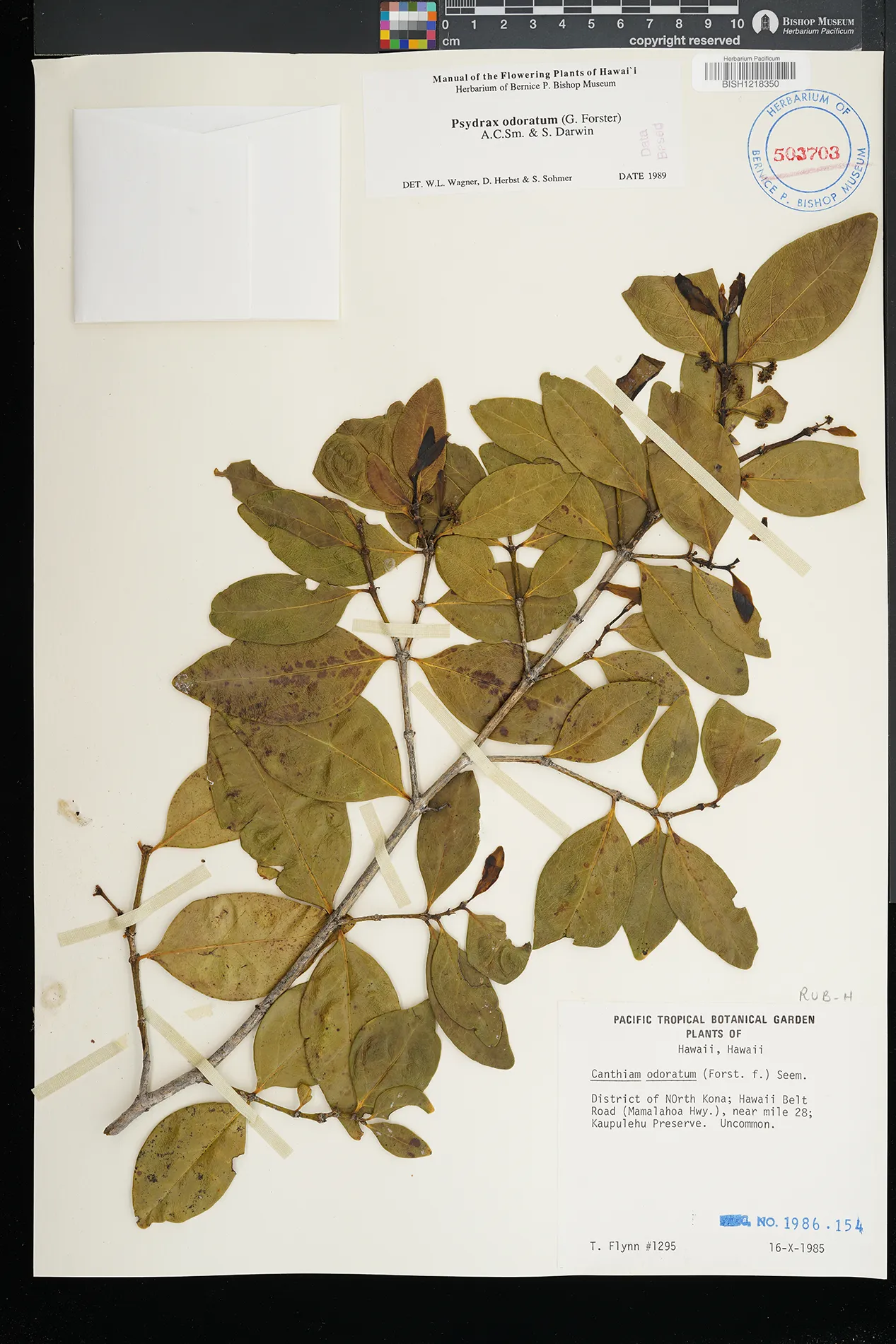 Wagner et al. 1990:1119 (K, O, Mo, L, M, H [as Canthium odoratum]); Smith 1988:230/Herbst & Wagner 1999:31 (COMBNOV, Syn. C. odoratum = P. odorata); Staples & Herbst 2005:484 (KEY), 499 (DESCR)