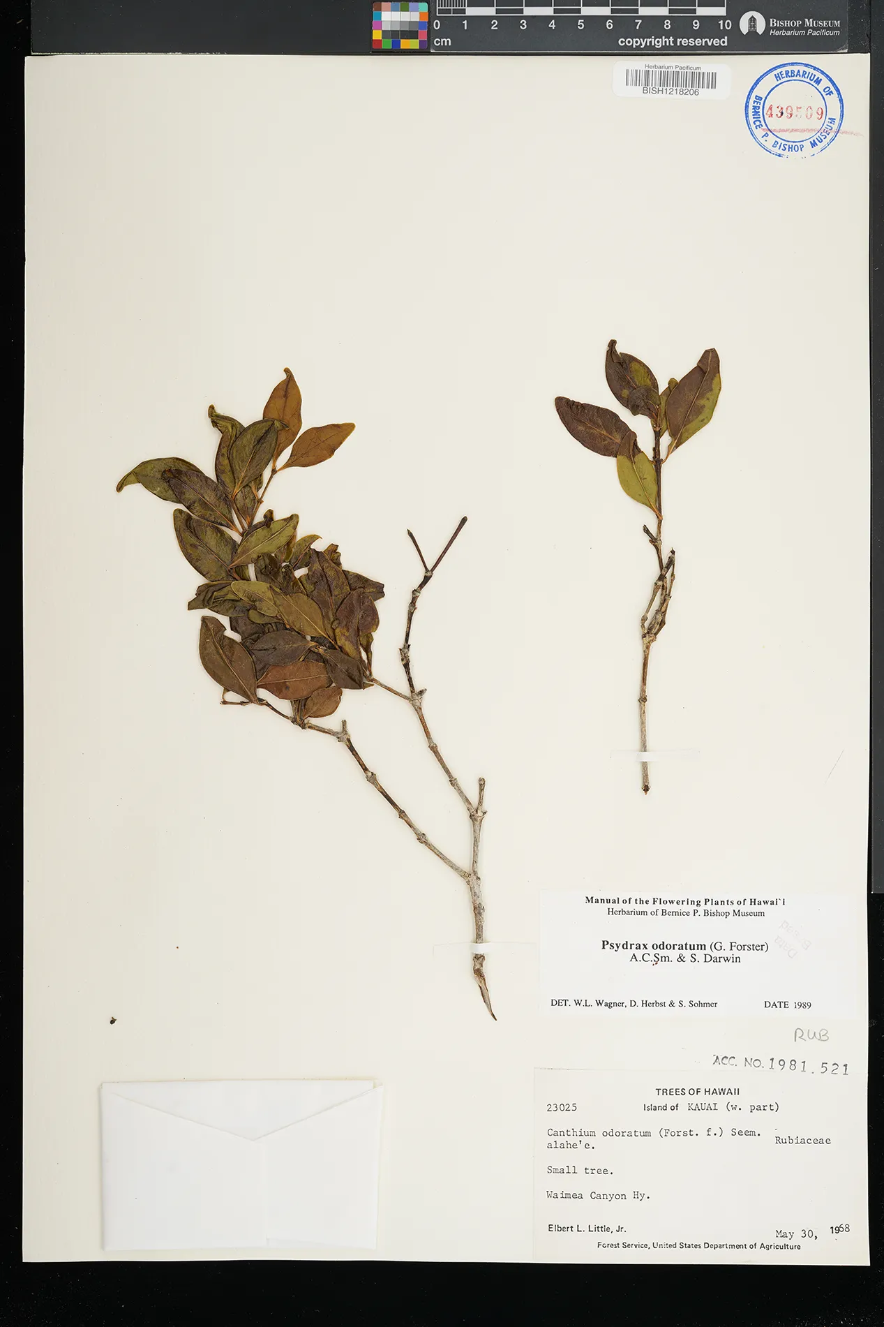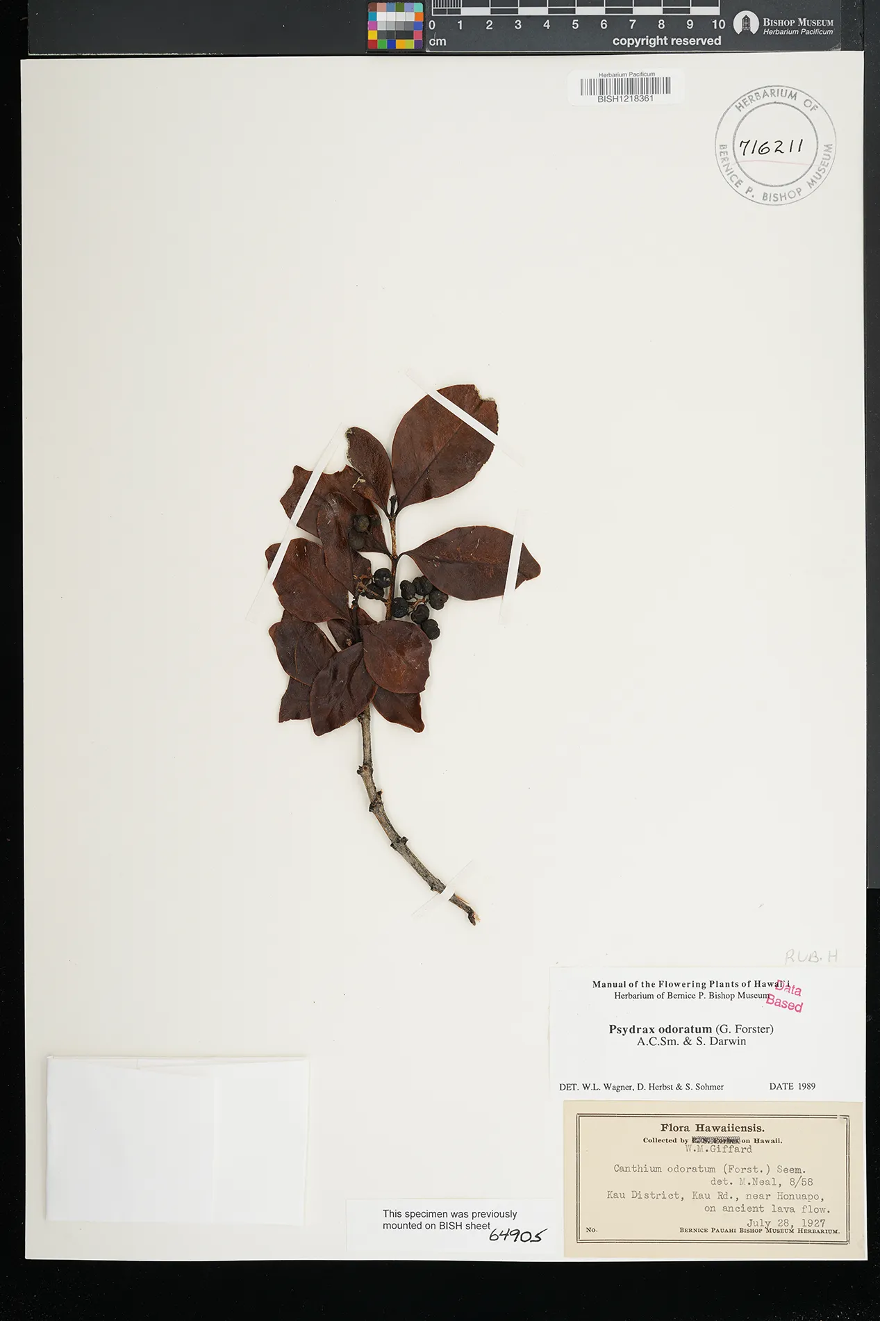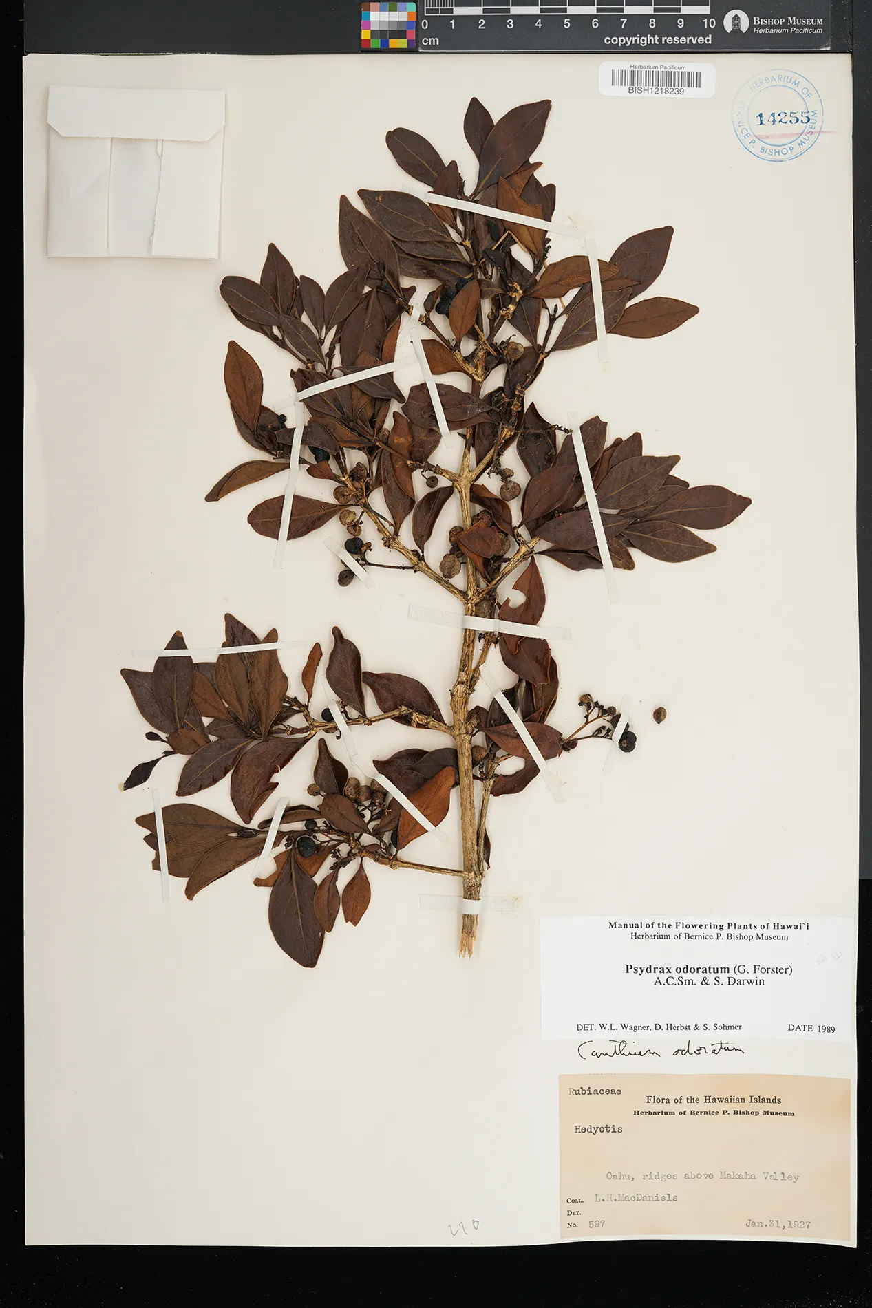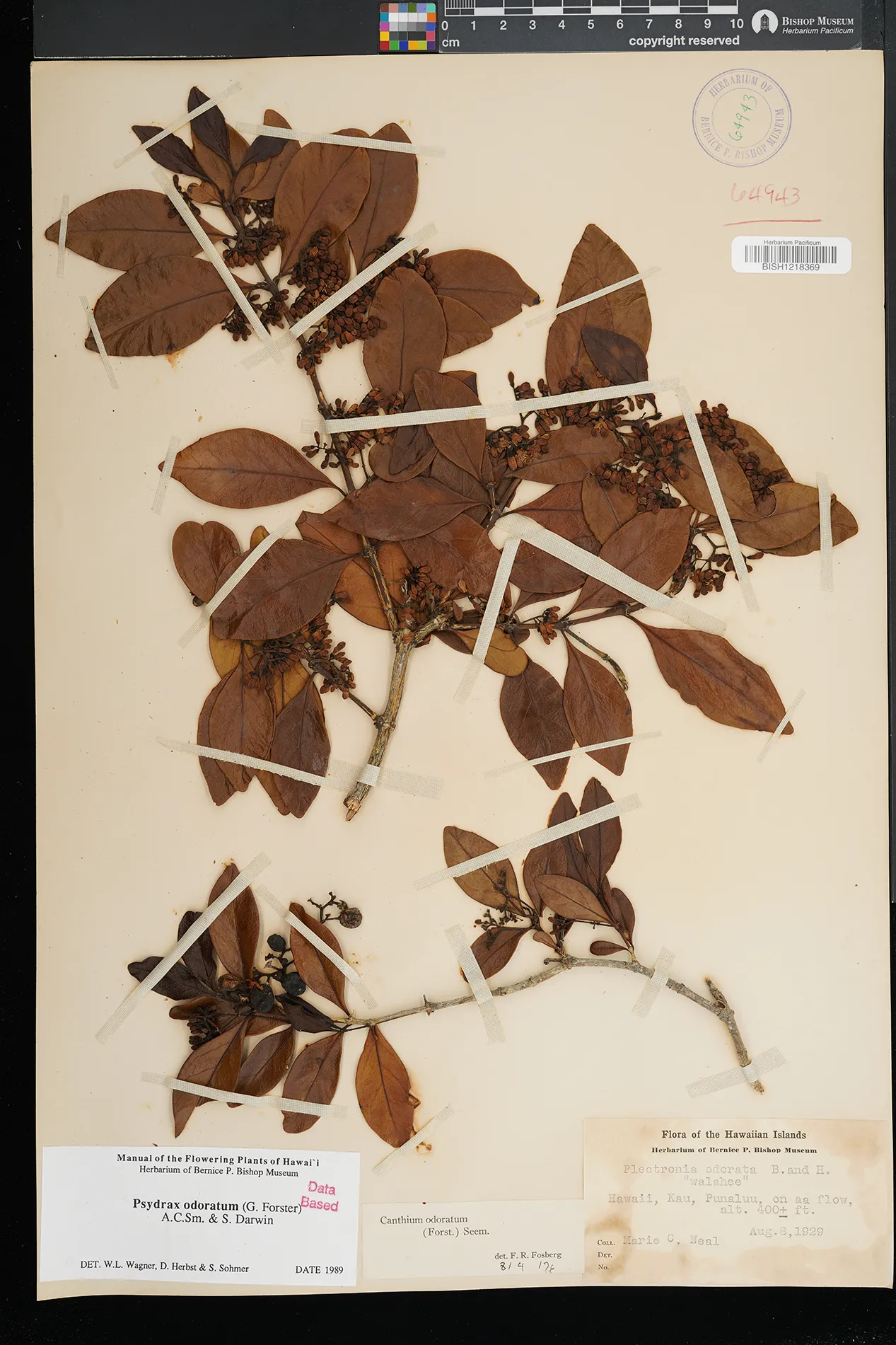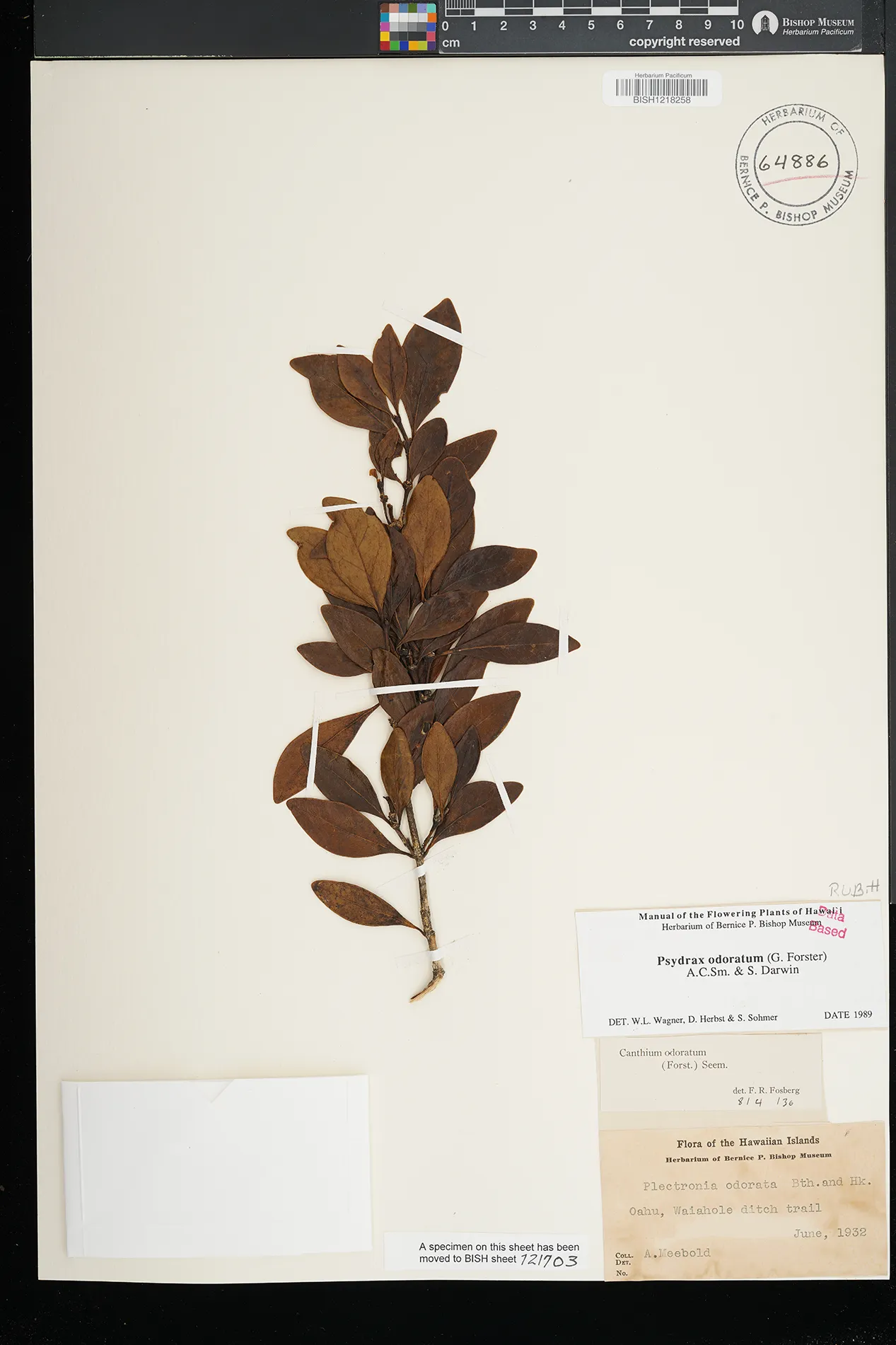 Wagner et al. 1990:1119 (K, O, Mo, L, M, H [as Canthium odoratum]); Smith 1988:230/Herbst & Wagner 1999:31 (COMBNOV, Syn. C. odoratum = P. odorata); Staples & Herbst 2005:484 (KEY), 499 (DESCR)